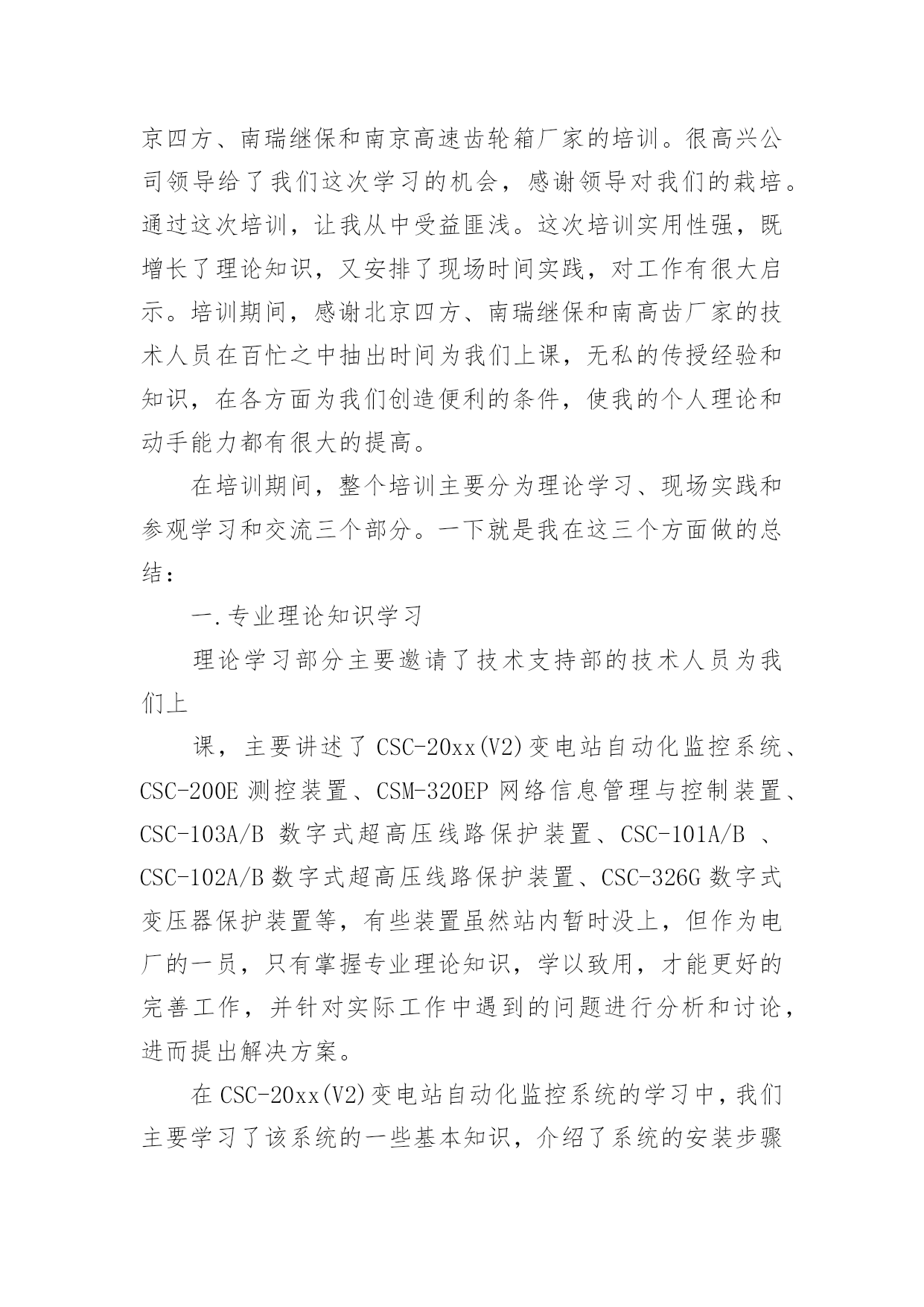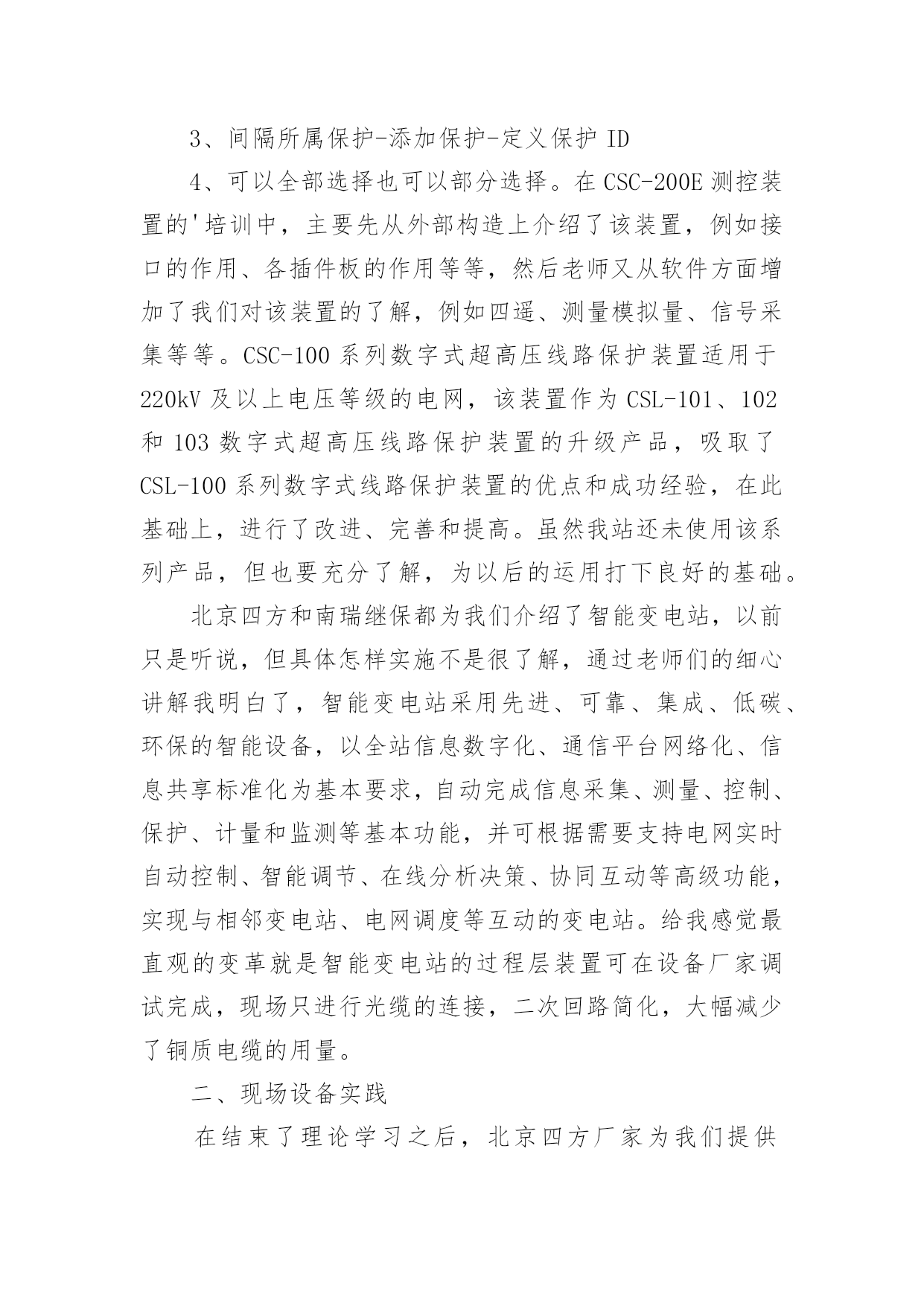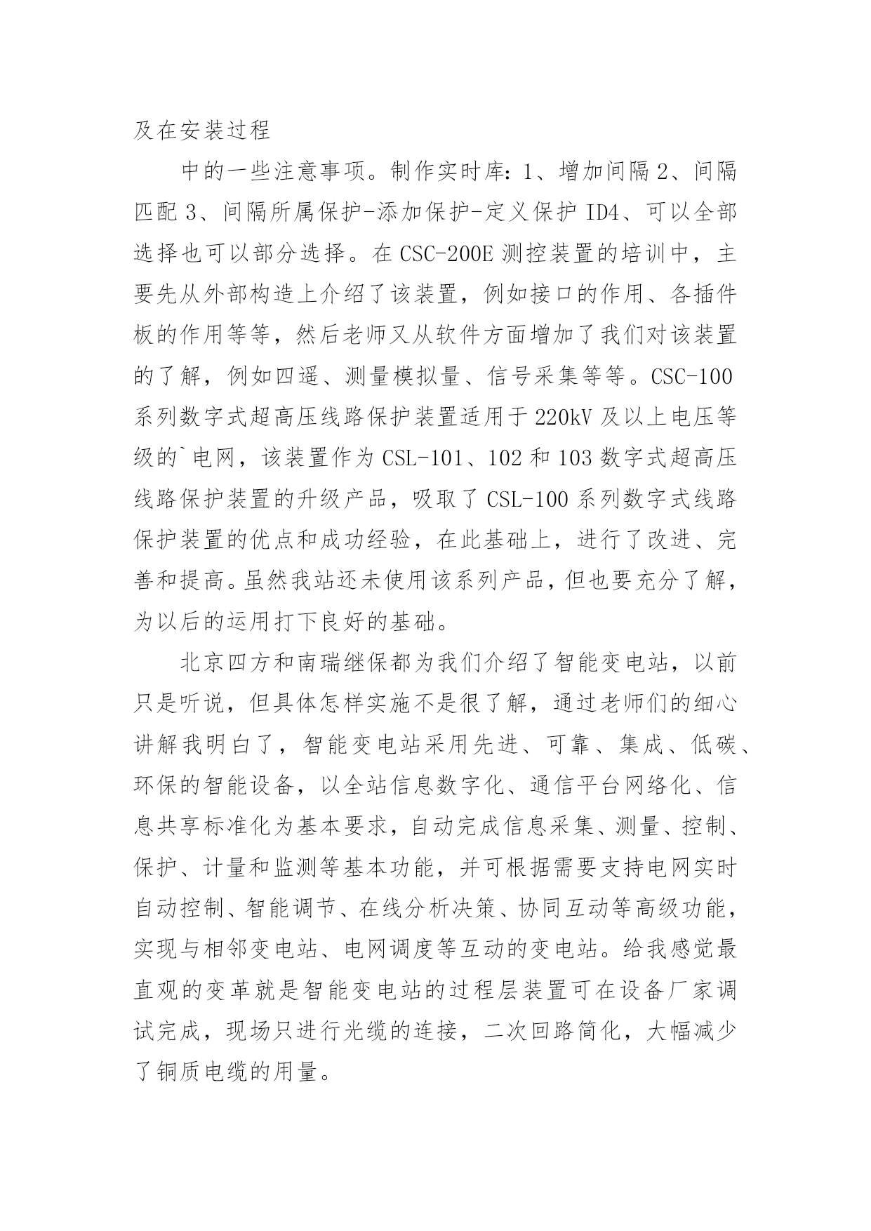 公司外出培训总结总结就是对一个时期的学习、工作或其完成情况进行一次全面系统的回顾和分析的书面材料,它可以使我们更有效率,因此好好准备一份总结吧。那么我们该怎么去写总结呢?下面是小编收集整理的公司外出培训总结,欢迎大家分享。公司外出培训总结1这次的培训已经结束了,我觉得非常的有意义,作为xx的一名员工,我也在不断的提高自己各方面的能力的,还是有一些重要的事情等着我去做好,这是我应该要去反思的,虽然近期在工作当中,我也在不带的积累工作经验,这是对我专业能力的认可,在xx这里的点点滴滴,我也在不断的思考自己各方面的职责,也需要对这次的培训学习总结一番。来到了xx这里也有的几个月的时间了,这确实是让我觉得很有意义,未来在学习当中我也在认真的思考自己的工作经验,这次外出培训,我还是认识到了自身能力的提高,在学习方面我还是需要认真的做好自己的工作,这对我来讲我也是需要看清楚自己的方向,以后在工作当中,我也会不断的.提高自身能力,这对我而言也是很有意义的,我也不希望以后再出现这样的情况了,这次培训的时间虽然不是很长,但是我也还是应该要好好反思清楚的,这是以后需要好好去维持下去的。既然做了这份工作就应该要对自己负责,也是以后需要去反思清楚的,也需要好好的去积累工作经验的,在这段时间以来的学习当中,我也应该要不断的去维持好的状态,这一点是毋庸置疑的,是我对自己学习应该要有的态度,培训时间虽然不长,现在也结束了这一段时间的学习,我也应该要认清楚接下来的方向,只有思考清楚自己接下来的方向,这样才能够做出更好的成绩来,公司的点点滴滴中我一直都觉得这是一个很不错的提高,近期在工作当中,我也是需要对自己有足够多的认识,培训结束的这段时间,在近期的工作当中,我也能够看清楚自己的方向。自我来到xx这里也有一段时间了,我也真切的体会到了自己的问题,以后我也不会再这样消耗自己的时间,我知道这对我来讲,也是非常有必要,我也认清楚了接下来需要做出好的调整的,这对我的影响还是非常有必要的,我现在觉得还是非常有必要的,这对我各方面还是有足够多的提高,这次培训结束之后我也是认识到了自身能力的提高,所以这方面我也是能够认清楚自己的方向,感激这段时间以来的培训,确实是学习到了很多知识,也对接下来的工作更加的有信心了,这一点是非常关键的,是我需要合理规划好的。公司外出培训总结220xx年4月1日至4月12日,我们一行12人参加了北京四方、南瑞继保和南京高速齿轮箱厂家的培训。很高兴公司领导给了我们这次学习的机会,感谢领导对我们的栽培。通过这次培训,让我从中受益匪浅。这次培训实用性强,既增长了理论知识,又安排了现场时间实践,对工作有很大启示。培训期间,感谢北京四方、南瑞继保和南高齿厂家的技术人员在百忙之中抽出时间为我们上课,无私的传授经验和知识,在各方面为我们创造便利的条件,使我的个人理论和动手能力都有很大的提高。在培训期间,整个培训主要分为理论学习、现场实践和参观学习和交流三个部分。一下就是我在这三个方面做的总结:一、专业理论知识学习理论学习部分主要邀请了技术支持部的技术人员为我们上课,主要讲述了CSC-20xx(V2)变电站自动化监控系统、CSC-200E测控装置、CSM-320EP网络信息管理与控制装置、CSC-103A/B数字式超高压线路保护装置、CSC-101A/B、CSC-102A/B数字式超高压线路保护装置、CSC-326G数字式变压器保护装置等,有些装置虽然站内暂时没上,但作为电厂的一员,只有掌握专业理论知识,学以致用,才能更好的完善工作,并针对实际工作中遇到的问题进行分析和讨论,进而提出解决方案。在CSC-20xx(V2)变电站自动化监控系统的学习中,我们主要学习了该系统的一些基本知识,介绍了系统的安装步骤及在安装过程中的一些注意事项。制作实时库:1、增加间隔2、间隔匹配3、间隔所属保护-添加保护-定义保护ID4、可以全部选择也可以部分选择。在CSC-200E测控装置的'培训中,主要先从外部构造上介绍了该装置,例如接口的作用、各插件板的作用等等,然后老师又从软件方面增加了我们对该装置的了解,例如四遥、测量模拟量、信号采集等等。CSC-100系列数字式超高压线路保护装置适用于220kV及以上电压等级的电网,该装置作为CSL-101、102和103数字式超高压线路保护装置的升级产品,吸取了CSL-100系列数字式线路保护装置的优点和成功经验,在此基础上,进行了改进、完善和提高。虽然我站还未使用该系列产品,但也要充分了解,为以后的运用打下良好的基础。北京四方和南瑞继保都为我们介绍了智能变电站,以前只是听说,但具体怎样实施不是很了解,通过老师们的细心讲解我明白了,智能变电站采用先进、可靠、集成、低碳、环保的智能设备,以全站信息数字化、通信平台网络化、信息共享标准化为基