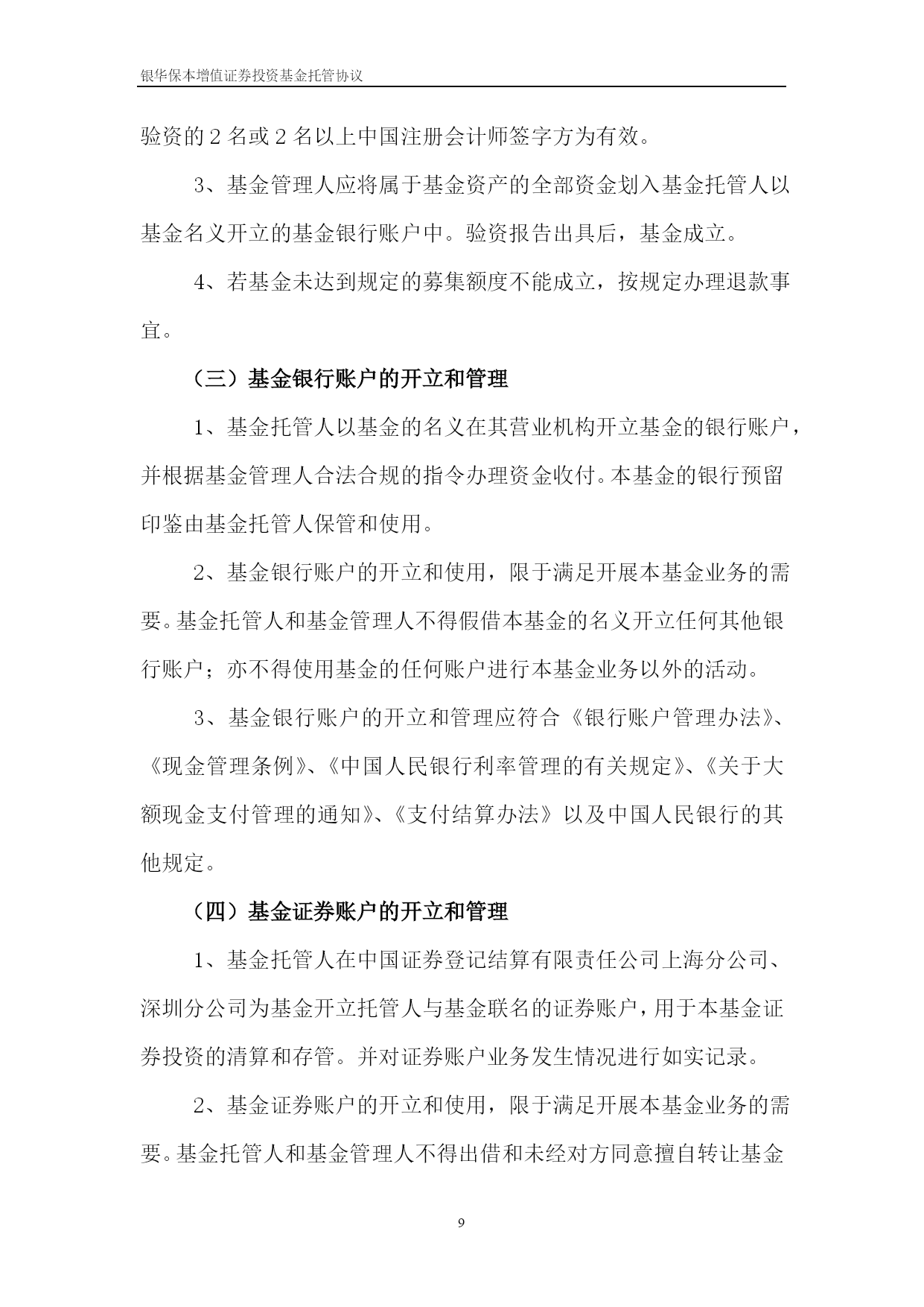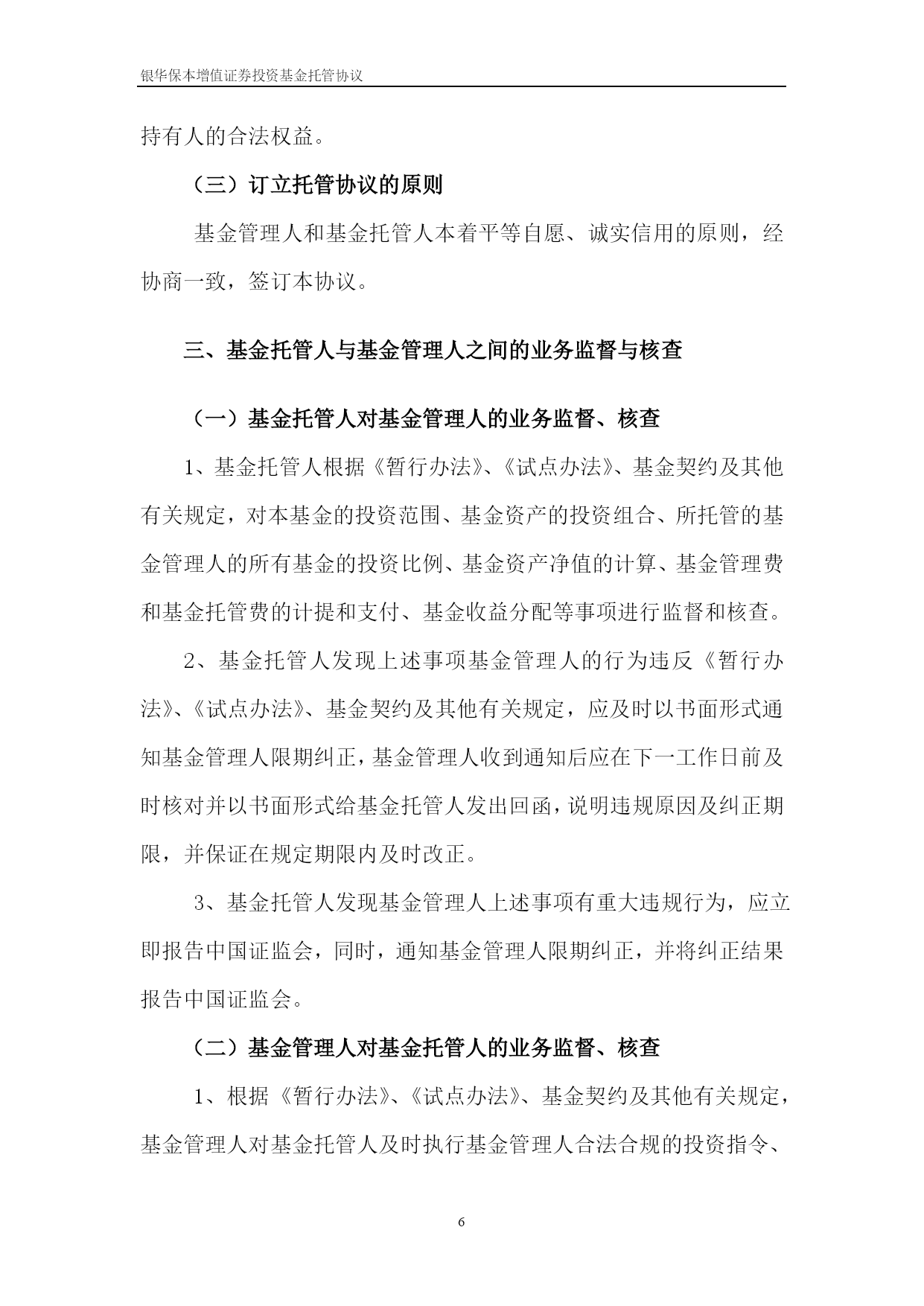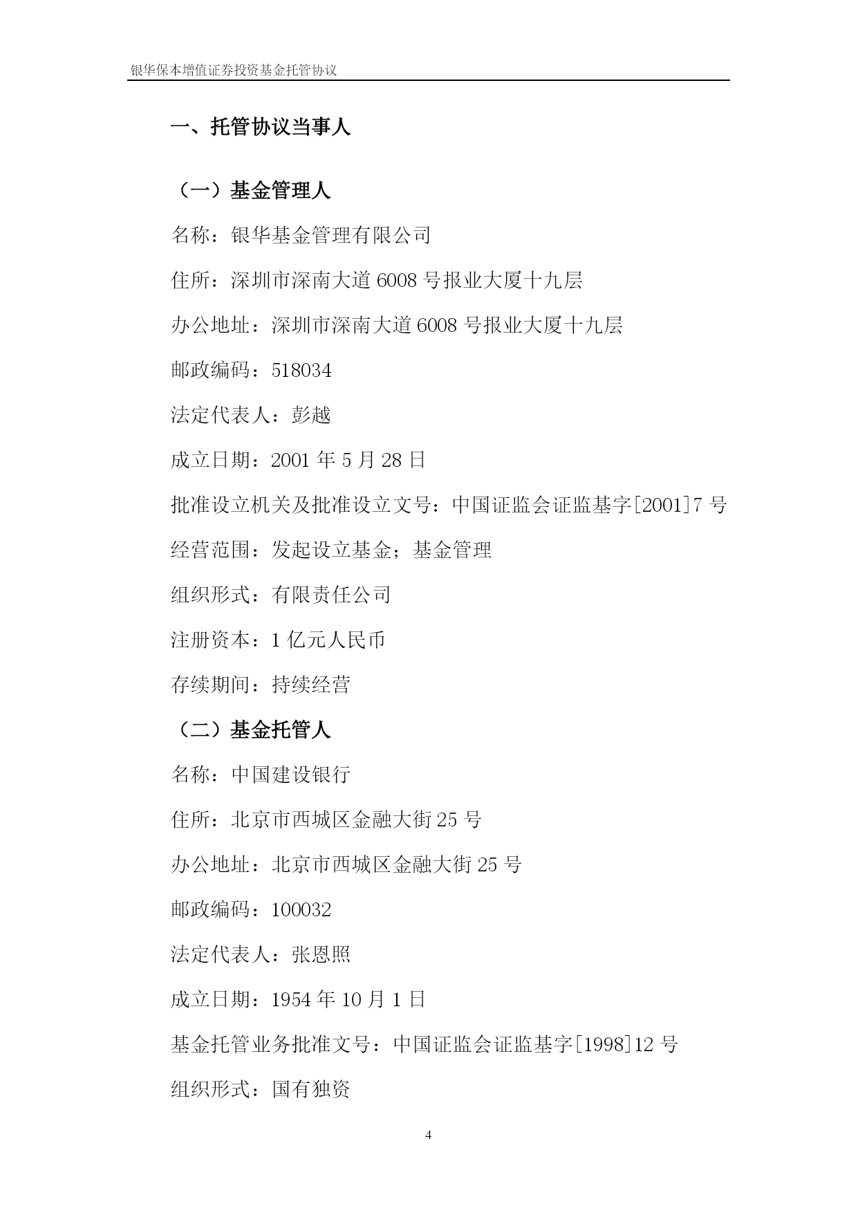 银华保本增值证券投资基金托管协议PAGE42银华保本增值证券投资基金托管协议基金管理人:银华基金管理有限公司基金托管人:中国建设银行目录TOC\o"1-3"\h\zHYPERLINK\l"_Toc59520001"一、托管协议当事人PAGEREF_Toc59520001\h4HYPERLINK\l"_Toc59520002"二、托管协议的依据、目的和原则PAGEREF_Toc59520002\h5HYPERLINK\l"_Toc59520003"三、基金托管人与基金管理人之间的业务监督与核查PAGEREF_Toc59520003\h6HYPERLINK\l"_Toc59520004"四、基金资产保管PAGEREF_Toc59520004\h7HYPERLINK\l"_Toc59520005"五、投资指令的发送、确认与执行PAGEREF_Toc59520005\h11HYPERLINK\l"_Toc59520006"六、交易安排PAGEREF_Toc59520006\h14HYPERLINK\l"_Toc59520007"七、基金认购、申购、赎回及分红资金的清算PAGEREF_Toc59520007\h17HYPERLINK\l"_Toc59520008"八、基金资产估值、基金资产净值计算与复核PAGEREF_Toc59520008\h20HYPERLINK\l"_Toc59520009"九、投资组合比例监控PAGEREF_Toc59520009\h24HYPERLINK\l"_Toc59520010"十、基金收益分配PAGEREF_Toc59520010\h25HYPERLINK\l"_Toc59520011"十一、基金持有人名册的登记与保管PAGEREF_Toc59520011\h26HYPERLINK\l"_Toc59520012"十二、基金的信息披露PAGEREF_Toc59520012\h27HYPERLINK\l"_Toc59520013"十三、基金有关文件和档案的保存PAGEREF_Toc59520013\h29HYPERLINK\l"_Toc59520014"十四、基金托管人报告PAGEREF_Toc59520014\h29HYPERLINK\l"_Toc59520015"十五、基金托管人和基金管理人的更换PAGEREF_Toc59520015\h29HYPERLINK\l"_Toc59520016"十六、基金管理费、基金托管费及其他费用PAGEREF_Toc59520016\h32HYPERLINK\l"_Toc59520017"十七、禁止行为PAGEREF_Toc59520017\h33HYPERLINK\l"_Toc59520018"十八、违约责任PAGEREF_Toc59520018\h34HYPERLINK\l"_Toc59520019"十九、净值差错处理PAGEREF_Toc59520019\h35HYPERLINK\l"_Toc59520020"二十、争议处理PAGEREF_Toc59520020\h37HYPERLINK\l"_Toc59520021"二十一、托管协议的效力PAGEREF_Toc59520021\h37HYPERLINK\l"_Toc59520022"二十二、托管协议的修改与终止PAGEREF_Toc59520022\h38HYPERLINK\l"_Toc59520023"二十三、其他事项PAGEREF_Toc59520023\h38HYPERLINK\l"_Toc59520024"二十四、托管协议当事人签章、签订地、签订日PAGEREF_Toc59520024\h38一、托管协议当事人(一)基金管理人名称:银华基金管理有限公司住所:深圳市深南大道6008号报业大厦十九层办公地址:深圳市深南大道6008号报业大厦十九层邮政编码:518034法定代表人:彭越成立日期:2001年5月28日批准设立机关及批准设立文号:中国证监会证监基字[2001]7号经营范围:发起设立基金;基金管理组织形式:有限责任公司注册资本:1亿元人民币存续期间:持续经营(二)基金托管人名称:中国建设银行住所