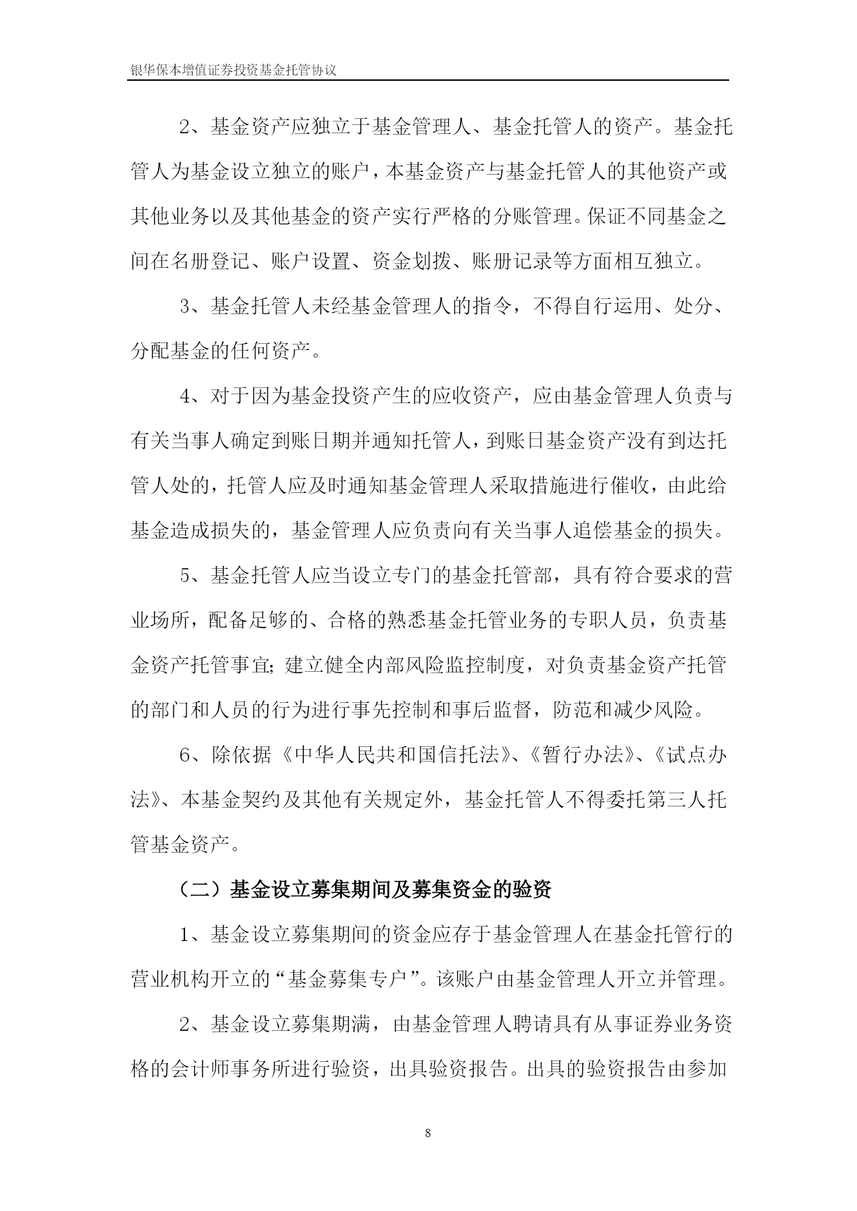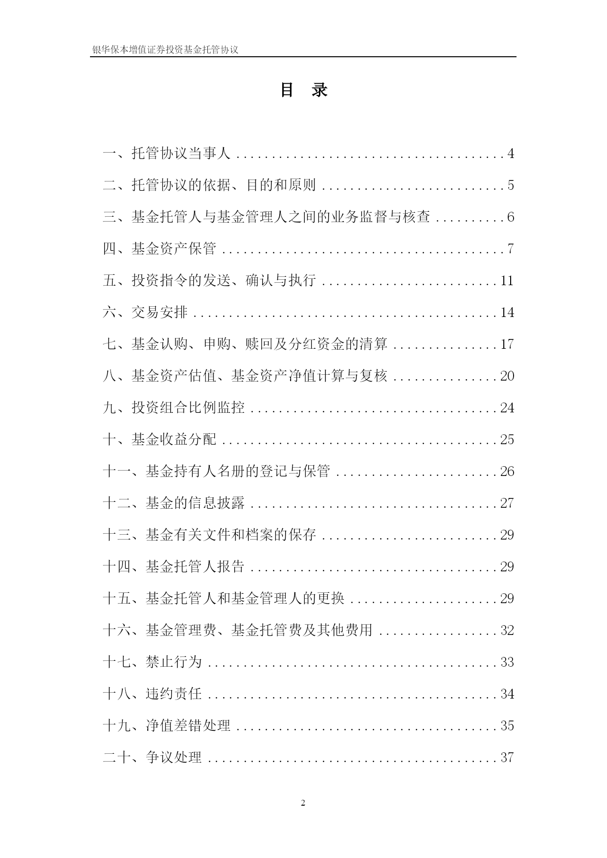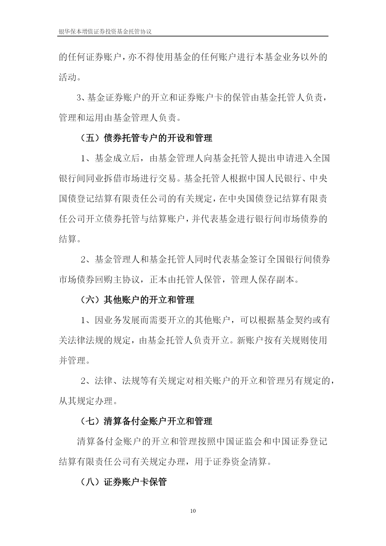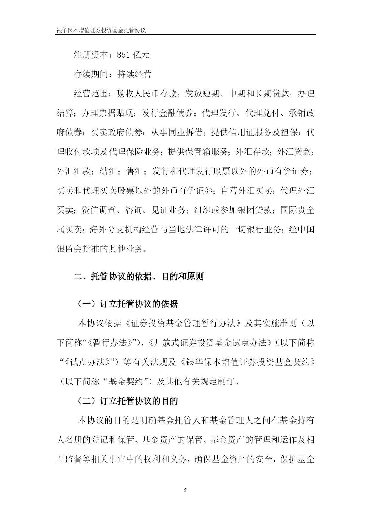 银华保本增值证券投资基金托管协议PAGE42银华保本增值证券投资基金托管协议基金管理人:银华基金管理有限公司基金托管人:中国建设银行目录TOC\o"1-3"\h\zHYPERLINK\l"_Toc59520001"一、托管协议当事人PAGEREF_Toc59520001\h4HYPERLINK\l"_Toc59520002"二、托管协议的依据、目的和原则PAGEREF_Toc59520002\h5HYPERLINK\l"_Toc59520003"三、基金托管人与基金管理人之间的业务监督与核查PAGEREF_Toc59520003\h6HYPERLINK\l"_Toc59520004"四、基金资产保管PAGEREF_Toc59520004\h7HYPERLINK\l"_Toc59520005"五、投资指令的发送、确认与执行PAGEREF_Toc59520005\h11HYPERLINK\l"_Toc59520006"六、交易安排PAGEREF_Toc59520006\h14HYPERLINK\l"_Toc59520007"七、基金认购、申购、赎回及分红资金的清算PAGEREF_Toc59520007\h17HYPERLINK\l"_Toc59520008"八、基金资产估值、基金资产净值计算与复核PAGEREF_Toc59520008\h20HYPERLINK\l"_Toc59520009"九、投资组合比例监控PAGEREF_Toc59520009\h24HYPERLINK\l"_Toc59520010"十、基金收益分配PAGEREF_Toc59520010\h25HYPERLINK\l"_Toc59520011"十一、基金持有人名册的登记与保管PAGEREF_Toc59520011\h26HYPERLINK\l"_Toc59520012"十二、基金的信息披露PAGEREF_Toc59520012\h27HYPERLINK\l"_Toc59520013"十三、基金有关文件和档案的保存PAGEREF_Toc59520013\h29HYPERLINK\l"_Toc59520014"十四、基金托管人报告PAGEREF_Toc59520014\h29HYPERLINK\l"_Toc59520015"十五、基金托管人和基金管理人的更换PAGEREF_Toc59520015\h29HYPERLINK\l"_Toc59520016"十六、基金管理费、基金托管费及其他费用PAGEREF_Toc59520016\h32HYPERLINK\l"_Toc59520017"十七、禁止行为PAGEREF_Toc59520017\h33HYPERLINK\l"_Toc59520018"十八、违约责任PAGEREF_Toc59520018\h34HYPERLINK\l"_Toc59520019"十九、净值差错处理PAGEREF_Toc59520019\h35HYPERLINK\l"_Toc59520020"二十、争议处理PAGEREF_Toc59520020\h37HYPERLINK\l"_Toc59520021"二十一、托管协议的效力PAGEREF_Toc59520021\h37HYPERLINK\l"_Toc59520022"二十二、托管协议的修改与终止PAGEREF_Toc59520022\h38HYPERLINK\l"_Toc59520023"二十三、其他事项PAGEREF_Toc59520023\h38HYPERLINK\l"_Toc59520024"二十四、托管协议当事人签章、签订地、签订日PAGEREF_Toc59520024\h38一、托管协议当事人(一)基金管理人名称:银华基金管理有限公司住所:深圳市深南大道6008号报业大厦十九层办公地址:深圳市深南大道6008号报业大厦十九层邮政编码:518034法定代表人:彭越成立日期:2001年5月28日批准设立机关及批准设立文号:中国证监会证监基字[2001]7号经营范围:发起设立基金;基金管理组织形式:有限责任公司注册资本:1亿元人民币存续期间:持续经营(二)基金托管人名称:中国建设银行住所