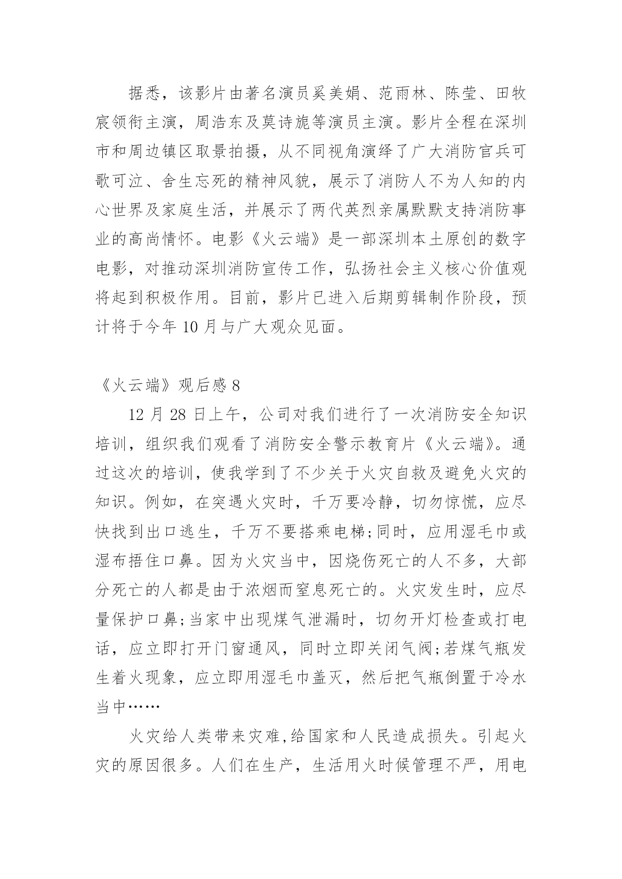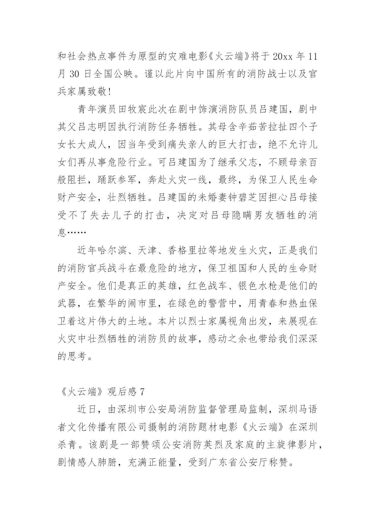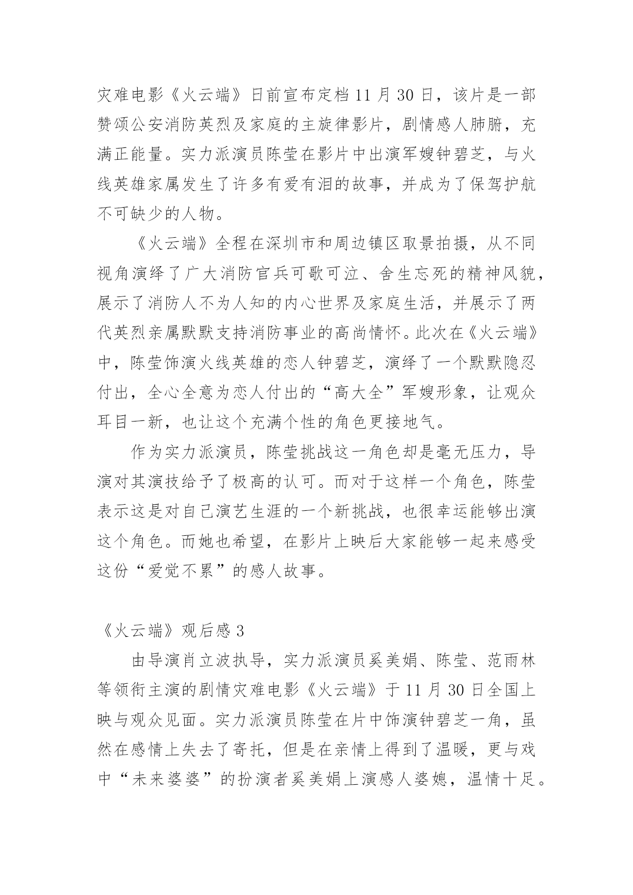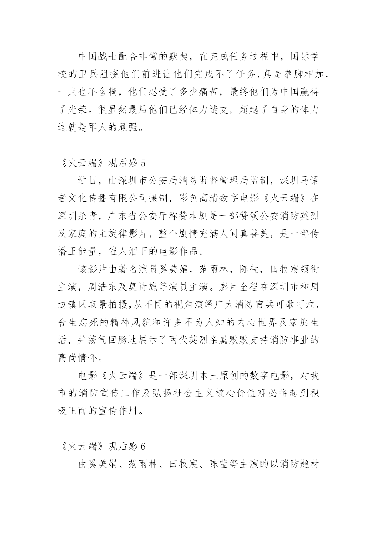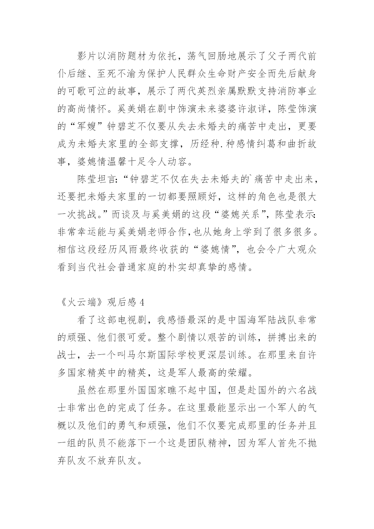 《火云端》观后感认真品味一部作品后,一定有不少感悟吧,需要写一篇观后感好好地作记录了。你想知道观后感怎么写吗?下面是小编为大家收集的《火云端》观后感,希望对大家有所帮助。《火云端》观后感1我公司今天下午组织观看了安全教育片《火云端》后,学到了不少关于火灾自救及避免火灾的知识。例如,在突遇火灾时,千万要冷静,切勿惊慌,应尽快找到出口逃生,千万不要搭乘电梯;同时,应用湿毛巾或湿布捂住口鼻。因为火灾当中,因烧伤死亡的人不多,大部分死亡的人都是由于浓烟而窒息死亡的。火灾发生时,应尽量保护口鼻;当家中出现煤气泄漏时,切勿开灯检查或打电话,应立即打开门窗通风,同时立即关闭气阀;若煤气瓶发生着火现象,应立即用湿毛巾盖灭,然后把气瓶倒置于冷水当中……自救是必须的,然而更重要的是防范于未然。影片中还提到,应时刻注意防火,出入家门应检查煤气阀门;商场楼梯过道等逃生通道切勿摆放杂物,应预备灭火器或沙子;应定时检查灭火器的使用日期并注意更换,不要乱扔烟头……只有做到“防”“救”结合,才能减轻火灾带来的伤害。《火云端》观后感2由实力派演员奚美娟、陈莹、范雨林等领衔主演的剧情灾难电影《火云端》日前宣布定档11月30日,该片是一部赞颂公安消防英烈及家庭的主旋律影片,剧情感人肺腑,充满正能量。实力派演员陈莹在影片中出演军嫂钟碧芝,与火线英雄家属发生了许多有爱有泪的故事,并成为了保驾护航不可缺少的人物。《火云端》全程在深圳市和周边镇区取景拍摄,从不同视角演绎了广大消防官兵可歌可泣、舍生忘死的精神风貌,展示了消防人不为人知的内心世界及家庭生活,并展示了两代英烈亲属默默支持消防事业的高尚情怀。此次在《火云端》中,陈莹饰演火线英雄的恋人钟碧芝,演绎了一个默默隐忍付出,全心全意为恋人付出的“高大全”军嫂形象,让观众耳目一新,也让这个充满个性的角色更接地气。作为实力派演员,陈莹挑战这一角色却是毫无压力,导演对其演技给予了极高的认可。而对于这样一个角色,陈莹表示这是对自己演艺生涯的一个新挑战,也很幸运能够出演这个角色。而她也希望,在影片上映后大家能够一起来感受这份“爱觉不累”的感人故事。《火云端》观后感3由导演肖立波执导,实力派演员奚美娟、陈莹、范雨林等领衔主演的剧情灾难电影《火云端》于11月30日全国上映与观众见面。实力派演员陈莹在片中饰演钟碧芝一角,虽然在感情上失去了寄托,但是在亲情上得到了温暖,更与戏中“未来婆婆”的扮演者奚美娟上演感人婆媳,温情十足。影片以消防题材为依托,荡气回肠地展示了父子两代前仆后继、至死不渝为保护人民群众生命财产安全而先后献身的可歌可泣的故事,展示了两代英烈亲属默默支持消防事业的高尚情怀。奚美娟在剧中饰演未来婆婆许淑详,陈莹饰演的“军嫂”钟碧芝不仅要从失去未婚夫的痛苦中走出,更要成为未婚夫家里的全部支撑,历经种.种感情纠葛和曲折故事,婆媳情温馨十足令人动容。陈莹坦言:“钟碧芝不仅在失去未婚夫的`痛苦中走出来,还要把未婚夫家里的一切都要照顾好,这样的角色也是很大一次挑战。”而谈及与奚美娟的这段“婆媳关系”,陈莹表示:非常幸运能与奚美娟老师合作,也从她身上学到了很多很多。相信这段经历风雨最终收获的“婆媳情”,也会令广大观众看到当代社会普通家庭的朴实却真挚的感情。《火云端》观后感4看了这部电视剧,我感悟最深的是中国海军陆战队非常的顽强、他们很可爱。整个剧情以艰苦的训练,拼搏出来的战士,去一个叫马尔斯国际学校更深层训练。在那里来自许多国家精英中的精英,这是军人最高的荣耀。虽然在那里外国国家瞧不起中国,但是赴国外的六名战士非常出色的完成了任务。在这里最能显示出一个军人的气概以及他们的勇气和顽强,他们不仅要完成那里的任务并且一组的队员不能落下一个这是团队精神,因为军人首先不抛弃队友不放弃队友。中国战士配合非常的默契,在完成任务过程中,国际学校的卫兵阻挠他们前进让他们完成不了任务,真是拳脚相加,一点也不含糊,他们忍受了多少痛苦,最终他们为中国赢得了光荣。很显然最后他们已经体力透支,超越了自身的体力这就是军人的顽强。《火云端》观后感5近日,由深圳市公安局消防监督管理局监制,深圳马语者文化传播有限公司摄制,彩色高清数字电影《火云端》在深圳杀青,广东省公安厅称赞本剧是一部赞颂公安消防英烈及家庭的主旋律影片,整个剧情充满人间真善美,是一部传播正能量,催人泪下的电影作品。该影片由著名演员奚美娟,范雨林,陈莹,田牧宸领衔主演,周浩东及莫诗旎等演员主演。影片全程在深圳市和周边镇区取景拍摄,从不同的视角演绎广大消防官兵可歌可泣,舍生忘死的精神风貌和许多不为人知的内心世界及家庭生活,并荡气回肠地展示了两代英烈亲属默默支持消防事业的高尚情怀。电影《火云端》是一部深圳本土原创的数字电影,对我市的消防宣传工作及弘扬社会主义核心价值观必将起到积极正面的宣传作用。《火云端》观后感