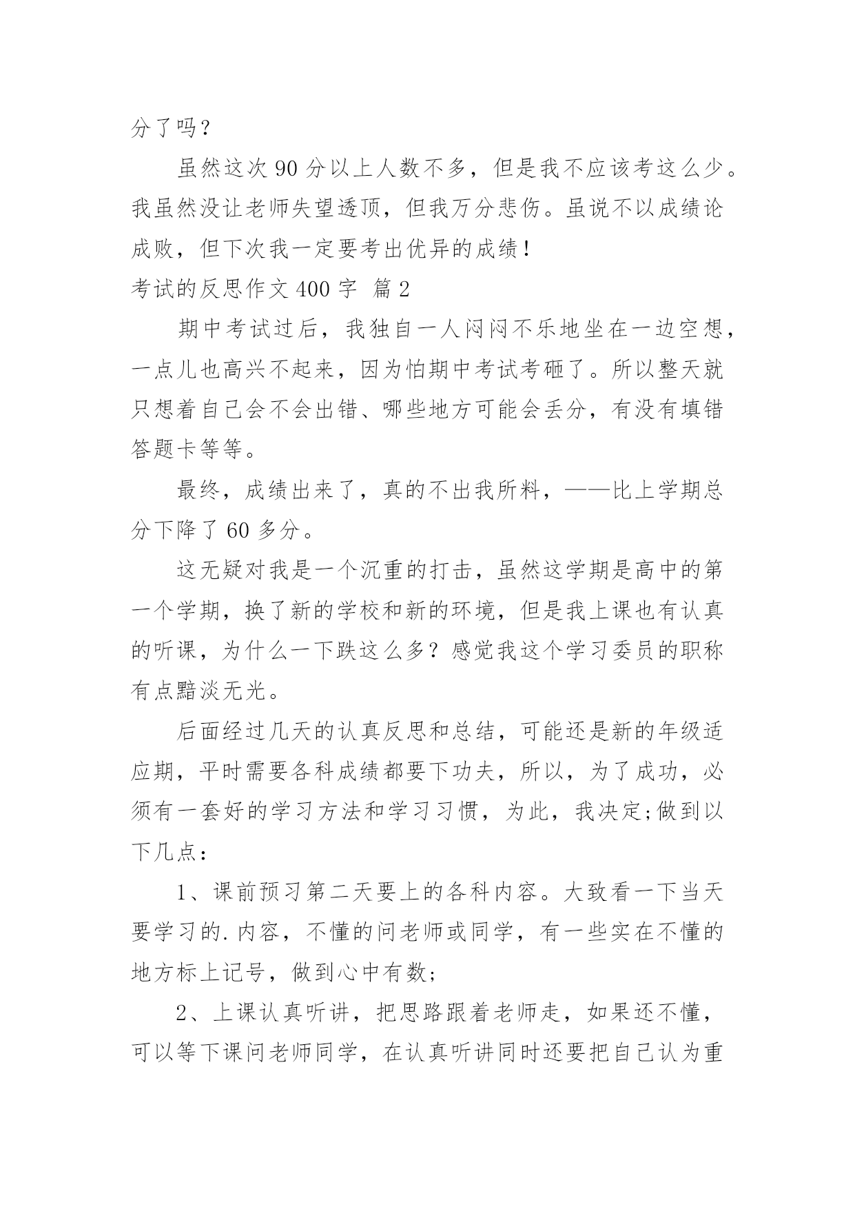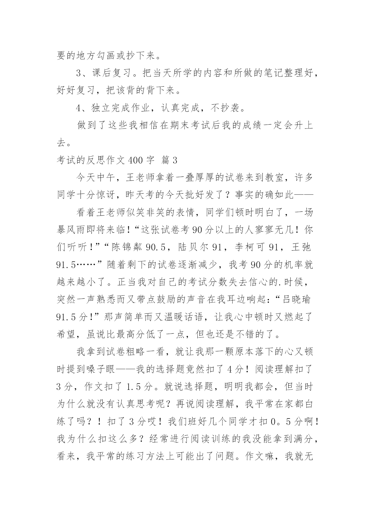 考试的反思作文400字有关考试的反思作文400字三篇在现实生活或工作学习中,大家对作文都再熟悉不过了吧,作文一定要做到主题集中,围绕同一主题作深入阐述,切忌东拉西扯,主题涣散甚至无主题。作文的注意事项有许多,你确定会写吗?下面是小编帮大家整理的考试的反思作文400字3篇,欢迎大家分享。考试的反思作文400字篇1“吴启玄,88分!”这句话如晴天霹雳一样撕碎了我的心。我的心灵上留下一道深深的,不可抹支的伤痕。平时前几名的我怎么突然下滑了?我该考这么一点分吗?不该呀,不该呀,我考第一才应该。我一定让郭老师失望了,她培养的`这匹小千里马这次失手了,捧着那张试卷,看着那一个个红叉叉,我恨自己,为什么没为班级争光?天哪,这些错题,老师基本都讲过呀。我怎么还作错了?字错、词错、填空错,这次全错了,分全没了,全被扣完了。有一道题,就因为我粗心,没看清题,结果挨了大半对,扣了2分。这种错误该错吗?该打!还有一题,原来考试时错过,这次又错了,根本没有汲取上次的教训,根本就没长记性!另外一题老师在课堂上就讲过,可是老师讲的答案,我全“大公无私”地还给了老师。上课不仔细听讲,错了活该!我把卷子认真分析了一下,有7分不该丢!有了这7分,我就不成了95.5分了吗?虽然这次90分以上人数不多,但是我不应该考这么少。我虽然没让老师失望透顶,但我万分悲伤。虽说不以成绩论成败,但下次我一定要考出优异的成绩!考试的反思作文400字篇2期中考试过后,我独自一人闷闷不乐地坐在一边空想,一点儿也高兴不起来,因为怕期中考试考砸了。所以整天就只想着自己会不会出错、哪些地方可能会丢分,有没有填错答题卡等等。最终,成绩出来了,真的不出我所料,——比上学期总分下降了60多分。这无疑对我是一个沉重的打击,虽然这学期是高中的第一个学期,换了新的学校和新的环境,但是我上课也有认真的听课,为什么一下跌这么多?感觉我这个学习委员的职称有点黯淡无光。后面经过几天的认真反思和总结,可能还是新的年级适应期,平时需要各科成绩都要下功夫,所以,为了成功,必须有一套好的学习方法和学习习惯,为此,我决定;做到以下几点:1、课前预习第二天要上的各科内容。大致看一下当天要学习的.内容,不懂的问老师或同学,有一些实在不懂的地方标上记号,做到心中有数;2、上课认真听讲,把思路跟着老师走,如果还不懂,可以等下课问老师同学,在认真听讲同时还要把自己认为重要的地方勾画或抄下来。3、课后复习。把当天所学的内容和所做的笔记整理好,好好复习,把该背的背下来。4、独立完成作业,认真完成,不抄袭。做到了这些我相信在期末考试后我的成绩一定会升上去。考试的反思作文400字篇3今天中午,王老师拿着一叠厚厚的试卷来到教室,许多同学十分惊讶,昨天考的今天批好发了?事实的确如此——看着王老师似笑非笑的表情,同学们顿时明白了,一场暴风雨即将来临!“这张试卷考90分以上的人寥寥无几!你们听听!”“陈锦粼90.5,陆贝尔91,李柯可91,王弛91.5……”随着剩下的试卷逐渐减少,我考90分的机率就越来越小了。正当我对自己的考试分数失去信心的.时候,突然一声熟悉而又带点鼓励的声音在我耳边响起:“吕晓瑜91.5分!”那声简单而又温暖话语,让我心中顿时又燃起了希望,虽说比最高分低了一点,但也还是不错的了。我拿到试卷粗略一看,就让我那一颗原本落下的心又顿时提到嗓子眼——我的选择题竟然扣了4分!阅读理解扣了3分,作文扣了1.5分。就说选择题,明明我都会,但当时为什么就没有认真思考呢?再说阅读理解,我平常在家都白练了吗?!扣了3分哎!我们班好几个同学才扣0。5分啊!我为什么扣这么多?经常进行阅读训练的我没能拿到满分,看来,我平常的练习方法上可能出了问题。作文嘛,我就无话可说了,以前我作文扣分都特别少,这次呢,也不算多。但仔细想想,0.5分也不能小瞧的,多丢0.5分,说不定就不能名列前茅了;说不定就因为它考不上好学校了,那时,这0.5分就是大用场了!下次考试一定要克服粗心这个问题,认真思考,争取考个更好的成绩!