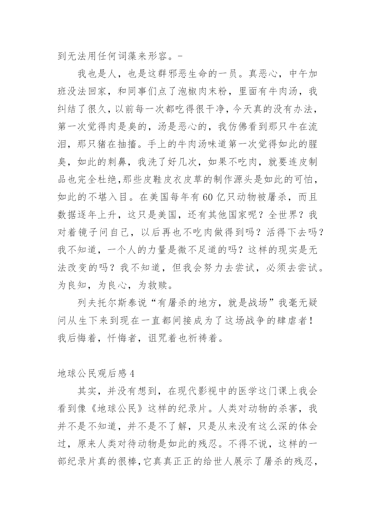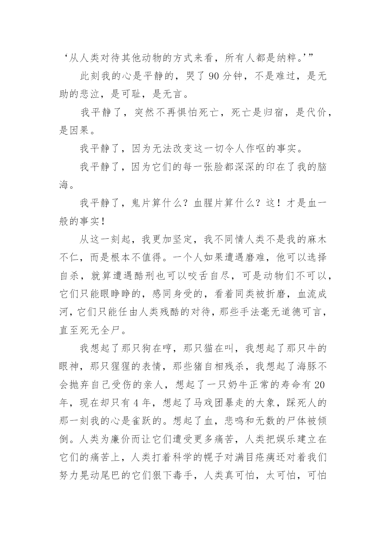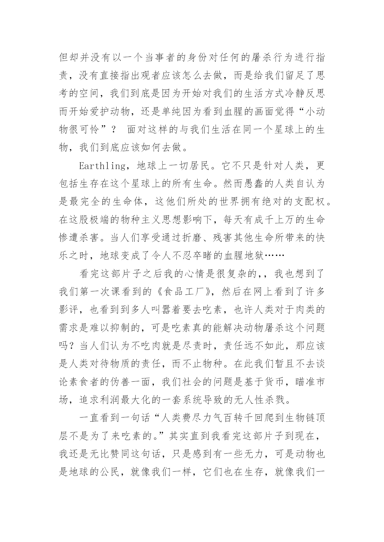 地球公民观后感当认真看完一部作品后,相信大家的视野一定开拓了不少吧,记录下来很重要哦,一起来写一篇观后感吧。观后感你想好怎么写了吗?下面是小编整理的地球公民观后感,希望对大家有所帮助。地球公民观后感1情感至深,很难说出话来。如何表达自己的感受,痛恨人类的行为?还是下定决心从此素食,爱护动物?面对数千年的历史,且不从人类的角度。我也无法去描述人类是如何演变成这样的。我,面对千年的历史。我说不出话,下定不了决心。下定决心,可以用笔记录起来,可以说一千遍。但是假如不坚守,随时都会违心。心是摇曳不定的。现代化社会,人类制定了许多规定,公约。为了给动物死亡前仅剩的一段时间以尊严,优待。机械化屠杀。工作人员也是为了生活而重复着动作。不必说他们多么狠毒,供给本身还是因为需求。动物机械化的生长,从生至死,正如人类寻求目的却依旧只能以人类自身设定目的而追寻直至死亡。人有旦夕祸福,其实人类本质和动物一样,生死往复,死不知生,生不知死。子非鱼焉知鱼之痛。自以为聪明者,不能全然理解哪些愚昧的人或智者他们的幸福和悲伤、以上两句有明显的矛盾存在。我们不了解动物,所以我就不能说人类和动物一样。子非鱼焉知鱼之痛,我不了解你,所以我更不能了解到你了解的我是如何的。看到血腥的场面,我会悲伤。会愤怒。更多的是悲伤和无奈。悲伤是因为面对死亡挣扎抽搐时的无力,无奈跟多的是因为为什么动物和人类要存在在这里,动物被人类所食用食用娱乐。人本身就是动物,可是有时却会那动物和人类区分开来。弱肉强食是自然法则,是人们观察出来的。甚至动物间自相残杀。这些可以给人类残杀动物带来慰藉和借口。总是能找到合适的理由来安慰自己的内心。面对可怜楚楚的羊羔,和一贯认为的蠢猪,憨厚的牛,人类的伙伴狗,还有卖萌的猫儿,我们跟多的会流露出许多情感,但是面对一只虫子,卫生间里的蟑螂。捏死小飞虫,踩死蟑螂。在那一刻,看到被踩扁的蟑螂,稀烂。我想像这对生命的敬畏,但是不知如何控制自己。这些对我们生活是不利的,影响到我们了,可是我们有权利去决定他们的生死么。这一刻他们只是因为光芒飞到夜晚你闪烁的电脑屏幕上,下一刻就被你的双手捏碎成为残骸。我们凭什么拥有决定它们命运的权利,只是我们强大,力量?我们可以让他们死,而且在心理上并不会造成什么影响。可是它们却死亡了。至少这个死亡的定义源于人类,与人类的死亡差别不大。太多想不明白的问题,以及太多想来无益的问题,归类于无益,是因为想不明白。想不明白,首先是承认自己的无知,以及学习前人的东西学的太少。而是,不知道通过什么途径去搞明白去这些事情。悲伤我却流不出眼泪。眼泪在打转,自然的回避,不想去看第二遍。让人认识自己的残忍,并改变。这个就像抢走你理所应当获得的东西。任谁说因果论,大自然,动物对人类的报复。这些都不足以惊醒人类。就是事不关己高高挂起,活一天算一天。当习以为常的做一件事,你不会觉得这很残忍。让你改变比较残忍。无知转化为愤怒。愤怒的`是我们的无知。不断有人提出各种理论,为了我们活的好,或者苦修。但是没有人告诉我们死亡和活着的差别是什么,这不是一个选择题。因为只有a和b,但你不知道ab的结局是什么。以至于人类根本不敢选择。只能沿着活着走。既然只能如此选择,于是人们要活的痛快。要自己给自己找事做。不想说这些浅显无畏的话。因为终究追寻不到什么。甚至追寻都是人类自己创造出来的文字所富裕的含义。地球公民观后感2看完《地球公民》,我哭得很痛,为自己曾经的食肉经历…忏悔自己以往的无知。看着看着,我便沉重起来,我的泪眼让我的视线更加模糊。画质虽然不清晰,但足以带来巨大的视觉冲击和心灵煎熬。我突然想到了世界末日,这真的不是预言,毁灭距离人类难道不是越来越近了吗?《地球公民》的译制来自志愿者,我还不太清楚这背后的故事,这是一个怎样的发起?它是由怎样的一些人拍摄制作完成的?它有没有遭到被禁?它会不会遭遇某愚人政府、某盈利集团、某贪婪企业、某别有用心人群的攻击和反驳?正如影片所言,真相被认知需要经过三个阶段:一、嘲笑;二、强烈反对;三、承认。目前在国内或许还没有该影片的拷贝,而它也可能不会被选择公映,但我想我会尽自己所能让它流通。我闭着眼睛,但是内心很不平静。我们人类真的不是在工业文明中进步,确切地说,我们是在退步,并在义无反顾地奔向"天堂",这是真正的死亡之旅。我们已经毁灭和改变了很多,不是让一切变得更好,而是更糟糕!这一切都是我们自己亲手制造的。我们尽情地释放我们的欲望(我更愿意把它称之为贪欲),这难道不是所有灾难的祸起之端吗?我们没有直接参与杀戮,但是谁又能说自己没有间接地参与屠杀?是不是只有残害同族才能被称之为惨无人寰?我们不是都在冠冕堂皇地求和平吗?而其它物种和族群生存的全部意义难道就仅仅是来满足人类的娱乐、食用、穿着、医疗实验、军事和所有任意的践踏与屠杀?……我们一刻也离不