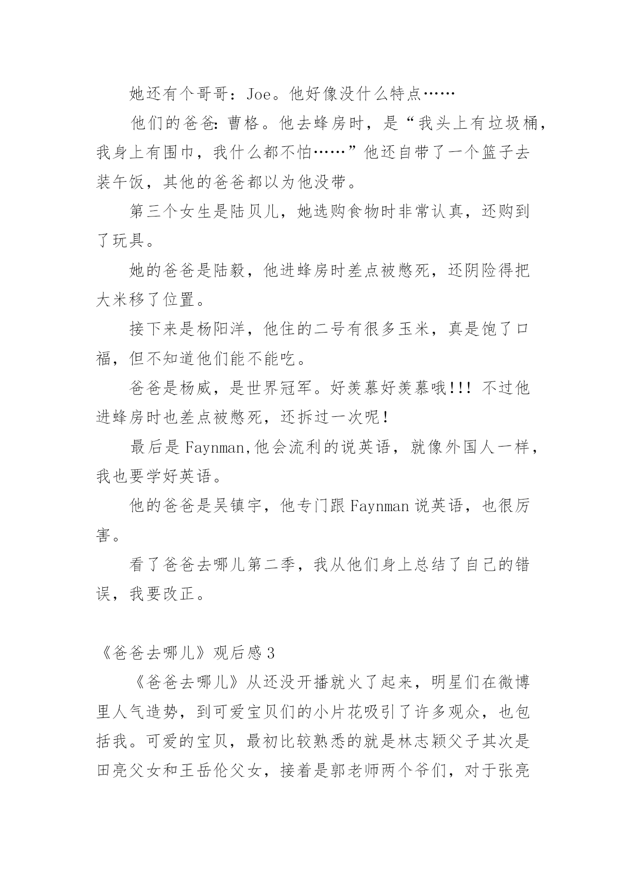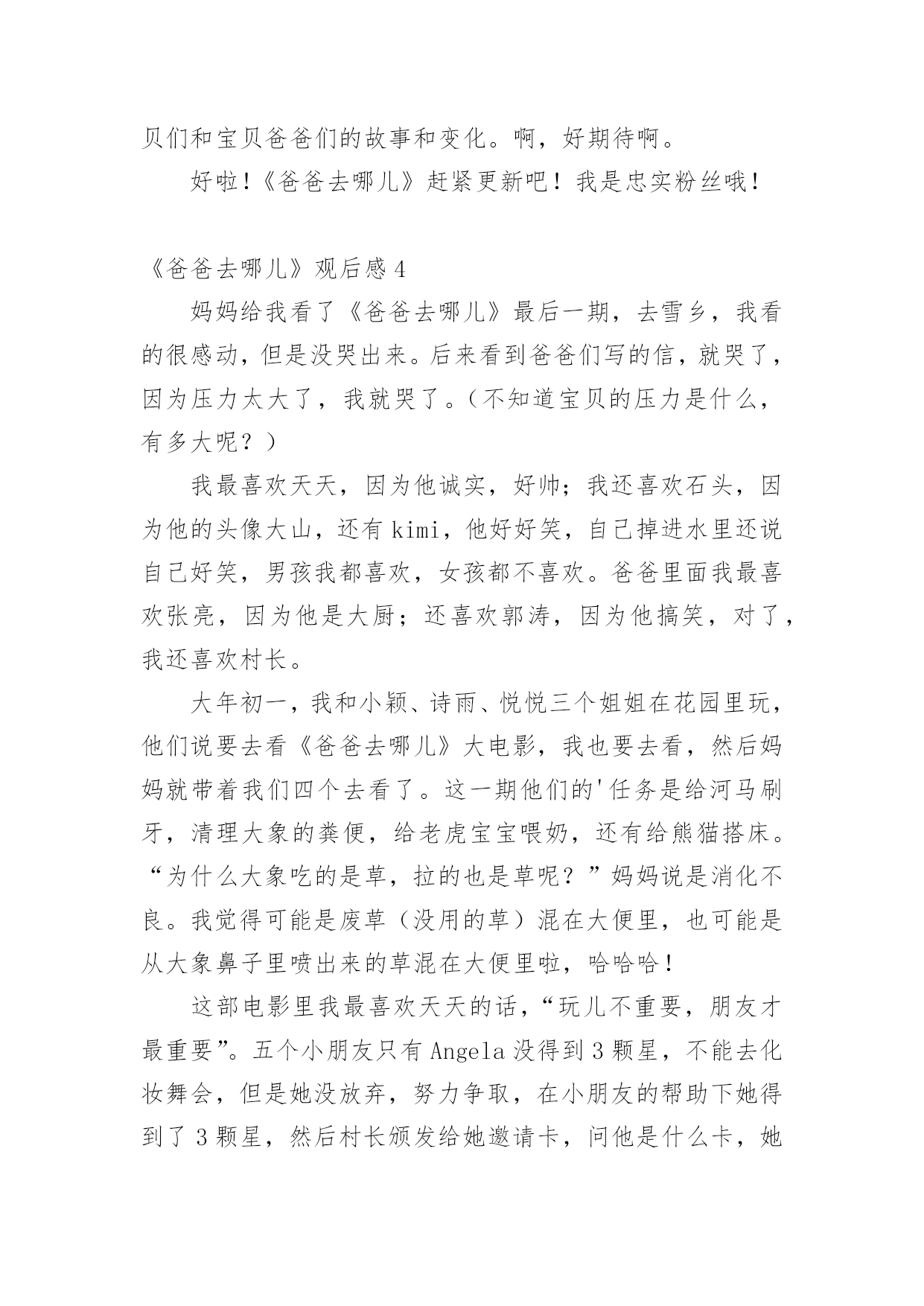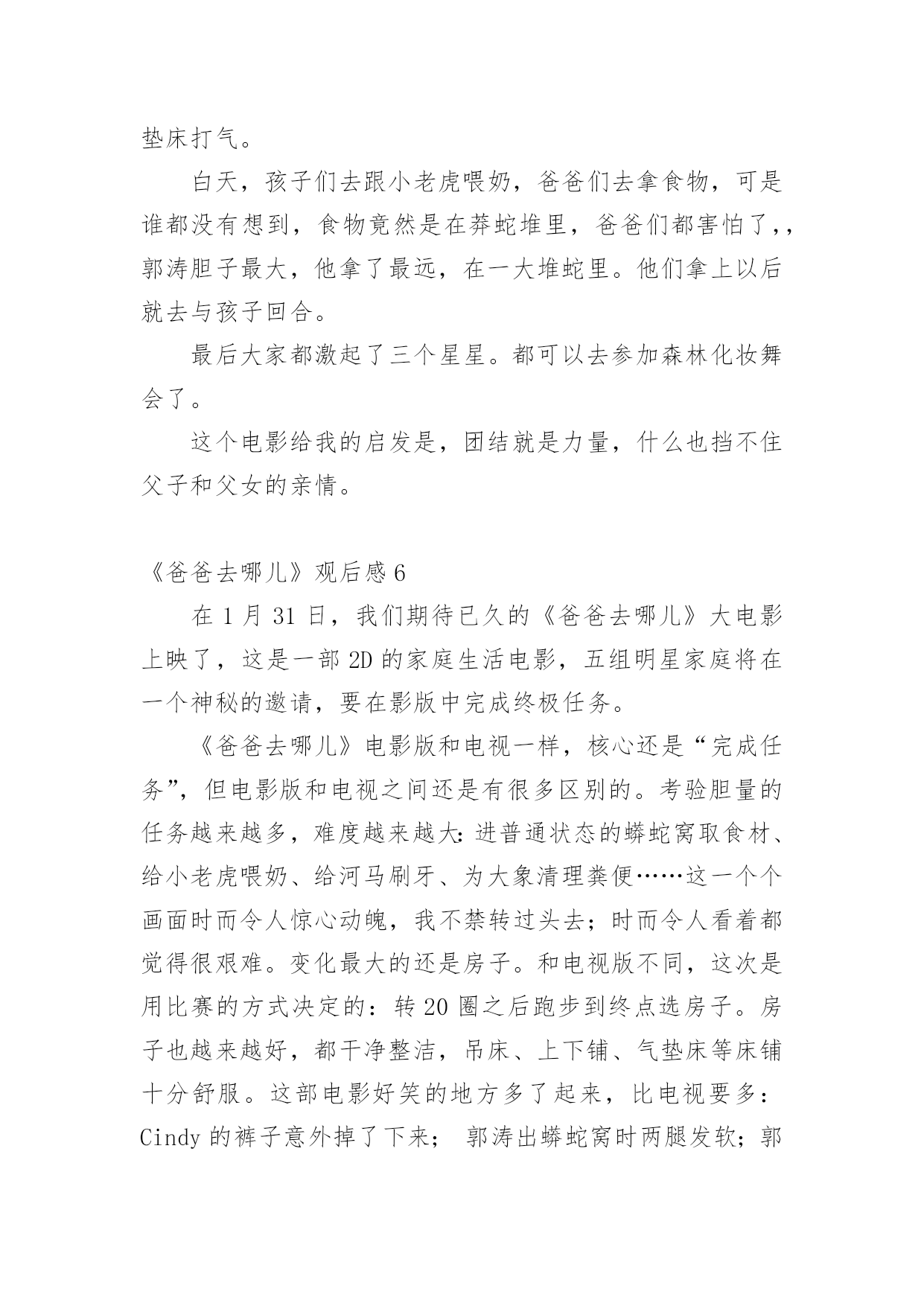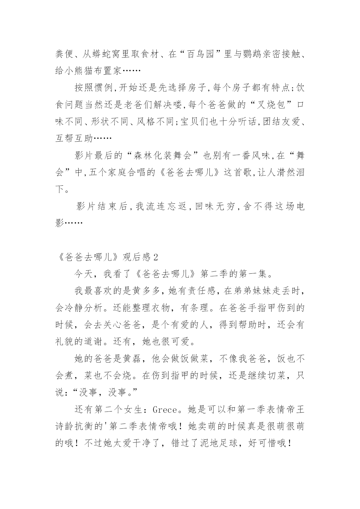 《爸爸去哪儿》观后感当品味完一部作品后,相信大家有很多值得分享的东西吧,何不写一篇观后感记录下呢?那么你真的懂得怎么写观后感吗?以下是小编整理的《爸爸去哪儿》观后感,欢迎阅读,希望大家能够喜欢。《爸爸去哪儿》观后感1在寒假里,我们可以尽情玩耍,也可以去外地旅游,还可以参加一些有意义的活动,可以……而我今天决定去看电影。《爸爸去哪儿》可算是“火”了,每个萌宝都给人留下了深刻的印象,作为小粉丝的'我,怎么能错过他们演的电影呢?于是,我和妈妈、表妹一起向着《爸爸去哪儿大电影》出发!吃过午饭已经十二点了,稍稍休息后,我们就踏上了“看电影之路”。我建议走路去电影院,路程又不远,还可以锻炼身体,一举两得。我的这个建议立刻被妈妈采用了。由于是中午,大街上很冷清,就只有七八个人。很快,我们就到了“大地电影院”。电影院里的人也很少,除了我们以外,还有两个人,居然也是看《爸爸去哪儿大电影》的!我们是十二点半到达电影院的,恰巧,有一场电影是十二点四十分放映的,我们就看这场喽。电影开始了!五个宝贝陆续登场,开始了他们与爸爸的“丛林冒险”——给小老虎喂奶、给河马刷牙、给大象清理粪便、从蟒蛇窝里取食材、在“百鸟园”里与鹦鹉亲密接触、给小熊猫布置家……按照惯例,开始还是先选择房子,每个房子都有特点;饮食问题当然还是老爸们解决喽,每个爸爸做的“叉烧包”口味不同、形状不同、风格不同;宝贝们也十分听话,团结友爱、互帮互助……影片最后的“森林化装舞会”也别有一番风味,在“舞会”中,五个家庭合唱的《爸爸去哪儿》这首歌,让人潸然泪下。影片结束后,我流连忘返,回味无穷,舍不得这场电影……《爸爸去哪儿》观后感2今天,我看了《爸爸去哪儿》第二季的第一集。我最喜欢的是黄多多,她有责任感,在弟弟妹妹走丢时,会冷静分析。还能整理衣物,有条理。在爸爸手指甲伤到的时候,会去关心爸爸,是个有爱的人,得到帮助时,还会有礼貌的道谢。还有,她也很可爱。她的爸爸是黄磊,他会做饭做菜,不像我爸爸,饭也不会煮,菜也不会烧。在伤到指甲的时候,还是继续切菜,只说:“没事,没事。”还有第二个女生:Grece。她是可以和第一季表情帝王诗龄抗衡的'第二季表情帝哦!她卖萌的时候真是很萌很萌的哦!不过她太爱干净了,错过了泥地足球,好可惜哦!她还有个哥哥:Joe。他好像没什么特点……他们的爸爸:曹格。他去蜂房时,是“我头上有垃圾桶,我身上有围巾,我什么都不怕……”他还自带了一个篮子去装午饭,其他的爸爸都以为他没带。第三个女生是陆贝儿,她选购食物时非常认真,还购到了玩具。她的爸爸是陆毅,他进蜂房时差点被憋死,还阴险得把大米移了位置。接下来是杨阳洋,他住的二号有很多玉米,真是饱了口福,但不知道他们能不能吃。爸爸是杨威,是世界冠军。好羡慕好羡慕哦!!!不过他进蜂房时也差点被憋死,还拆过一次呢!最后是Faynman,他会流利的说英语,就像外国人一样,我也要学好英语。他的爸爸是吴镇宇,他专门跟Faynman说英语,也很厉害。看了爸爸去哪儿第二季,我从他们身上总结了自己的错误,我要改正。《爸爸去哪儿》观后感3《爸爸去哪儿》从还没开播就火了起来,明星们在微博里人气造势,到可爱宝贝们的小片花吸引了许多观众,也包括我。可爱的宝贝,最初比较熟悉的就是林志颖父子其次是田亮父女和王岳伦父女,接着是郭老师两个爷们,对于张亮和天天真的很陌生,不过第一眼就觉得张亮和天天好养眼。一、野外综艺这种全新的节目录制方式和大牌制作实在是新鲜。类似于纪录片,又是综艺娱乐,的确有很多丰富的看点,真心是喜闻乐见、老少咸宜。节目中偶尔有几个画面是明星的周围的摄像师、摄像机、航拍机。哇塞!高制作啊!这么多角度的采集,绝对内容丰富,亮点多多。《爸爸去哪儿》应该可以算是和其他户外的综艺节目不同,或者新高度的综艺娱乐节目的尝试。以前,各卫视有户外的`综艺,大抵都是那些在水上闯关的,或者游戏获奖之类的。这次有纪实,有“探险”,有“窥私”,一饱眼福。二、明星亲子爸爸妈妈很少看除央视之外的节目,这次出奇的喜欢《爸爸去哪儿》,因为有他们喜欢的孩纸们,还有一起探讨怎么教育孩纸才对。老爸特别喜欢王诗龄,觉得恬恬是个懂事礼貌的小妞,胖嘟嘟的很是惹人爱,妈妈特别喜欢天天,觉得这个男孩帅气,懂事,礼貌,阳光。每个孩子都是天使,没有哪个真的比较好哪个比较不好,只是你更喜欢哪一种类型。三、背后的妈妈看完了爸爸和宝宝后,大家自然而然的就会想知道宝宝的妈妈是啥样的,除了明星妈妈的过去还有最新动态以及圈外妈妈的其他情况资料,想必,你也和我一样八卦吧,那么《爸爸去哪儿》为什么不让妈妈们也到最后来亮亮相讲讲宝贝们和宝贝爸爸们的故事和变化。啊,好期待啊。好啦!《爸爸去哪儿》赶紧更新吧!我是忠实粉丝哦!《爸爸去哪儿》观后感4妈妈给我看了《爸爸去哪儿》最后一期,去雪乡,我看的很感动,但是没哭出来。后来