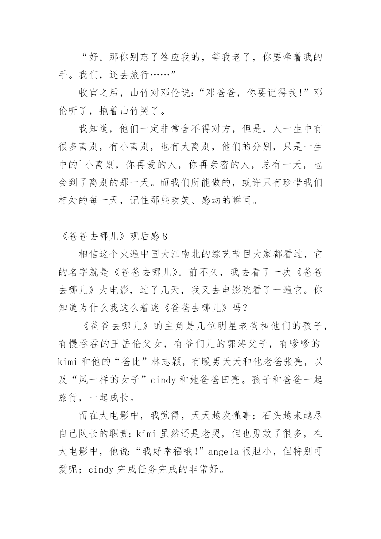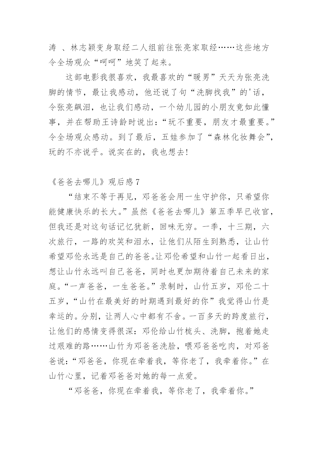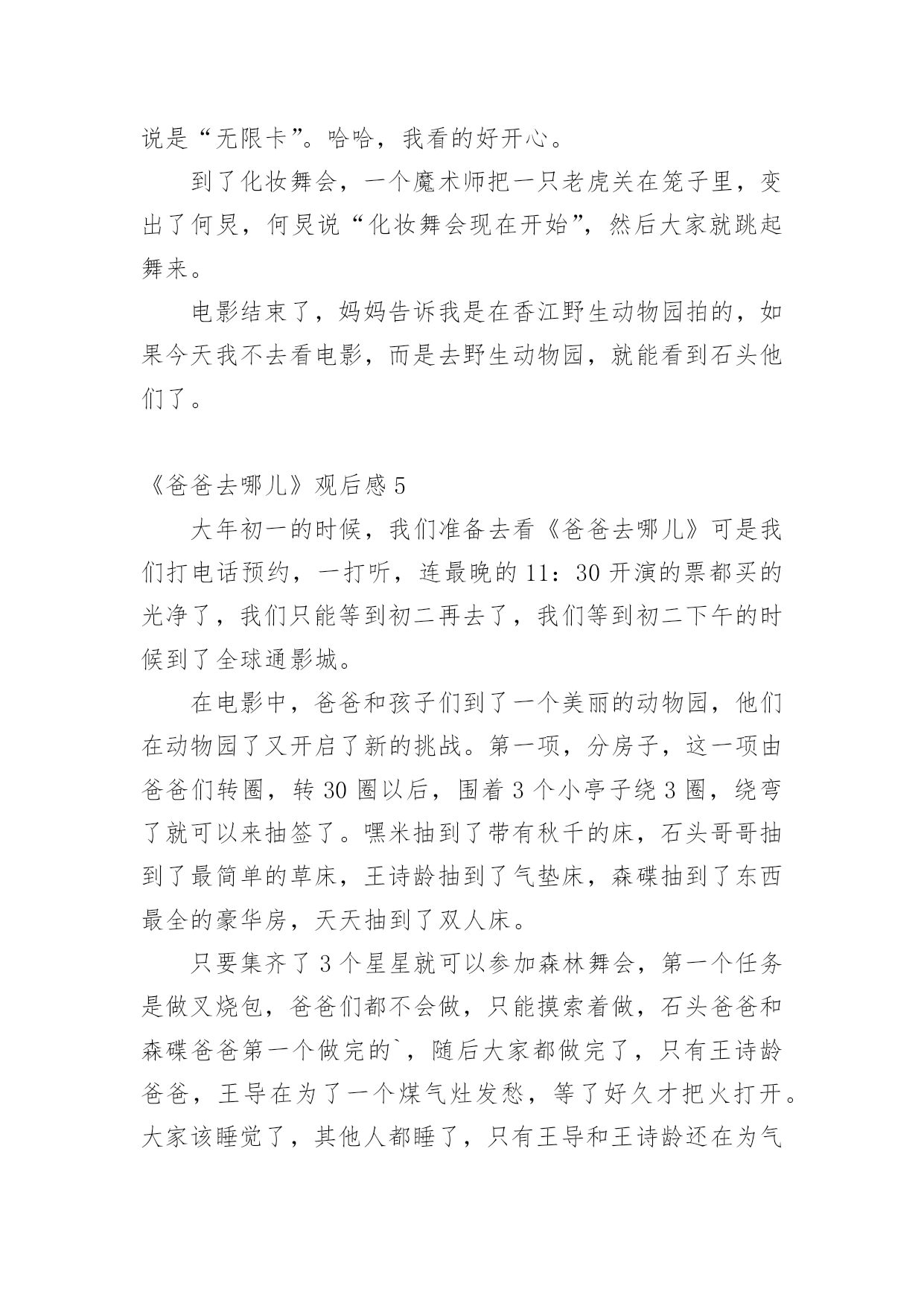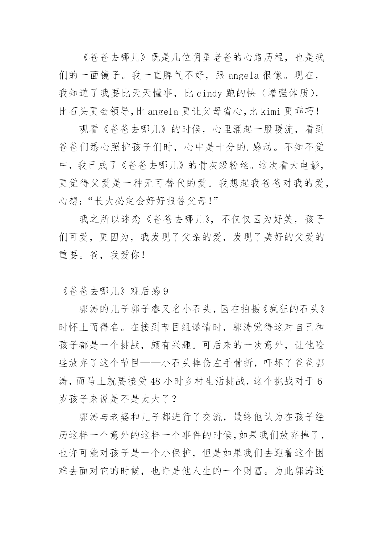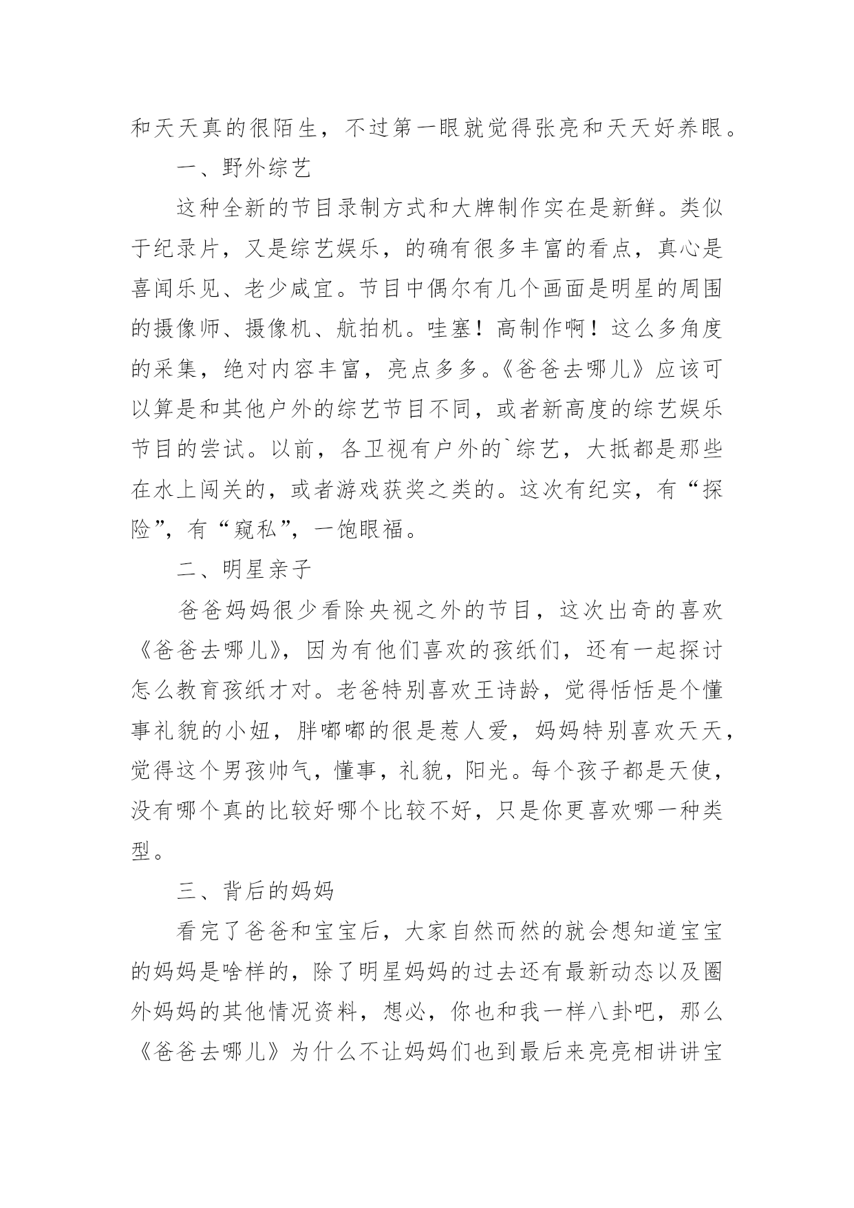 《爸爸去哪儿》观后感当品味完一部作品后,相信大家有很多值得分享的东西吧,何不写一篇观后感记录下呢?那么你真的懂得怎么写观后感吗?以下是小编整理的《爸爸去哪儿》观后感,欢迎阅读,希望大家能够喜欢。《爸爸去哪儿》观后感1在寒假里,我们可以尽情玩耍,也可以去外地旅游,还可以参加一些有意义的活动,可以……而我今天决定去看电影。《爸爸去哪儿》可算是“火”了,每个萌宝都给人留下了深刻的印象,作为小粉丝的'我,怎么能错过他们演的电影呢?于是,我和妈妈、表妹一起向着《爸爸去哪儿大电影》出发!吃过午饭已经十二点了,稍稍休息后,我们就踏上了“看电影之路”。我建议走路去电影院,路程又不远,还可以锻炼身体,一举两得。我的这个建议立刻被妈妈采用了。由于是中午,大街上很冷清,就只有七八个人。很快,我们就到了“大地电影院”。电影院里的人也很少,除了我们以外,还有两个人,居然也是看《爸爸去哪儿大电影》的!我们是十二点半到达电影院的,恰巧,有一场电影是十二点四十分放映的,我们就看这场喽。电影开始了!五个宝贝陆续登场,开始了他们与爸爸的“丛林冒险”——给小老虎喂奶、给河马刷牙、给大象清理粪便、从蟒蛇窝里取食材、在“百鸟园”里与鹦鹉亲密接触、给小熊猫布置家……按照惯例,开始还是先选择房子,每个房子都有特点;饮食问题当然还是老爸们解决喽,每个爸爸做的“叉烧包”口味不同、形状不同、风格不同;宝贝们也十分听话,团结友爱、互帮互助……影片最后的“森林化装舞会”也别有一番风味,在“舞会”中,五个家庭合唱的《爸爸去哪儿》这首歌,让人潸然泪下。影片结束后,我流连忘返,回味无穷,舍不得这场电影……《爸爸去哪儿》观后感2今天,我看了《爸爸去哪儿》第二季的第一集。我最喜欢的是黄多多,她有责任感,在弟弟妹妹走丢时,会冷静分析。还能整理衣物,有条理。在爸爸手指甲伤到的时候,会去关心爸爸,是个有爱的人,得到帮助时,还会有礼貌的道谢。还有,她也很可爱。她的爸爸是黄磊,他会做饭做菜,不像我爸爸,饭也不会煮,菜也不会烧。在伤到指甲的时候,还是继续切菜,只说:“没事,没事。”还有第二个女生:Grece。她是可以和第一季表情帝王诗龄抗衡的'第二季表情帝哦!她卖萌的时候真是很萌很萌的哦!不过她太爱干净了,错过了泥地足球,好可惜哦!她还有个哥哥:Joe。他好像没什么特点……他们的爸爸:曹格。他去蜂房时,是“我头上有垃圾桶,我身上有围巾,我什么都不怕……”他还自带了一个篮子去装午饭,其他的爸爸都以为他没带。第三个女生是陆贝儿,她选购食物时非常认真,还购到了玩具。她的爸爸是陆毅,他进蜂房时差点被憋死,还阴险得把大米移了位置。接下来是杨阳洋,他住的二号有很多玉米,真是饱了口福,但不知道他们能不能吃。爸爸是杨威,是世界冠军。好羡慕好羡慕哦!!!不过他进蜂房时也差点被憋死,还拆过一次呢!最后是Faynman,他会流利的说英语,就像外国人一样,我也要学好英语。他的爸爸是吴镇宇,他专门跟Faynman说英语,也很厉害。看了爸爸去哪儿第二季,我从他们身上总结了自己的错误,我要改正。《爸爸去哪儿》观后感3《爸爸去哪儿》从还没开播就火了起来,明星们在微博里人气造势,到可爱宝贝们的小片花吸引了许多观众,也包括我。可爱的宝贝,最初比较熟悉的就是林志颖父子其次是田亮父女和王岳伦父女,接着是郭老师两个爷们,对于张亮和天天真的很陌生,不过第一眼就觉得张亮和天天好养眼。一、野外综艺这种全新的节目录制方式和大牌制作实在是新鲜。类似于纪录片,又是综艺娱乐,的确有很多丰富的看点,真心是喜闻乐见、老少咸宜。节目中偶尔有几个画面是明星的周围的摄像师、摄像机、航拍机。哇塞!高制作啊!这么多角度的采集,绝对内容丰富,亮点多多。《爸爸去哪儿》应该可以算是和其他户外的综艺节目不同,或者新高度的综艺娱乐节目的尝试。以前,各卫视有户外的`综艺,大抵都是那些在水上闯关的,或者游戏获奖之类的。这次有纪实,有“探险”,有“窥私”,一饱眼福。二、明星亲子爸爸妈妈很少看除央视之外的节目,这次出奇的喜欢《爸爸去哪儿》,因为有他们喜欢的孩纸们,还有一起探讨怎么教育孩纸才对。老爸特别喜欢王诗龄,觉得恬恬是个懂事礼貌的小妞,胖嘟嘟的很是惹人爱,妈妈特别喜欢天天,觉得这个男孩帅气,懂事,礼貌,阳光。每个孩子都是天使,没有哪个真的比较好哪个比较不好,只是你更喜欢哪一种类型。三、背后的妈妈看完了爸爸和宝宝后,大家自然而然的就会想知道宝宝的妈妈是啥样的,除了明星妈妈的过去还有最新动态以及圈外妈妈的其他情况资料,想必,你也和我一样八卦吧,那么《爸爸去哪儿》为什么不让妈妈们也到最后来亮亮相讲讲宝贝们和宝贝爸爸们的故事和变化。啊,好期待啊。好啦!《爸爸去哪儿》赶紧更新吧!我是忠实粉丝哦!《爸爸去哪儿》观后感4妈妈给我看了《爸爸去哪儿》最后一期,去雪乡,我看的很感动,但是没哭出来。后来