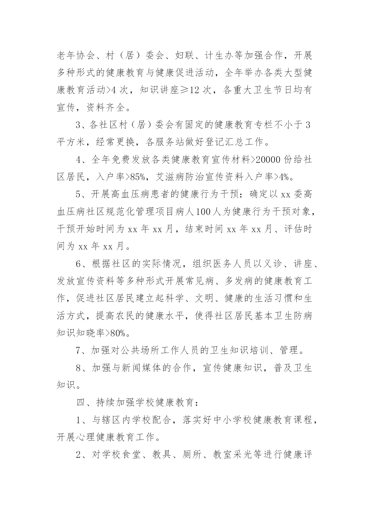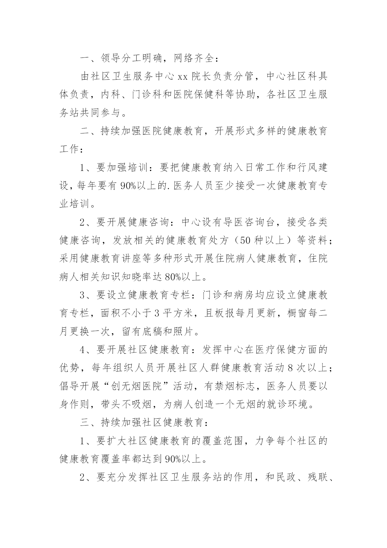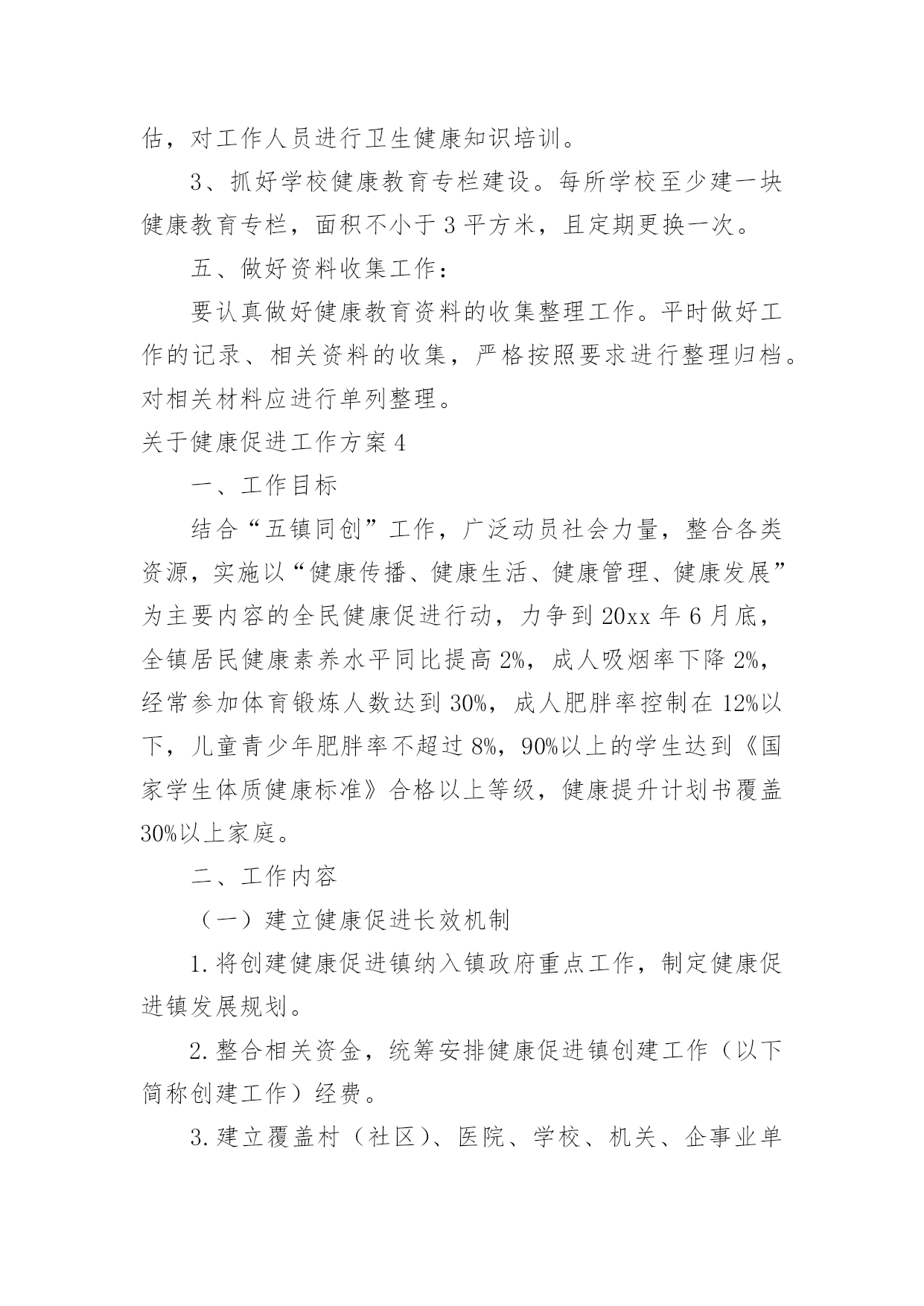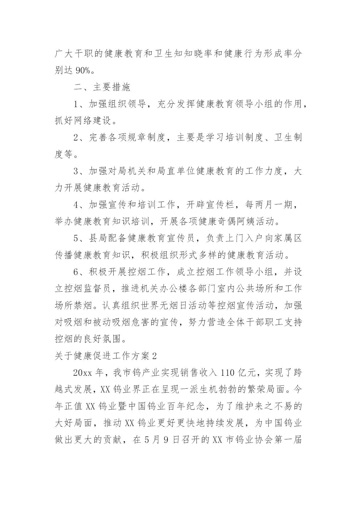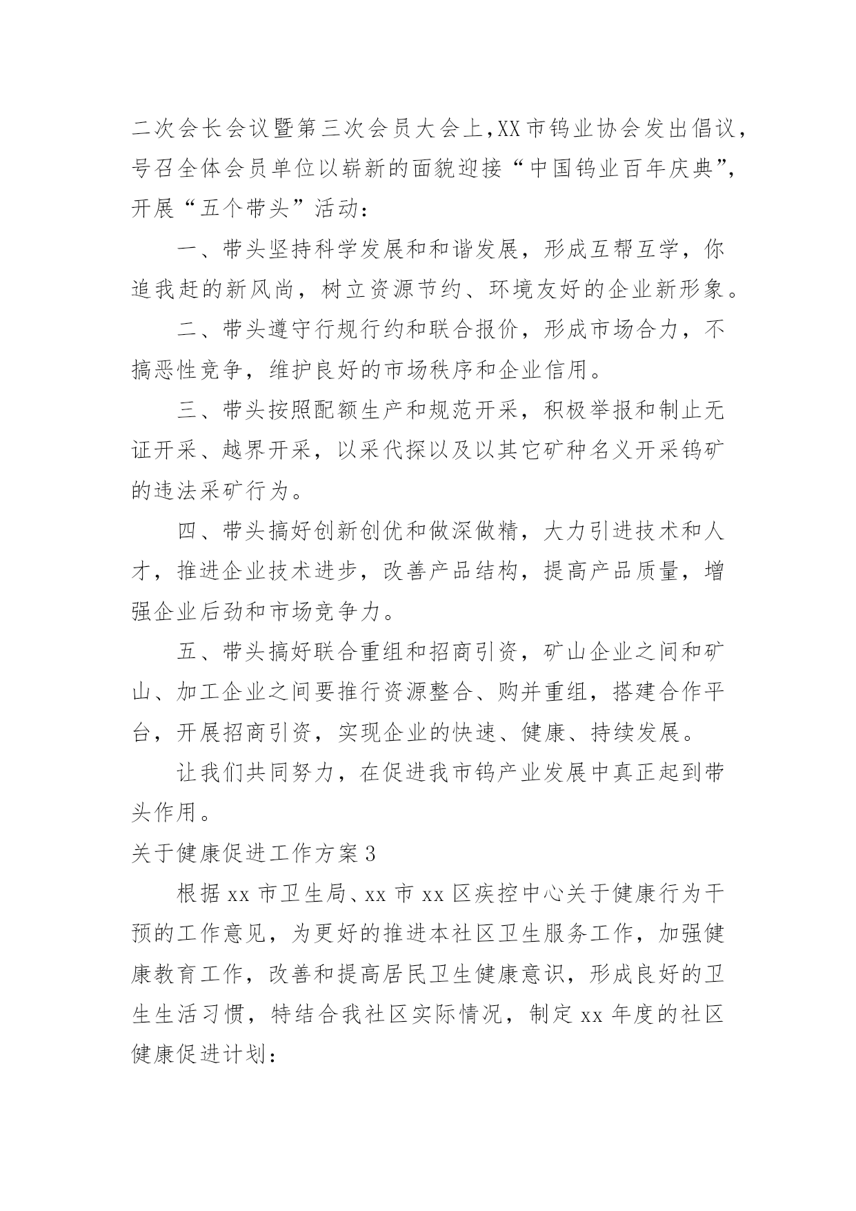 健康促进工作方案关于健康促进工作方案为有力保证事情或工作开展的水平质量,常常需要预先准备方案,方案是书面计划,具有内容条理清楚、步骤清晰的特点。那么方案应该怎么制定才合适呢?以下是小编为大家收集的关于健康促进工作方案,欢迎阅读,希望大家能够喜欢。关于健康促进工作方案120xx年,我局健康教育工作紧紧围绕我县城区健康教育“三提高一降低”,既提高健康知识普及率、健康知识知晓率和健康行为形成率,降低疾病发生率为目标,采取多种形式开展健康教育工作。促进我县经济和社会的全面发展的重要环节,根据创建国家卫生县城标准,特制定我局健康教育工作计划:一、工作任务目标健康教育是卫生的重要组成部分,是公司素质教育的重要内容,要建立健全健康教育工作机制,进一步普及卫生知识和环境保护知识,使广大职工形成科学文明健康的生活方式,进一步提高职工的健康知识水平,创建一个良好的生产、学习、生活环境,开展形式多样的健康教育活动。工作目标:加强机关干职健康教育培训和宣传工作,使广大干职的健康教育和卫生知知晓率和健康行为形成率分别达90%。二、主要措施1、加强组织领导,充分发挥健康教育领导小组的作用,抓好网络建设。2、完善各项规章制度,主要是学习培训制度、卫生制度等。3、加强对局机关和局直单位健康教育的工作力度,大力开展健康教育活动。4、加强宣传和培训工作,开辟宣传栏,每两月一期,举办健康教育知识培训,开展各项健康奇偶阿姨活动。5、县局配备健康教育宣传员,负责上门入户向家属区传播健康教育知识,积极组织形式多样的健康教育活动。6、积极开展控烟工作,成立控烟工作领导小组,并设立控烟监督员,推进机关办公楼各部门室内公共场所和工作场所禁烟。认真组织世界无烟日活动等控烟宣传活动,加强对吸烟和被动吸烟危害的宣传,努力营造全体干部职工支持控烟的良好氛围。关于健康促进工作方案220xx年,我市钨产业实现销售收入110亿元,实现了跨越式发展,XX钨业界正在呈现一派生机勃勃的繁荣局面。今年正值XX钨业暨中国钨业百年纪念,为了维护来之不易的大好局面,推动XX钨业更好更快地持续发展,为中国钨业做出更大的贡献,在5月9日召开的XX市钨业协会第一届二次会长会议暨第三次会员大会上,XX市钨业协会发出倡议,号召全体会员单位以崭新的面貌迎接“中国钨业百年庆典”,开展“五个带头”活动:一、带头坚持科学发展和和谐发展,形成互帮互学,你追我赶的新风尚,树立资源节约、环境友好的企业新形象。二、带头遵守行规行约和联合报价,形成市场合力,不搞恶性竞争,维护良好的市场秩序和企业信用。三、带头按照配额生产和规范开采,积极举报和制止无证开采、越界开采,以采代探以及以其它矿种名义开采钨矿的违法采矿行为。四、带头搞好创新创优和做深做精,大力引进技术和人才,推进企业技术进步,改善产品结构,提高产品质量,增强企业后劲和市场竞争力。五、带头搞好联合重组和招商引资,矿山企业之间和矿山、加工企业之间要推行资源整合、购并重组,搭建合作平台,开展招商引资,实现企业的快速、健康、持续发展。让我们共同努力,在促进我市钨产业发展中真正起到带头作用。关于健康促进工作方案3根据xx市卫生局、xx市xx区疾控中心关于健康行为干预的工作意见,为更好的推进本社区卫生服务工作,加强健康教育工作,改善和提高居民卫生健康意识,形成良好的卫生生活习惯,特结合我社区实际情况,制定xx年度的社区健康促进计划:一、领导分工明确,网络齐全:由社区卫生服务中心xx院长负责分管,中心社区科具体负责,内科、门诊科和医院保健科等协助,各社区卫生服务站共同参与。二、持续加强医院健康教育,开展形式多样的健康教育工作:1、要加强培训:要把健康教育纳入日常工作和行风建设,每年要有90%以上的.医务人员至少接受一次健康教育专业培训。2、要开展健康咨询:中心设有导医咨询台,接受各类健康咨询,发放相关的健康教育处方(50种以上)等资料;采用健康教育讲座等多种形式开展住院病人健康教育,住院病人相关知识知晓率达80%以上。3、要设立健康教育专栏:门诊和病房均应设立健康教育专栏,面积不小于3平方米,且板报每月更新,橱窗每二月更换一次,留有底稿和照片。4、要开展社区健康教育:发挥中心在医疗保健方面的优势,每年组织人员开展社区人群健康教育活动8次以上;倡导开展“创无烟医院”活动,有禁烟标志,医务人员要以身作则,带头不吸烟,为病人创造一个无烟的就诊环境。三、持续加强社区健康教育:1、要扩大社区健康教育的覆盖范围,力争每个社区的健康教育覆盖率都达到90%以上。2、要充分发挥社区卫生服务站的作用,和民政、残联、老年协会、村(居)委会、妇联、计生办等加强合作,开展多种形式的健康教育与健康促进活动,全年举办各类大型健康教育活动>4次,知识讲座≥12次,各重大卫生节日均有宣传,资料齐全。3、各社区村(居)