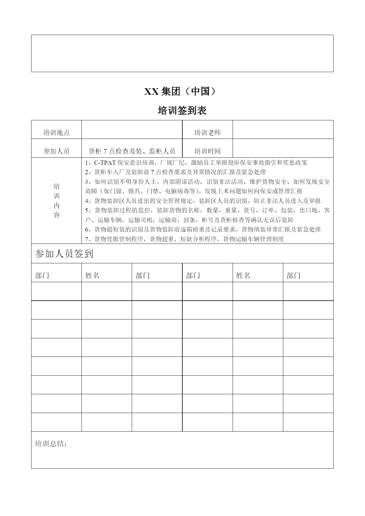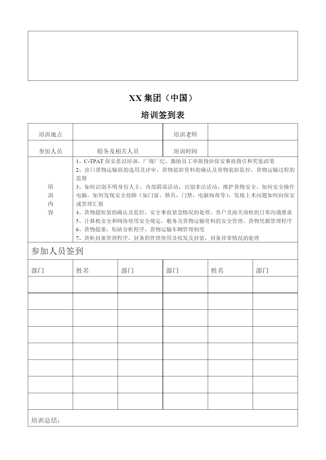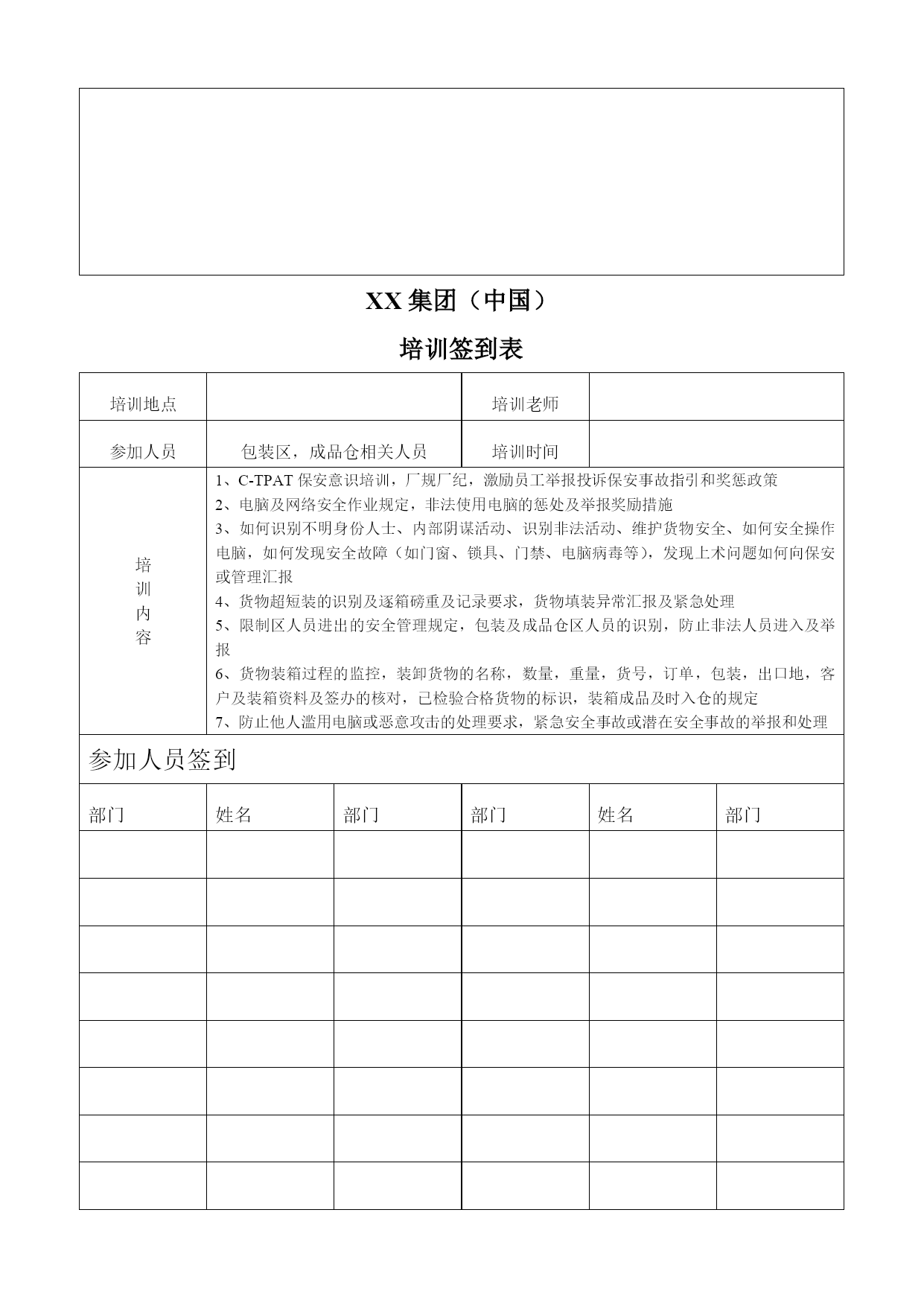 培训签到表2优质资料(可以直接使用,可编辑优质资料,欢迎下载)培训签到表培训地点培训人员参加人员培训时间培训内容参加人员签到部门姓名部门姓名部门姓名精品文档,超值下载培训总结:XX集团(中国)培训签到表培训地点培训老师参加人员人事文员培训时间培训内容1、怎样识别员工身份证件2、背景调查的方法和技巧3、招聘和离职程序4、反恐意识5、厂证和访客的制件方法参加人员签到部门姓名部门部门姓名部门培训总结:XX集团(中国)培训签到表培训地点培训老师参加人员货柜7点检查及装、监柜人员培训时间培训内容1、C-TPAT保安意识培训,厂规厂纪,激励员工举报投诉保安事故指引和奖惩政策2、货柜车入厂及装卸前7点检查要求及异常情况的汇报及紧急处理3、如何识别不明身份人士、内部阴谋活动、识别非法活动、维护货物安全、如何发现安全故障(如门窗、锁具、门禁、电脑病毒等),发现上术问题如何向保安或管理汇报4、货物装卸区人员进出的安全管理规定,装卸区人员的识别,防止非法人员进入及举报5、货物装卸过程的监控,装卸货物的名称,数量,重量,货号、订单、包装、出口地、客户、运输车辆,运输司机,运输商,封条,柜号及货柜检查等确认无误后装卸6、货物超短装的识别及货物装卸前逐箱磅重及记录要求,货物填装异常汇报及紧急处理7、货物凭据管制程序,货物超重,短缺分析程序,货物运输车辆管理制度参加人员签到部门姓名部门部门姓名部门培训总结:XX集团(中国)培训签到表培训地点培训老师参加人员运输商司机培训时间培训内容1、C-TPAT保安意识培训,本厂C-TPAT手册及运输安全程序,激励举报投诉保安事故指引和奖惩2、工厂外来作业人员的规定,访客管理制度,司机厂区内在休息室活动的要求3、货物运输车辆管理制度,货柜封条管理程序,进出厂管理制度4、运输商商业行为守则及反恐要求,运输司机背景调查要求及本厂培训要求5、货物运输过程承运司机必须按工厂货物安全运输协议要求执行,在运输途中不能未经批准中途停车,吃饭,私自改变运输路线等6、限制区人员进出的安全管理规定,包装及成品仓区人员的识别,防止非法人员进入及举报7、运输过程安全注意事项及紧急安全事故或潜在安全事故的举报和处理参加人员签到部门姓名部门部门姓名部门培训总结:XX集团(中国)培训签到表培训地点培训老师参加人员船务及相关人员培训时间培训内容1、C-TPAT保安意识培训,厂规厂纪,激励员工举报投诉保安事故指引和奖惩政策2、出口货物运输商的选用及评审,货物装卸资料的确认及货物装卸监控,货物运输过程的监督3、如何识别不明身份人士、内部阴谋活动、识别非法活动、维护货物安全、如何安全操作电脑,如何发现安全故障(如门窗、锁具、门禁、电脑病毒等),发现上术问题如何向保安或管理汇报4、货物超短装的确认及监控,安全事故紧急情况的处理,客户及海关商检的日常沟通要求5、计算机安全和网络使用安全规定,般务及货物运输资料的安全管理,货物凭据管理程序6、货物超重,短缺分析程序,货物运输车辆管理制度7、货柜封条管理程序,封条的管理使用及收发及封装,封条异常情况的处理参加人员签到部门姓名部门部门姓名部门培训总结:XX集团(中国)培训签到表培训地点培训老师参加人员电脑操作及相关人员培训时间培训内容1、C-TPAT保安意识培训,厂规厂纪,激励员工举报投诉保安事故指引和奖惩政策2、电脑及网络安全作业规定,非法使用电脑的惩处及举报奖励措施3、如何识别不明身份人士、内部阴谋活动、识别非法活动、维护货物安全、如何安全操作电脑,如何发现安全故障(如门窗、锁具、门禁、电脑病毒等),发现上术问题如何向保安或管理汇报4、电脑定期杀毒,防火墙及系统漏洞扫描的定期更新,电脑操作员登陆及密码规定5、计算机安全管理制度和电脑网络使用安全手册,船务及重要文件资料的定期备份制度6、防止他人滥用电脑或恶意攻击的处理要求,紧急安全事故或潜在安全事故的举报和处理参加人员签到部门姓名部门部门姓名部门培训总结:XX集团(中国)培训签到表培训地点培训老师参加人员包装区,成品仓相关人员培训时间培训内容1、C-TPAT保安意识培训,厂规厂纪,激励员工举报投诉保安事故指引和奖惩政策2、电脑及网络安全作业规定,非法使用电脑的惩处及举报奖励措施3、如何识别不明身份人士、内部阴谋活动、识别非法活动、维护货物安全、如何安全操作电脑,如何发现安全故障(如门窗、锁具、门禁、电脑病毒等),发现上术问题如何向保安或管理汇报4、货物超短装的识别及逐箱磅重及记录要求,货物填装异常汇报及紧急处理5、