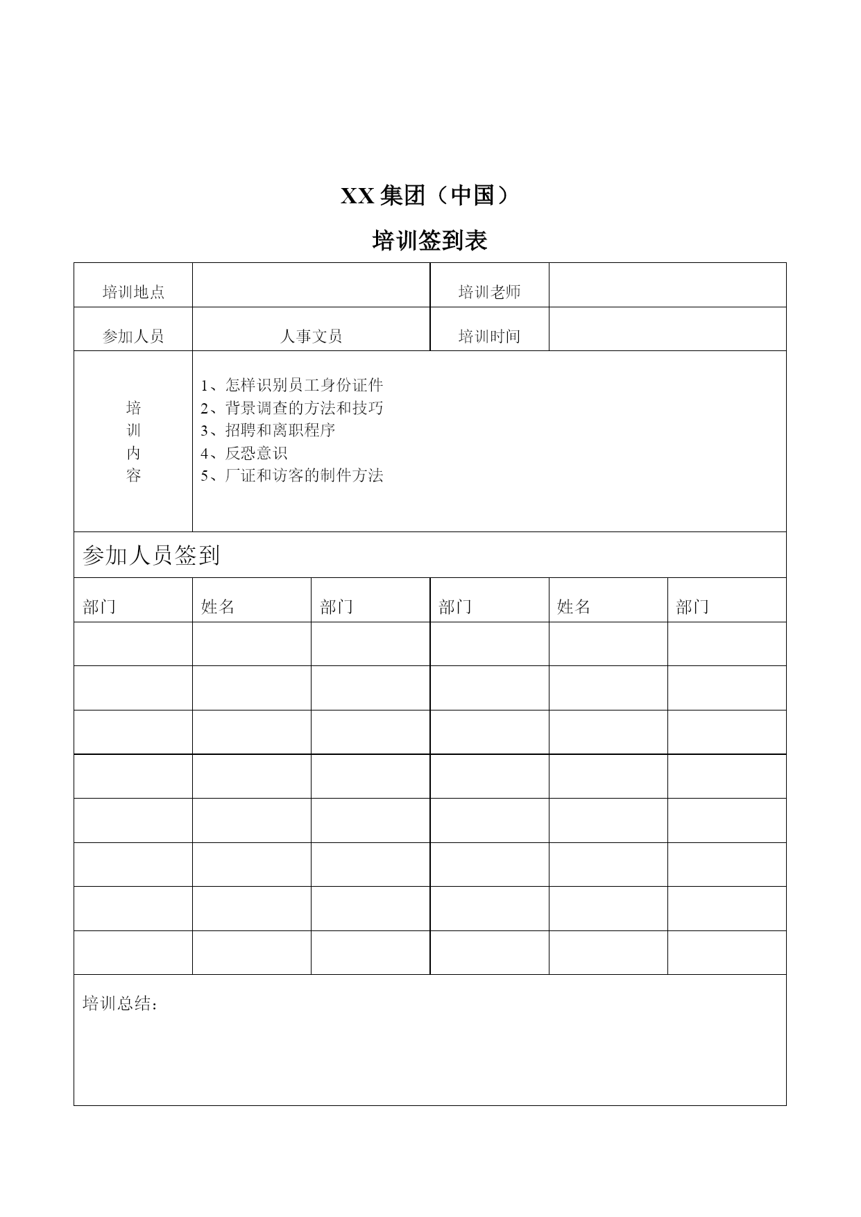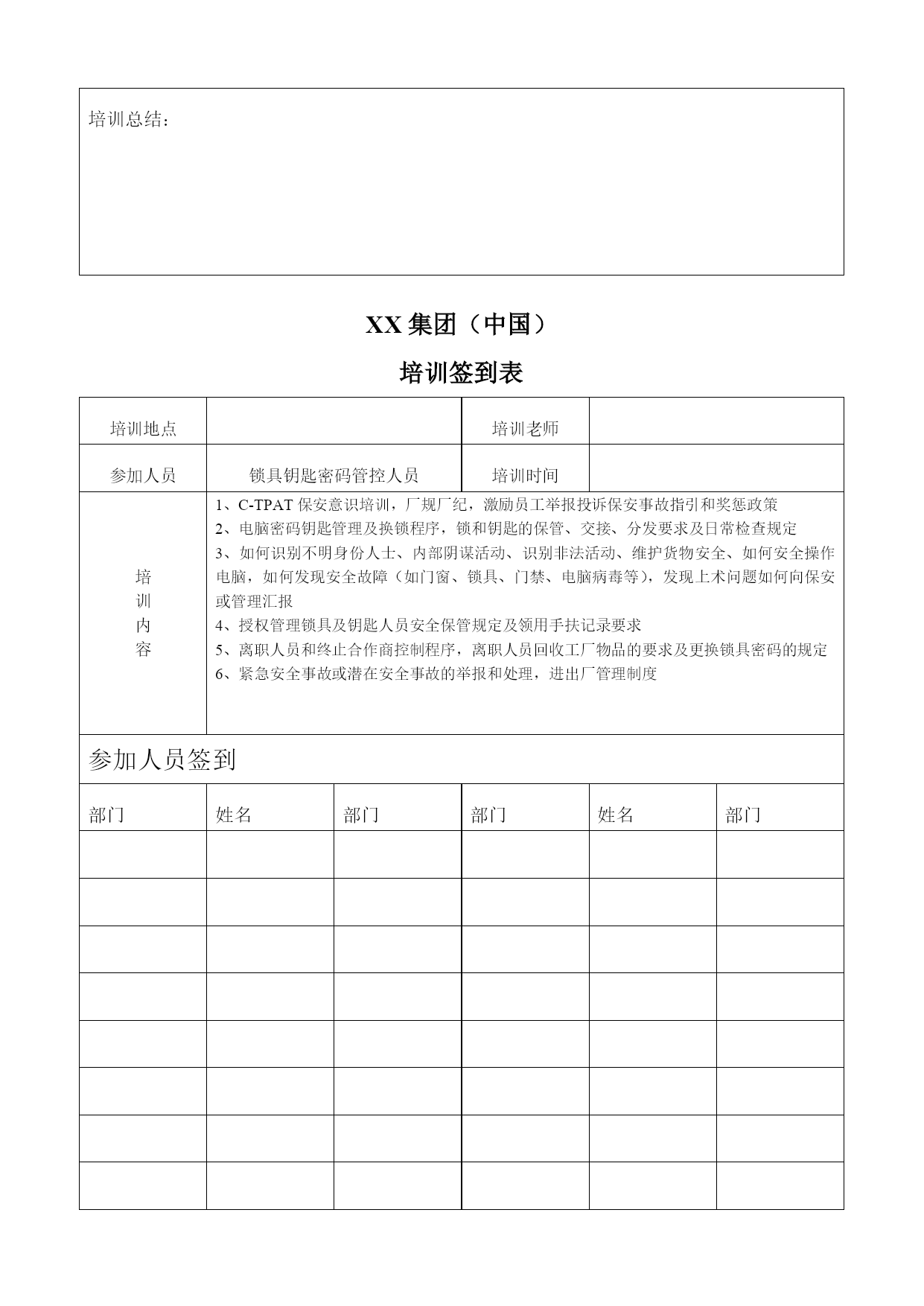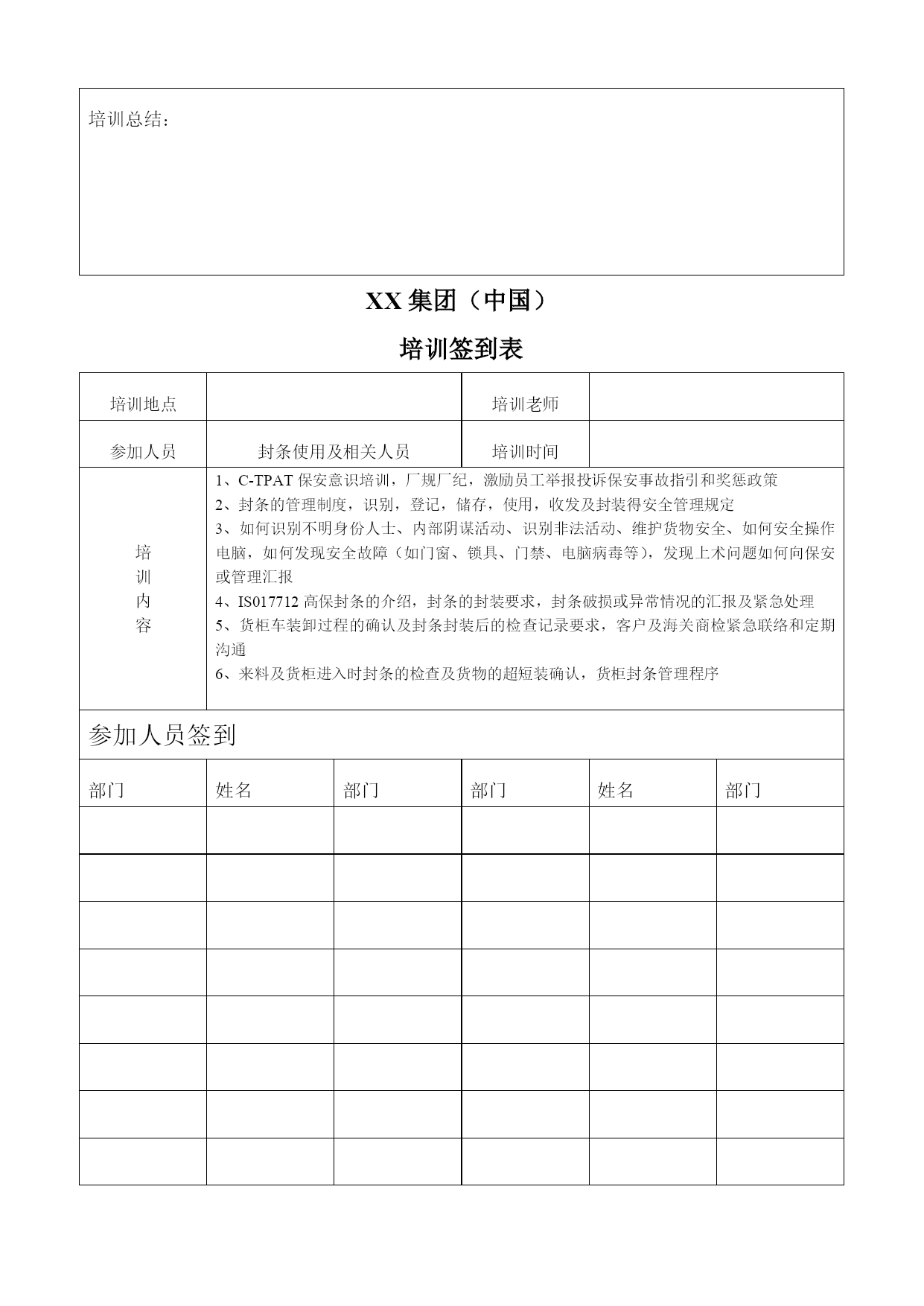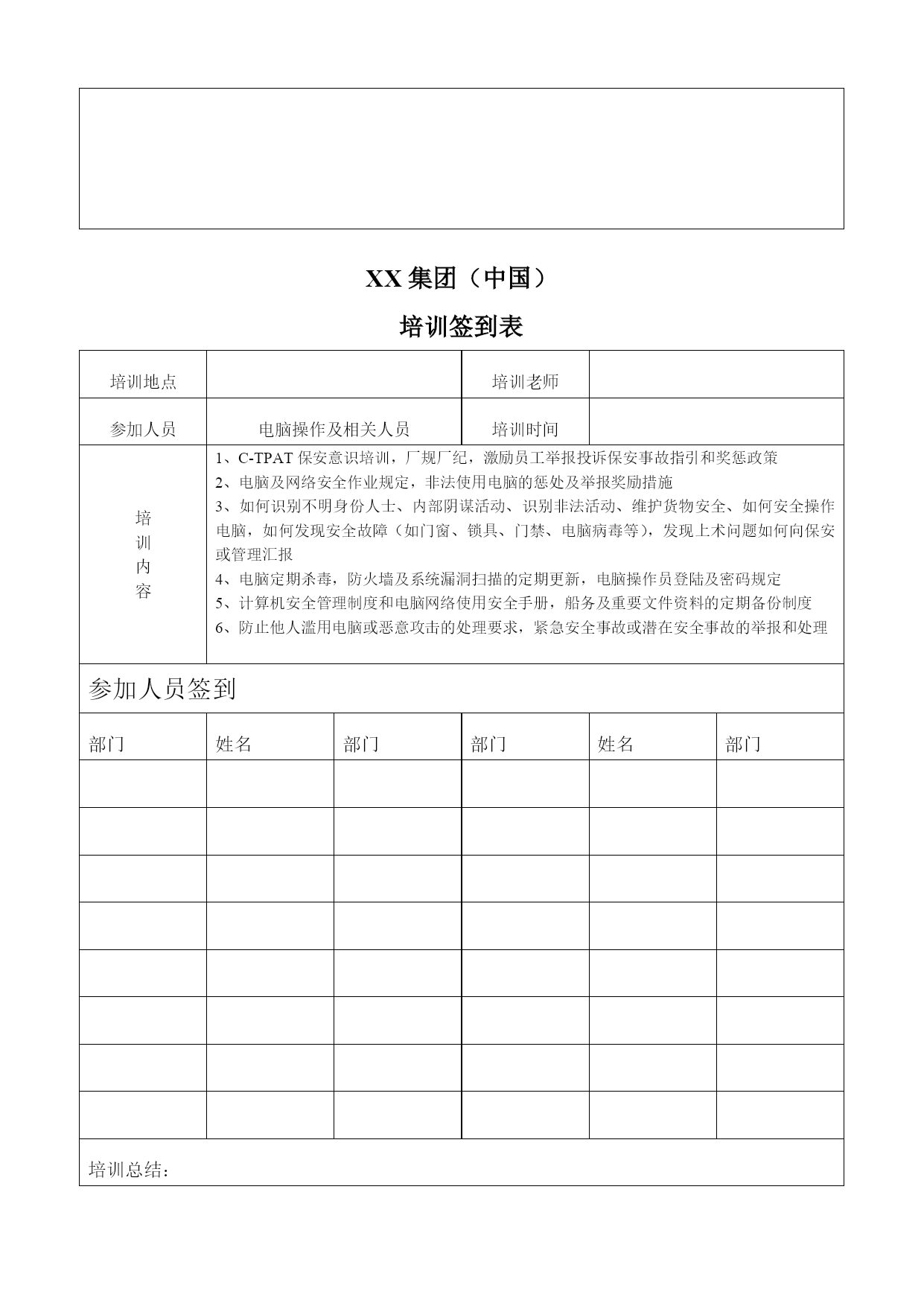 培训签到表2优质资料(可以直接使用,可编辑优质资料,欢迎下载)培训签到表培训地点培训人员参加人员培训时间培训内容参加人员签到部门姓名部门姓名部门姓名精品文档,超值下载培训总结:XX集团(中国)培训签到表培训地点培训老师参加人员人事文员培训时间培训内容1、怎样识别员工身份证件2、背景调查的方法和技巧3、招聘和离职程序4、反恐意识5、厂证和访客的制件方法参加人员签到部门姓名部门部门姓名部门培训总结:XX集团(中国)培训签到表培训地点培训老师参加人员货柜7点检查及装、监柜人员培训时间培训内容1、C-TPAT保安意识培训,厂规厂纪,激励员工举报投诉保安事故指引和奖惩政策2、货柜车入厂及装卸前7点检查要求及异常情况的汇报及紧急处理3、如何识别不明身份人士、内部阴谋活动、识别非法活动、维护货物安全、如何发现安全故障(如门窗、锁具、门禁、电脑病毒等),发现上术问题如何向保安或管理汇报4、货物装卸区人员进出的安全管理规定,装卸区人员的识别,防止非法人员进入及举报5、货物装卸过程的监控,装卸货物的名称,数量,重量,货号、订单、包装、出口地、客户、运输车辆,运输司机,运输商,封条,柜号及货柜检查等确认无误后装卸6、货物超短装的识别及货物装卸前逐箱磅重及记录要求,货物填装异常汇报及紧急处理7、货物凭据管制程序,货物超重,短缺分析程序,货物运输车辆管理制度参加人员签到部门姓名部门部门姓名部门培训总结:XX集团(中国)培训签到表培训地点培训老师参加人员运输商司机培训时间培训内容1、C-TPAT保安意识培训,本厂C-TPAT手册及运输安全程序,激励举报投诉保安事故指引和奖惩2、工厂外来作业人员的规定,访客管理制度,司机厂区内在休息室活动的要求3、货物运输车辆管理制度,货柜封条管理程序,进出厂管理制度4、运输商商业行为守则及反恐要求,运输司机背景调查要求及本厂培训要求5、货物运输过程承运司机必须按工厂货物安全运输协议要求执行,在运输途中不能未经批准中途停车,吃饭,私自改变运输路线等6、限制区人员进出的安全管理规定,包装及成品仓区人员的识别,防止非法人员进入及举报7、运输过程安全注意事项及紧急安全事故或潜在安全事故的举报和处理参加人员签到部门姓名部门部门姓名部门培训总结:XX集团(中国)培训签到表培训地点培训老师参加人员船务及相关人员培训时间培训内容1、C-TPAT保安意识培训,厂规厂纪,激励员工举报投诉保安事故指引和奖惩政策2、出口货物运输商的选用及评审,货物装卸资料的确认及货物装卸监控,货物运输过程的监督3、如何识别不明身份人士、内部阴谋活动、识别非法活动、维护货物安全、如何安全操作电脑,如何发现安全故障(如门窗、锁具、门禁、电脑病毒等),发现上术问题如何向保安或管理汇报4、货物超短装的确认及监控,安全事故紧急情况的处理,客户及海关商检的日常沟通要求5、计算机安全和网络使用安全规定,般务及货物运输资料的安全管理,货物凭据管理程序6、货物超重,短缺分析程序,货物运输车辆管理制度7、货柜封条管理程序,封条的管理使用及收发及封装,封条异常情况的处理参加人员签到部门姓名部门部门姓名部门培训总结:XX集团(中国)培训签到表培训地点培训老师参加人员电脑操作及相关人员培训时间培训内容1、C-TPAT保安意识培训,厂规厂纪,激励员工举报投诉保安事故指引和奖惩政策2、电脑及网络安全作业规定,非法使用电脑的惩处及举报奖励措施3、如何识别不明身份人士、内部阴谋活动、识别非法活动、维护货物安全、如何安全操作电脑,如何发现安全故障(如门窗、锁具、门禁、电脑病毒等),发现上术问题如何向保安或管理汇报4、电脑定期杀毒,防火墙及系统漏洞扫描的定期更新,电脑操作员登陆及密码规定5、计算机安全管理制度和电脑网络使用安全手册,船务及重要文件资料的定期备份制度6、防止他人滥用电脑或恶意攻击的处理要求,紧急安全事故或潜在安全事故的举报和处理参加人员签到部门姓名部门部门姓名部门培训总结:XX集团(中国)培训签到表培训地点培训老师参加人员包装区,成品仓相关人员培训时间培训内容1、C-TPAT保安意识培训,厂规厂纪,激励员工举报投诉保安事故指引和奖惩政策2、电脑及网络安全作业规定,非法使用电脑的惩处及举报奖励措施3、如何识别不明身份人士、内部阴谋活动、识别非法活动、维护货物安全、如何安全操作电脑,如何发现安全故障(如门窗、锁具、门禁、电脑病毒等),发现上术问题如何向保安或管理汇报4、货物超短装的识别及逐箱磅重及记录要求,货物填装异常汇报及紧急处理5、