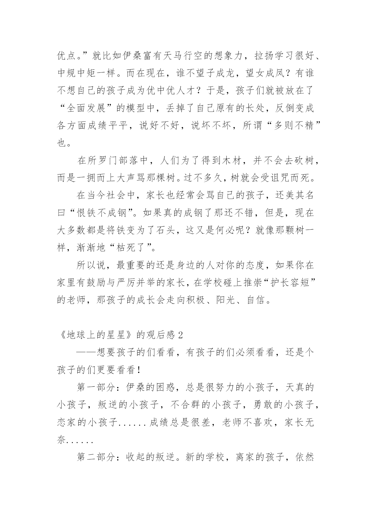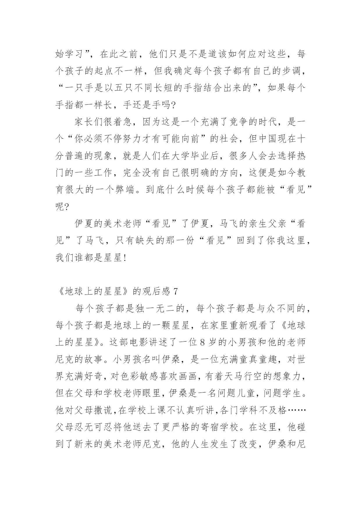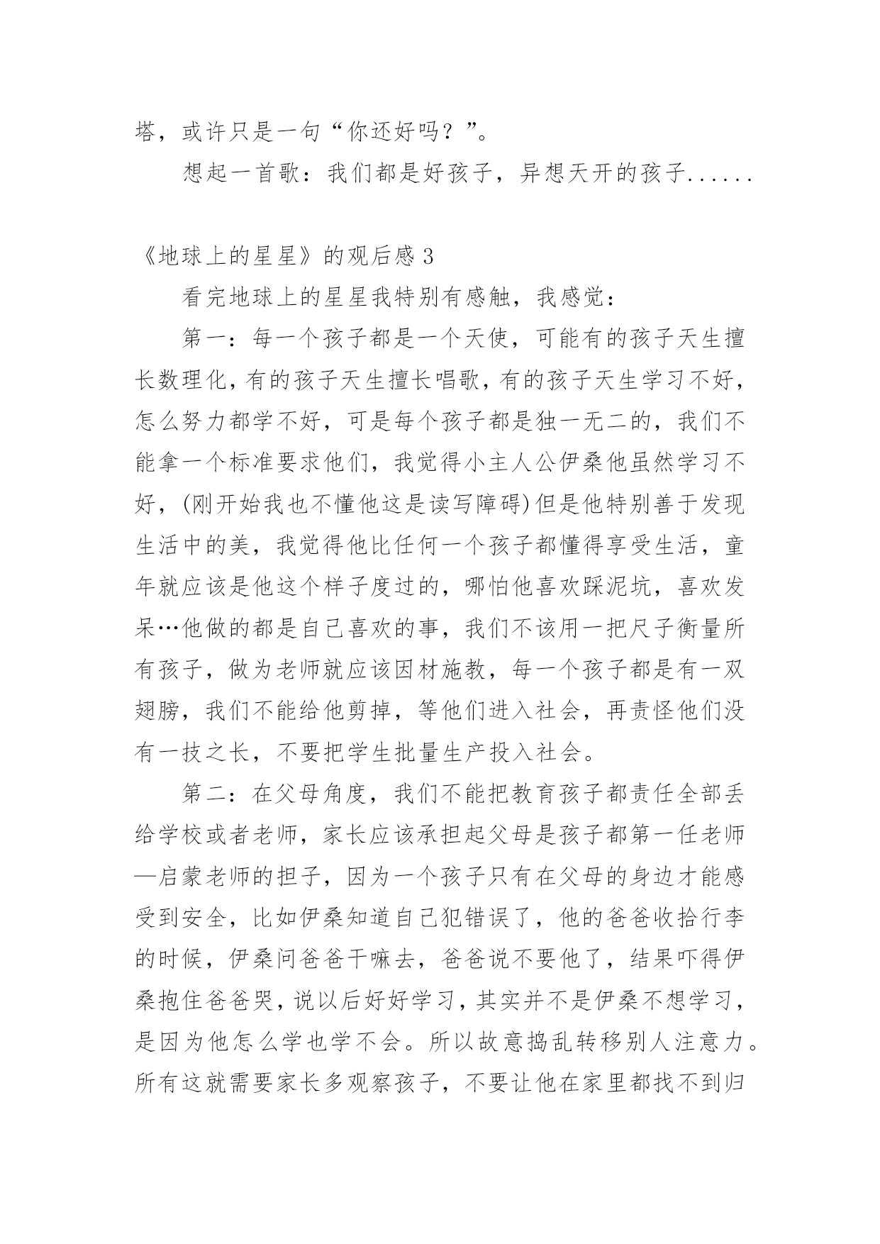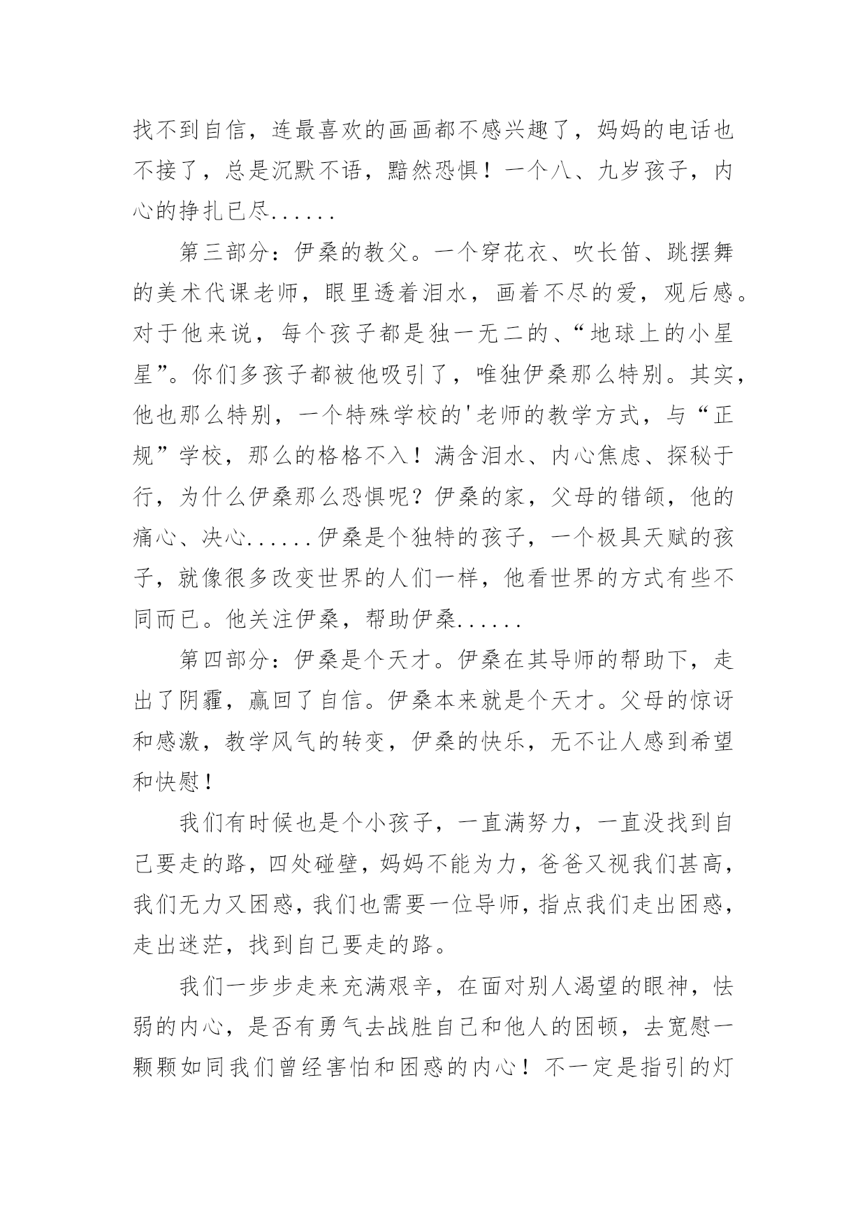 《地球上的星星》的观后感品味完一部作品后,想必你有不少可以分享的东西,需要回过头来写一写观后感了。想必许多人都在为如何写好观后感而烦恼吧,下面是小编为大家整理的《地球上的星星》的观后感,欢迎大家分享。《地球上的星星》的观后感1今天是星期六,我倒是有一些休息时间,于是,我便在电脑上观看了印度电影——《地球上的星星》。看完,我感悟颇深。《地球上的星星》讲述的是一个印度小男孩伊桑的故事。在三年级时,他因为不及格而留级。然而,不管他怎样努力,成绩都没有好转,令父母大伤脑筋。在一次与小伙伴的玩耍中,他一不小心将球扔出了墙外,不知情的父母便给他扣上了“调皮”的`帽子,并且把他转到了一所寄宿制的学校。可是,情况非但没有好转,反而更糟糕了。他的成绩如此的差,老师们对他没有好脸色,还经常体罚他,他也慢慢由原来的开朗变得自卑,上课时经常发呆、走神。所幸的是,新来的美术老师尼克姆在课堂上发现了这个孩子的问题,开始关心他、开导他、辅导他……渐渐地,伊桑开始从自卑中走出来,还在由尼克姆举办的比赛中夺得了第一名。伊桑也从老师们心中的差生变成了优等生。就如尼克姆老师所说的一句话:“每个孩子都有他们的优点。”就比如伊桑富有天马行空的想象力,拉扬学习很好、中规中矩一样。而在现在,谁不望子成龙,望女成凤?有谁不想自己的孩子成为优中优人才?于是,孩子们就被放在了“全面发展”的模型中,丢掉了自己原有的长处,反倒变成各方面成绩平平,说好不好,说坏不坏,所谓“多则不精”也。在所罗门部落中,人们为了得到木材,并不会去砍树,而是一拥而上大声骂那棵树。过不多久,树就会受诅咒而死。在当今社会中,家长也经常会骂自己的孩子,还美其名曰“恨铁不成钢”。如果真的成钢了那还不错,但是,现在大多数都是将铁变为了石头,这又是何必呢?就像那颗树一样,渐渐地“枯死了”。所以说,最重要的还是身边的人对你的态度,如果你在家里有鼓励与严厉并举的家长,在学校碰上推崇“护长容短”的老师,那孩子的成长会走向积极、阳光、自信。《地球上的星星》的观后感2——想要孩子的们看看,有孩子的们必须看看,还是个孩子的们更要看看!第一部分:伊桑的困惑,总是很努力的小孩子,天真的小孩子,叛逆的小孩子,不合群的小孩子,勇敢的小孩子,恋家的小孩子......成绩总是很差,老师不喜欢,家长无奈......第二部分:收起的叛逆。新的学校,离家的孩子,依然找不到自信,连最喜欢的画画都不感兴趣了,妈妈的电话也不接了,总是沉默不语,黯然恐惧!一个八、九岁孩子,内心的挣扎已尽......第三部分:伊桑的教父。一个穿花衣、吹长笛、跳摆舞的美术代课老师,眼里透着泪水,画着不尽的爱,观后感。对于他来说,每个孩子都是独一无二的、“地球上的小星星”。你们多孩子都被他吸引了,唯独伊桑那么特别。其实,他也那么特别,一个特殊学校的'老师的教学方式,与“正规”学校,那么的格格不入!满含泪水、内心焦虑、探秘于行,为什么伊桑那么恐惧呢?伊桑的家,父母的错颌,他的痛心、决心......伊桑是个独特的孩子,一个极具天赋的孩子,就像很多改变世界的人们一样,他看世界的方式有些不同而已。他关注伊桑,帮助伊桑......第四部分:伊桑是个天才。伊桑在其导师的帮助下,走出了阴霾,赢回了自信。伊桑本来就是个天才。父母的惊讶和感激,教学风气的转变,伊桑的快乐,无不让人感到希望和快慰!我们有时候也是个小孩子,一直满努力,一直没找到自己要走的路,四处碰壁,妈妈不能为力,爸爸又视我们甚高,我们无力又困惑,我们也需要一位导师,指点我们走出困惑,走出迷茫,找到自己要走的路。我们一步步走来充满艰辛,在面对别人渴望的眼神,怯弱的内心,是否有勇气去战胜自己和他人的困顿,去宽慰一颗颗如同我们曾经害怕和困惑的内心!不一定是指引的灯塔,或许只是一句“你还好吗?”。想起一首歌:我们都是好孩子,异想天开的孩子......《地球上的星星》的观后感3看完地球上的星星我特别有感触,我感觉:第一:每一个孩子都是一个天使,可能有的孩子天生擅长数理化,有的孩子天生擅长唱歌,有的孩子天生学习不好,怎么努力都学不好,可是每个孩子都是独一无二的,我们不能拿一个标准要求他们,我觉得小主人公伊桑他虽然学习不好,(刚开始我也不懂他这是读写障碍)但是他特别善于发现生活中的美,我觉得他比任何一个孩子都懂得享受生活,童年就应该是他这个样子度过的,哪怕他喜欢踩泥坑,喜欢发呆…他做的都是自己喜欢的事,我们不该用一把尺子衡量所有孩子,做为老师就应该因材施教,每一个孩子都是有一双翅膀,我们不能给他剪掉,等他们进入社会,再责怪他们没有一技之长,不要把学生批量生产投入社会。第二:在父母角度,我们不能把教育孩子都责任全部丢给学校或者老师,家长应该承担起父母是孩子都第一任老师—启蒙老师的担子,因为一个孩子只有在父母的身边才能感受到安全,比如伊桑知