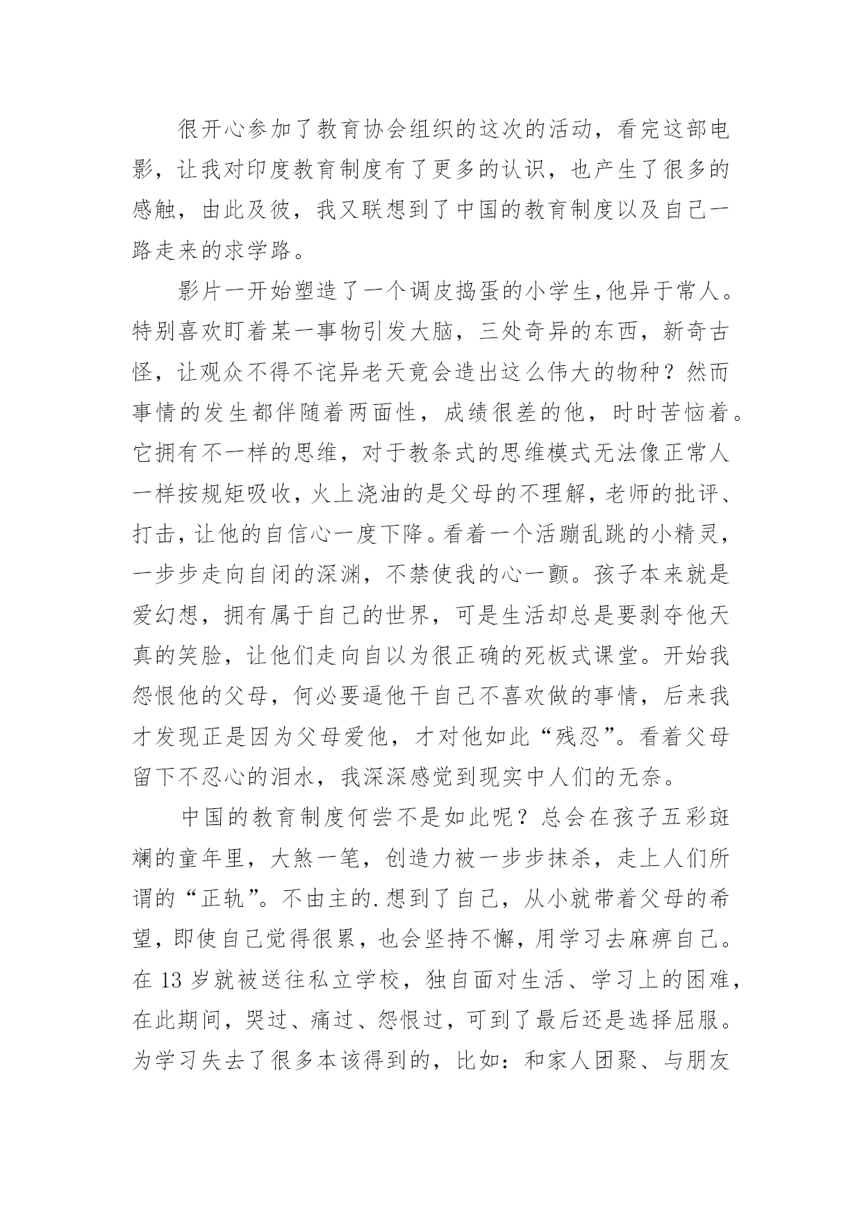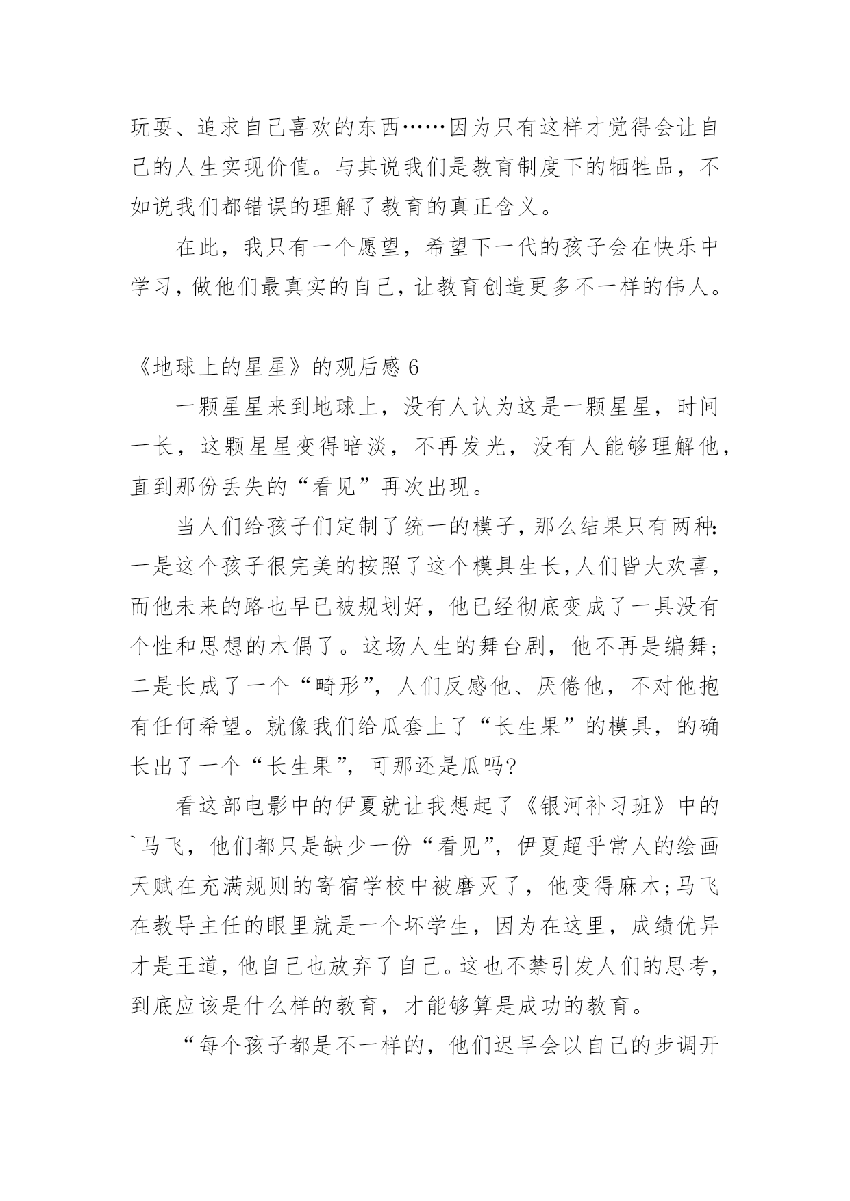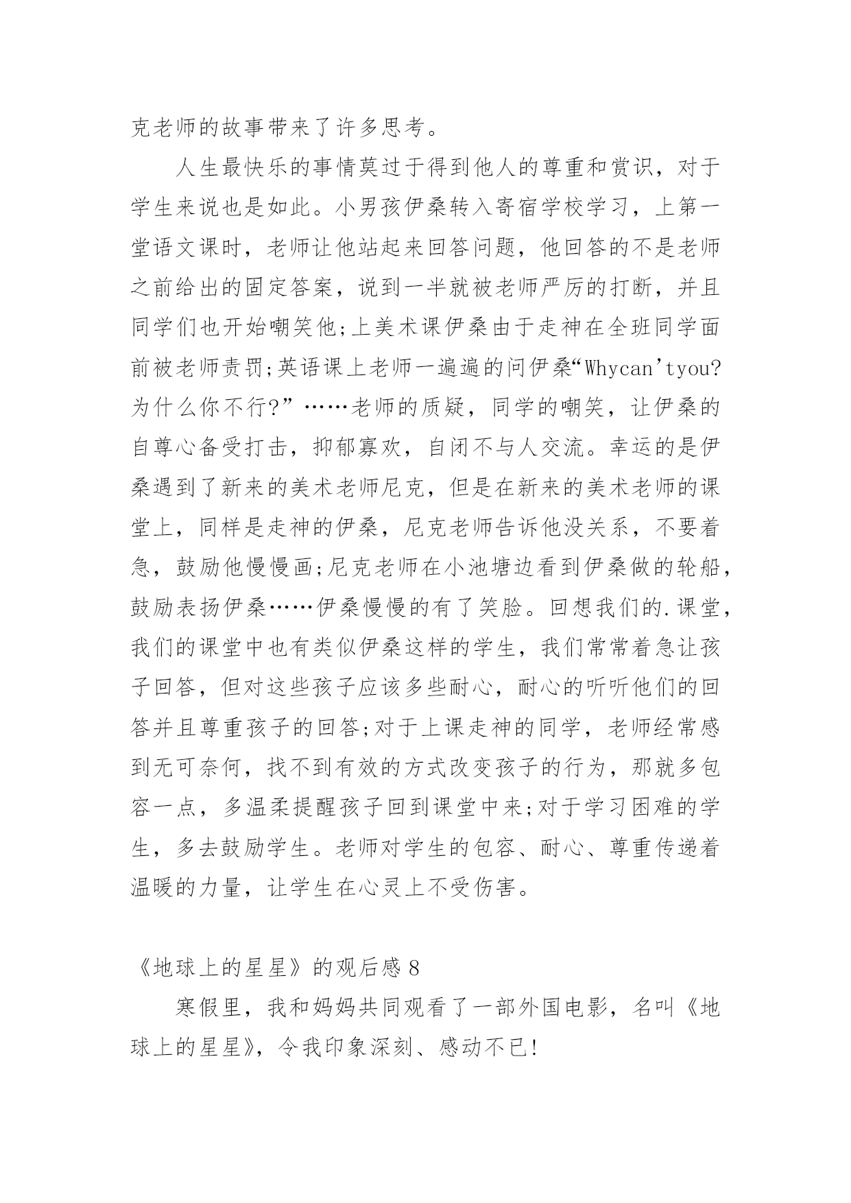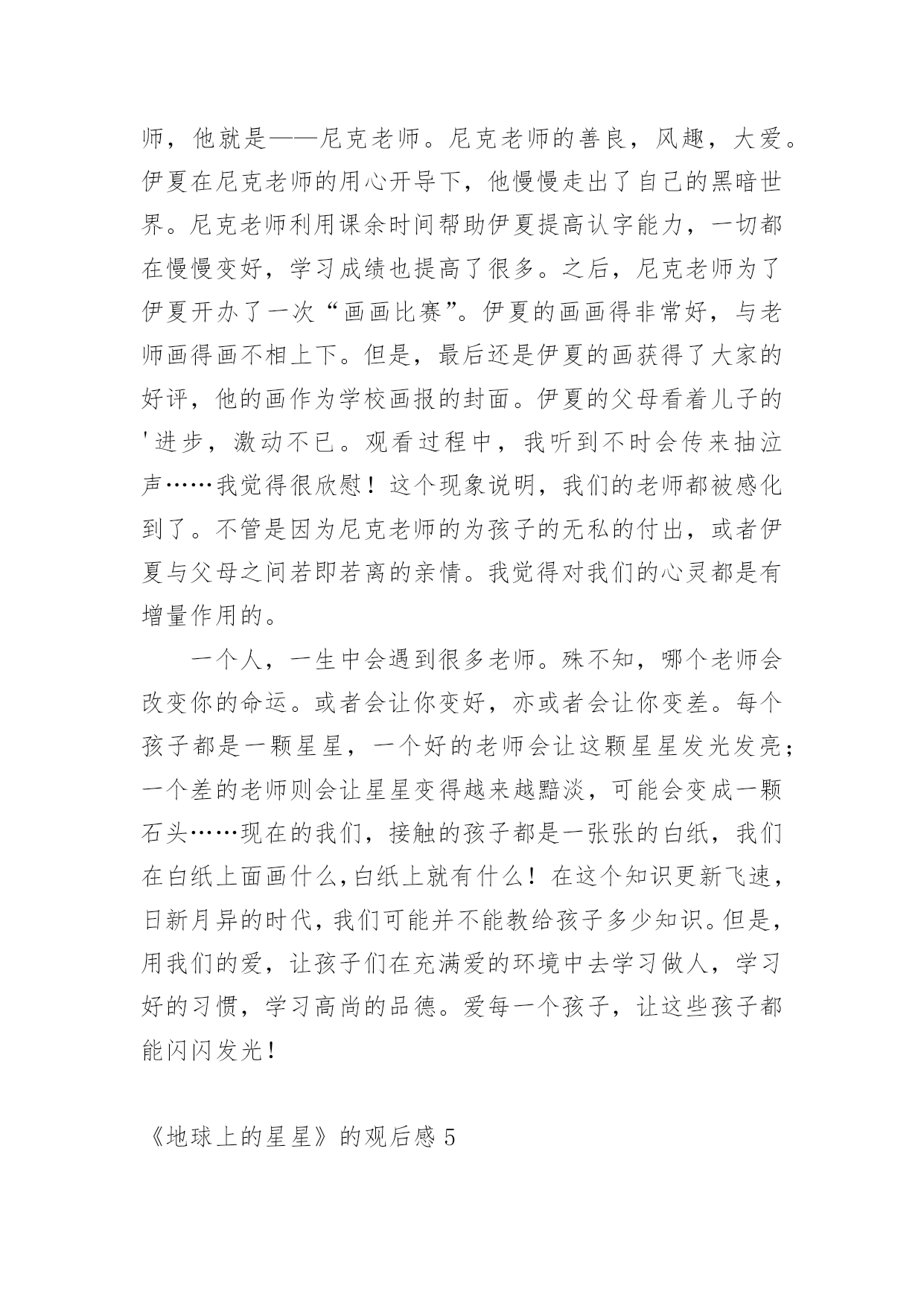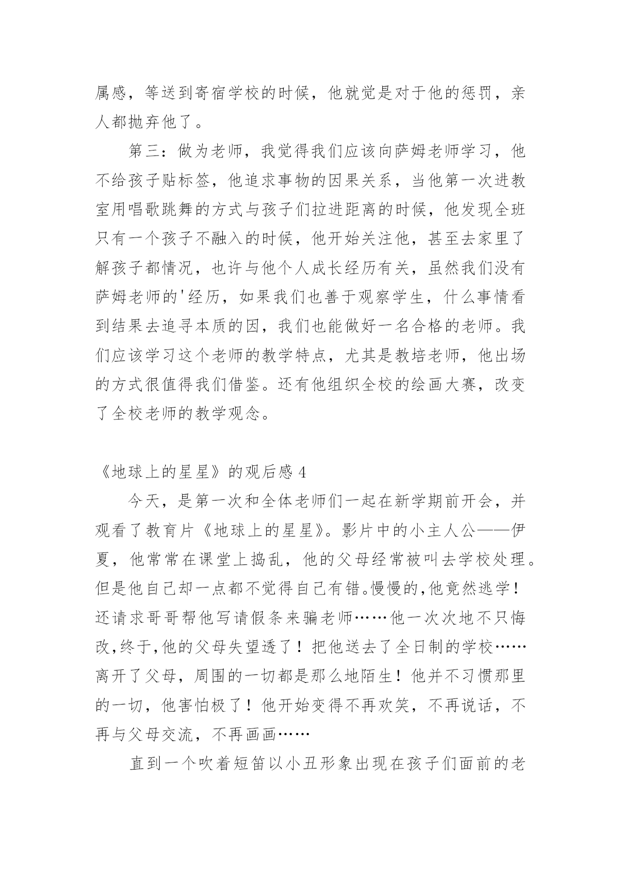 《地球上的星星》的观后感品味完一部作品后,想必你有不少可以分享的东西,需要回过头来写一写观后感了。想必许多人都在为如何写好观后感而烦恼吧,下面是小编为大家整理的《地球上的星星》的观后感,欢迎大家分享。《地球上的星星》的观后感1今天是星期六,我倒是有一些休息时间,于是,我便在电脑上观看了印度电影——《地球上的星星》。看完,我感悟颇深。《地球上的星星》讲述的是一个印度小男孩伊桑的故事。在三年级时,他因为不及格而留级。然而,不管他怎样努力,成绩都没有好转,令父母大伤脑筋。在一次与小伙伴的玩耍中,他一不小心将球扔出了墙外,不知情的父母便给他扣上了“调皮”的`帽子,并且把他转到了一所寄宿制的学校。可是,情况非但没有好转,反而更糟糕了。他的成绩如此的差,老师们对他没有好脸色,还经常体罚他,他也慢慢由原来的开朗变得自卑,上课时经常发呆、走神。所幸的是,新来的美术老师尼克姆在课堂上发现了这个孩子的问题,开始关心他、开导他、辅导他……渐渐地,伊桑开始从自卑中走出来,还在由尼克姆举办的比赛中夺得了第一名。伊桑也从老师们心中的差生变成了优等生。就如尼克姆老师所说的一句话:“每个孩子都有他们的优点。”就比如伊桑富有天马行空的想象力,拉扬学习很好、中规中矩一样。而在现在,谁不望子成龙,望女成凤?有谁不想自己的孩子成为优中优人才?于是,孩子们就被放在了“全面发展”的模型中,丢掉了自己原有的长处,反倒变成各方面成绩平平,说好不好,说坏不坏,所谓“多则不精”也。在所罗门部落中,人们为了得到木材,并不会去砍树,而是一拥而上大声骂那棵树。过不多久,树就会受诅咒而死。在当今社会中,家长也经常会骂自己的孩子,还美其名曰“恨铁不成钢”。如果真的成钢了那还不错,但是,现在大多数都是将铁变为了石头,这又是何必呢?就像那颗树一样,渐渐地“枯死了”。所以说,最重要的还是身边的人对你的态度,如果你在家里有鼓励与严厉并举的家长,在学校碰上推崇“护长容短”的老师,那孩子的成长会走向积极、阳光、自信。《地球上的星星》的观后感2——想要孩子的们看看,有孩子的们必须看看,还是个孩子的们更要看看!第一部分:伊桑的困惑,总是很努力的小孩子,天真的小孩子,叛逆的小孩子,不合群的小孩子,勇敢的小孩子,恋家的小孩子......成绩总是很差,老师不喜欢,家长无奈......第二部分:收起的叛逆。新的学校,离家的孩子,依然找不到自信,连最喜欢的画画都不感兴趣了,妈妈的电话也不接了,总是沉默不语,黯然恐惧!一个八、九岁孩子,内心的挣扎已尽......第三部分:伊桑的教父。一个穿花衣、吹长笛、跳摆舞的美术代课老师,眼里透着泪水,画着不尽的爱,观后感。对于他来说,每个孩子都是独一无二的、“地球上的小星星”。你们多孩子都被他吸引了,唯独伊桑那么特别。其实,他也那么特别,一个特殊学校的'老师的教学方式,与“正规”学校,那么的格格不入!满含泪水、内心焦虑、探秘于行,为什么伊桑那么恐惧呢?伊桑的家,父母的错颌,他的痛心、决心......伊桑是个独特的孩子,一个极具天赋的孩子,就像很多改变世界的人们一样,他看世界的方式有些不同而已。他关注伊桑,帮助伊桑......第四部分:伊桑是个天才。伊桑在其导师的帮助下,走出了阴霾,赢回了自信。伊桑本来就是个天才。父母的惊讶和感激,教学风气的转变,伊桑的快乐,无不让人感到希望和快慰!我们有时候也是个小孩子,一直满努力,一直没找到自己要走的路,四处碰壁,妈妈不能为力,爸爸又视我们甚高,我们无力又困惑,我们也需要一位导师,指点我们走出困惑,走出迷茫,找到自己要走的路。我们一步步走来充满艰辛,在面对别人渴望的眼神,怯弱的内心,是否有勇气去战胜自己和他人的困顿,去宽慰一颗颗如同我们曾经害怕和困惑的内心!不一定是指引的灯塔,或许只是一句“你还好吗?”。想起一首歌:我们都是好孩子,异想天开的孩子......《地球上的星星》的观后感3看完地球上的星星我特别有感触,我感觉:第一:每一个孩子都是一个天使,可能有的孩子天生擅长数理化,有的孩子天生擅长唱歌,有的孩子天生学习不好,怎么努力都学不好,可是每个孩子都是独一无二的,我们不能拿一个标准要求他们,我觉得小主人公伊桑他虽然学习不好,(刚开始我也不懂他这是读写障碍)但是他特别善于发现生活中的美,我觉得他比任何一个孩子都懂得享受生活,童年就应该是他这个样子度过的,哪怕他喜欢踩泥坑,喜欢发呆…他做的都是自己喜欢的事,我们不该用一把尺子衡量所有孩子,做为老师就应该因材施教,每一个孩子都是有一双翅膀,我们不能给他剪掉,等他们进入社会,再责怪他们没有一技之长,不要把学生批量生产投入社会。第二:在父母角度,我们不能把教育孩子都责任全部丢给学校或者老师,家长应该承担起父母是孩子都第一任老师—启蒙老师的担子,因为一个孩子只有在父母的身边才能感受到安全,比如伊桑知