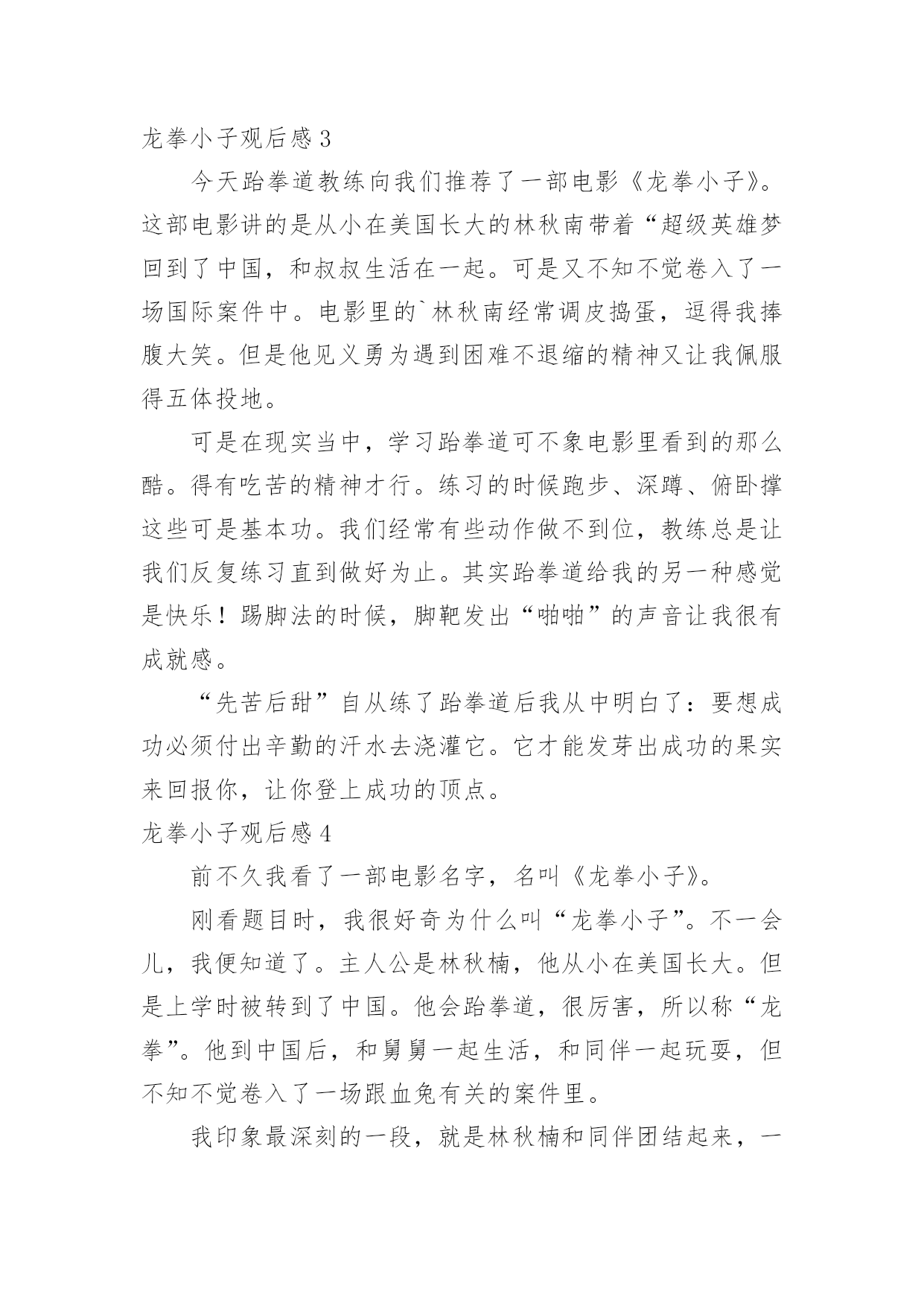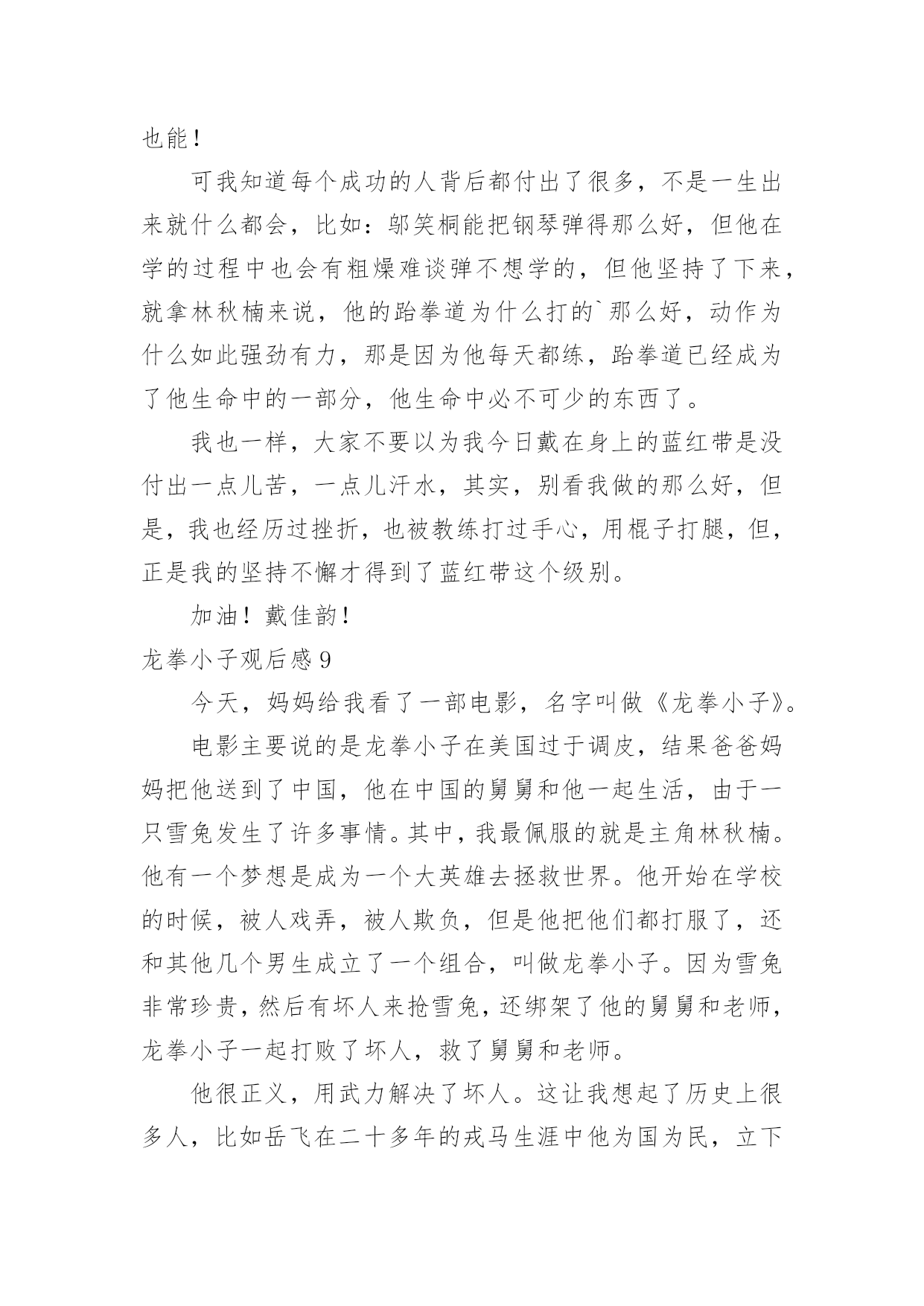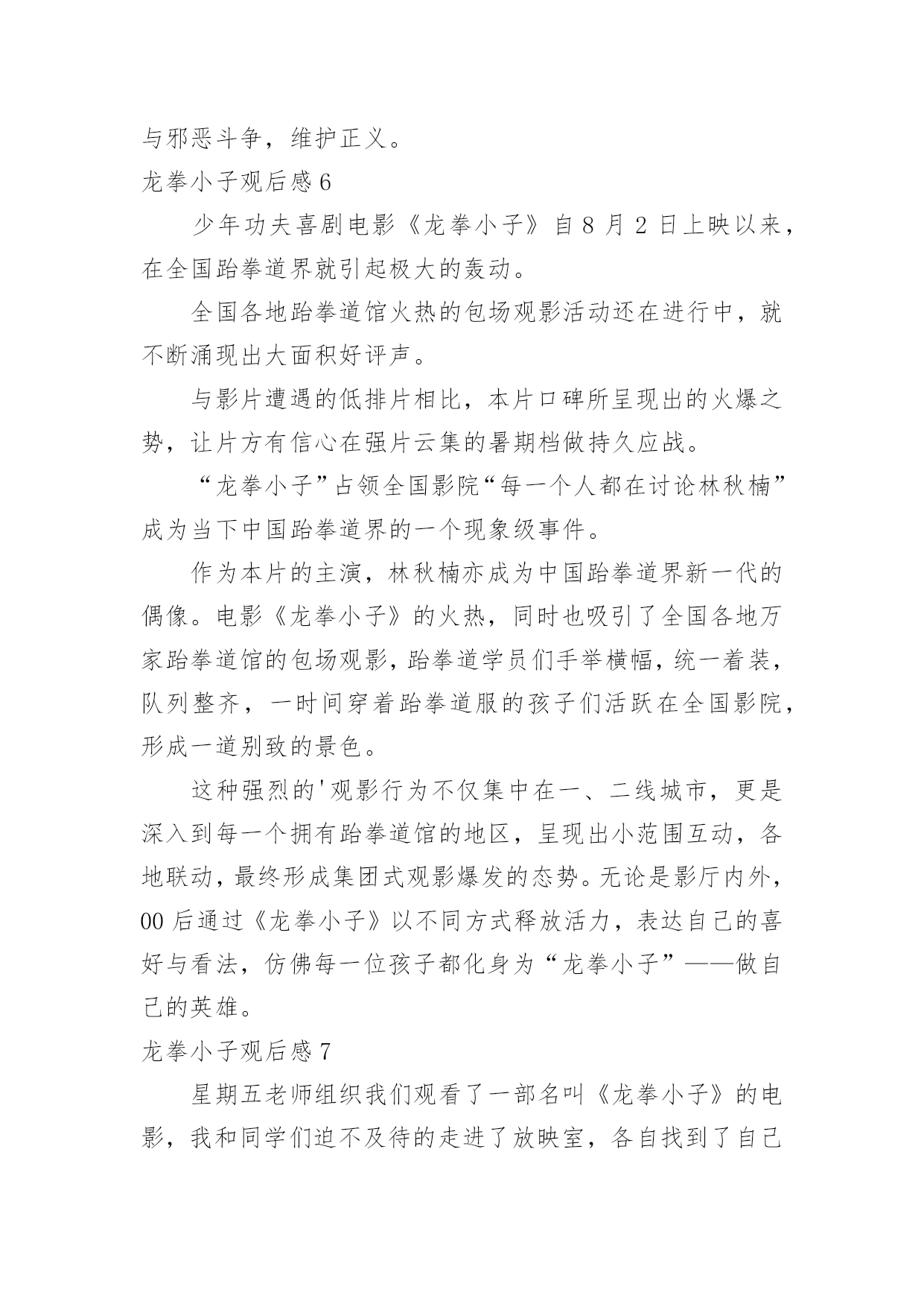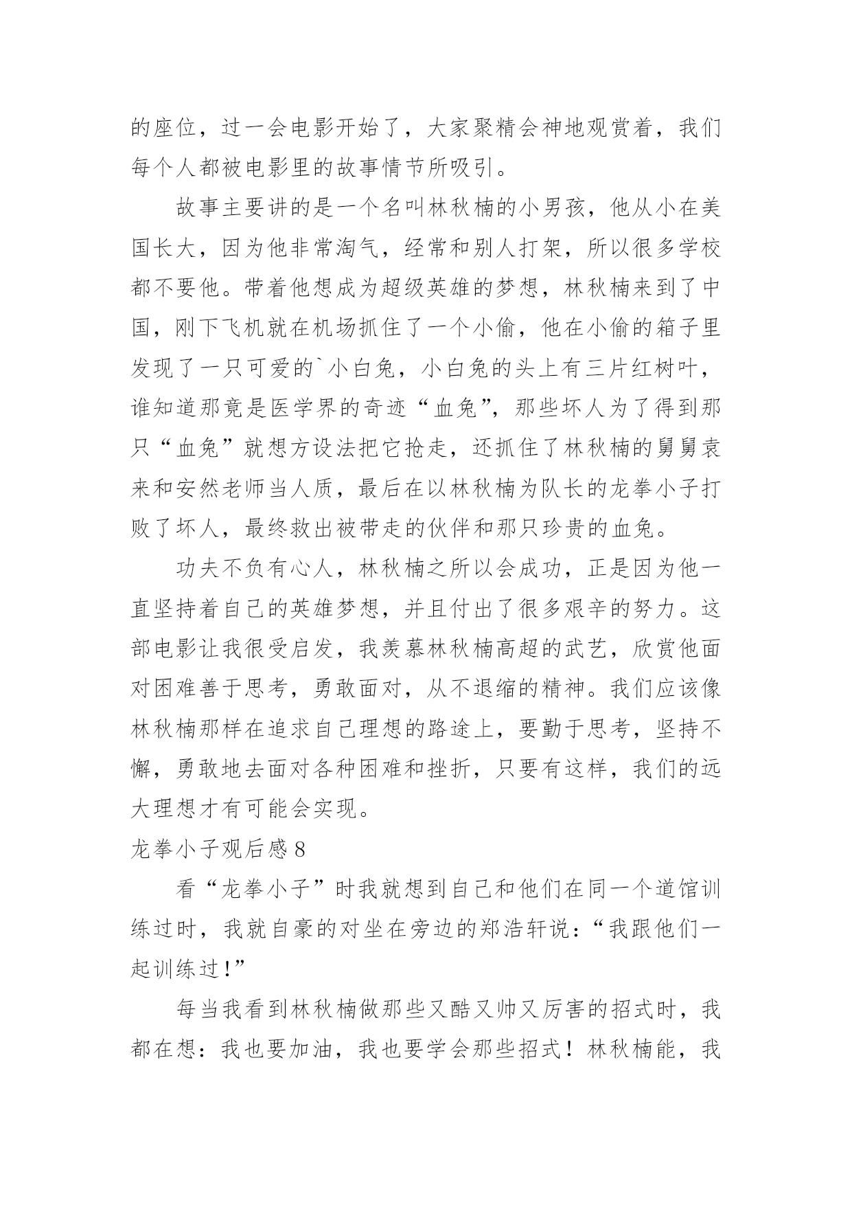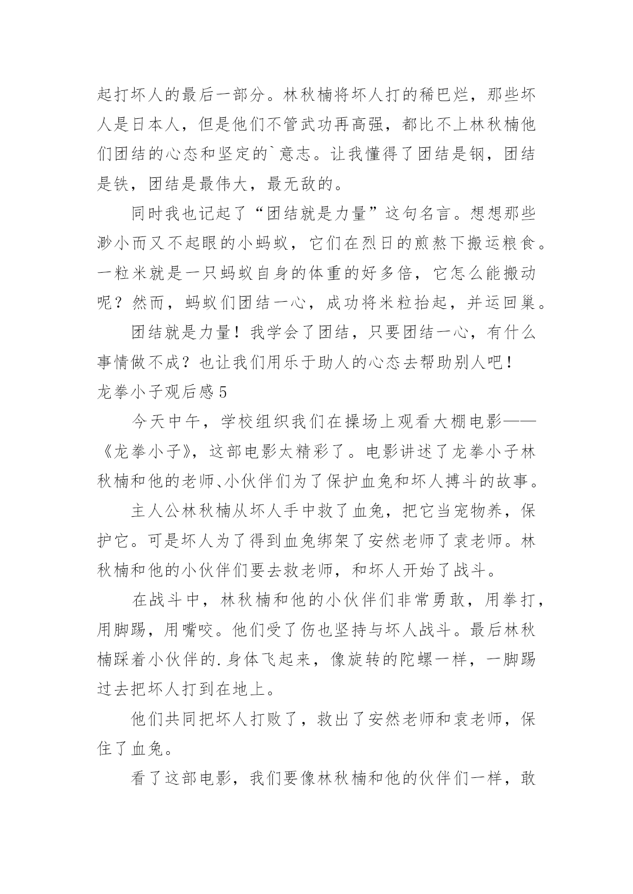 龙拳小子观后感龙拳小子观后感品味完一部作品后,相信大家的视野一定开拓了不少吧,每个观看完影片的人都有不一样的感受与想法。那么你会写观后感吗?以下是小编整理的龙拳小子观后感,仅供参考,欢迎大家阅读。龙拳小子观后感1前几天,我看了一个电影叫《龙拳小子》。里面讲了从小在美国长大随后回到中国的林秋楠的故事。那个时候林秋楠才8岁,别看他年纪小,可他已经打遍美国功夫教师了。一天,林秋楠带着“超级英雄梦”回到中国。到中国机场时,他救了一只兔子,当时他不知道那是一只血兔,血兔的诞生是医学界的奇迹。很多人想得到那只血兔,但是犯罪集团已经查到这只血兔被林秋楠救下,于是他们就找到了林秋楠家。但是他们没想到林秋楠走到哪里就把血兔带到哪里,于是犯罪集团就把林秋楠的伙伴带走,威胁林秋楠交出血兔否则就杀掉他的同伴。这个时候林秋楠才意识到这并不是一只普通的兔子,而是一只血兔它的价值无法估量。如果把血兔交给他们,将造成很坏的后果。于是林秋楠用一只普通的兔子去找犯罪集团,被坏蛋们识破,最后经过一场激烈的.殊死搏斗,林秋楠和他的伙伴终于打败了犯罪集团,救出被带走的伙伴和那只价值很大的血兔。看完电影以后,我特别羡慕林秋楠高超的武艺,更欣赏他遇到困难能够冷静思考,想办法解决,从不退缩。我也学了一段时间跆拳道,我也要向林秋楠一样遇到事情想办法解决,勇敢面对困难,给自己加油!龙拳小子观后感2洞大开在这个市场稍显颓势的暑期档,虽然“合家欢”的概念被反复提及,但真正适合全家人一起观看且欢乐的影片却少之又少,市场远远没有满足观众对此类型真正需求。而《龙拳小子》作为一部以00后为主角的喜剧电影,令小朋友和家长们在上映前就期待已久。观影之后,更有00后观众脑洞大开化身为电影中的角色,直言“要做龙拳小子”,在家中就比划起拳脚,令父母哭笑不得。孩子们的“脑洞”更表现在了他们的文字之中:从电影看到银幕之外——“我相信‘台上一分钟,台下十年功’龙拳小子在幕后肯定付出了很多精心的努力,他们坚持不懈的精神值得我们学习。”关于梦想与信念——“林秋楠之所以会成功不正是因为他一直坚信自己能成为英雄嘛!梦想变成就像一辆火车从一个地点开到另一个很远很远的地方,而信念就像是给火车动力的汽油。”讨论自信的重要性——“如果你有梦想,却不相信自己,那你再像1000年都无济于事。”久违的观影热情也感染无数家长,将孩子们的观影感受发到网上与大家分享的`同时,也决定和孩子一起二刷、三刷《龙拳小子》,对这部让无数孩子着迷的电影一探究竟。《龙拳小子》这部今年暑期档被低估的作品,正在以自己的方式改变着部分人的看法。龙拳小子观后感3今天跆拳道教练向我们推荐了一部电影《龙拳小子》。这部电影讲的是从小在美国长大的林秋南带着“超级英雄梦回到了中国,和叔叔生活在一起。可是又不知不觉卷入了一场国际案件中。电影里的`林秋南经常调皮捣蛋,逗得我捧腹大笑。但是他见义勇为遇到困难不退缩的精神又让我佩服得五体投地。可是在现实当中,学习跆拳道可不象电影里看到的那么酷。得有吃苦的精神才行。练习的时候跑步、深蹲、俯卧撑这些可是基本功。我们经常有些动作做不到位,教练总是让我们反复练习直到做好为止。其实跆拳道给我的另一种感觉是快乐!踢脚法的时候,脚靶发出“啪啪”的声音让我很有成就感。“先苦后甜”自从练了跆拳道后我从中明白了:要想成功必须付出辛勤的汗水去浇灌它。它才能发芽出成功的果实来回报你,让你登上成功的顶点。龙拳小子观后感4前不久我看了一部电影名字,名叫《龙拳小子》。刚看题目时,我很好奇为什么叫“龙拳小子”。不一会儿,我便知道了。主人公是林秋楠,他从小在美国长大。但是上学时被转到了中国。他会跆拳道,很厉害,所以称“龙拳”。他到中国后,和舅舅一起生活,和同伴一起玩耍,但不知不觉卷入了一场跟血兔有关的案件里。我印象最深刻的一段,就是林秋楠和同伴团结起来,一起打坏人的最后一部分。林秋楠将坏人打的稀巴烂,那些坏人是日本人,但是他们不管武功再高强,都比不上林秋楠他们团结的心态和坚定的`意志。让我懂得了团结是钢,团结是铁,团结是最伟大,最无敌的。同时我也记起了“团结就是力量”这句名言。想想那些渺小而又不起眼的小蚂蚁,它们在烈日的煎熬下搬运粮食。一粒米就是一只蚂蚁自身的体重的好多倍,它怎么能搬动呢?然而,蚂蚁们团结一心,成功将米粒抬起,并运回巢。团结就是力量!我学会了团结,只要团结一心,有什么事情做不成?也让我们用乐于助人的心态去帮助别人吧!龙拳小子观后感5今天中午,学校组织我们在操场上观看大棚电影——《龙拳小子》,这部电影太精彩了。电影讲述了龙拳小子林秋楠和他的老师、小伙伴们为了保护血兔和坏人搏斗的故事。主人公林秋楠从坏人手中救了血兔,把它当宠物养,保护它。可是坏人为了得到血兔绑架了安然老师了袁老师。林秋楠和他的小伙伴们要去救老师,和坏人开始了战斗。在战斗中,