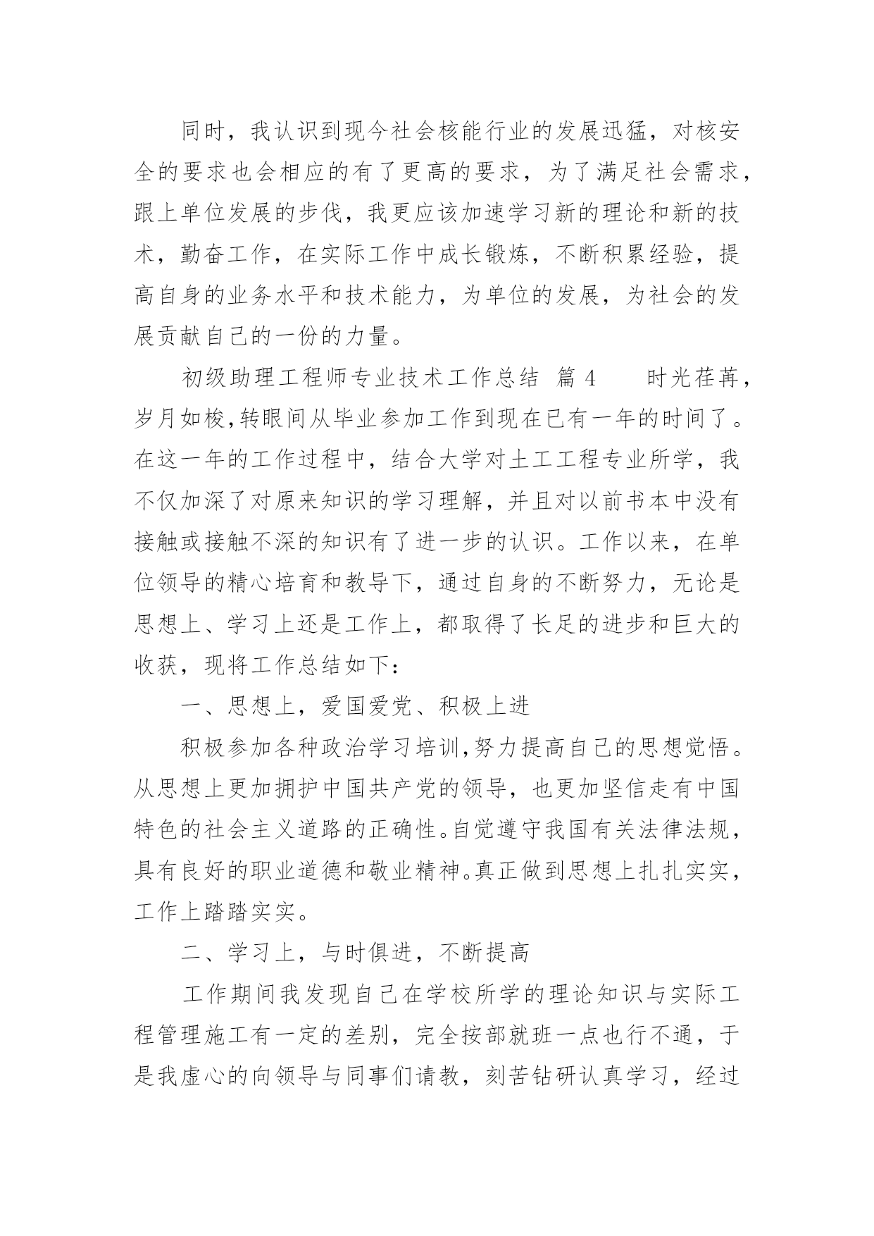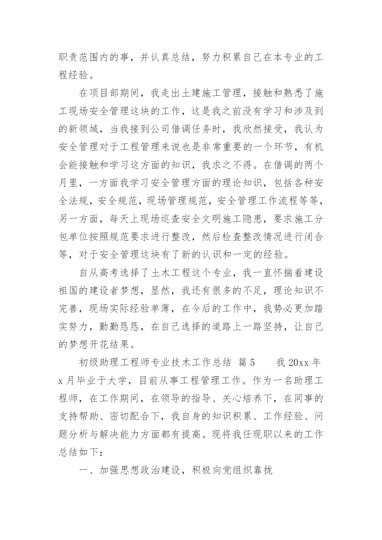 初级助理工程师专业技术工作总结初级助理工程师专业技术工作总结(精选14篇)时间乘着年轮循序往前,一段时间的工作已经结束了,相信大家这段时间以来的收获肯定不少吧,好好地做个梳理并写一份工作总结吧。在写之前,可以先参考范文,以下是小编为大家整理的初级助理工程师专业技术工作总结(精选14篇),仅供参考,欢迎大家阅读。初级助理工程师专业技术工作总结篇1时光飞逝,眨眼间我已经步入社会参加工作近一年多的时间了。在这近一年的工作过程中,我收获良多,不仅加深了对原来学校中学习的知识理解,而且对以前书本中没有接触或接触不深的知识有了进一步的认识,开拓了视野,长了见识。工作以来,在单位领导的精心培育和教导下,通过自身的不断努力,无论是思想上、学习上还是工作上,都取得了长足的发展和巨大的收获,现将工作总结如下:一、思想上的进步作为一名预备党员,无论身置何处,要始终坚持认真学习马列主义、毛泽东思想、邓小平理论和“三个代表”重要思想,坚持实事求是,不断提高自身的政治思想觉悟与水平,不断探索与追求,努力保持一名共产党员的先进性。二、对专业知识以及技能的提高我在校期间学习的是机械方面的专业,于现在从事的工作有一点点不同,却也处处相通。正因为此,要学习的东西很多很多,这对于我们年轻人来说,也不失为一次锻炼自我、挑战自我的机会。理论源于生活而又高于生活,最终又还原到生活中,一年多的工作中,我深刻体会到了这个过程式的转变。在工作中首先我认识到我要学习很多东西,通过各种渠道,无论是自己学习还是老员工的引导,我不断吸收到新的知识并应用于实践,参与一些工程实践,从小处着手,大处着眼,勤学好问,适时地对自己提出不同的要求,工作中不断总结经验教训,提升自身能力的同时,弥补自身的某些不足。“事无巨细,必尽全力”,不论大事小事,都要尽心尽力的去完成,因为每完成一件工作,我就收获一些知识,“积小流而成河”,通过一年的努力工作,我在各方面都有了提高,这也使我感到高兴的地方。三、参加工作的体会未参加工作之前,或多或少的会听见人们在谈论“工作了真累啊,压力好大,生活不自由……”,自己真正投入到工作生活之后,细细体味,觉得工作是丰富多彩的。重要的是心态,心态决定一切。我认为,工作中一定要做到:能吃苦、能干活、能奉献、能忍耐,这样才能有收获、有提高。一年的工作中,我学会了怎样面对困难,怎样做好工作,树立了正确的人生观、价值观。参与了大小不同的工程后,我感到作为一名设计人员,必须要细心、认真,对每一步工作都要稳抓稳打,对工艺流程要熟悉,对图纸要求要高,对规范更要耳熟于心,除此之外,仍然需要学习和工程相关、和专业相联系的知识,用知识武装自己,时刻保持上进心。在过去的工作中,在领导的亲切关怀和同事们的热情请帮助下,经过不断的努力和学习,我适应并喜欢上这份工作,具备了一定的技术工作能力,但是仍然存在一些不足,我深知在今后的工作中,自己仍需加强学习,克服缺点,力争自己的专业技术水平能够不断提高。同时,我认识到现今社会建筑行业的发展迅猛,对设计人员的要求也会相应的有了更高的要求,为了满足社会需求,跟上公司发展的步伐,我更应该加速学习新的理论和新的技术,勤奋工作,在实际工作中成长锻炼,不断积累经验,提高自身的业务水平和技术能力,为公司的发展,为社会的发展贡献一份微薄的力量。初级助理工程师专业技术工作总结篇220xx年7月从xxxx毕业后,我内心中期望把建设家乡跟个人事业发展结合到一起的念头越发强烈,xxxx集团又恰逢其时地供给了这个工作机会,我才得以于今年年初回到xxxx工作。回顾进入xx集团后忙碌而又充实的数个月工作,才知纸上得来终觉浅,课上学到的公式、研究所里掌握的运算模型无论多正确多精准,始终跟现实操作隔着云里雾里的距离。至今悟出来绝知此事要躬行,此刻能够脚踏着工地现场,眼看着工程方案一点点从骨架到日渐丰腴,亲眼目睹着图纸上的设备、处理装置从蓝图慢慢地成为现实并逐渐发挥功效,内心的成就感从未有过的强烈,期间一点一滴积累起来的实践经验,更让我视若瑰宝、铭记在心。在此将这段时间工作简要总结如下:一、政治、思想方面来到xxxx集团后,除了工作态度上头的转变,学习模式到工作模式的转化,更深一步的思想变化是,我体会到了作为xxxx集团一员的团体荣誉感,身在环保项目部的团体意识,还有与同事们共同努力、并肩奋斗的团队精神,最重要的是将公司的未来发展视为己任的主人翁意识,对公司的前景充满了工作热情和完美期望。虽然大学期间我还未加入中国共产党,但在集团工作中看到党员们发挥的带头作用,我决定也以党员的标准严格要求自己,自觉理解监督和帮忙,坚持不懈地克服自身的缺点,争取在今后的漫长的岁月中经得住考验,早日加入伟大的中国。二、工作态度方面纵使离开学校多时,校训依旧是我心头永不磨灭的标杆——。因而无论在工作时还是生活