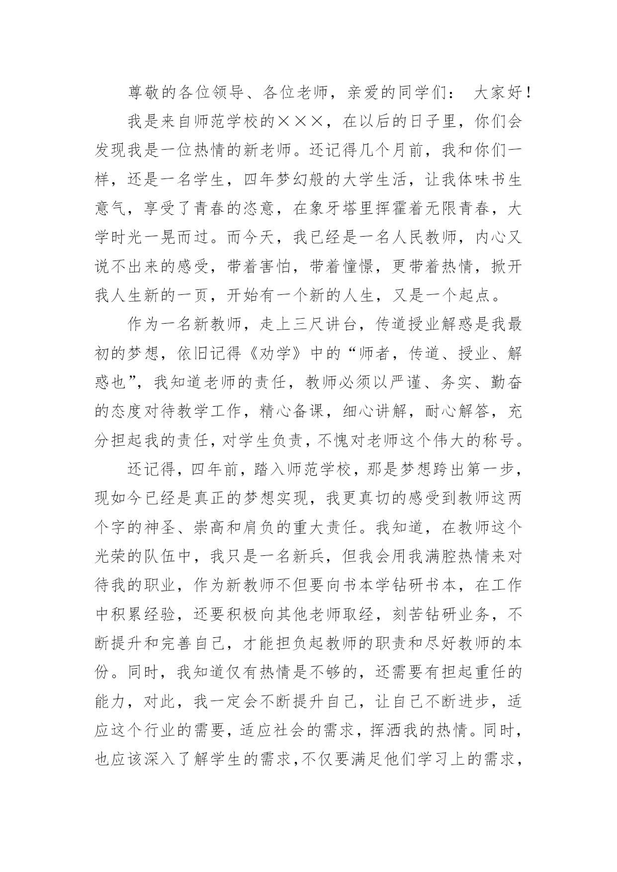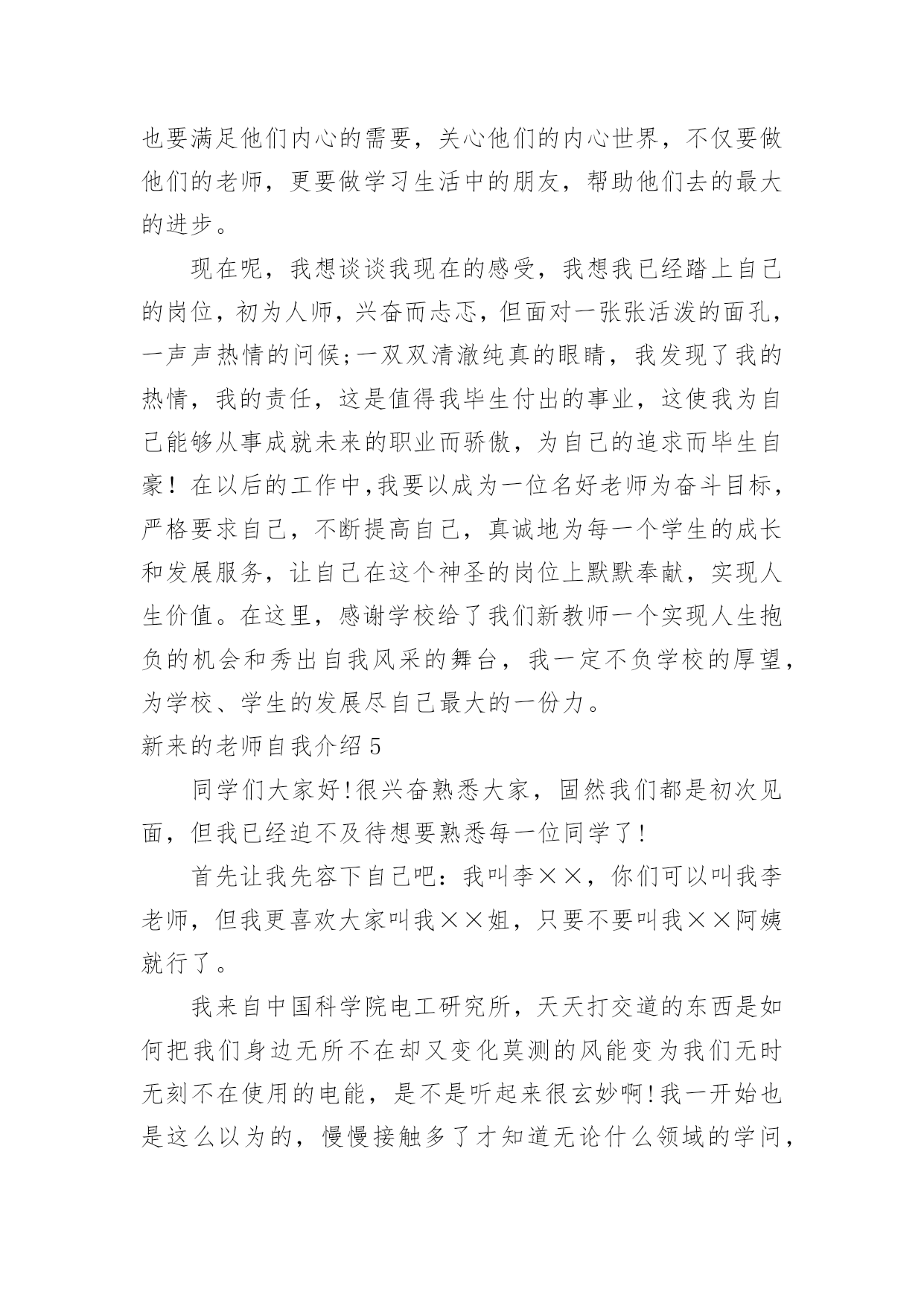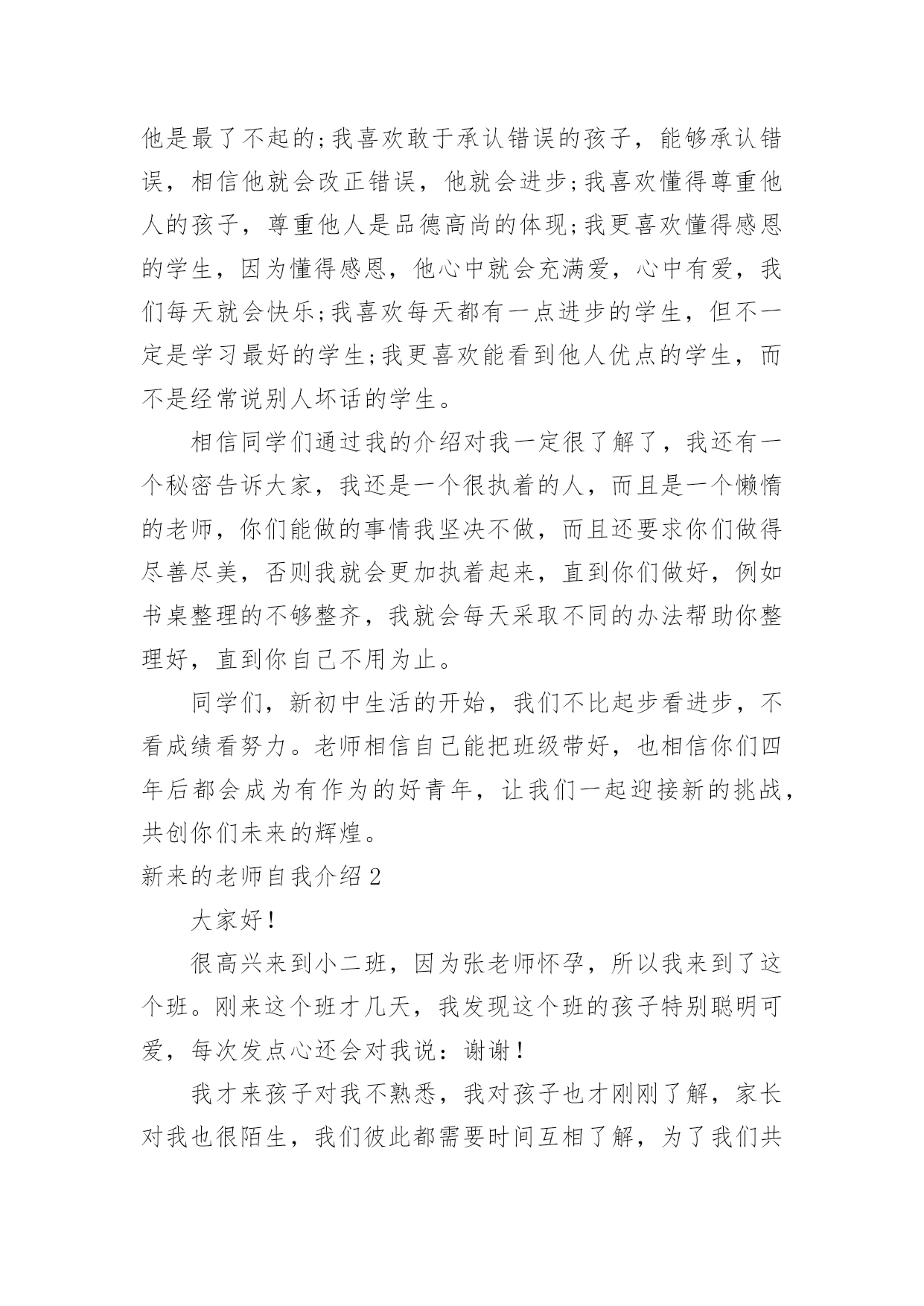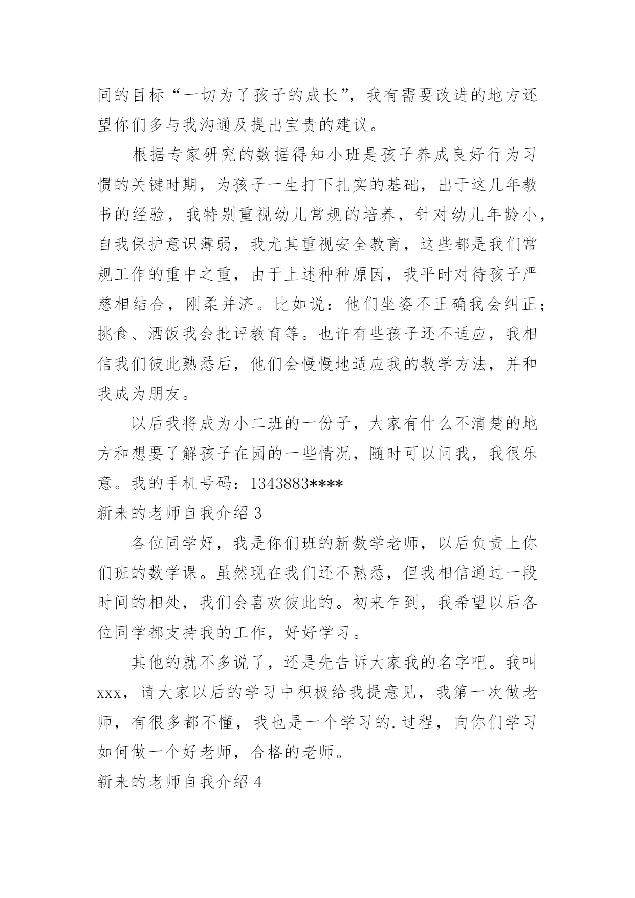 新来的老师自我介绍新来的老师自我介绍当碰到陌生人时候,我们不得不需要向他人介绍自己,自我介绍是一种认识自我的手段。千万不能认为自我介绍随便应付就可以,下面是小编为大家收集的新来的老师自我介绍,希望能够帮助到大家。新来的老师自我介绍1作为一名新老师,我们应该怎么样向同学们做自我介绍呢?以下是小编精心准备的新来的老师自我介绍,大家可以参考以下内容哦!同学们好,从今天开始我们将一起走过四年。下面我向大家介绍一下自己,我是一位有很多缺点的老师,比如说不会梳头,走路不够平稳,是第一印象给人很没气质的老师,有时还很健忘等。但是你们可别小看我,每天我的学生想什么我基本都能猜到,以前我的学生都叫我董半仙,因为这个原因他们每天对我都非常诚实。同学们一定想知道我喜欢什么,下面我就说说:我喜欢听歌但我不会唱;我喜欢玩篮球但玩的很烂,有时还玩赖;我喜欢和学生一起打雪仗;我喜欢自信的学生,你可以做不好事情,但你有信心把它做好,我认为你就是最棒的;我喜欢有责任感的孩子,如果一个学生懂得承担责任,我就会认为他是最了不起的;我喜欢敢于承认错误的孩子,能够承认错误,相信他就会改正错误,他就会进步;我喜欢懂得尊重他人的孩子,尊重他人是品德高尚的体现;我更喜欢懂得感恩的学生,因为懂得感恩,他心中就会充满爱,心中有爱,我们每天就会快乐;我喜欢每天都有一点进步的学生,但不一定是学习最好的学生;我更喜欢能看到他人优点的学生,而不是经常说别人坏话的学生。相信同学们通过我的介绍对我一定很了解了,我还有一个秘密告诉大家,我还是一个很执着的人,而且是一个懒惰的老师,你们能做的事情我坚决不做,而且还要求你们做得尽善尽美,否则我就会更加执着起来,直到你们做好,例如书桌整理的不够整齐,我就会每天采取不同的办法帮助你整理好,直到你自己不用为止。同学们,新初中生活的开始,我们不比起步看进步,不看成绩看努力。老师相信自己能把班级带好,也相信你们四年后都会成为有作为的好青年,让我们一起迎接新的挑战,共创你们未来的辉煌。新来的老师自我介绍2大家好!很高兴来到小二班,因为张老师怀孕,所以我来到了这个班。刚来这个班才几天,我发现这个班的孩子特别聪明可爱,每次发点心还会对我说:谢谢!我才来孩子对我不熟悉,我对孩子也才刚刚了解,家长对我也很陌生,我们彼此都需要时间互相了解,为了我们共同的目标“一切为了孩子的成长”,我有需要改进的地方还望你们多与我沟通及提出宝贵的建议。根据专家研究的数据得知小班是孩子养成良好行为习惯的关键时期,为孩子一生打下扎实的基础,出于这几年教书的经验,我特别重视幼儿常规的培养,针对幼儿年龄小,自我保护意识薄弱,我尤其重视安全教育,这些都是我们常规工作的重中之重,由于上述种种原因,我平时对待孩子严慈相结合,刚柔并济。比如说:他们坐姿不正确我会纠正;挑食、洒饭我会批评教育等。也许有些孩子还不适应,我相信我们彼此熟悉后,他们会慢慢地适应我的教学方法,并和我成为朋友。以后我将成为小二班的一份子,大家有什么不清楚的地方和想要了解孩子在园的一些情况,随时可以问我,我很乐意。我的手机号码:1343883****新来的老师自我介绍3各位同学好,我是你们班的新数学老师,以后负责上你们班的数学课。虽然现在我们还不熟悉,但我相信通过一段时间的相处,我们会喜欢彼此的。初来乍到,我希望以后各位同学都支持我的工作,好好学习。其他的就不多说了,还是先告诉大家我的名字吧。我叫xxx,请大家以后的学习中积极给我提意见,我第一次做老师,有很多都不懂,我也是一个学习的.过程,向你们学习如何做一个好老师,合格的老师。新来的老师自我介绍4尊敬的各位领导、各位老师,亲爱的同学们:大家好!我是来自师范学校的×××,在以后的日子里,你们会发现我是一位热情的新老师。还记得几个月前,我和你们一样,还是一名学生,四年梦幻般的大学生活,让我体味书生意气,享受了青春的恣意,在象牙塔里挥霍着无限青春,大学时光一晃而过。而今天,我已经是一名人民教师,内心又说不出来的感受,带着害怕,带着憧憬,更带着热情,掀开我人生新的一页,开始有一个新的人生,又是一个起点。作为一名新教师,走上三尺讲台,传道授业解惑是我最初的梦想,依旧记得《劝学》中的“师者,传道、授业、解惑也”,我知道老师的责任,教师必须以严谨、务实、勤奋的态度对待教学工作,精心备课,细心讲解,耐心解答,充分担起我的责任,对学生负责,不愧对老师这个伟大的称号。还记得,四年前,踏入师范学校,那是梦想跨出第一步,现如今已经是真正的梦想实现,我更真切的感受到教师这两个字的神圣、崇高和肩负的重大责任。我知道,在教师这个光荣的队伍中,我只是一名新兵,但我会用我满腔热情来对待我的职业,作为新教师不但要向书本学钻研书本,在工作中积累经验,还要积极向其他老师取经,刻苦钻研业务,不断提升和完善自己,才能担