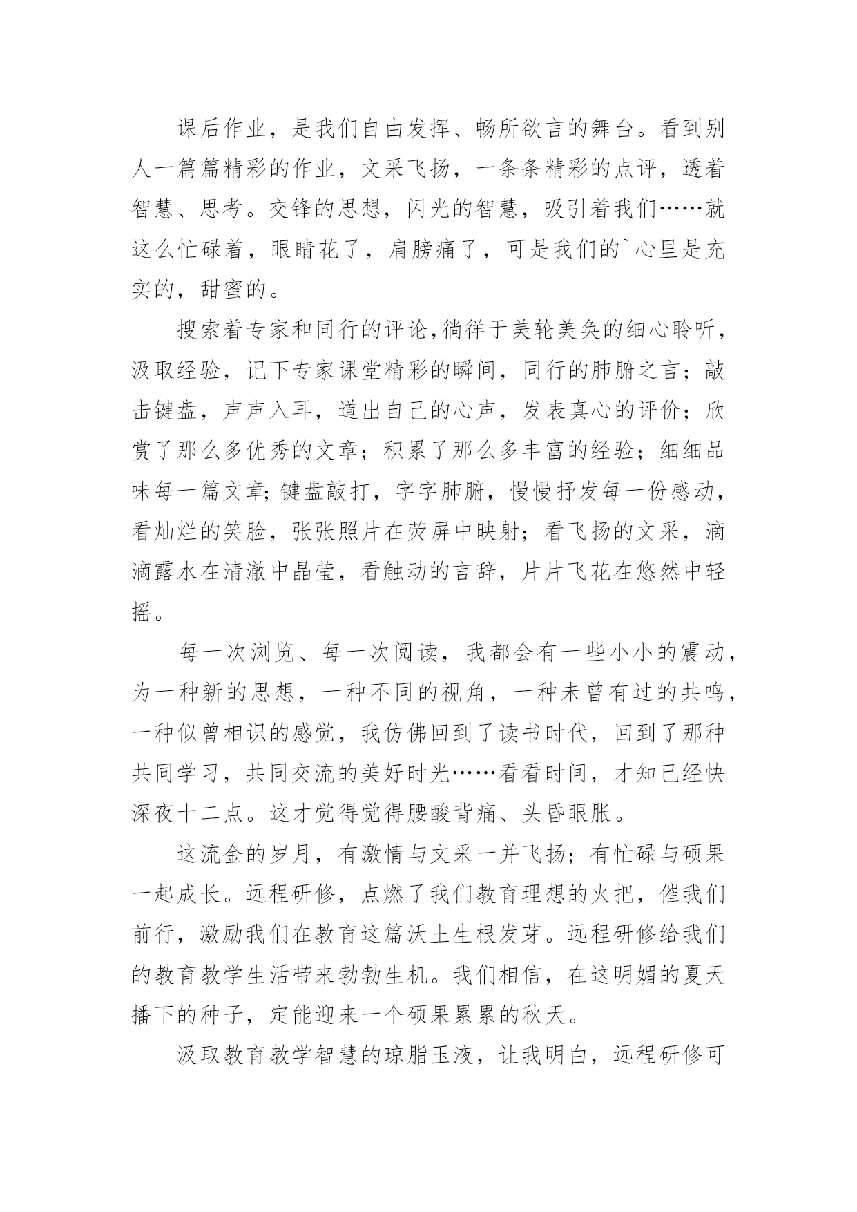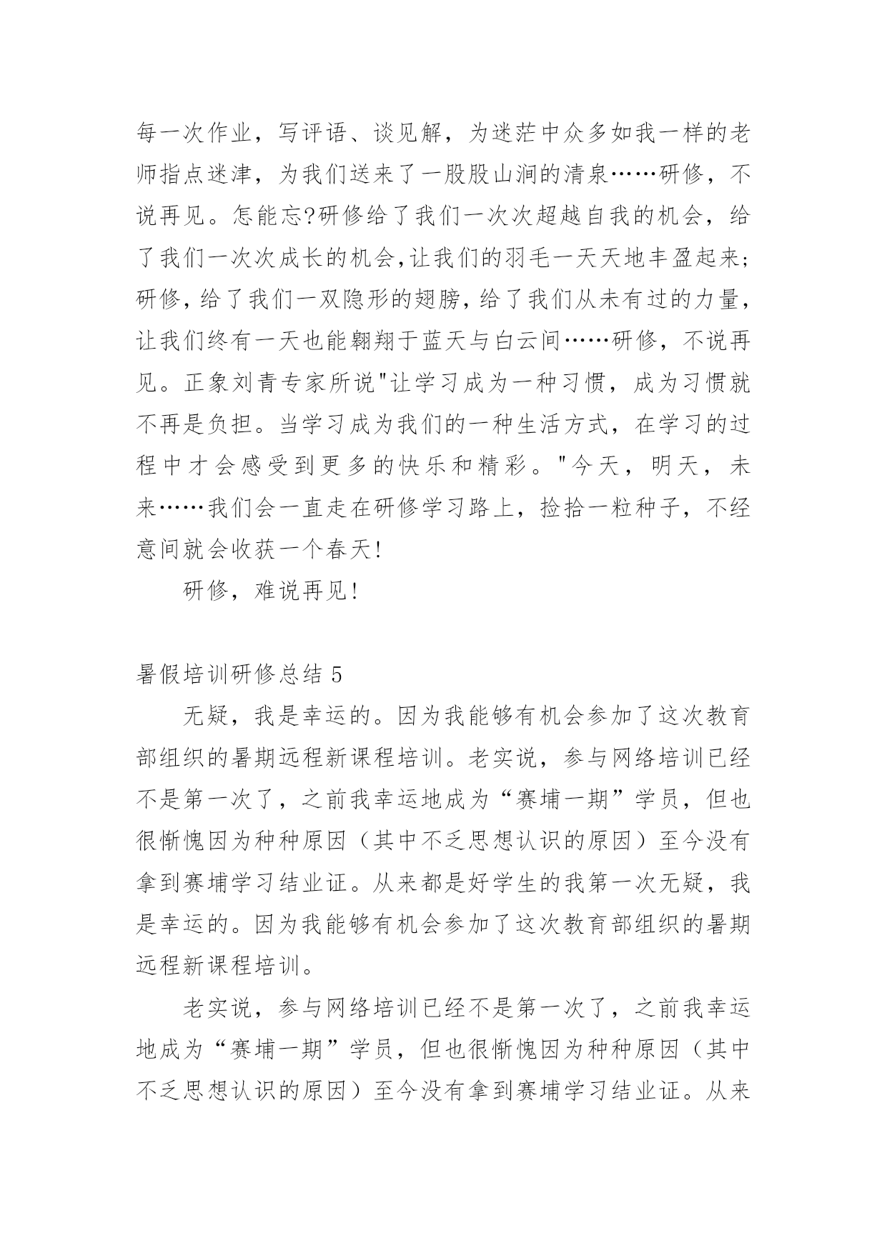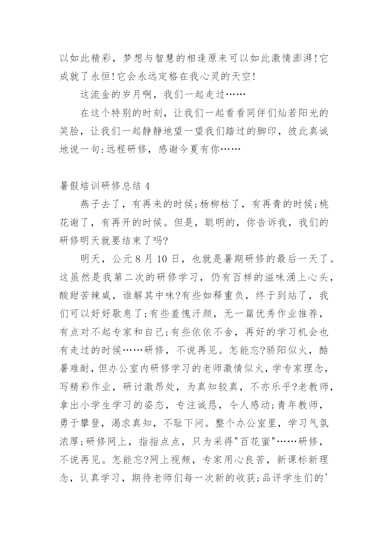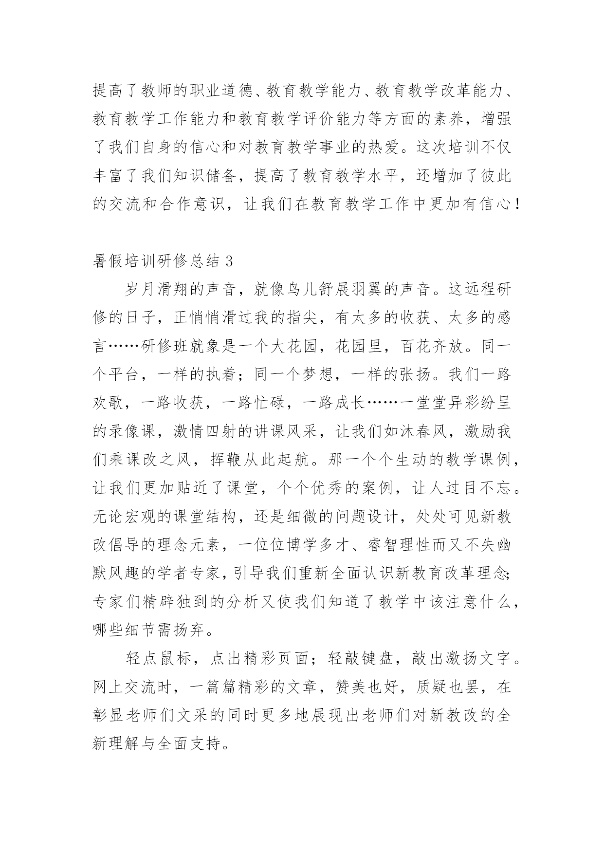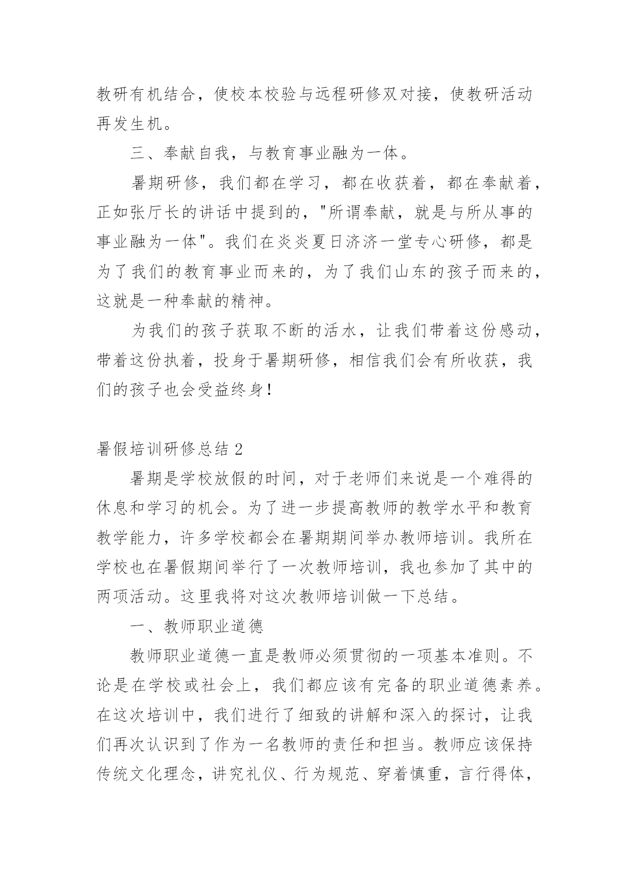 暑假培训研修总结总结是在某一时期、某一项目或某些工作告一段落或者全部完成后进行回顾检查、分析评价,从而得出教训和一些规律性认识的一种书面材料,写总结有利于我们学习和工作能力的提高,让我们好好写一份总结吧。总结怎么写才不会流于形式呢?以下是小编整理的暑假培训研修总结,希望能够帮助到大家。暑假培训研修总结1一、暑期研修,再次打造山东省中小学教师的网上家园。7月8日,全省小学语文远程研修第一批地市学习拉开了序幕。第一批29000多名小学语文教师认真观看了第一模块视频,并认真撰写了思想丰富的精彩作业和感人肺腑的学习感悟,得到专家团队的高度评价。二、专家解读,交流互动营造高昂气氛。由18人组成的专家团队在结合专题学习视频的基础上,对学员提交的作业和感言及问题进行了浏览、点评和回答。每位专家负责指导200多个教研组、20xx多名教师,工作量巨大,但每位专家克服困难,认真阅读点评指导作业,有的发烧还坚持在研修平台上工作,晚上编辑简报到深夜。据统计,语文组创刊号上传以来,学员浏览量达到69019,评论量达到55825,学习的热情极其高涨。有的学员还留言,学校以本次远程研修为契机,积极创新思路,与本校的.校本教研有机结合,使校本校验与远程研修双对接,使教研活动再发生机。三、奉献自我,与教育事业融为一体。暑期研修,我们都在学习,都在收获着,都在奉献着,正如张厅长的讲话中提到的,"所谓奉献,就是与所从事的事业融为一体"。我们在炎炎夏日济济一堂专心研修,都是为了我们的教育事业而来的,为了我们山东的孩子而来的,这就是一种奉献的精神。为我们的孩子获取不断的活水,让我们带着这份感动,带着这份执着,投身于暑期研修,相信我们会有所收获,我们的孩子也会受益终身!暑假培训研修总结2暑期是学校放假的时间,对于老师们来说是一个难得的休息和学习的机会。为了进一步提高教师的教学水平和教育教学能力,许多学校都会在暑期期间举办教师培训。我所在学校也在暑假期间举行了一次教师培训,我也参加了其中的两项活动。这里我将对这次教师培训做一下总结。一、教师职业道德教师职业道德一直是教师必须贯彻的一项基本准则。不论是在学校或社会上,我们都应该有完备的职业道德素养。在这次培训中,我们进行了细致的讲解和深入的探讨,让我们再次认识到了作为一名教师的责任和担当。教师应该保持传统文化理念,讲究礼仪、行为规范、穿着慎重,言行得体,是社会文明进步的重要代表。二、教育教学管理能力在这次教师培训中,我们还就教育教学管理能力进行了深入探讨。教学管理是中学教育管理的重要组成部分,教务干部和普通教师要进一步认识自己的重要性和任务。学校的.教育教学管理需要依据国家和地方的管理法规,并结合实践进行整合、创新和提高,确保实现学校教育教学的各项目标。三、教育教学理念教育教学理念是中学教育的重要抓手,也是提高教师教育教学水平的标志。学校有一套自己的教育教学理念,如果教师能够认真贯彻这个理念,就能够更好的完成学校高品质教育的任务。「质量就是生命,服务就是价值。」这是我校一直坚持的教育教学理念。如果教师能够有好的理念,就能更好的达到教育教学的目的,促进了学生的发展。四、教育教学改革教育教学改革是国内外教育教学改革的浪潮,各级学校都在积极探索。我校教育教学中心主管进行特别讲解,并就新课改的着力点及不同的实施情况进行解析分析,从而指导我们的教学现状。在这次教师培训中,我们一起探讨了教育教学改革的趋势和成就,对新课改、素质教育、体育教育等难点问题进行了重点剖析,让我们更好地发现自身不足、甚至领悟到了新的教育教学思想。五、教育教学工作能力教师的工作就是教育教学活动,根据学生的年龄、性格、学习能力等不同的情况进行科学的教育教学方案设计,帮助学生完成教育教学任务。教师个人的工作能力很重要,它直接关系到教学的质量和效果。在这次教师培训中,我们也就如何提高自身教育教学工作能力进行了讨论,包括:研究新的教育教学理论;不断探索教学方法和打造自己的个性化教育教学模式;普及和学习先进的教育教学科技和教育教学知识,等等。只有熟悉教育教学工作中的基本理论,才能把这些理论运用到实践中,发挥教学的科学性。六、教育教学评价教育教学评价是教育的最基础的工作之一。学校的教育教学工作需要通过科学的评价来检验和反馈教学成果,以及教学质量的提高。在这次教师培训中,学校的教育教学中心分别就班级(课程)教师评分和学科教师自己的评价进行了分析和讲解,我们根据具体的教学实际进行了交流和探讨。只有科学的教育教学评价体系,才能较好的保证教育教学的有效性和实现标准化的教学管理。七、教育教学知识储备教育教学知识储备是教育教学工作中不可或缺的一个环节。在这次教师培训中,我们还进行了教育教学知识储备的学习,包括:教育教学计划的编制、课程和教案的设计、备课和课堂教学技巧等方面。只有具备充