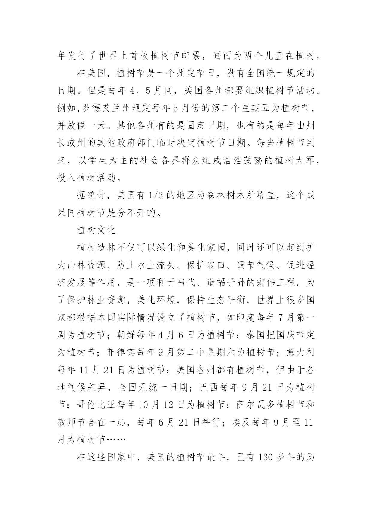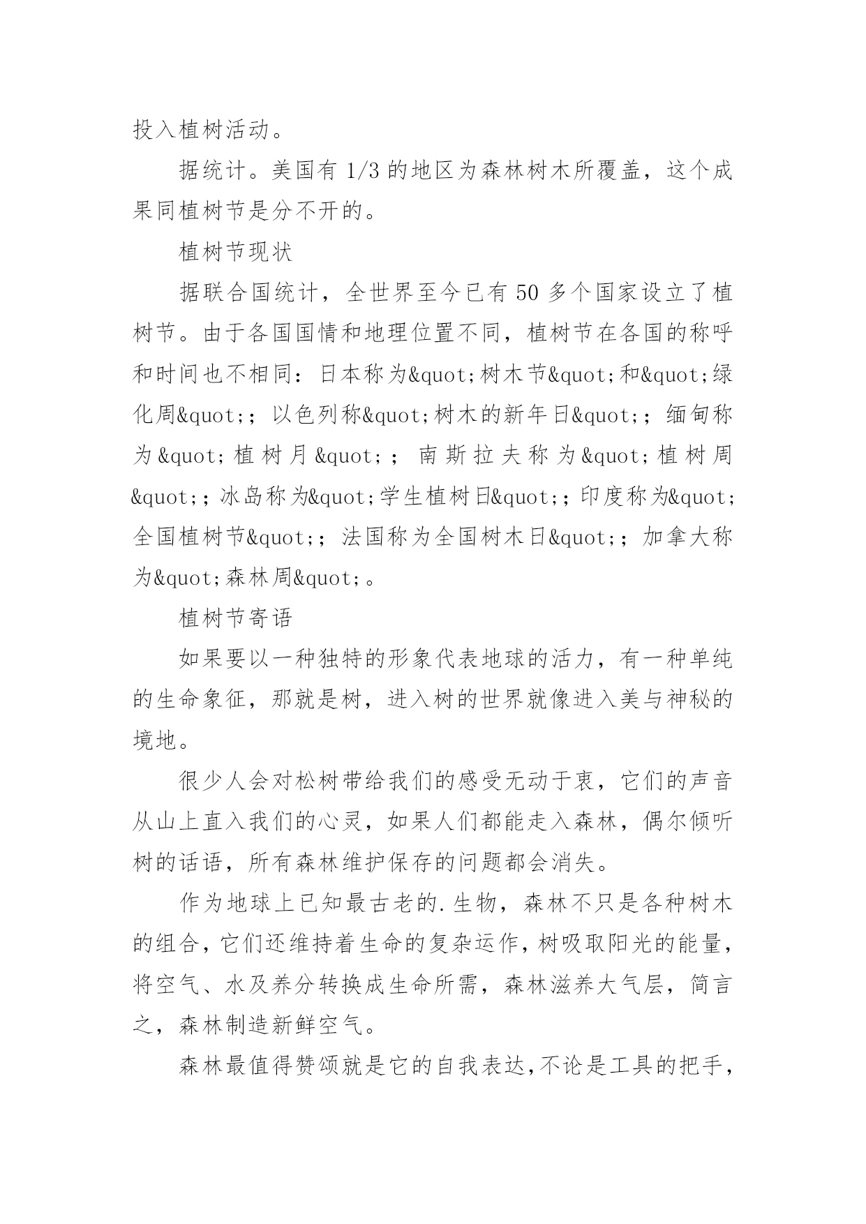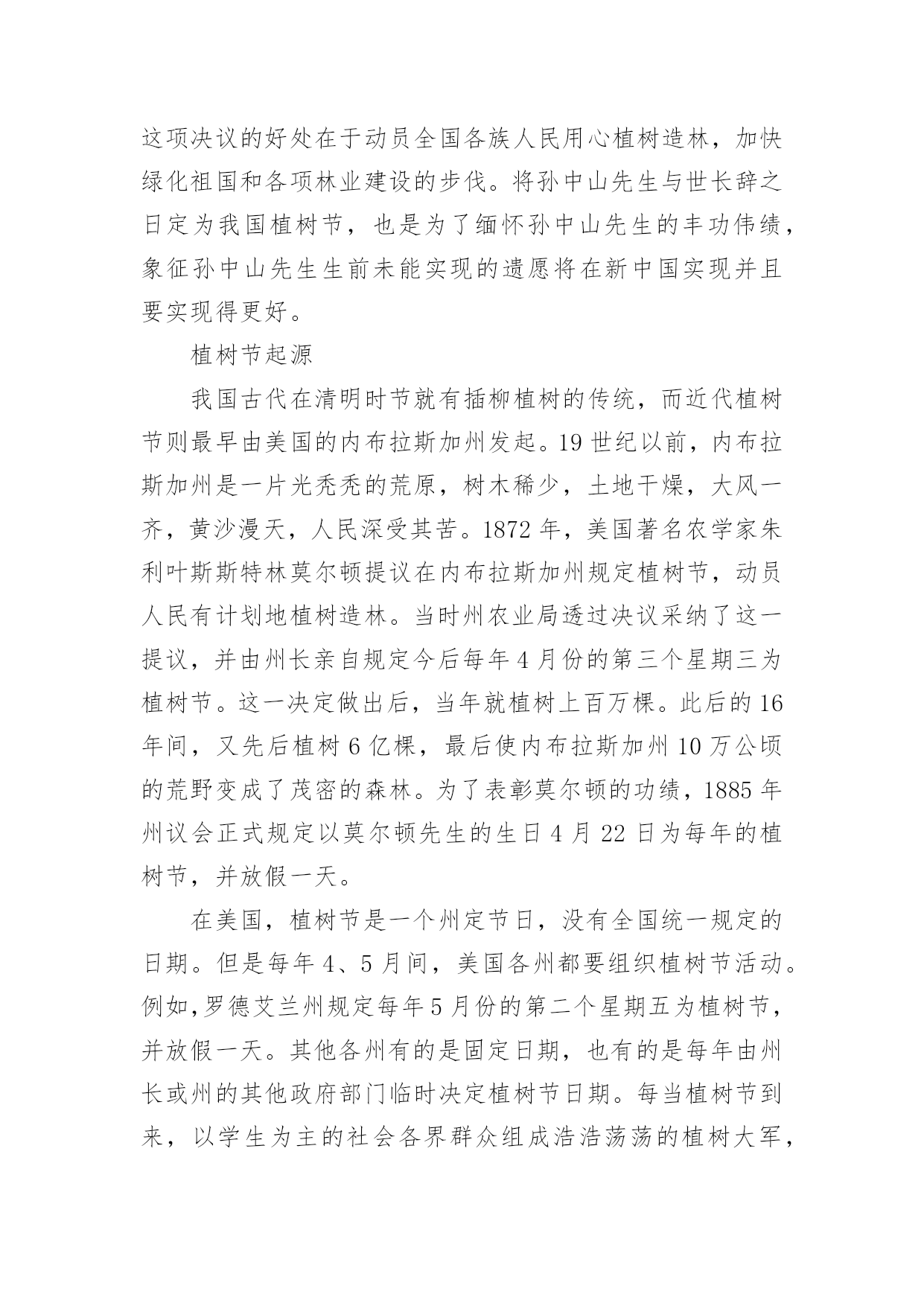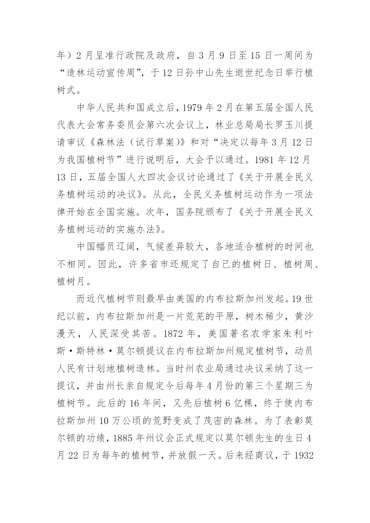 植树节资料植树节资料植树节是按照法律规定宣传保护树木,并组织动员群众积极参加以植树造林为活动内容的节日。下面是小编精心整理的植树节资料,欢迎阅读,希望大家能够喜欢。植树节资料1植树节的好处植树造林不仅仅能够绿化和美化家园,同时还能够起到扩大山林资源、防止水土流失、保护农田、调节气候、促进经济发展等作用,是一项利于当代、造福子孙的宏伟工程。为了保护林业资源,美化环境,持续生态平衡,世界上很多国家都根据本国实际状况设立了植树节。随着人们的环保意识不断增强,并用心投身植树造林活动,我们人类生存的环境将会得到不断的改善。植树节的由来3月12日是我国自己的植树节日,同时这一天也是孙中山逝世纪念日。孙中山先生生前十分重视林业建设,在他任中华民国临时大总统时,就设立了农林部,下设山林司,主管全国林业行政事务。1914年11月颁布了我国近代史上第一部《森林法》,1915年7月,政府又规定将每年的"清明节"定为植树节。1979年2月,第五届全国人大常委会第六次会议根据国务院的提议,透过了将3月12日定为我国植树节的决议,这项决议的好处在于动员全国各族人民用心植树造林,加快绿化祖国和各项林业建设的步伐。将孙中山先生与世长辞之日定为我国植树节,也是为了缅怀孙中山先生的丰功伟绩,象征孙中山先生生前未能实现的遗愿将在新中国实现并且要实现得更好。植树节起源我国古代在清明时节就有插柳植树的传统,而近代植树节则最早由美国的内布拉斯加州发起。19世纪以前,内布拉斯加州是一片光秃秃的荒原,树木稀少,土地干燥,大风一齐,黄沙漫天,人民深受其苦。1872年,美国著名农学家朱利叶斯斯特林莫尔顿提议在内布拉斯加州规定植树节,动员人民有计划地植树造林。当时州农业局透过决议采纳了这一提议,并由州长亲自规定今后每年4月份的第三个星期三为植树节。这一决定做出后,当年就植树上百万棵。此后的16年间,又先后植树6亿棵,最后使内布拉斯加州10万公顷的荒野变成了茂密的森林。为了表彰莫尔顿的功绩,1885年州议会正式规定以莫尔顿先生的生日4月22日为每年的植树节,并放假一天。在美国,植树节是一个州定节日,没有全国统一规定的日期。但是每年4、5月间,美国各州都要组织植树节活动。例如,罗德艾兰州规定每年5月份的第二个星期五为植树节,并放假一天。其他各州有的是固定日期,也有的是每年由州长或州的其他政府部门临时决定植树节日期。每当植树节到来,以学生为主的社会各界群众组成浩浩荡荡的植树大军,投入植树活动。据统计。美国有1/3的地区为森林树木所覆盖,这个成果同植树节是分不开的。植树节现状据联合国统计,全世界至今已有50多个国家设立了植树节。由于各国国情和地理位置不同,植树节在各国的称呼和时间也不相同:日本称为"树木节"和"绿化周";以色列称"树木的新年日";缅甸称为"植树月";南斯拉夫称为"植树周";冰岛称为"学生植树日";印度称为"全国植树节";法国称为全国树木日";加拿大称为"森林周"。植树节寄语如果要以一种独特的形象代表地球的活力,有一种单纯的生命象征,那就是树,进入树的世界就像进入美与神秘的境地。很少人会对松树带给我们的感受无动于衷,它们的声音从山上直入我们的心灵,如果人们都能走入森林,偶尔倾听树的话语,所有森林维护保存的问题都会消失。作为地球上已知最古老的.生物,森林不只是各种树木的组合,它们还维持着生命的复杂运作,树吸取阳光的能量,将空气、水及养分转换成生命所需,森林滋养大气层,简言之,森林制造新鲜空气。森林最值得赞颂就是它的自我表达,不论是工具的把手,还是枯木椿,或是每一根活生生的枝杆,都纪录风的吹袭,它总是叙述自己的故事,这就是为何木材对人有一种吸引力,不仅仅是质料本身,而是一种同源共存与了解的精神。我们一向认为自然资源是取之不尽,用之不竭,丰富的资源看来实在浪费,但是当我们观察大自然的运作,会明白任何一种资源不是无穷尽的,我们始终在等待,旁观看着每一种资源消耗殆尽,期盼下一次会更好。植树节资料2【植树的好处】1.树木能调节气候,持续生态平衡,树木透过光合作用,吸进二氧化碳,吐出氧气,使空气清洁,新鲜。一亩树林放出的氧气够65人呼吸一辈子。2.树能防风固沙,涵养水土,还能吸收各种粉尘,一亩树林一年可吸收各种粉尘20—60吨.。3.树林能减少噪音污染。40米宽的林带可减弱噪音10—15分贝。噪音的污染对人类的生活、学习、工作、休息等方面都造成了很大的'危害,能够说是人们的“敌人”。因此我们更要重视植树造林。噪音还能够使人类在长期的生活中听力减弱、耳聋、变傻,心脏、血压、神经等出现异常。甚至,还能