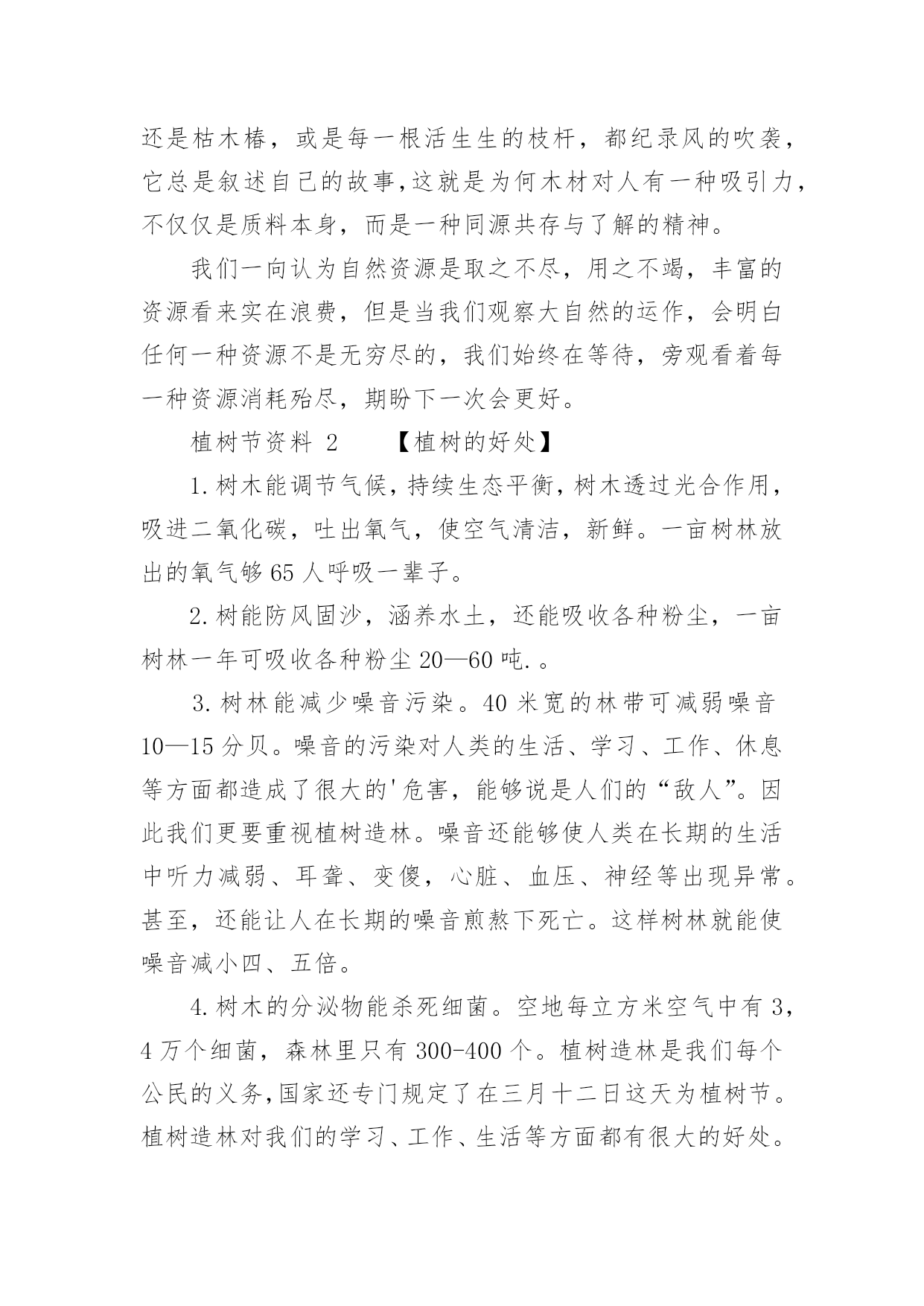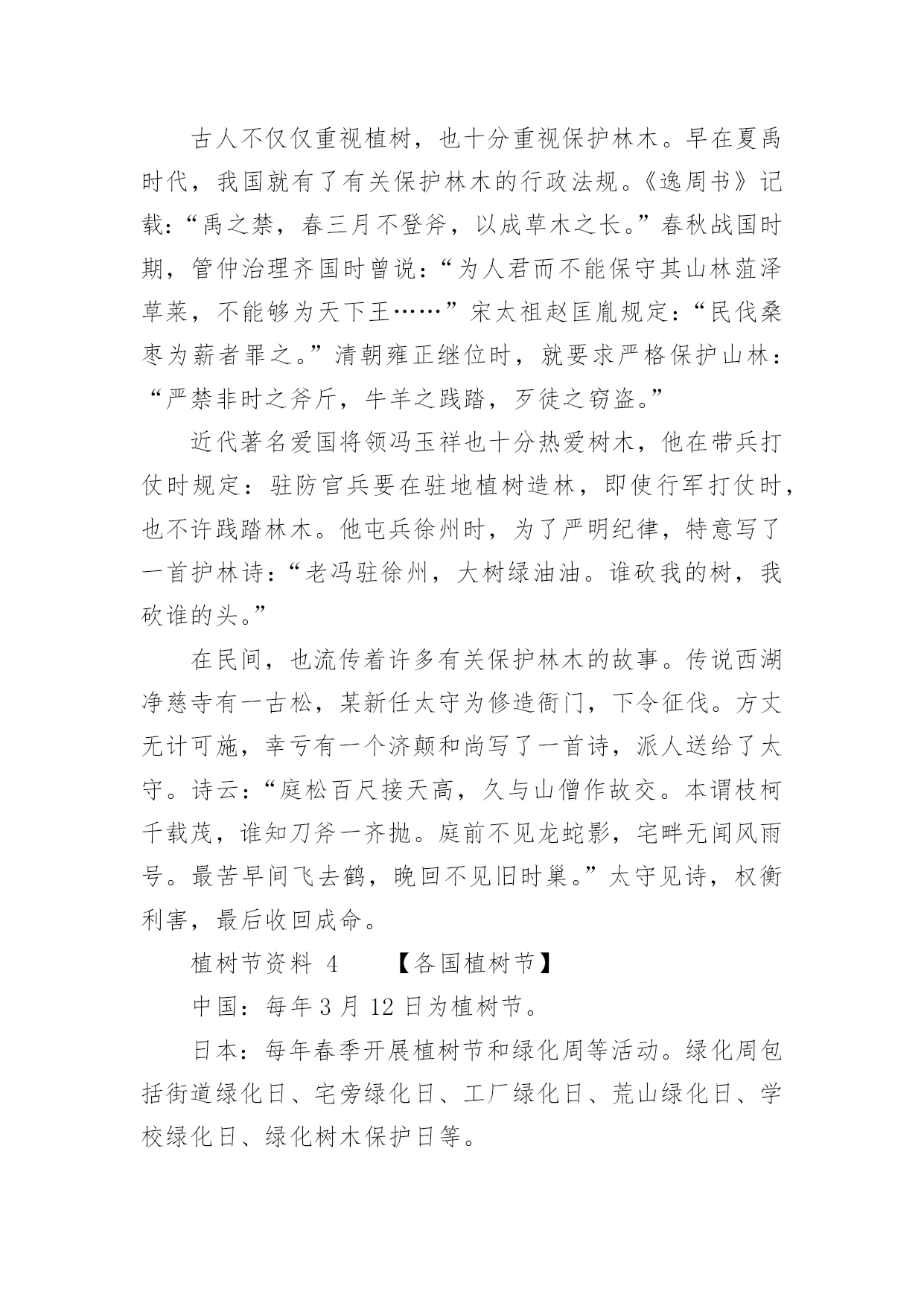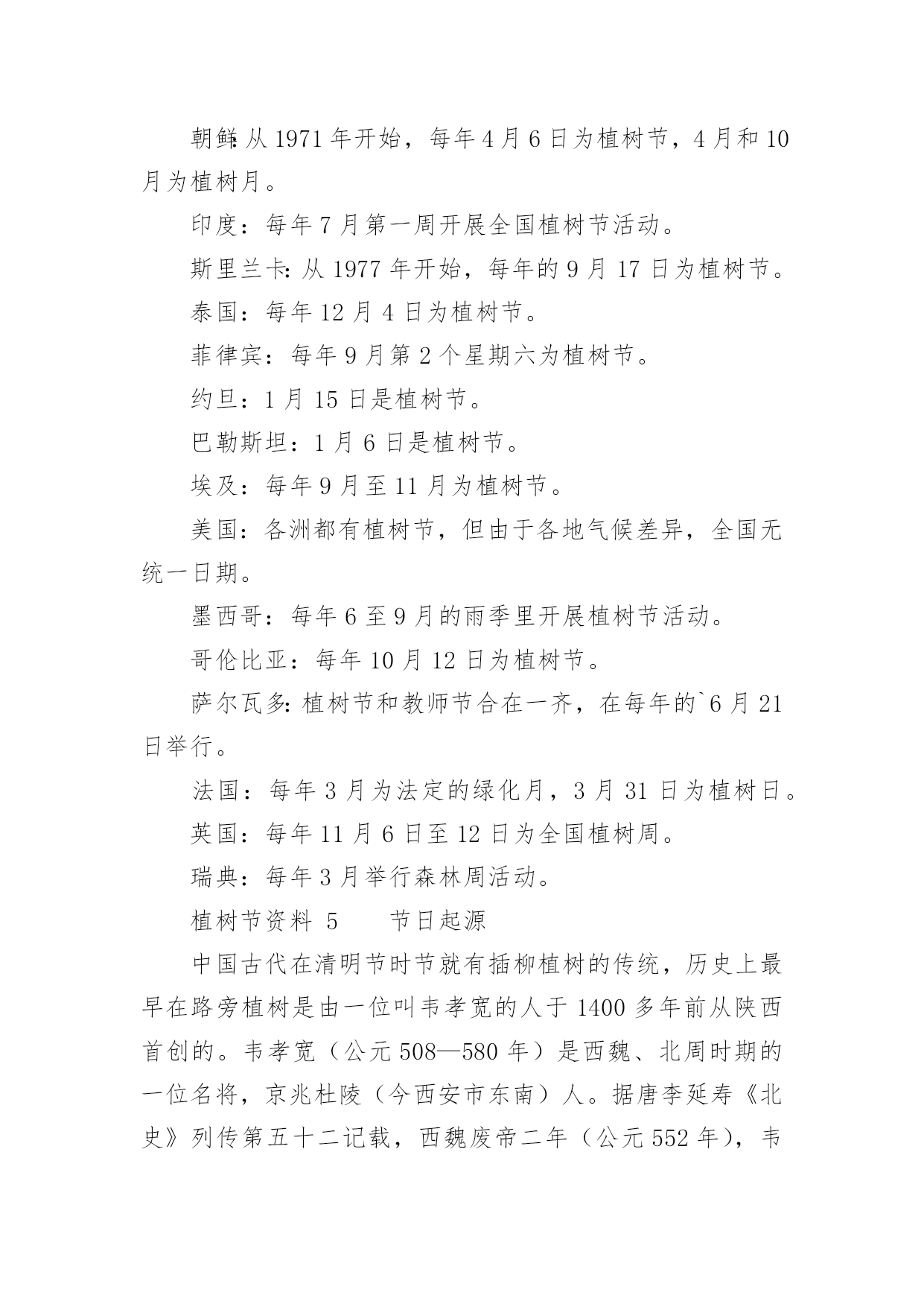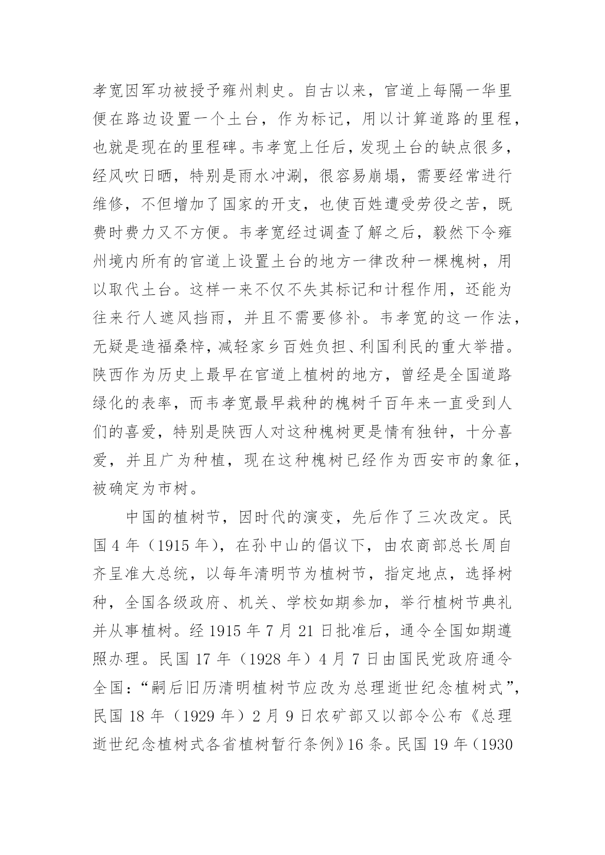 植树节资料植树节资料植树节是按照法律规定宣传保护树木,并组织动员群众积极参加以植树造林为活动内容的节日。下面是小编精心整理的植树节资料,欢迎阅读,希望大家能够喜欢。植树节资料1植树节的好处植树造林不仅仅能够绿化和美化家园,同时还能够起到扩大山林资源、防止水土流失、保护农田、调节气候、促进经济发展等作用,是一项利于当代、造福子孙的宏伟工程。为了保护林业资源,美化环境,持续生态平衡,世界上很多国家都根据本国实际状况设立了植树节。随着人们的环保意识不断增强,并用心投身植树造林活动,我们人类生存的环境将会得到不断的改善。植树节的由来3月12日是我国自己的植树节日,同时这一天也是孙中山逝世纪念日。孙中山先生生前十分重视林业建设,在他任中华民国临时大总统时,就设立了农林部,下设山林司,主管全国林业行政事务。1914年11月颁布了我国近代史上第一部《森林法》,1915年7月,政府又规定将每年的"清明节"定为植树节。1979年2月,第五届全国人大常委会第六次会议根据国务院的提议,透过了将3月12日定为我国植树节的决议,这项决议的好处在于动员全国各族人民用心植树造林,加快绿化祖国和各项林业建设的步伐。将孙中山先生与世长辞之日定为我国植树节,也是为了缅怀孙中山先生的丰功伟绩,象征孙中山先生生前未能实现的遗愿将在新中国实现并且要实现得更好。植树节起源我国古代在清明时节就有插柳植树的传统,而近代植树节则最早由美国的内布拉斯加州发起。19世纪以前,内布拉斯加州是一片光秃秃的荒原,树木稀少,土地干燥,大风一齐,黄沙漫天,人民深受其苦。1872年,美国著名农学家朱利叶斯斯特林莫尔顿提议在内布拉斯加州规定植树节,动员人民有计划地植树造林。当时州农业局透过决议采纳了这一提议,并由州长亲自规定今后每年4月份的第三个星期三为植树节。这一决定做出后,当年就植树上百万棵。此后的16年间,又先后植树6亿棵,最后使内布拉斯加州10万公顷的荒野变成了茂密的森林。为了表彰莫尔顿的功绩,1885年州议会正式规定以莫尔顿先生的生日4月22日为每年的植树节,并放假一天。在美国,植树节是一个州定节日,没有全国统一规定的日期。但是每年4、5月间,美国各州都要组织植树节活动。例如,罗德艾兰州规定每年5月份的第二个星期五为植树节,并放假一天。其他各州有的是固定日期,也有的是每年由州长或州的其他政府部门临时决定植树节日期。每当植树节到来,以学生为主的社会各界群众组成浩浩荡荡的植树大军,投入植树活动。据统计。美国有1/3的地区为森林树木所覆盖,这个成果同植树节是分不开的。植树节现状据联合国统计,全世界至今已有50多个国家设立了植树节。由于各国国情和地理位置不同,植树节在各国的称呼和时间也不相同:日本称为"树木节"和"绿化周";以色列称"树木的新年日";缅甸称为"植树月";南斯拉夫称为"植树周";冰岛称为"学生植树日";印度称为"全国植树节";法国称为全国树木日";加拿大称为"森林周"。植树节寄语如果要以一种独特的形象代表地球的活力,有一种单纯的生命象征,那就是树,进入树的世界就像进入美与神秘的境地。很少人会对松树带给我们的感受无动于衷,它们的声音从山上直入我们的心灵,如果人们都能走入森林,偶尔倾听树的话语,所有森林维护保存的问题都会消失。作为地球上已知最古老的.生物,森林不只是各种树木的组合,它们还维持着生命的复杂运作,树吸取阳光的能量,将空气、水及养分转换成生命所需,森林滋养大气层,简言之,森林制造新鲜空气。森林最值得赞颂就是它的自我表达,不论是工具的把手,还是枯木椿,或是每一根活生生的枝杆,都纪录风的吹袭,它总是叙述自己的故事,这就是为何木材对人有一种吸引力,不仅仅是质料本身,而是一种同源共存与了解的精神。我们一向认为自然资源是取之不尽,用之不竭,丰富的资源看来实在浪费,但是当我们观察大自然的运作,会明白任何一种资源不是无穷尽的,我们始终在等待,旁观看着每一种资源消耗殆尽,期盼下一次会更好。植树节资料2【植树的好处】1.树木能调节气候,持续生态平衡,树木透过光合作用,吸进二氧化碳,吐出氧气,使空气清洁,新鲜。一亩树林放出的氧气够65人呼吸一辈子。2.树能防风固沙,涵养水土,还能吸收各种粉尘,一亩树林一年可吸收各种粉尘20—60吨.。3.树林能减少噪音污染。40米宽的林带可减弱噪音10—15分贝。噪音的污染对人类的生活、学习、工作、休息等方面都造成了很大的'危害,能够说是人们的“敌人”。因此我们更要重视植树造林。噪音还能够使人类在长期的生活中听力减弱、耳聋、变傻,心脏、血压、神经等出现异常。甚至,还能