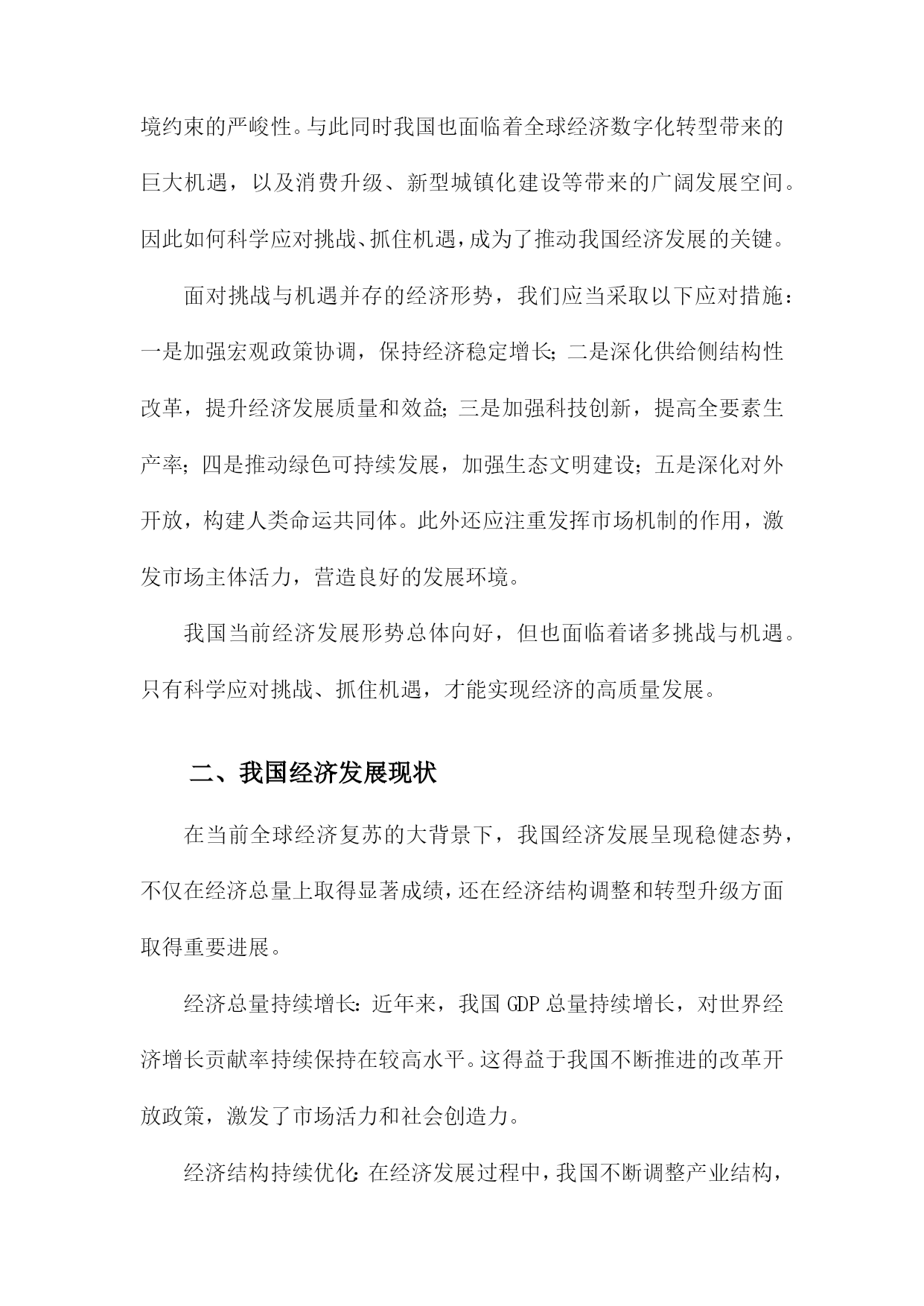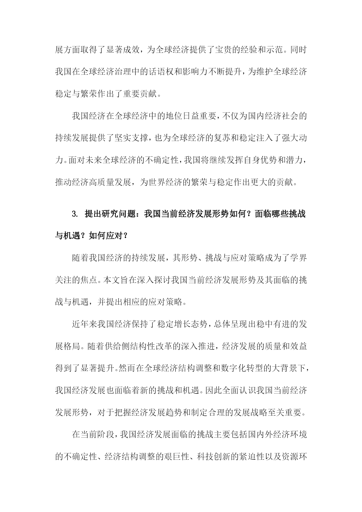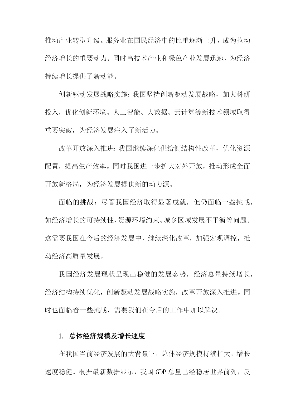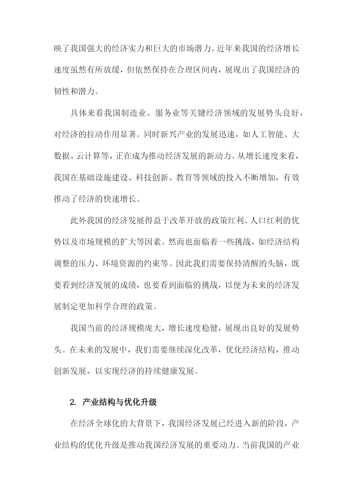 我国当前经济发展形势论文一、综述在全球经济格局深度变革的大背景下,我国经济发展形势论文的撰写具有重要的现实意义和时代价值。本文旨在全面梳理和探讨我国当前经济发展形势,分析面临的挑战与机遇,并提出相应的政策建议和发展策略。回顾近年来的发展历程,可以看到中国经济已经步入新时代,正经历着从传统经济向现代化经济转型的关键时期。同时全球政治经济环境的变化也为我国经济发展带来了新的挑战和机遇。本文将围绕这些核心内容展开论述。首先我国经济总量持续增长,成为世界经济的重要引擎之一。在全球经济放缓的背景下,我国经济增长仍然保持相对较高的速度,展现出了强大的韧性和巨大的潜力。同时产业结构不断优化升级,新旧动能加速转换,创新驱动发展战略的实施取得了显著成效。然而也面临着一些问题和挑战,如区域发展不平衡、资源环境约束等。因此深入探讨当前我国经济发展形势,对于推动经济高质量发展具有重要意义。接下来本文将综述当前国内外经济形势的主要研究成果和观点。通过对相关文献的梳理和分析,我们可以了解到国内外学者对于中国经济的研究主要集中在经济增长、产业结构、创新驱动、区域发展等方面。同时也将关注全球经济形势的变化对中国经济的影响,以及中国在全球经济中的角色和地位。在此基础上,本文将提出自己的观点和看法,为后续的分析和讨论提供基础。1.简述当前全球经济形势在当前全球经济格局中,全球经济复苏的态势持续但呈现出不平衡的特点。一方面主要经济体如美国、欧洲等地的经济增长逐渐稳固,消费需求和投资活动逐渐回升,科技进步和产业升级也在推动经济向前发展。另一方面部分新兴市场和发展中经济体面临着经济结构调整、转型升级的压力和挑战,经济增长速度有所放缓。此外全球经济还面临着诸多不确定因素,如贸易保护主义的抬头、地缘政治风险的加剧以及气候变化等全球性问题,都对全球经济的稳定和发展带来影响。在此背景下,我国经济发展既面临着外部机遇与挑战并存的局面,也需要通过深化改革开放、优化经济结构、提升创新能力等措施来应对外部冲击。同时全球经济形势的复杂多变也为我国经济发展提供了新的机遇和动力源泉。我国经济正在融入全球经济格局中,扮演着越来越重要的角色。随着国际经贸体系的深度融合和技术创新的不断推动,我国的经济环境和产业格局正在发生深刻变化。因此对我国当前经济发展形势的探讨,必须置于全球经济的大背景下进行深入分析。2.阐述我国经济发展在全球经济中的地位及重要性全球经济的格局在近年来经历了深刻的变化,而我国在其中扮演的角色愈发重要。改革开放以来,我国经济持续高速增长,成为全球经济增长的重要引擎之一。在全球经济体系中,我国的地位逐渐由发展中经济体转变为世界第二大经济体,影响力不容忽视。在全球经济价值链的构建中,我国积极承接与扩展新的增长点,对全球经济的稳定与发展起到了重要的支撑作用。我国经济的发展不仅推动了国内社会的进步与繁荣,也对全球经济的复苏和增长产生了深远的影响。特别是在全球经济遭遇重大挑战和不确定性增加的背景下,我国经济的稳健增长为全球经济提供了宝贵的支撑和动力。在全球供应链中,我国正逐渐从“世界工厂”向“世界市场”转变呈现出巨大的市场潜力和增长机会。随着经济全球化深入发展,我国与其他国家的经济合作更加紧密。一带一路倡议的实施进一步促进了与沿线国家的经济合作与交流,也为全球经济提供了新的增长动力。我国在推动全球经济治理体系改革和完善过程中发挥了积极作用,推动了全球经济的开放、包容和可持续发展。我国经济的重要性不仅体现在规模扩张上,更体现在经济结构优化、创新驱动发展等方面。我国在推动新旧动能转换、实现高质量发展方面取得了显著成效,为全球经济提供了宝贵的经验和示范。同时我国在全球经济治理中的话语权和影响力不断提升,为维护全球经济稳定与繁荣作出了重要贡献。我国经济在全球经济中的地位日益重要,不仅为国内经济社会的持续发展提供了坚实支撑,也为全球经济的复苏和稳定注入了强大动力。面对未来全球经济的不确定性,我国将继续发挥自身优势和潜力,推动经济高质量发展,为世界经济的繁荣与稳定作出更大的贡献。3.提出研究问题:我国当前经济发展形势如何?面临哪些挑战与机遇?如何应对?随着我国经济的持续发展,其形势、挑战与应对策略成为了学界关注的焦点。本文旨在深入探讨我国当前经济发展形势及其面临的挑战与机遇,并提出相应的应对策略。近年来我国经济保持了稳定增长态势,总体呈现出稳中有进的发展格局。随着供给侧结构性改革的深入推进,经济发展的质量和效益得到了显著提升。然而在全球经济结构调整和数字化转型的大背景下,我国经济发展也面临着新的挑战和机遇。因此全面认识我国当前经济发展形势,对于把握经济发展趋势和制定合理的发展战略至关重要。在当前阶段,我国经济发展面临的挑战主要包括国内外经济环境的不确定性、经济结构调整