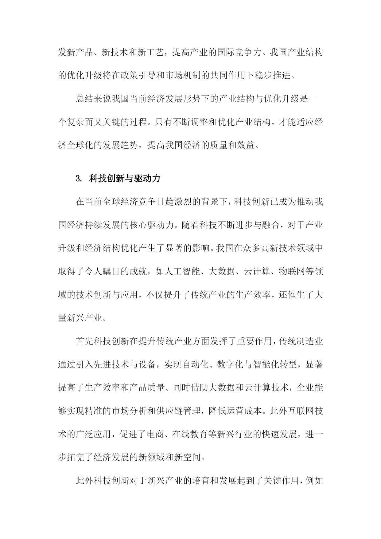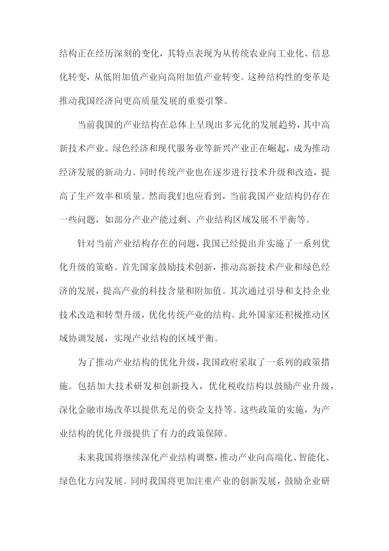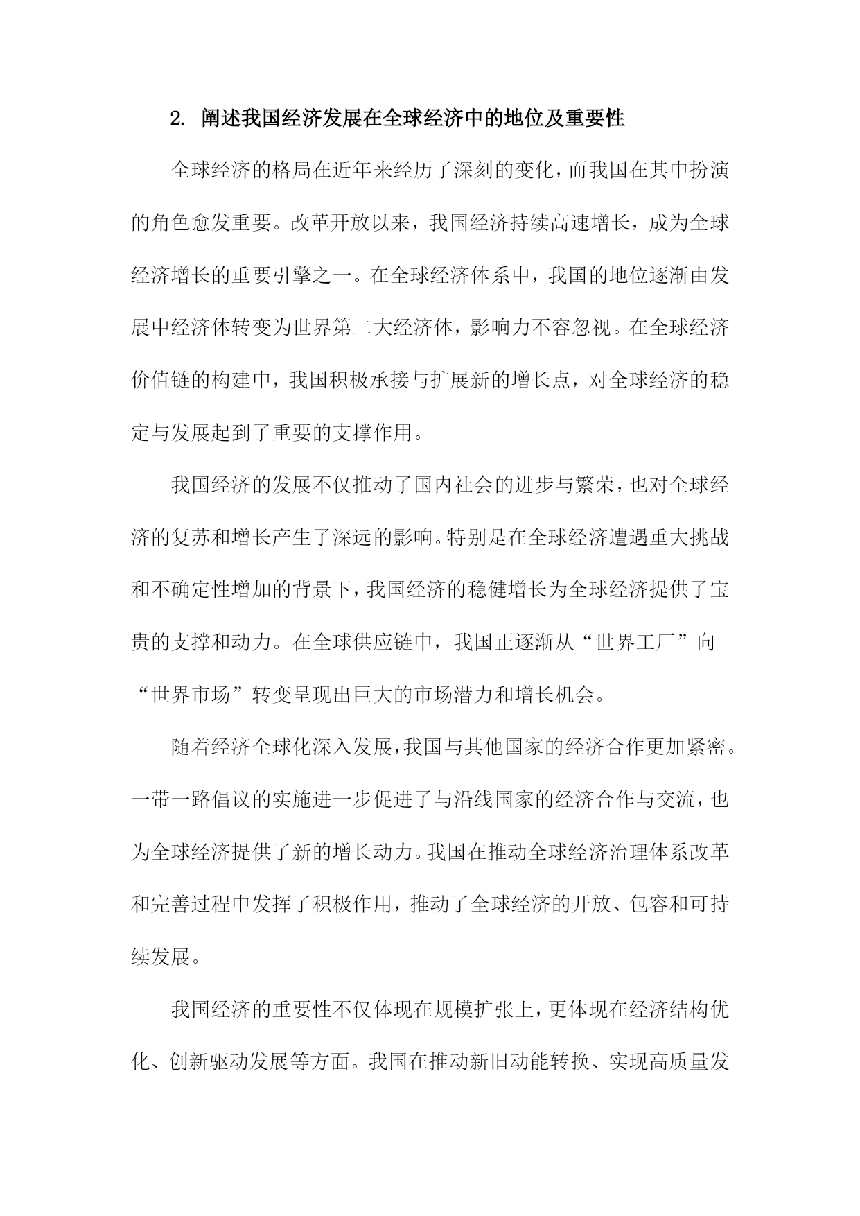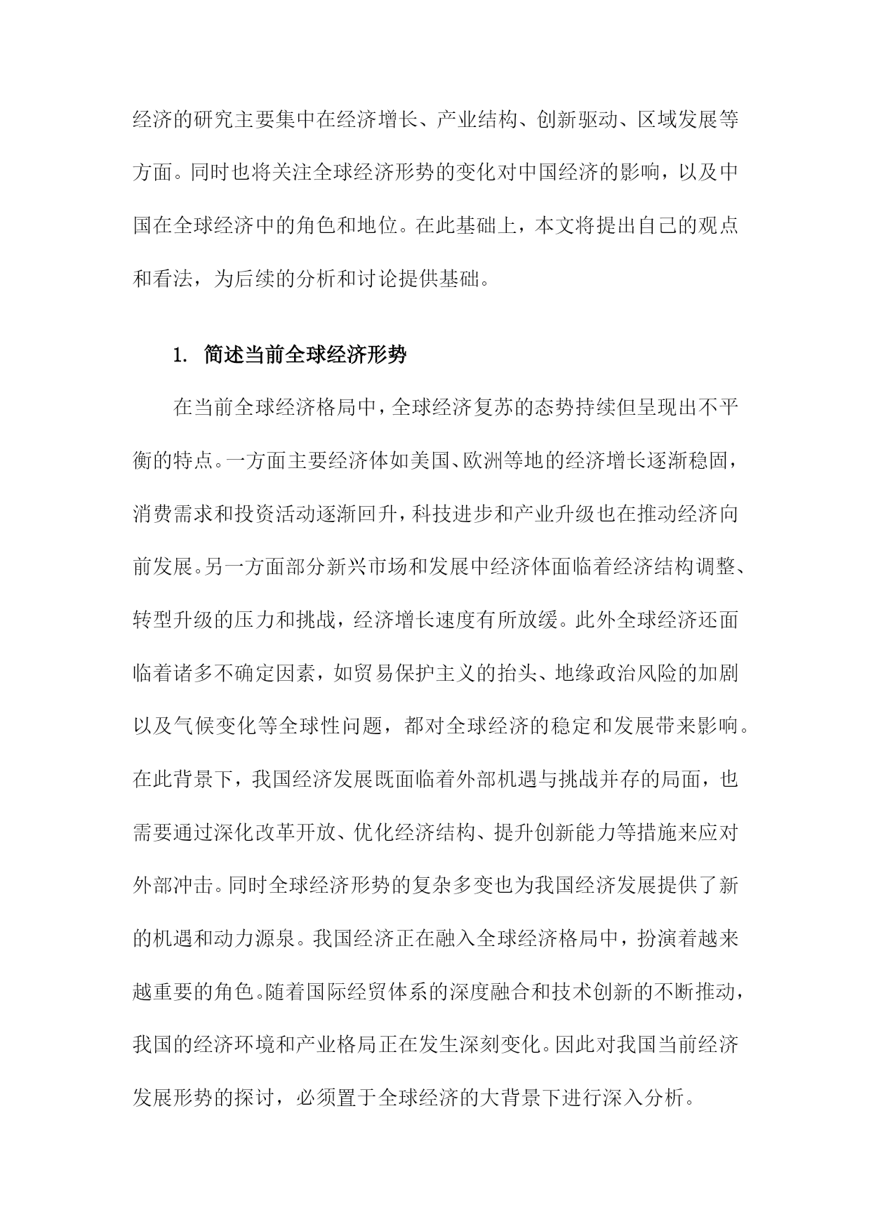 我国当前经济发展形势论文一、综述在全球经济格局深度变革的大背景下,我国经济发展形势论文的撰写具有重要的现实意义和时代价值。本文旨在全面梳理和探讨我国当前经济发展形势,分析面临的挑战与机遇,并提出相应的政策建议和发展策略。回顾近年来的发展历程,可以看到中国经济已经步入新时代,正经历着从传统经济向现代化经济转型的关键时期。同时全球政治经济环境的变化也为我国经济发展带来了新的挑战和机遇。本文将围绕这些核心内容展开论述。首先我国经济总量持续增长,成为世界经济的重要引擎之一。在全球经济放缓的背景下,我国经济增长仍然保持相对较高的速度,展现出了强大的韧性和巨大的潜力。同时产业结构不断优化升级,新旧动能加速转换,创新驱动发展战略的实施取得了显著成效。然而也面临着一些问题和挑战,如区域发展不平衡、资源环境约束等。因此深入探讨当前我国经济发展形势,对于推动经济高质量发展具有重要意义。接下来本文将综述当前国内外经济形势的主要研究成果和观点。通过对相关文献的梳理和分析,我们可以了解到国内外学者对于中国经济的研究主要集中在经济增长、产业结构、创新驱动、区域发展等方面。同时也将关注全球经济形势的变化对中国经济的影响,以及中国在全球经济中的角色和地位。在此基础上,本文将提出自己的观点和看法,为后续的分析和讨论提供基础。1.简述当前全球经济形势在当前全球经济格局中,全球经济复苏的态势持续但呈现出不平衡的特点。一方面主要经济体如美国、欧洲等地的经济增长逐渐稳固,消费需求和投资活动逐渐回升,科技进步和产业升级也在推动经济向前发展。另一方面部分新兴市场和发展中经济体面临着经济结构调整、转型升级的压力和挑战,经济增长速度有所放缓。此外全球经济还面临着诸多不确定因素,如贸易保护主义的抬头、地缘政治风险的加剧以及气候变化等全球性问题,都对全球经济的稳定和发展带来影响。在此背景下,我国经济发展既面临着外部机遇与挑战并存的局面,也需要通过深化改革开放、优化经济结构、提升创新能力等措施来应对外部冲击。同时全球经济形势的复杂多变也为我国经济发展提供了新的机遇和动力源泉。我国经济正在融入全球经济格局中,扮演着越来越重要的角色。随着国际经贸体系的深度融合和技术创新的不断推动,我国的经济环境和产业格局正在发生深刻变化。因此对我国当前经济发展形势的探讨,必须置于全球经济的大背景下进行深入分析。2.阐述我国经济发展在全球经济中的地位及重要性全球经济的格局在近年来经历了深刻的变化,而我国在其中扮演的角色愈发重要。改革开放以来,我国经济持续高速增长,成为全球经济增长的重要引擎之一。在全球经济体系中,我国的地位逐渐由发展中经济体转变为世界第二大经济体,影响力不容忽视。在全球经济价值链的构建中,我国积极承接与扩展新的增长点,对全球经济的稳定与发展起到了重要的支撑作用。我国经济的发展不仅推动了国内社会的进步与繁荣,也对全球经济的复苏和增长产生了深远的影响。特别是在全球经济遭遇重大挑战和不确定性增加的背景下,我国经济的稳健增长为全球经济提供了宝贵的支撑和动力。在全球供应链中,我国正逐渐从“世界工厂”向“世界市场”转变呈现出巨大的市场潜力和增长机会。随着经济全球化深入发展,我国与其他国家的经济合作更加紧密。一带一路倡议的实施进一步促进了与沿线国家的经济合作与交流,也为全球经济提供了新的增长动力。我国在推动全球经济治理体系改革和完善过程中发挥了积极作用,推动了全球经济的开放、包容和可持续发展。我国经济的重要性不仅体现在规模扩张上,更体现在经济结构优化、创新驱动发展等方面。我国在推动新旧动能转换、实现高质量发展方面取得了显著成效,为全球经济提供了宝贵的经验和示范。同时我国在全球经济治理中的话语权和影响力不断提升,为维护全球经济稳定与繁荣作出了重要贡献。我国经济在全球经济中的地位日益重要,不仅为国内经济社会的持续发展提供了坚实支撑,也为全球经济的复苏和稳定注入了强大动力。面对未来全球经济的不确定性,我国将继续发挥自身优势和潜力,推动经济高质量发展,为世界经济的繁荣与稳定作出更大的贡献。3.提出研究问题:我国当前经济发展形势如何?面临哪些挑战与机遇?如何应对?随着我国经济的持续发展,其形势、挑战与应对策略成为了学界关注的焦点。本文旨在深入探讨我国当前经济发展形势及其面临的挑战与机遇,并提出相应的应对策略。近年来我国经济保持了稳定增长态势,总体呈现出稳中有进的发展格局。随着供给侧结构性改革的深入推进,经济发展的质量和效益得到了显著提升。然而在全球经济结构调整和数字化转型的大背景下,我国经济发展也面临着新的挑战和机遇。因此全面认识我国当前经济发展形势,对于把握经济发展趋势和制定合理的发展战略至关重要。在当前阶段,我国经济发展面临的挑战主要包括国内外经济环境的不确定性、经济结构调整