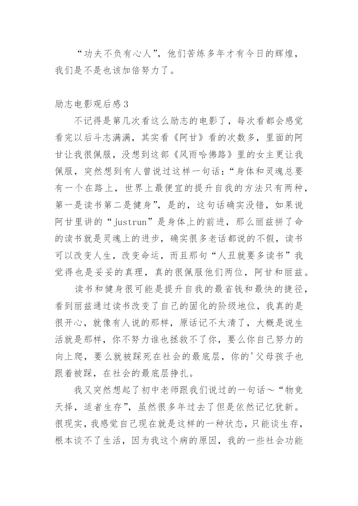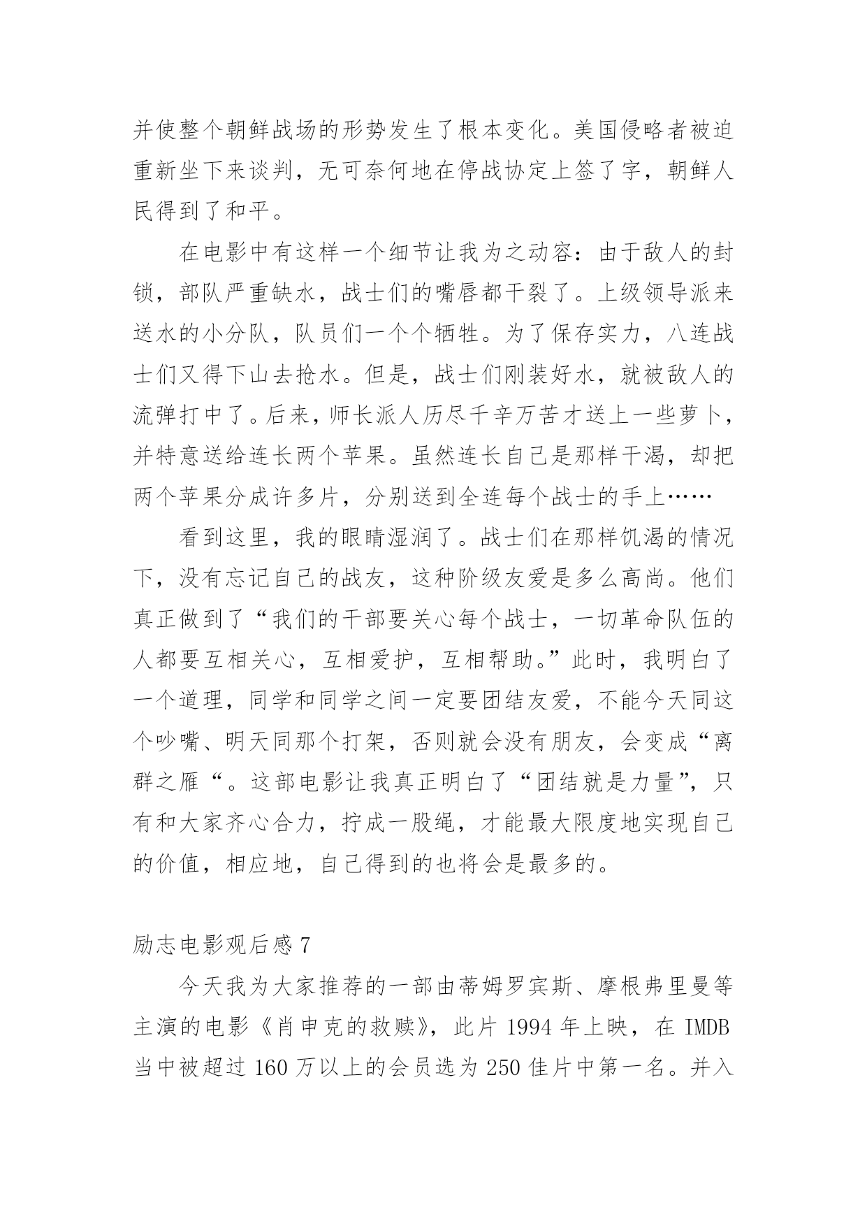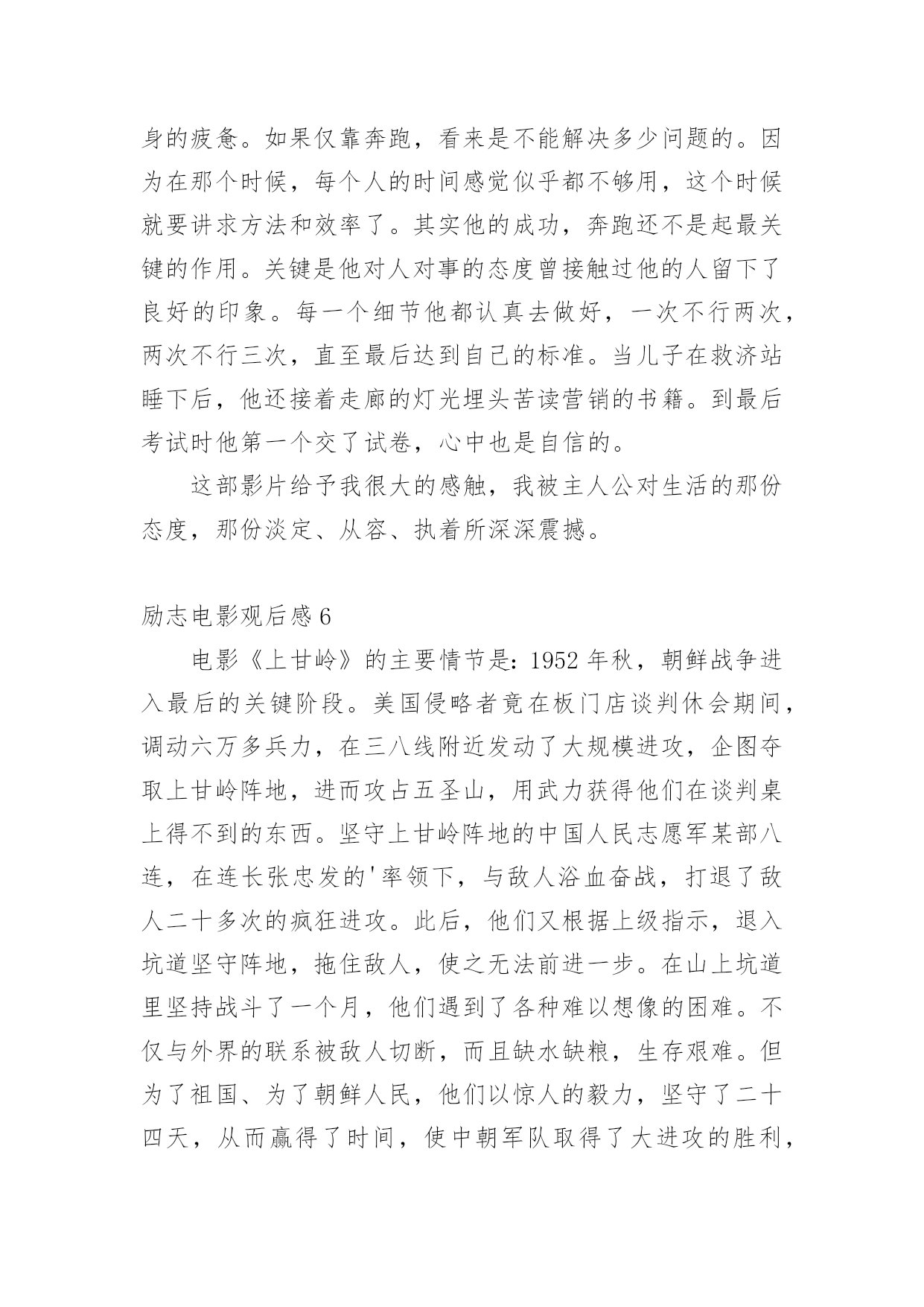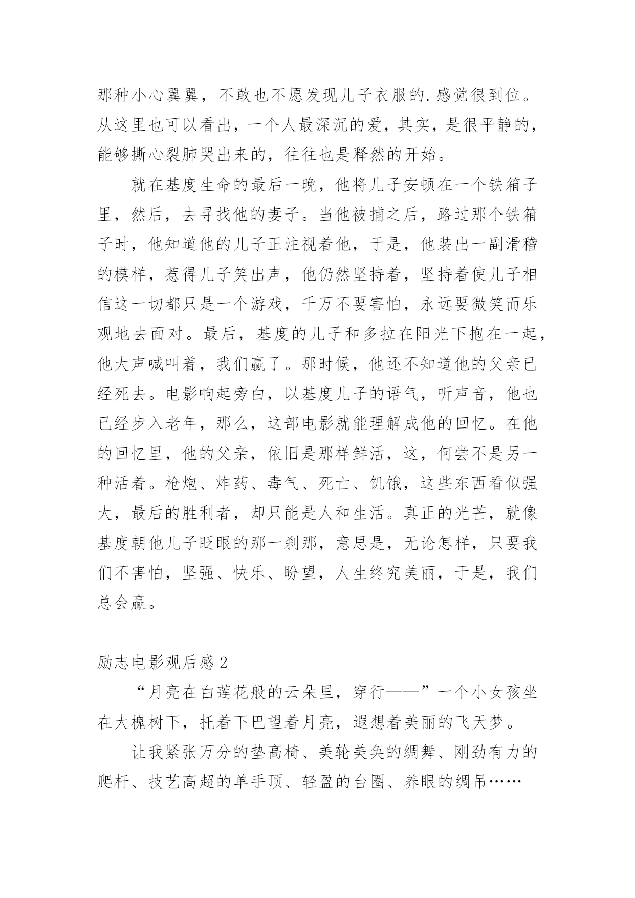 励志电影观后感励志电影观后感(精选)当认真看完一部影视作品后,从中我们收获新的思想,透过观影,我们可以发现一些深刻的感悟。可能你现在毫无头绪吧,下面是小编精心整理的励志电影观后感,供大家参考借鉴,希望可以帮助到有需要的朋友。励志电影观后感1《美丽人生》是一部相当浪漫的电影,基度与多拉终成眷属,他们从房间里追着他们的儿子来到院子里,一家三口的幸福生活令人羡慕,基度用自行车载着美丽的妻子,车框里坐着机灵的儿子,他们飞驰而过,而街道上,却已经出现了纳粹的铁丝网。没有什么比快乐的戛然而止更令人感到揪心。当基度的幸福生活刚刚开始之时,他的犹太身份使他被抓去了集中营,而他的妻子,本来并不用去集中营,却毅然的随他们跳上了火车。最真挚的爱情,有时候真不需要太多的言语,连执手相看都不需要,只是纵身一跃,跟去天涯海角。在影片当中,演多拉的演员有很好的演技,那是一种很克制的平静,当她在集中营里听到孩子将要被杀掉的消息时,她的脸上没有任何表情,只是站在楼梯上,由着后面的人群在她身上冲撞,她望向窗外,目光深远。后来,她被派去挑拣死难者的衣服,那种小心翼翼,不敢也不愿发现儿子衣服的.感觉很到位。从这里也可以看出,一个人最深沉的爱,其实,是很平静的,能够撕心裂肺哭出来的,往往也是释然的开始。就在基度生命的最后一晚,他将儿子安顿在一个铁箱子里,然后,去寻找他的妻子。当他被捕之后,路过那个铁箱子时,他知道他的儿子正注视着他,于是,他装出一副滑稽的模样,惹得儿子笑出声,他仍然坚持着,坚持着使儿子相信这一切都只是一个游戏,千万不要害怕,永远要微笑而乐观地去面对。最后,基度的儿子和多拉在阳光下抱在一起,他大声喊叫着,我们赢了。那时候,他还不知道他的父亲已经死去。电影响起旁白,以基度儿子的语气,听声音,他也已经步入老年,那么,这部电影就能理解成他的回忆。在他的回忆里,他的父亲,依旧是那样鲜活,这,何尝不是另一种活着。枪炮、炸药、毒气、死亡、饥饿,这些东西看似强大,最后的胜利者,却只能是人和生活。真正的光芒,就像基度朝他儿子眨眼的那一刹那,意思是,无论怎样,只要我们不害怕,坚强、快乐、盼望,人生终究美丽,于是,我们总会赢。励志电影观后感2“月亮在白莲花般的云朵里,穿行——”一个小女孩坐在大槐树下,托着下巴望着月亮,遐想着美丽的飞天梦。让我紧张万分的垫高椅、美轮美奂的绸舞、刚劲有力的爬杆、技艺高超的单手顶、轻盈的台圈、养眼的绸吊……在众多精彩绝伦的表演中,最让我惊艳的还是“头顶圈”。女演员站在一只铁圈里,着一袭橙红色的'纱裙,金灿灿的腰封,头顶上一束火红的狼毛头饰一向延伸到她高高的半扎马尾辫上。她好似一只活力万丈的火烈鸟,飘逸的裙摆,便是美丽的翅膀。男演员穿着蓝色的朝鲜族风情服装,头部顶着那个铁圈。女演员在圈里做着各种各样的高难度动作,她双手抓住铁环,两腿笔直,呈180,头向后仰,腰部出现了优美的曲线,像一只高贵的天鹅,在空中舞蹈。忽地,她又单屈膝盖,单手握圈,另一只手抓住左脚。圈下的男演员,此时已经双手松开,单靠头顶着铁圈。天啊,这么危险!在这美艳的艺术舞蹈背后,必须有无数的辛酸、无数的泪。突然,女演员旋转到了铁圈的顶部,她的后背扣住铁环,双手松开,这时铁环也开始转动,越转越快。她不怕掉下来吗?被转了那么多圈,她不晕吗?台下的掌声热烈,一阵盖过一阵,此起彼伏,没有间断。“台上一分钟,台下十年功”,可在我看来,这样的动作,如果没有惊人的决心和毅力,要想练成,何止十年?我看到了观众们捂着脸,张大了嘴,惊讶的神情;我听到了对两位演员的技艺,以及联想到的他们平时的刻苦不绝于耳的赞扬。我为他们不畏困难的精神所感动。想到自我,一星期三小时的练功,就叫苦连天,在地上练横叉都觉得很痛,而她们却能在空中沉着坦然地舞动着,体态轻盈如鸟雀。“功夫不负有心人”,他们苦练多年才有今日的辉煌,我们是不是也该加倍努力了。励志电影观后感3不记得是第几次看这么励志的电影了,每次看都会感觉看完以后斗志满满,其实看《阿甘》看的次数多,里面的阿甘让我很佩服,没想到这部《风雨哈佛路》里的女主更让我佩服,突然想到有人曾说过这样一句话:“身体和灵魂总要有一个在路上,世界上最便宜的提升自我的方法只有两种,第一是读书第二是健身”,是的,这句话确实没错,如果说阿甘里讲的“justrun”是身体上的前进,那么丽兹拼了命的读书就是灵魂上的进步,确实很多老话都说的不假,读书可以改变人生,改变命运,而且那句“人丑就要多读书”我觉得也是妥妥的真理,真的很佩服他们两位,阿甘和丽兹。读书和健身很可能是提升自我的最省钱和最快的捷径,看到丽兹通过读书改变了自己的固化的阶级地位,我真的是很开心,就像有人说的那样,原话记不太清了,大概是说生活就是那样,你不努力谁也拯救不了你,要么你自己努力的向上爬,要么就被踩死在社会的最底层,你的'父母孩