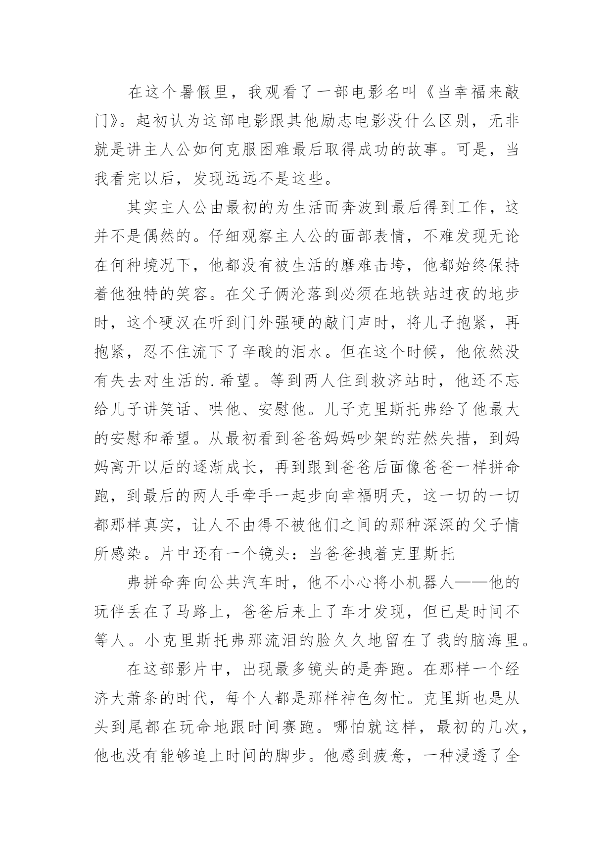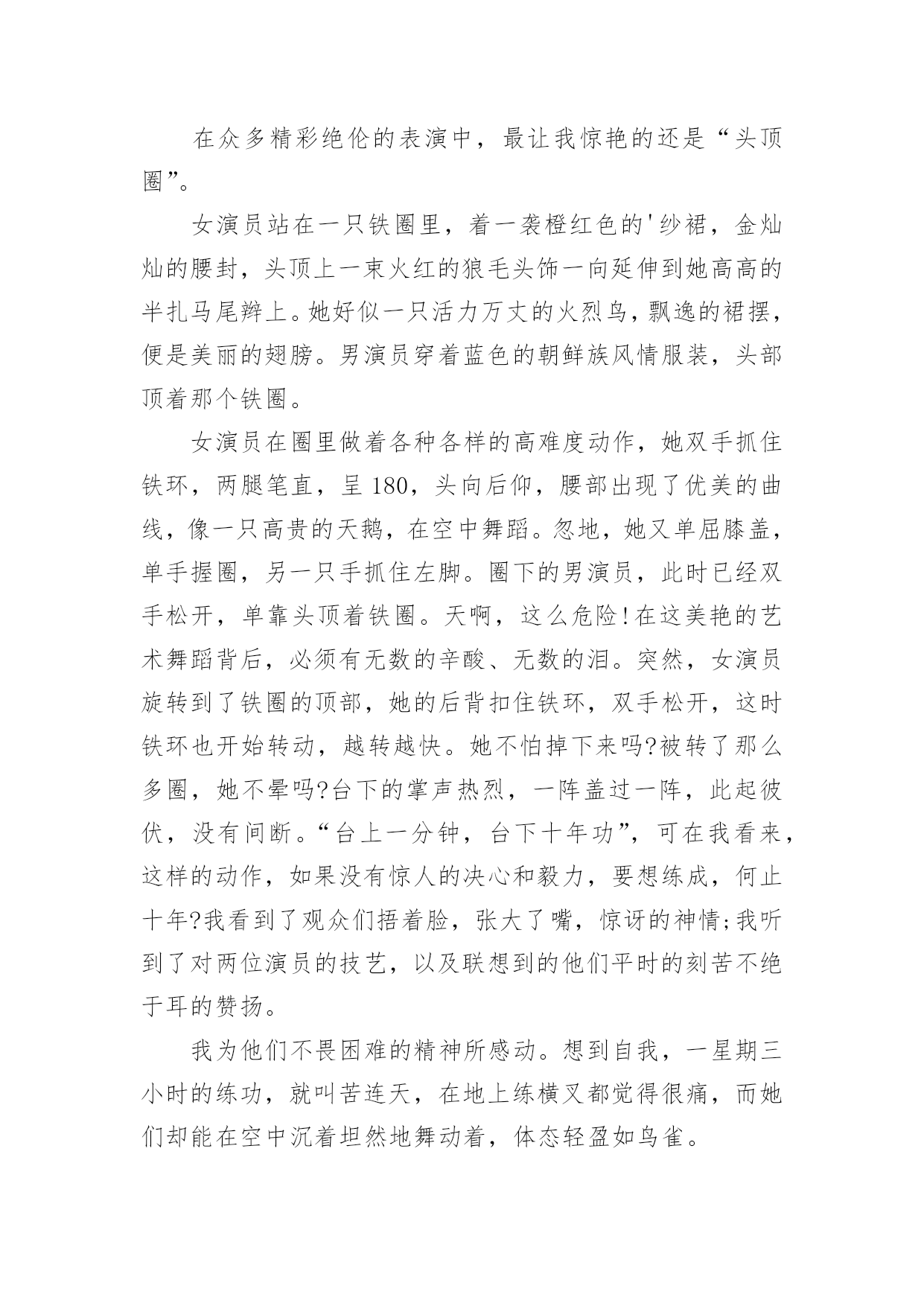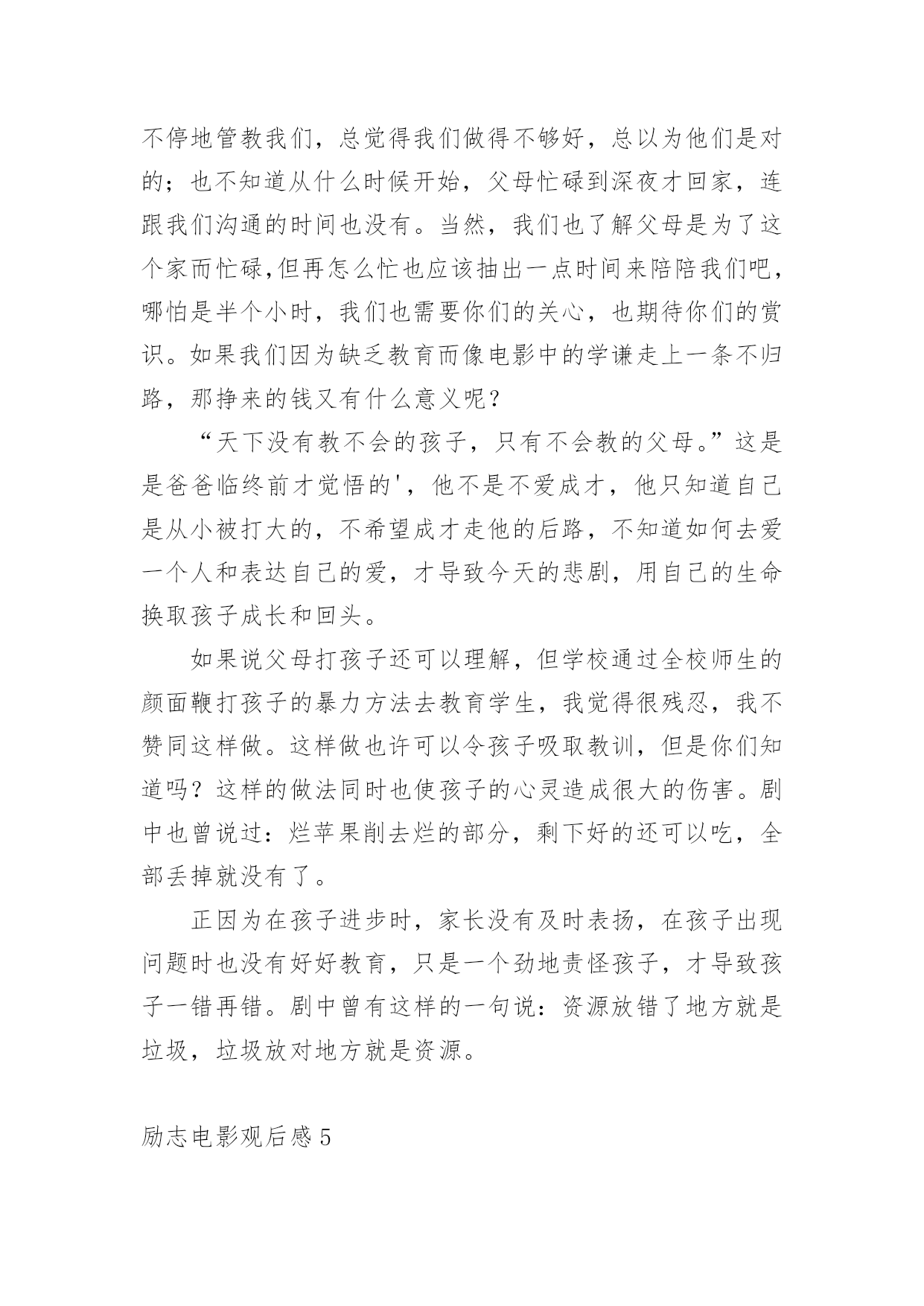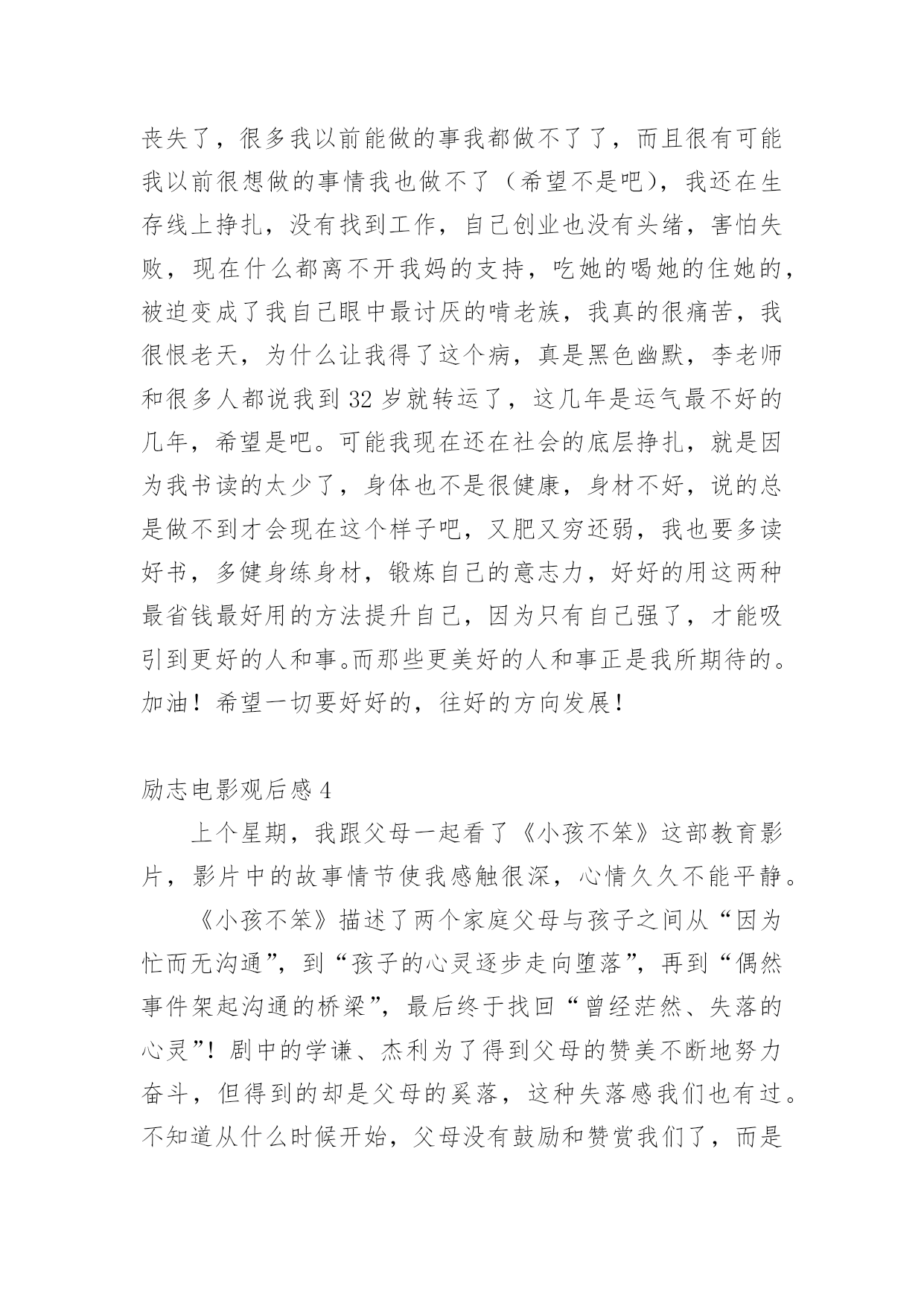 励志电影观后感励志电影观后感(精选)当认真看完一部影视作品后,从中我们收获新的思想,透过观影,我们可以发现一些深刻的感悟。可能你现在毫无头绪吧,下面是小编精心整理的励志电影观后感,供大家参考借鉴,希望可以帮助到有需要的朋友。励志电影观后感1《美丽人生》是一部相当浪漫的电影,基度与多拉终成眷属,他们从房间里追着他们的儿子来到院子里,一家三口的幸福生活令人羡慕,基度用自行车载着美丽的妻子,车框里坐着机灵的儿子,他们飞驰而过,而街道上,却已经出现了纳粹的铁丝网。没有什么比快乐的戛然而止更令人感到揪心。当基度的幸福生活刚刚开始之时,他的犹太身份使他被抓去了集中营,而他的妻子,本来并不用去集中营,却毅然的随他们跳上了火车。最真挚的爱情,有时候真不需要太多的言语,连执手相看都不需要,只是纵身一跃,跟去天涯海角。在影片当中,演多拉的演员有很好的演技,那是一种很克制的平静,当她在集中营里听到孩子将要被杀掉的消息时,她的脸上没有任何表情,只是站在楼梯上,由着后面的人群在她身上冲撞,她望向窗外,目光深远。后来,她被派去挑拣死难者的衣服,那种小心翼翼,不敢也不愿发现儿子衣服的.感觉很到位。从这里也可以看出,一个人最深沉的爱,其实,是很平静的,能够撕心裂肺哭出来的,往往也是释然的开始。就在基度生命的最后一晚,他将儿子安顿在一个铁箱子里,然后,去寻找他的妻子。当他被捕之后,路过那个铁箱子时,他知道他的儿子正注视着他,于是,他装出一副滑稽的模样,惹得儿子笑出声,他仍然坚持着,坚持着使儿子相信这一切都只是一个游戏,千万不要害怕,永远要微笑而乐观地去面对。最后,基度的儿子和多拉在阳光下抱在一起,他大声喊叫着,我们赢了。那时候,他还不知道他的父亲已经死去。电影响起旁白,以基度儿子的语气,听声音,他也已经步入老年,那么,这部电影就能理解成他的回忆。在他的回忆里,他的父亲,依旧是那样鲜活,这,何尝不是另一种活着。枪炮、炸药、毒气、死亡、饥饿,这些东西看似强大,最后的胜利者,却只能是人和生活。真正的光芒,就像基度朝他儿子眨眼的那一刹那,意思是,无论怎样,只要我们不害怕,坚强、快乐、盼望,人生终究美丽,于是,我们总会赢。励志电影观后感2“月亮在白莲花般的云朵里,穿行——”一个小女孩坐在大槐树下,托着下巴望着月亮,遐想着美丽的飞天梦。让我紧张万分的垫高椅、美轮美奂的绸舞、刚劲有力的爬杆、技艺高超的单手顶、轻盈的台圈、养眼的绸吊……在众多精彩绝伦的表演中,最让我惊艳的还是“头顶圈”。女演员站在一只铁圈里,着一袭橙红色的'纱裙,金灿灿的腰封,头顶上一束火红的狼毛头饰一向延伸到她高高的半扎马尾辫上。她好似一只活力万丈的火烈鸟,飘逸的裙摆,便是美丽的翅膀。男演员穿着蓝色的朝鲜族风情服装,头部顶着那个铁圈。女演员在圈里做着各种各样的高难度动作,她双手抓住铁环,两腿笔直,呈180,头向后仰,腰部出现了优美的曲线,像一只高贵的天鹅,在空中舞蹈。忽地,她又单屈膝盖,单手握圈,另一只手抓住左脚。圈下的男演员,此时已经双手松开,单靠头顶着铁圈。天啊,这么危险!在这美艳的艺术舞蹈背后,必须有无数的辛酸、无数的泪。突然,女演员旋转到了铁圈的顶部,她的后背扣住铁环,双手松开,这时铁环也开始转动,越转越快。她不怕掉下来吗?被转了那么多圈,她不晕吗?台下的掌声热烈,一阵盖过一阵,此起彼伏,没有间断。“台上一分钟,台下十年功”,可在我看来,这样的动作,如果没有惊人的决心和毅力,要想练成,何止十年?我看到了观众们捂着脸,张大了嘴,惊讶的神情;我听到了对两位演员的技艺,以及联想到的他们平时的刻苦不绝于耳的赞扬。我为他们不畏困难的精神所感动。想到自我,一星期三小时的练功,就叫苦连天,在地上练横叉都觉得很痛,而她们却能在空中沉着坦然地舞动着,体态轻盈如鸟雀。“功夫不负有心人”,他们苦练多年才有今日的辉煌,我们是不是也该加倍努力了。励志电影观后感3不记得是第几次看这么励志的电影了,每次看都会感觉看完以后斗志满满,其实看《阿甘》看的次数多,里面的阿甘让我很佩服,没想到这部《风雨哈佛路》里的女主更让我佩服,突然想到有人曾说过这样一句话:“身体和灵魂总要有一个在路上,世界上最便宜的提升自我的方法只有两种,第一是读书第二是健身”,是的,这句话确实没错,如果说阿甘里讲的“justrun”是身体上的前进,那么丽兹拼了命的读书就是灵魂上的进步,确实很多老话都说的不假,读书可以改变人生,改变命运,而且那句“人丑就要多读书”我觉得也是妥妥的真理,真的很佩服他们两位,阿甘和丽兹。读书和健身很可能是提升自我的最省钱和最快的捷径,看到丽兹通过读书改变了自己的固化的阶级地位,我真的是很开心,就像有人说的那样,原话记不太清了,大概是说生活就是那样,你不努力谁也拯救不了你,要么你自己努力的向上爬,要么就被踩死在社会的最底层,你的'父母孩