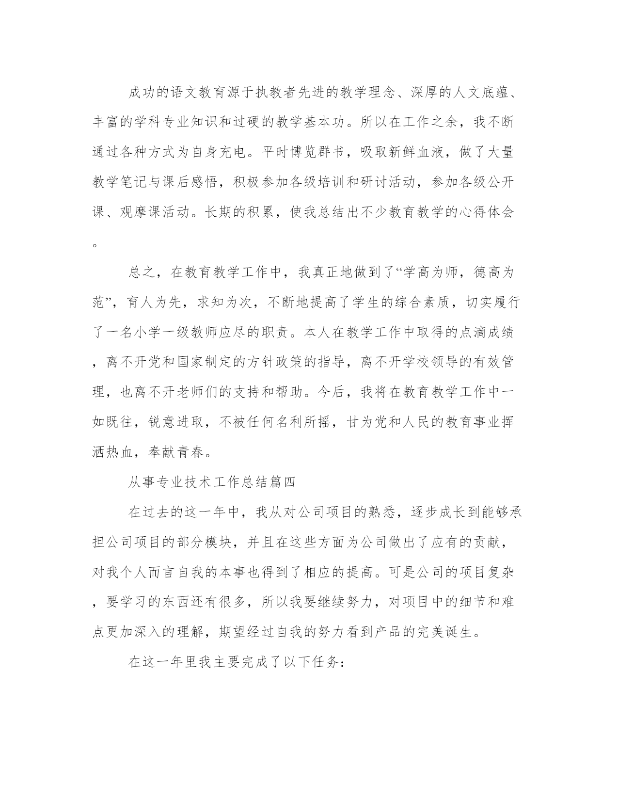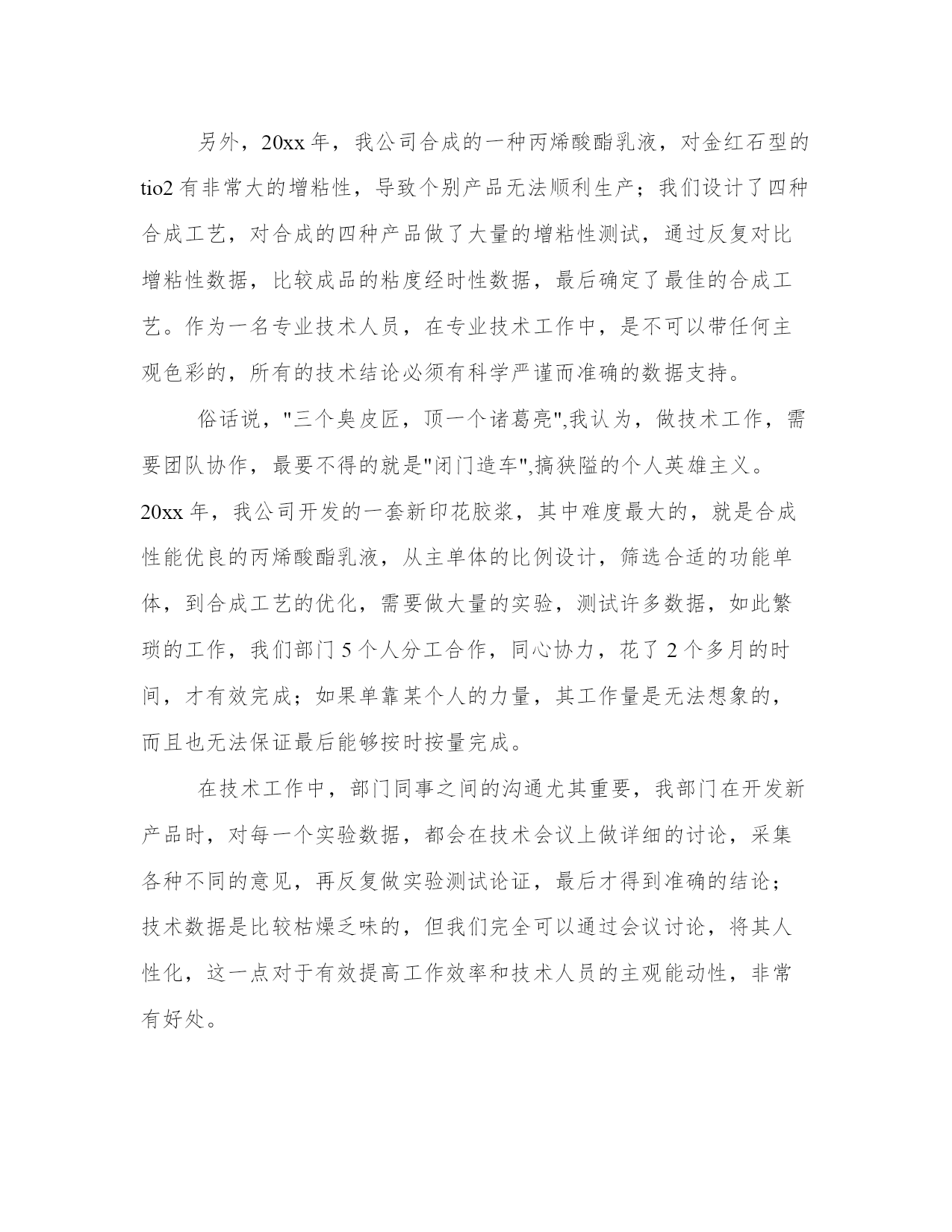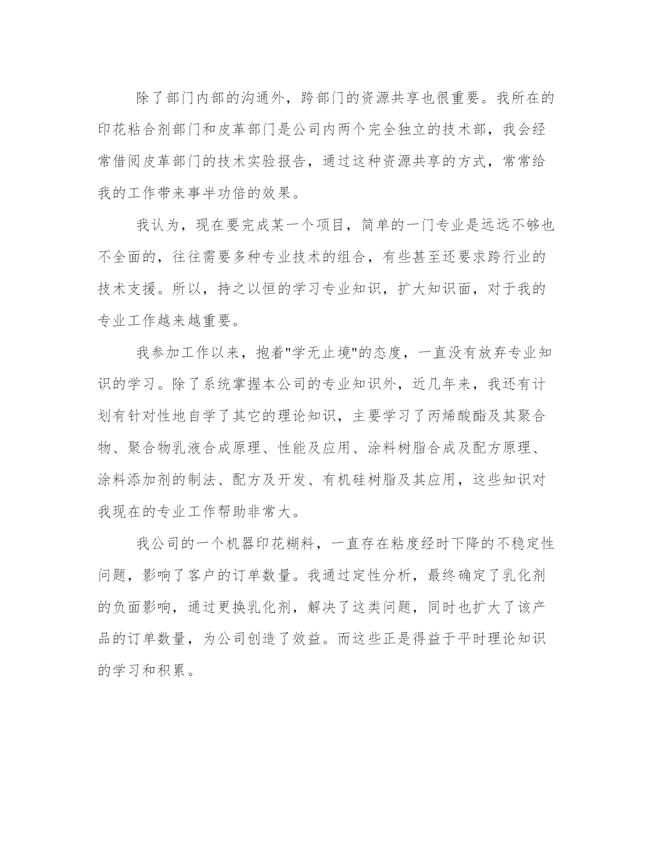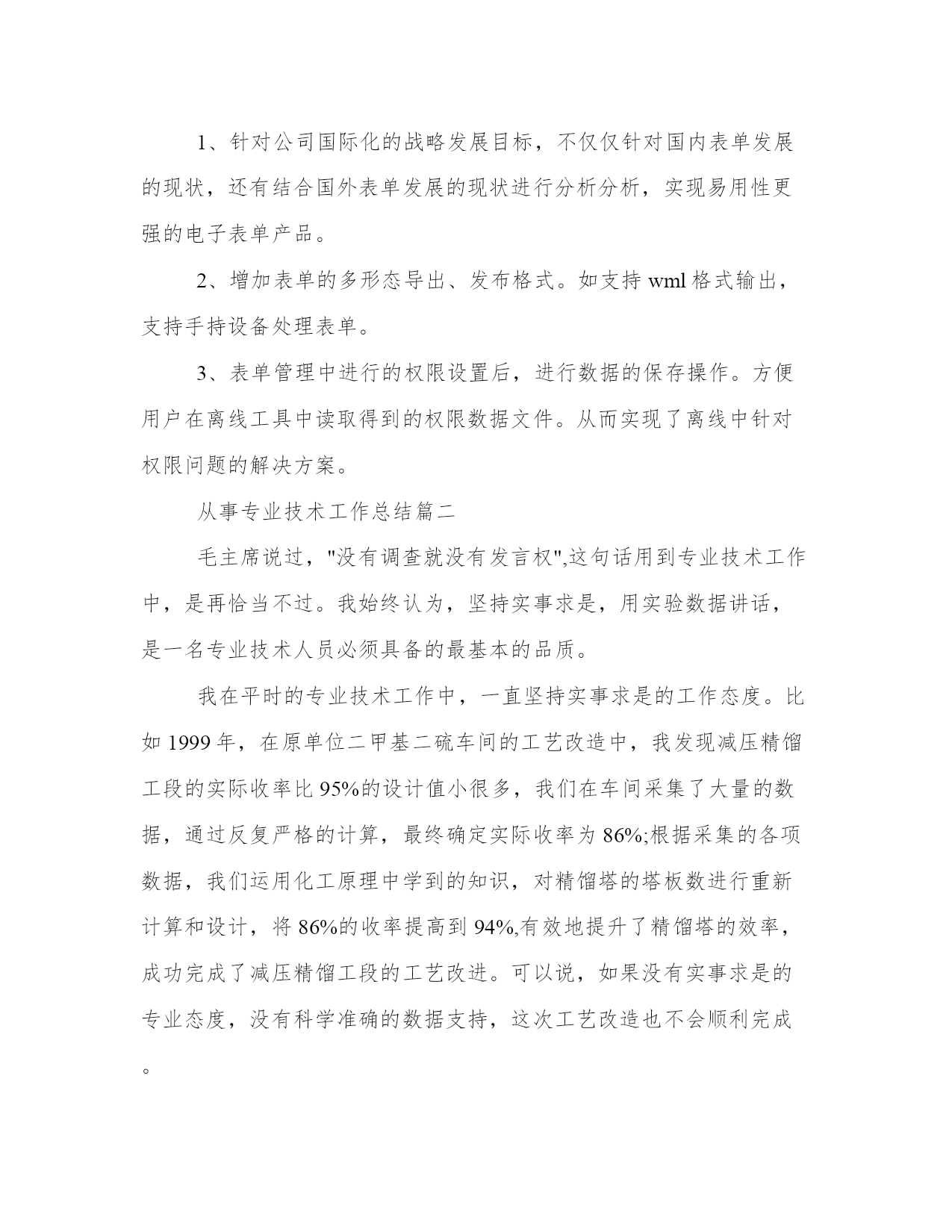 2024年从事专业技术工作总结(大全8篇)总结是对过去的反思,是对现实的负责,是对未来的负责。写一篇完美的总结要注重语法的正确性和词汇的丰富性。在这里,我们为大家提供了一些优秀总结的实例,可以供大家参考。从事专业技术工作总结篇一1、同类电子表单产品的分析工作,并最终构成各种产品的评估报告。2、基于hta离线填写工具的设计、开发与实现工作。3、美的项目中表单部分设计文档的编写与修改的工作。4、新版本用户手册及特性表的编写工作。二、自身学习方面。在工作过程中,我深深感到加强自身学习、提高自身素质的紧迫性。一是向书本学习,坚持每一天挤出必须的时间不断充实自我,改善学习方法,广泛汲取各种;营养。二是向周围的同事学习,虚心求教的态度,主动同事们请教;三是向实践学习,把所学的知识运用于实际工作中,在实践中检验所学知识,查找不足,提高自我。三、产品发展提议方面。1、针对公司国际化的战略发展目标,不仅仅针对国内表单发展的现状,还有结合国外表单发展的现状进行分析分析,实现易用性更强的电子表单产品。2、增加表单的多形态导出、发布格式。如支持wml格式输出,支持手持设备处理表单。3、表单管理中进行的权限设置后,进行数据的保存操作。方便用户在离线工具中读取得到的权限数据文件。从而实现了离线中针对权限问题的解决方案。从事专业技术工作总结篇二毛主席说过,"没有调查就没有发言权",这句话用到专业技术工作中,是再恰当不过。我始终认为,坚持实事求是,用实验数据讲话,是一名专业技术人员必须具备的最基本的品质。我在平时的专业技术工作中,一直坚持实事求是的工作态度。比如1999年,在原单位二甲基二硫车间的工艺改造中,我发现减压精馏工段的实际收率比95%的设计值小很多,我们在车间采集了大量的数据,通过反复严格的计算,最终确定实际收率为86%;根据采集的各项数据,我们运用化工原理中学到的知识,对精馏塔的塔板数进行重新计算和设计,将86%的收率提高到94%,有效地提升了精馏塔的效率,成功完成了减压精馏工段的工艺改进。可以说,如果没有实事求是的专业态度,没有科学准确的数据支持,这次工艺改造也不会顺利完成。另外,20xx年,我公司合成的一种丙烯酸酯乳液,对金红石型的tio2有非常大的增粘性,导致个别产品无法顺利生产;我们设计了四种合成工艺,对合成的四种产品做了大量的增粘性测试,通过反复对比增粘性数据,比较成品的粘度经时性数据,最后确定了最佳的合成工艺。作为一名专业技术人员,在专业技术工作中,是不可以带任何主观色彩的,所有的技术结论必须有科学严谨而准确的数据支持。俗话说,"三个臭皮匠,顶一个诸葛亮",我认为,做技术工作,需要团队协作,最要不得的就是"闭门造车",搞狭隘的个人英雄主义。20xx年,我公司开发的一套新印花胶浆,其中难度最大的,就是合成性能优良的丙烯酸酯乳液,从主单体的比例设计,筛选合适的功能单体,到合成工艺的优化,需要做大量的实验,测试许多数据,如此繁琐的工作,我们部门5个人分工合作,同心协力,花了2个多月的时间,才有效完成;如果单靠某个人的力量,其工作量是无法想象的,而且也无法保证最后能够按时按量完成。在技术工作中,部门同事之间的沟通尤其重要,我部门在开发新产品时,对每一个实验数据,都会在技术会议上做详细的讨论,采集各种不同的意见,再反复做实验测试论证,最后才得到准确的结论;技术数据是比较枯燥乏味的,但我们完全可以通过会议讨论,将其人性化,这一点对于有效提高工作效率和技术人员的主观能动性,非常有好处。除了部门内部的沟通外,跨部门的资源共享也很重要。我所在的印花粘合剂部门和皮革部门是公司内两个完全独立的技术部,我会经常借阅皮革部门的技术实验报告,通过这种资源共享的方式,常常给我的工作带来事半功倍的效果。我认为,现在要完成某一个项目,简单的一门专业是远远不够也不全面的,往往需要多种专业技术的组合,有些甚至还要求跨行业的技术支援。所以,持之以恒的学习专业知识,扩大知识面,对于我的专业工作越来越重要。我参加工作以来,抱着"学无止境"的态度,一直没有放弃专业知识的学习。除了系统掌握本公司的专业知识外,近几年来,我还有计划有针对性地自学了其它的理论知识,主要学习了丙烯酸酯及其聚合物、聚合物乳液合成原理、性能及应用、涂料树脂合成及配方原理、涂料添加剂的制法、配方及开发、有机硅树脂及其应用,这些知识对我现在的专业工作帮助非常大。我公司的一个机器印花糊料,一直存在粘度经时下降的不稳定性问题,影响了客户的订单数量。我通过定性分析,最终确定了乳化剂的负面影响,通过更换乳化剂,解决了这类问题,同时也扩大了该产品的订单数量,为公司创造了效益。而这些正是得益于平时理论知识的学习和积累。"活到老,学到老",我认为,只有通过不断学习和积累各种相