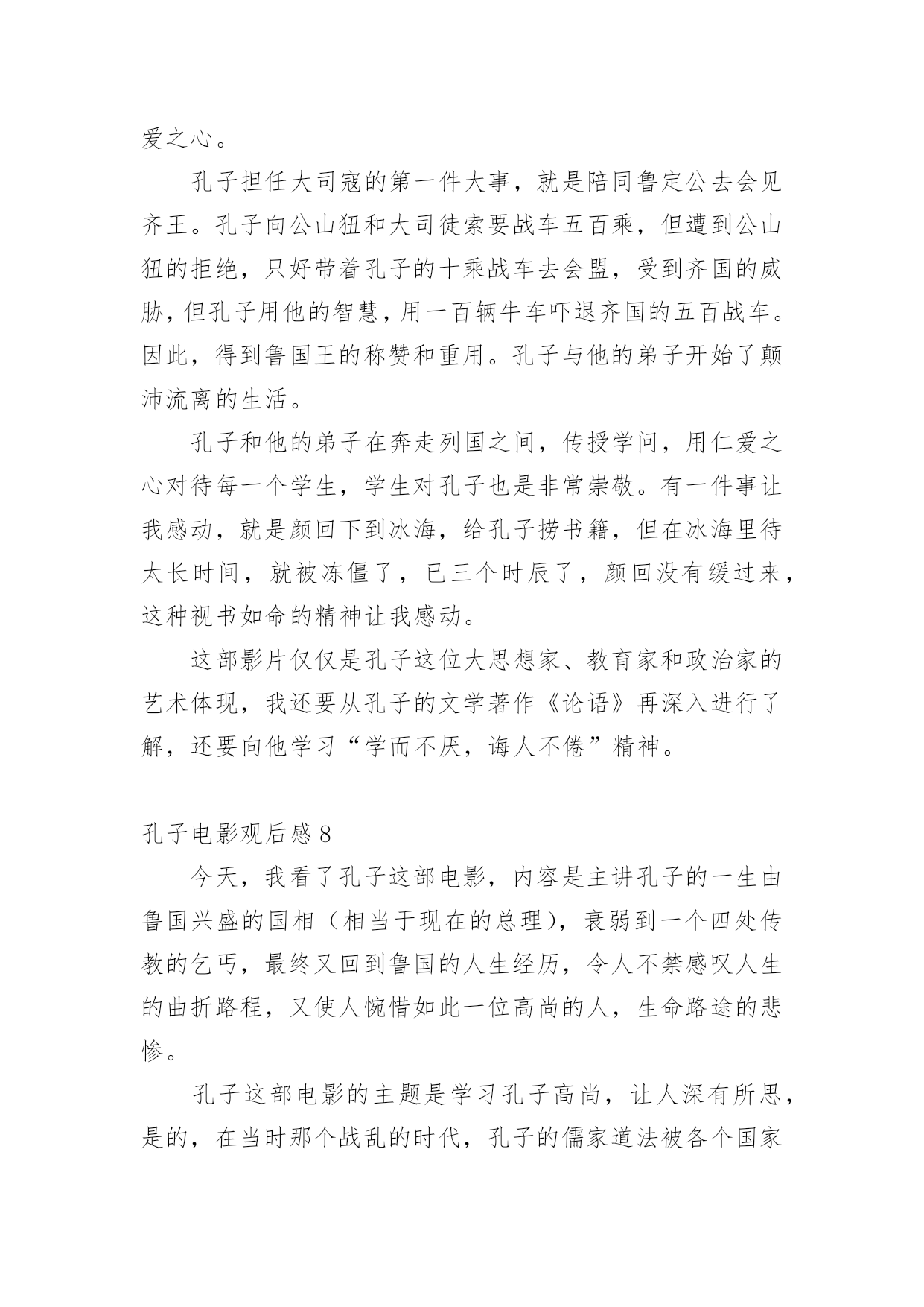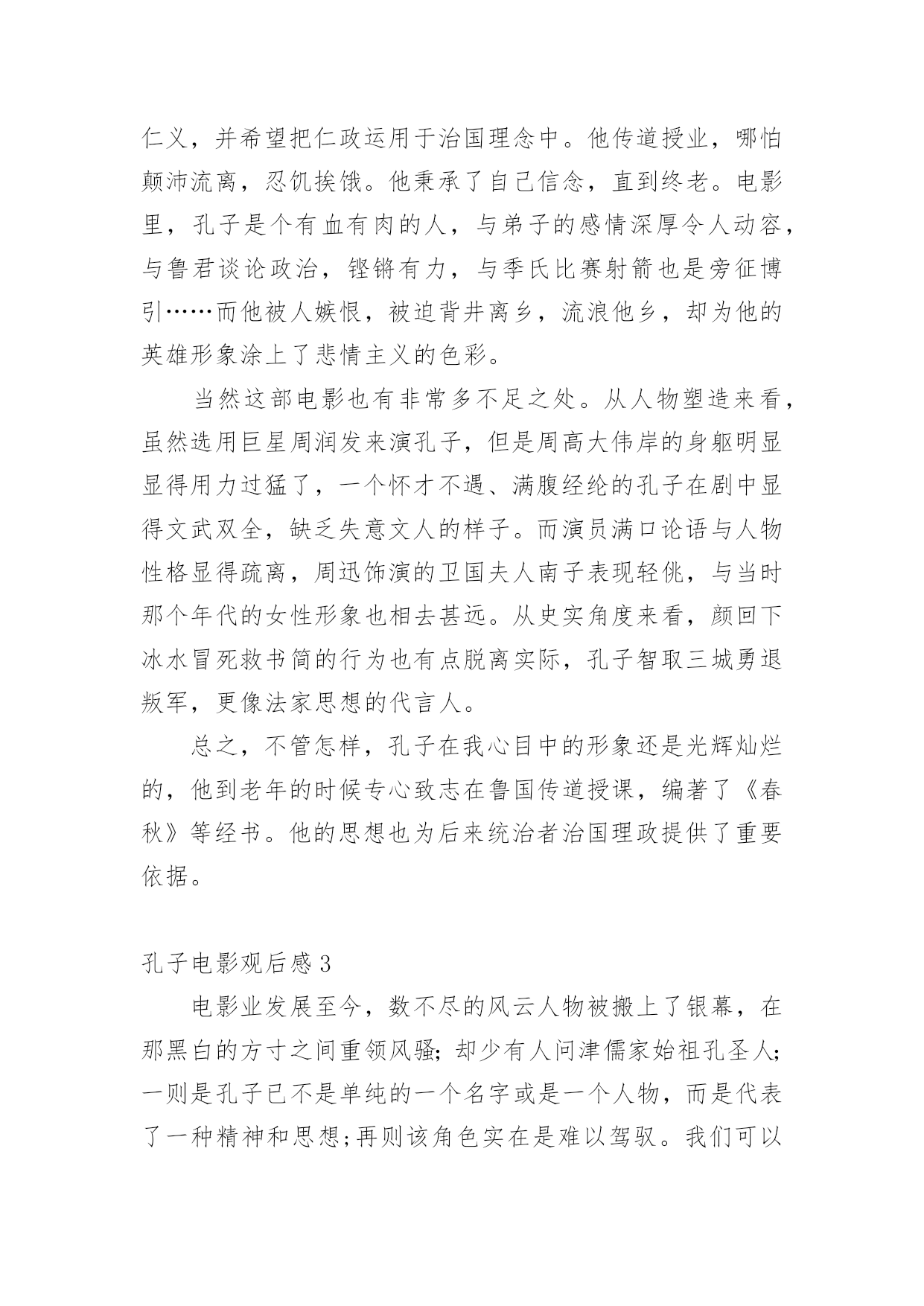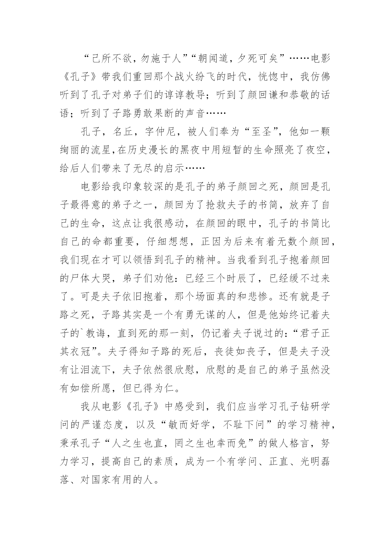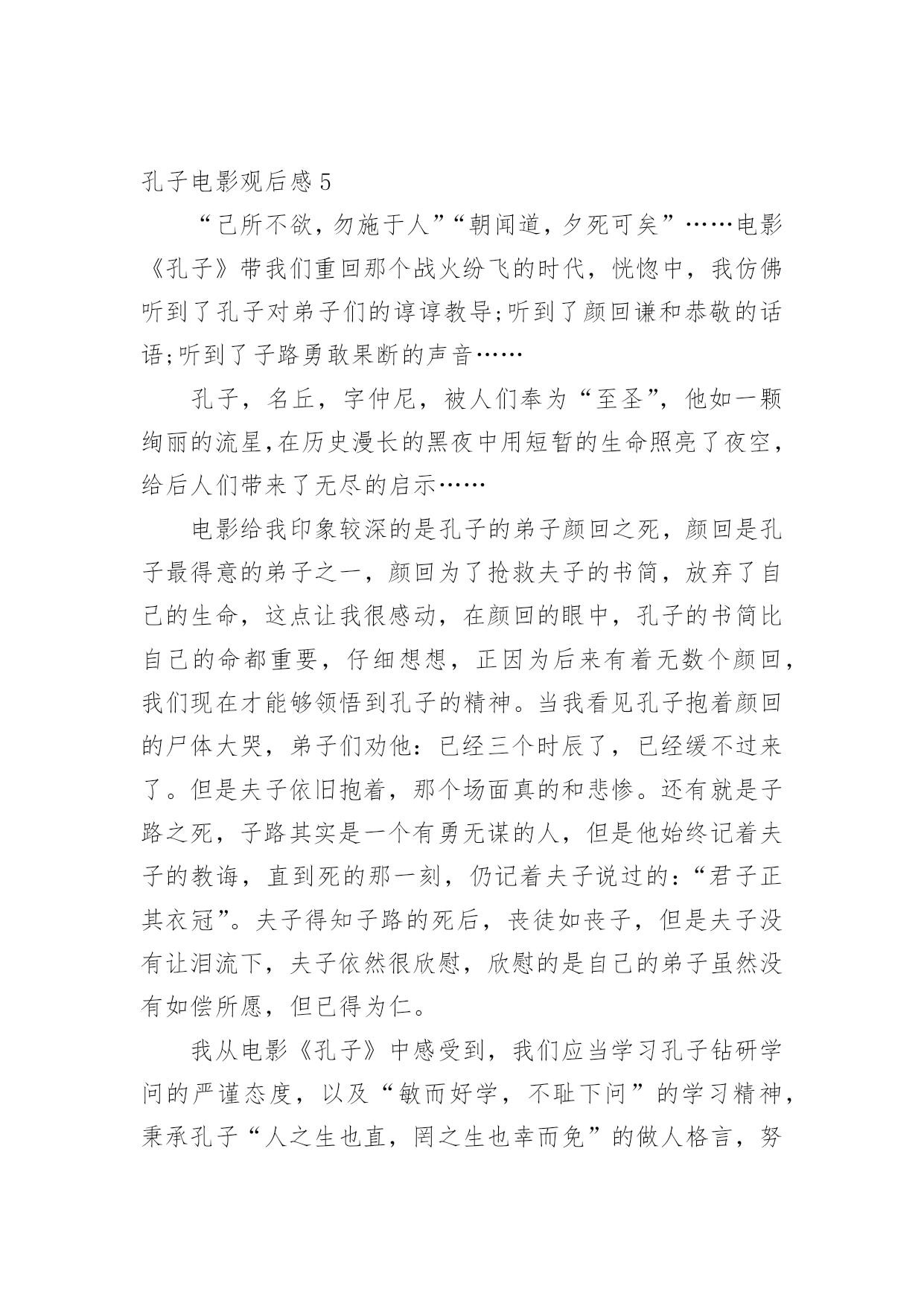 孔子电影观后感当品味完一部影视作品后,从中我们收获新的思想,是时候抽出时间写写观后感了。在写观后感之前,可以先参考范文,下面是小编为大家收集的孔子电影观后感,仅供参考,欢迎大家阅读。孔子电影观后感1上星期三,我们看了一部弘扬爱国主义的电影,这部电影的名字叫做:《孔子》。大家都知道,孔子是我国伟大的圣人,他在鲁国时,因为反抗奴隶制度,救下了一名需要当陪葬的小奴,并引起了当时大司马的强烈不满。于是,大司马为此耿耿于怀,想方设法地想将孔子赶出鲁国。最终因为大司马的阴谋,我们的圣人就这样被赶出了自己的家乡。看到这里,我为孔子那凄惨的命运捏了一把汗。在周游列国的途中,追随孔圣人的人越来越多,孔圣人也在周游的途中写下了许多书,将它们传授给了自己的弟子。孔子的这些著作宣扬了"仁义"的理念,得到了很多人的赞赏,因此声名大振。有一次,孔子和他的弟子们要走过结冰的湖面,可是因为冰层碎裂,孔子的书全部陷入冰层。这时,孔子的得意门生颜回为了救老师的书,深入冰层,不幸冻亡。仁爱的孔子将他搂在怀里,足足四个多时辰都没有放手。看到这里,我很感动,因为从这里,我看到了孔子爱生如子的高尚的品德风尚。孔子这部电影让我受益匪浅,它让我了解到了孔子的生平,孔子的思想和精神。孔夫子一生在书中度过,百读不厌,他所教的学生桃李满天下,他的品行是在中国古代史上绝无仅有的!也是中国古代史上不可或缺的人才!我们的老师也正像孔子一样默默奉献,将他们的毕生所学传授给我们,让我们学习新鲜的知识。孔子是一个思想家、教育家,他的很多事迹和理论至今都还在流传,比如说"温故而知新"、"言必信,行必果"这样一些经典的儒家学说一直都是我们值得学习的。我们要感谢向孔子一样的老师,我们要学习孔子的儒家经典。孔子电影观后感2孔子是中国著名的大思想家、大教育家。孔子开创了私人讲学的风气,是儒家学派的创始人。在看电影之前,我对孔子的印象就停留在这样的认识上,直到看了《孔子》这部电影。从电影的结构来看,这部电影就是一部人物的传记。传记非常容易流于平庸,因为对人物一生的描写如果平铺直叙就无法突出亮点。而这部电影通过几个吸引人的小故事来展开叙述:比如说服别人救下小奴一命。也通过一些炫丽的战争场面特技和一些令人涕泗交流的感人场面来抓住观众的心。这样的安排无疑使电影增加了跌宕起伏的力量,使人物的形象饱满丰富。从电影的内容来看,孔子的一生无疑是伟大的。他追求仁义,并希望把仁政运用于治国理念中。他传道授业,哪怕颠沛流离,忍饥挨饿。他秉承了自己信念,直到终老。电影里,孔子是个有血有肉的人,与弟子的感情深厚令人动容,与鲁君谈论政治,铿锵有力,与季氏比赛射箭也是旁征博引……而他被人嫉恨,被迫背井离乡,流浪他乡,却为他的英雄形象涂上了悲情主义的色彩。当然这部电影也有非常多不足之处。从人物塑造来看,虽然选用巨星周润发来演孔子,但是周高大伟岸的身躯明显显得用力过猛了,一个怀才不遇、满腹经纶的孔子在剧中显得文武双全,缺乏失意文人的样子。而演员满口论语与人物性格显得疏离,周迅饰演的卫国夫人南子表现轻佻,与当时那个年代的女性形象也相去甚远。从史实角度来看,颜回下冰水冒死救书简的行为也有点脱离实际,孔子智取三城勇退叛军,更像法家思想的代言人。总之,不管怎样,孔子在我心目中的形象还是光辉灿烂的,他到老年的时候专心致志在鲁国传道授课,编著了《春秋》等经书。他的思想也为后来统治者治国理政提供了重要依据。孔子电影观后感3电影业发展至今,数不尽的风云人物被搬上了银幕,在那黑白的方寸之间重领风骚;却少有人问津儒家始祖孔圣人;一则是孔子已不是单纯的一个名字或是一个人物,而是代表了一种精神和思想;再则该角色实在是难以驾驭。我们可以天马行空的去想象神怪仙魔。可以凭着照片和文字去模仿伟人的风范;可对于这位孕育出了现今华夏数千年文化于思想的孔圣人这一角色;令多少影视人望而却步。不得不承认周润发的精湛演技,不愧是在演艺界的顶尖大师,他将孔子对世间生灵的珍惜,对家人的慈爱,对知识的求索。均展现的淋漓尽致,特别是孔子的强大智慧生出了对人世苍生的悲悯之心令人刻骨铭心,那眼神中所透出的忧伤与智慧之光,让人过目难忘。遗憾的是,《孔子》也存在着些许瑕疵。比如在前期宣传时力捧的南子与孔子的感情戏份反倒是枯燥乏味,饰演孔子的发哥和饰演南子的周迅只有一场对手戏,且台词只有寥寥几句。南子乃孔子红颜知己一说根本就站不住脚,整个剧情发展下来,南子一角完全成了“鸡肋角色”可有可无。还有片中出现了像连环弩这样的大汉朝以后才有的“高科技”武器却在春秋战国时期出现了,多少让人有点接受不了,好看是好看了,可还是注意点尊重历史吧。不过该片的可圈可点之处也颇多,时不时的插进一些典故如“朽木不可雕也”、“苛政猛于虎”,颇有教化人心的意思。《孔子》从总体上来看还是不错的,也得到了孔圣人后人的认可。当