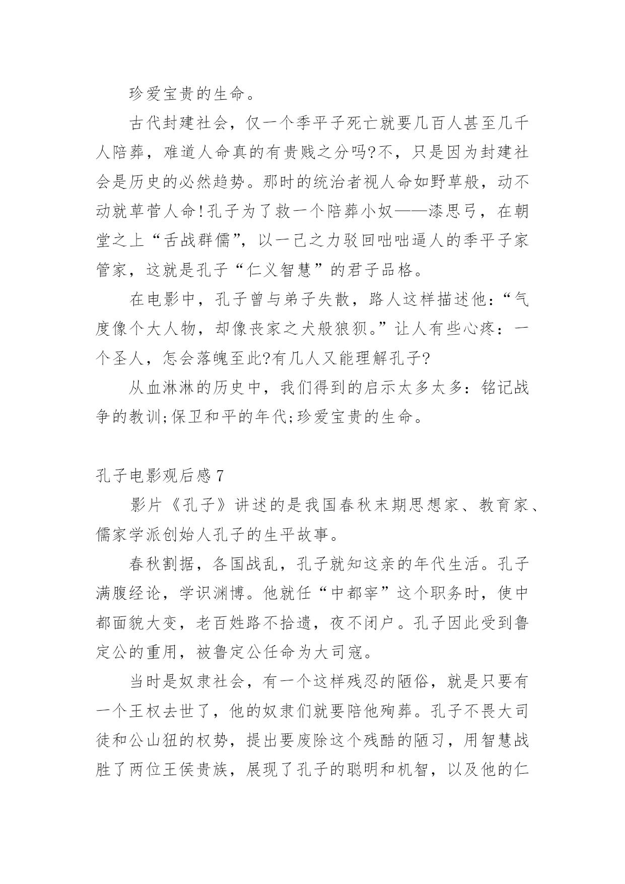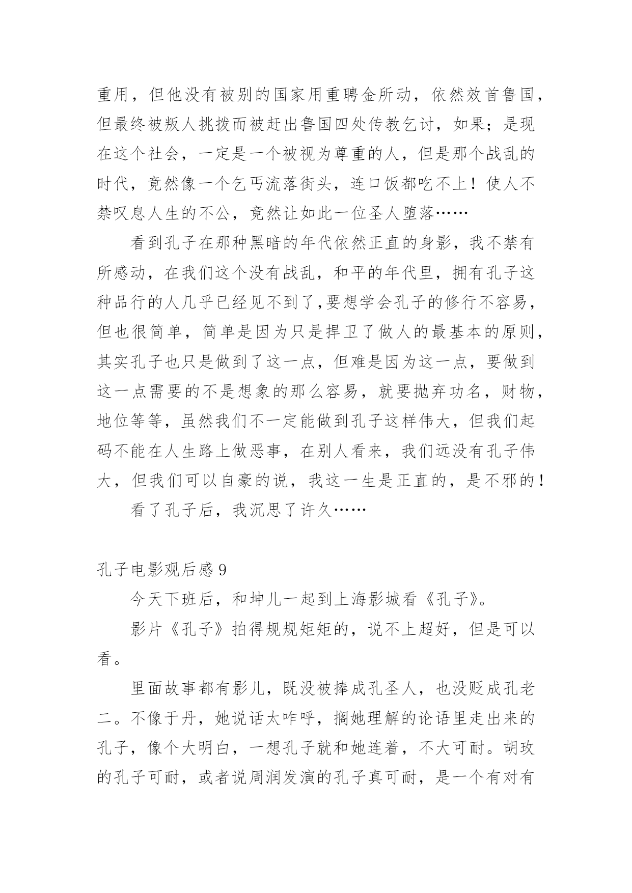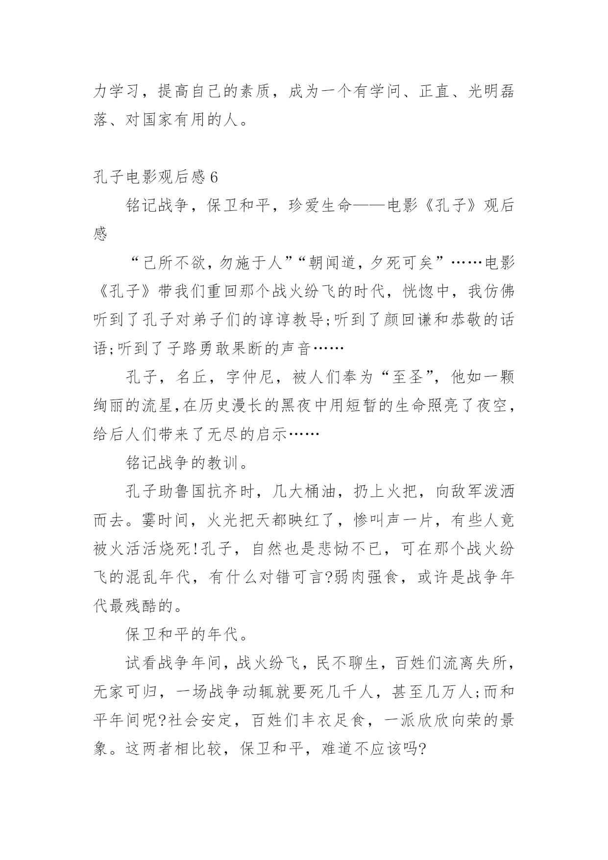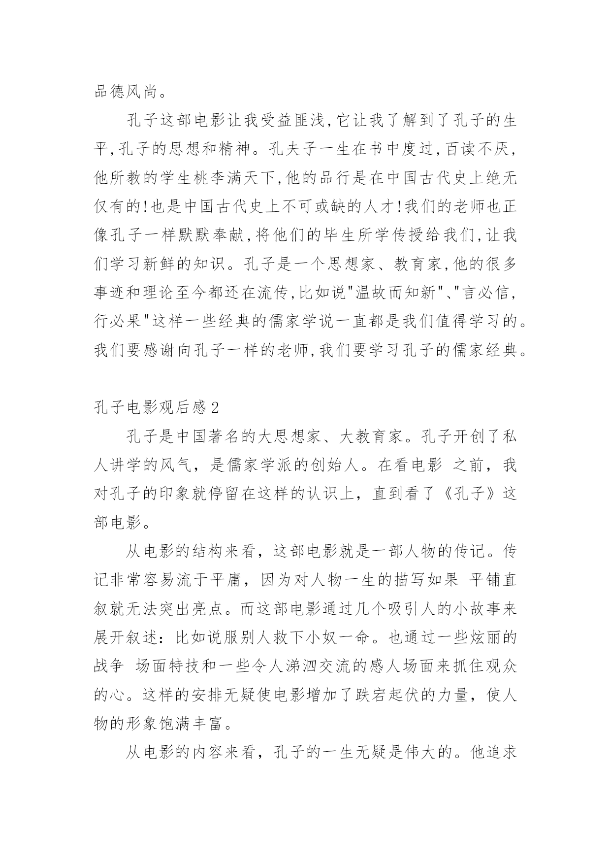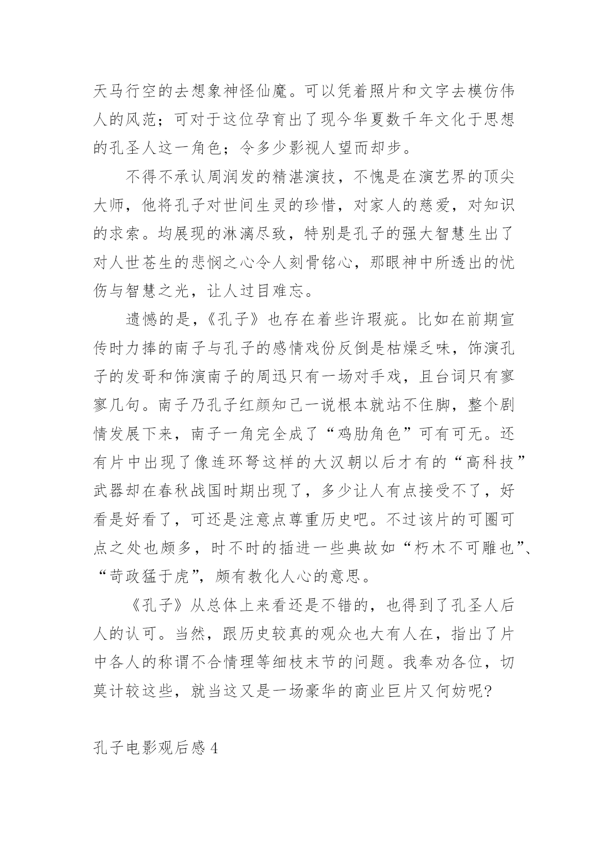 孔子电影观后感当品味完一部影视作品后,从中我们收获新的思想,是时候抽出时间写写观后感了。在写观后感之前,可以先参考范文,下面是小编为大家收集的孔子电影观后感,仅供参考,欢迎大家阅读。孔子电影观后感1上星期三,我们看了一部弘扬爱国主义的电影,这部电影的名字叫做:《孔子》。大家都知道,孔子是我国伟大的圣人,他在鲁国时,因为反抗奴隶制度,救下了一名需要当陪葬的小奴,并引起了当时大司马的强烈不满。于是,大司马为此耿耿于怀,想方设法地想将孔子赶出鲁国。最终因为大司马的阴谋,我们的圣人就这样被赶出了自己的家乡。看到这里,我为孔子那凄惨的命运捏了一把汗。在周游列国的途中,追随孔圣人的人越来越多,孔圣人也在周游的途中写下了许多书,将它们传授给了自己的弟子。孔子的这些著作宣扬了"仁义"的理念,得到了很多人的赞赏,因此声名大振。有一次,孔子和他的弟子们要走过结冰的湖面,可是因为冰层碎裂,孔子的书全部陷入冰层。这时,孔子的得意门生颜回为了救老师的书,深入冰层,不幸冻亡。仁爱的孔子将他搂在怀里,足足四个多时辰都没有放手。看到这里,我很感动,因为从这里,我看到了孔子爱生如子的高尚的品德风尚。孔子这部电影让我受益匪浅,它让我了解到了孔子的生平,孔子的思想和精神。孔夫子一生在书中度过,百读不厌,他所教的学生桃李满天下,他的品行是在中国古代史上绝无仅有的!也是中国古代史上不可或缺的人才!我们的老师也正像孔子一样默默奉献,将他们的毕生所学传授给我们,让我们学习新鲜的知识。孔子是一个思想家、教育家,他的很多事迹和理论至今都还在流传,比如说"温故而知新"、"言必信,行必果"这样一些经典的儒家学说一直都是我们值得学习的。我们要感谢向孔子一样的老师,我们要学习孔子的儒家经典。孔子电影观后感2孔子是中国著名的大思想家、大教育家。孔子开创了私人讲学的风气,是儒家学派的创始人。在看电影之前,我对孔子的印象就停留在这样的认识上,直到看了《孔子》这部电影。从电影的结构来看,这部电影就是一部人物的传记。传记非常容易流于平庸,因为对人物一生的描写如果平铺直叙就无法突出亮点。而这部电影通过几个吸引人的小故事来展开叙述:比如说服别人救下小奴一命。也通过一些炫丽的战争场面特技和一些令人涕泗交流的感人场面来抓住观众的心。这样的安排无疑使电影增加了跌宕起伏的力量,使人物的形象饱满丰富。从电影的内容来看,孔子的一生无疑是伟大的。他追求仁义,并希望把仁政运用于治国理念中。他传道授业,哪怕颠沛流离,忍饥挨饿。他秉承了自己信念,直到终老。电影里,孔子是个有血有肉的人,与弟子的感情深厚令人动容,与鲁君谈论政治,铿锵有力,与季氏比赛射箭也是旁征博引……而他被人嫉恨,被迫背井离乡,流浪他乡,却为他的英雄形象涂上了悲情主义的色彩。当然这部电影也有非常多不足之处。从人物塑造来看,虽然选用巨星周润发来演孔子,但是周高大伟岸的身躯明显显得用力过猛了,一个怀才不遇、满腹经纶的孔子在剧中显得文武双全,缺乏失意文人的样子。而演员满口论语与人物性格显得疏离,周迅饰演的卫国夫人南子表现轻佻,与当时那个年代的女性形象也相去甚远。从史实角度来看,颜回下冰水冒死救书简的行为也有点脱离实际,孔子智取三城勇退叛军,更像法家思想的代言人。总之,不管怎样,孔子在我心目中的形象还是光辉灿烂的,他到老年的时候专心致志在鲁国传道授课,编著了《春秋》等经书。他的思想也为后来统治者治国理政提供了重要依据。孔子电影观后感3电影业发展至今,数不尽的风云人物被搬上了银幕,在那黑白的方寸之间重领风骚;却少有人问津儒家始祖孔圣人;一则是孔子已不是单纯的一个名字或是一个人物,而是代表了一种精神和思想;再则该角色实在是难以驾驭。我们可以天马行空的去想象神怪仙魔。可以凭着照片和文字去模仿伟人的风范;可对于这位孕育出了现今华夏数千年文化于思想的孔圣人这一角色;令多少影视人望而却步。不得不承认周润发的精湛演技,不愧是在演艺界的顶尖大师,他将孔子对世间生灵的珍惜,对家人的慈爱,对知识的求索。均展现的淋漓尽致,特别是孔子的强大智慧生出了对人世苍生的悲悯之心令人刻骨铭心,那眼神中所透出的忧伤与智慧之光,让人过目难忘。遗憾的是,《孔子》也存在着些许瑕疵。比如在前期宣传时力捧的南子与孔子的感情戏份反倒是枯燥乏味,饰演孔子的发哥和饰演南子的周迅只有一场对手戏,且台词只有寥寥几句。南子乃孔子红颜知己一说根本就站不住脚,整个剧情发展下来,南子一角完全成了“鸡肋角色”可有可无。还有片中出现了像连环弩这样的大汉朝以后才有的“高科技”武器却在春秋战国时期出现了,多少让人有点接受不了,好看是好看了,可还是注意点尊重历史吧。不过该片的可圈可点之处也颇多,时不时的插进一些典故如“朽木不可雕也”、“苛政猛于虎”,颇有教化人心的意思。《孔子》从总体上来看还是不错的,也得到了孔圣人后人的认可。当