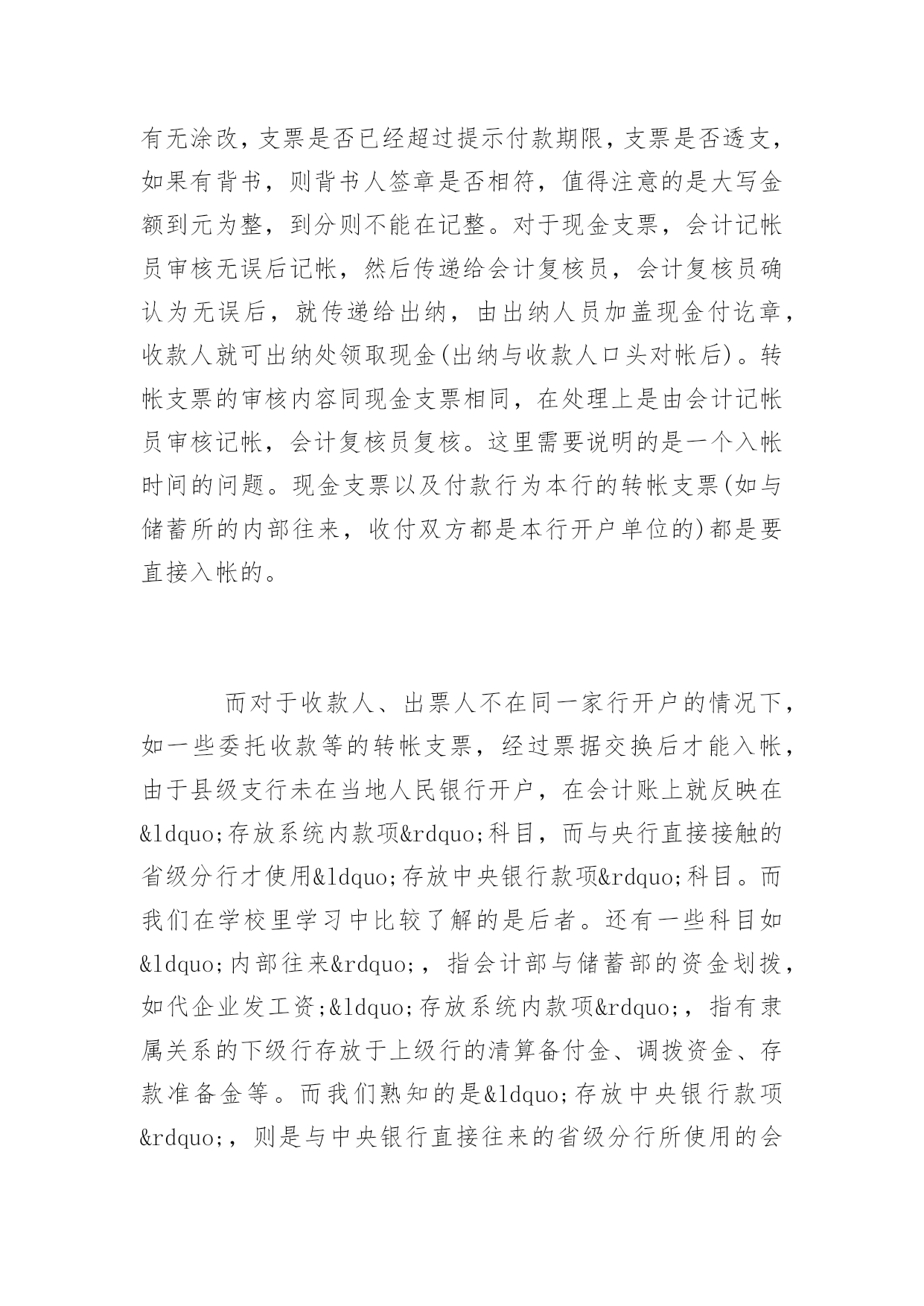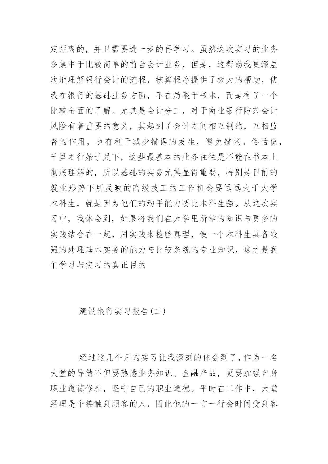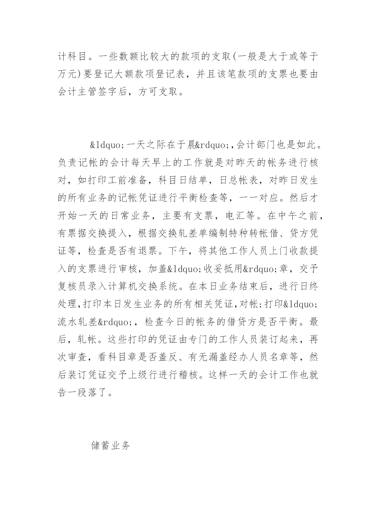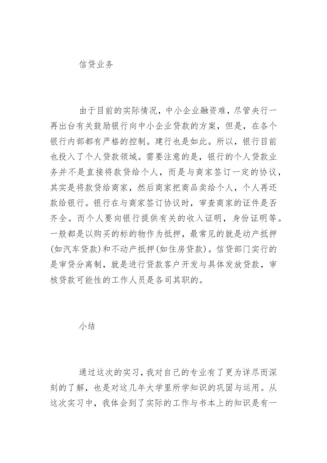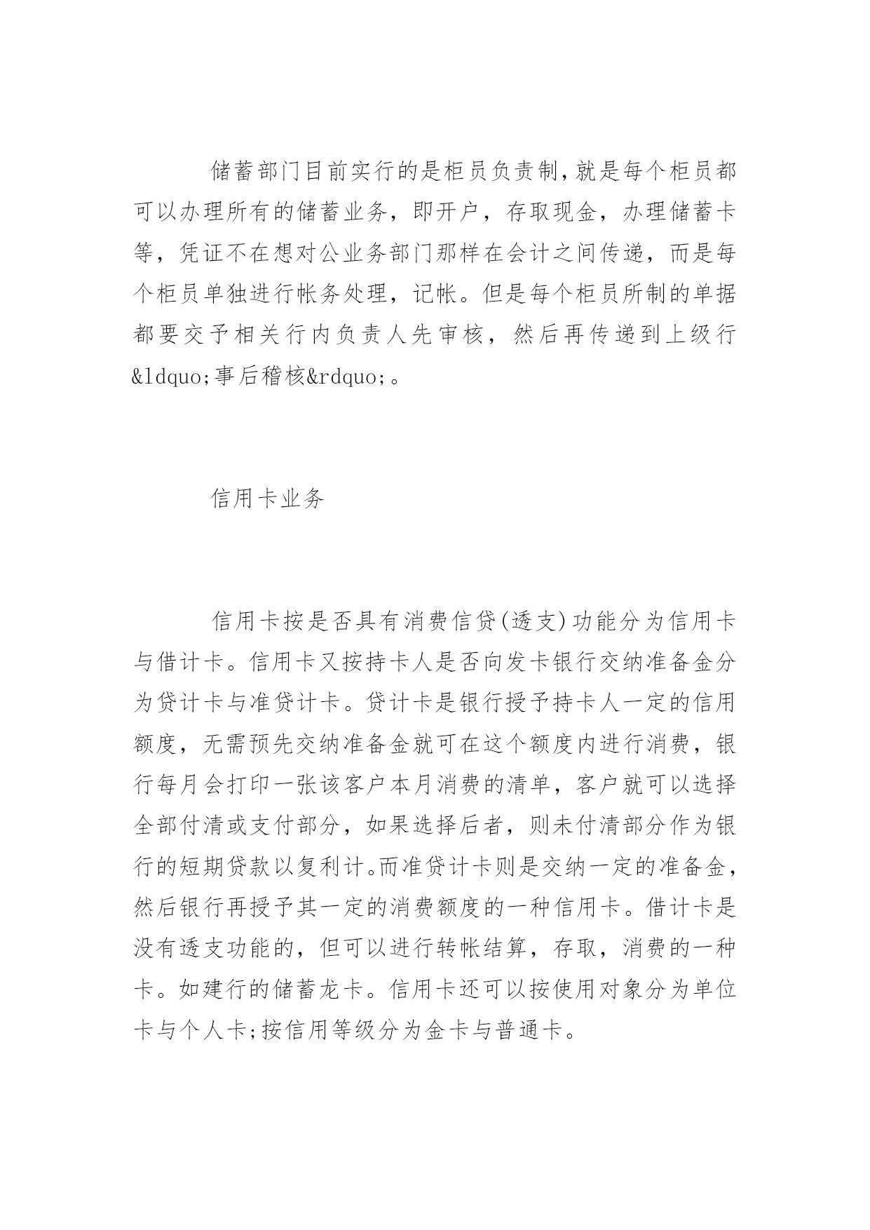 建设银行实习工作报告建设银行实习工作报告范文建设银行实习报告(一)经过在建行的个半月的实习,我从客观上对自己在学校里所学的知识有了感性的认识,使自己更加充分地理解了理论与实际的关系。我这次实习所涉及的内容,主要是会计业务(对公业务),其他一般了解的有储蓄业务、信用卡业务、贷款业务。会计业务对公业务的会计部门的核算(主要指票据业务)主要分为三个步骤,记帐、复核与出纳。这里所讲的票据业务主要是指支票,包括转帐支票与现金支票两种。对于办理现金支票业务,首先是要审核,看出票人的印鉴是否与银行预留印鉴相符,方式就是通过电脑验印,或者是手工核对;再看大小写金额是否一致,出票金额、出票日期、收款人要素等有无涂改,支票是否已经超过提示付款期限,支票是否透支,如果有背书,则背书人签章是否相符,值得注意的是大写金额到元为整,到分则不能在记整。对于现金支票,会计记帐员审核无误后记帐,然后传递给会计复核员,会计复核员确认为无误后,就传递给出纳,由出纳人员加盖现金付讫章,收款人就可出纳处领取现金(出纳与收款人口头对帐后)。转帐支票的审核内容同现金支票相同,在处理上是由会计记帐员审核记帐,会计复核员复核。这里需要说明的是一个入帐时间的问题。现金支票以及付款行为本行的转帐支票(如与储蓄所的内部往来,收付双方都是本行开户单位的)都是要直接入帐的。而对于收款人、出票人不在同一家行开户的情况下,如一些委托收款等的转帐支票,经过票据交换后才能入帐,由于县级支行未在当地人民银行开户,在会计账上就反映在“存放系统内款项”科目,而与央行直接接触的省级分行才使用“存放中央银行款项”科目。而我们在学校里学习中比较了解的是后者。还有一些科目如“内部往来”,指会计部与储蓄部的资金划拨,如代企业发工资;“存放系统内款项”,指有隶属关系的下级行存放于上级行的清算备付金、调拨资金、存款准备金等。而我们熟知的是“存放中央银行款项”,则是与中央银行直接往来的省级分行所使用的会计科目。一些数额比较大的款项的支取(一般是大于或等于万元)要登记大额款项登记表,并且该笔款项的支票也要由会计主管签字后,方可支取。“一天之际在于晨”,会计部门也是如此。负责记帐的会计每天早上的工作就是对昨天的帐务进行核对,如打印工前准备,科目日结单,日总帐表,对昨日发生的所有业务的记帐凭证进行平衡检查等,一一对应。然后才开始一天的日常业务,主要有支票,电汇等。在中午之前,有票据交换提入,根据交换轧差单编制特种转帐借、贷方凭证等,检查是否有退票。下午,将其他工作人员上门收款提入的支票进行审核,加盖“收妥抵用”章,交予复核员录入计算机交换系统。在本日业务结束后,进行日终处理,打印本日发生业务的所有相关凭证,对帐;打印“流水轧差”,检查今日的帐务的借贷方是否平衡。最后,轧帐。这些打印的凭证由专门的工作人员装订起来,再次审查,看科目章是否盖反、有无漏盖经办人员名章等,然后装订凭证交予上级行进行稽核。这样一天的会计工作也就告一段落了。储蓄业务储蓄部门目前实行的是柜员负责制,就是每个柜员都可以办理所有的储蓄业务,即开户,存取现金,办理储蓄卡等,凭证不在想对公业务部门那样在会计之间传递,而是每个柜员单独进行帐务处理,记帐。但是每个柜员所制的单据都要交予相关行内负责人先审核,然后再传递到上级行“事后稽核”。信用卡业务信用卡按是否具有消费信贷(透支)功能分为信用卡与借计卡。信用卡又按持卡人是否向发卡银行交纳准备金分为贷计卡与准贷计卡。贷计卡是银行授予持卡人一定的信用额度,无需预先交纳准备金就可在这个额度内进行消费,银行每月会打印一张该客户本月消费的清单,客户就可以选择全部付清或支付部分,如果选择后者,则未付清部分作为银行的短期贷款以复利计。而准贷计卡则是交纳一定的准备金,然后银行再授予其一定的消费额度的一种信用卡。借计卡是没有透支功能的,但可以进行转帐结算,存取,消费的一种卡。如建行的储蓄龙卡。信用卡还可以按使用对象分为单位卡与个人卡;按信用等级分为金卡与普通卡。信贷业务由于目前的实际情况,中小企业融资难,尽管央行一再出台有关鼓励银行向中小企业贷款的方案,但是,在各个银行内部都有严格的控制。建行也是如此。所以,银行目前也投入了个人贷款领域。需要注意的是,银行的个人贷款业务并不是直接将款贷给个人,而是与商家签订一定的协议,其实是将款贷给商家,然后商家把商品卖给个人,个人再还款给银行。银行在与商家签订协议时,审查商家的证件是否齐全。而个人要向银行提供有关的收入证明,身份证明等。一般都是以购买的标的物