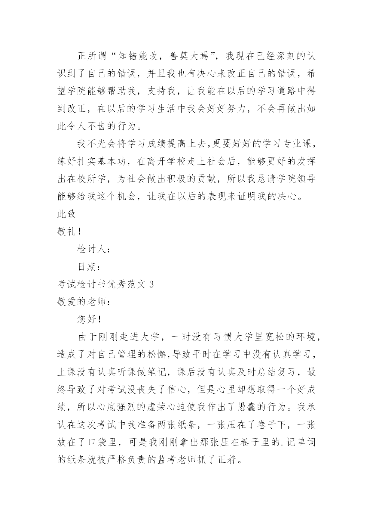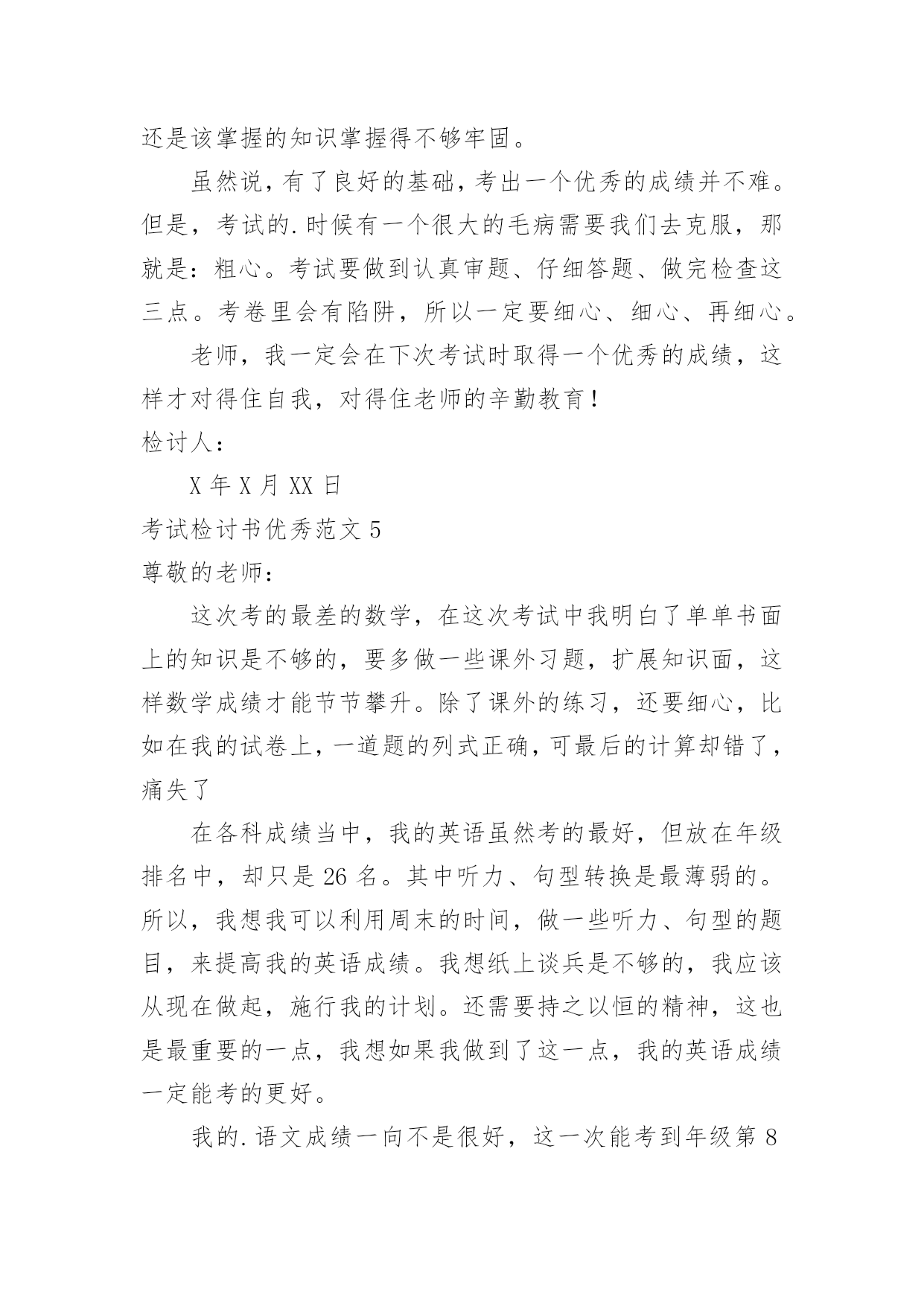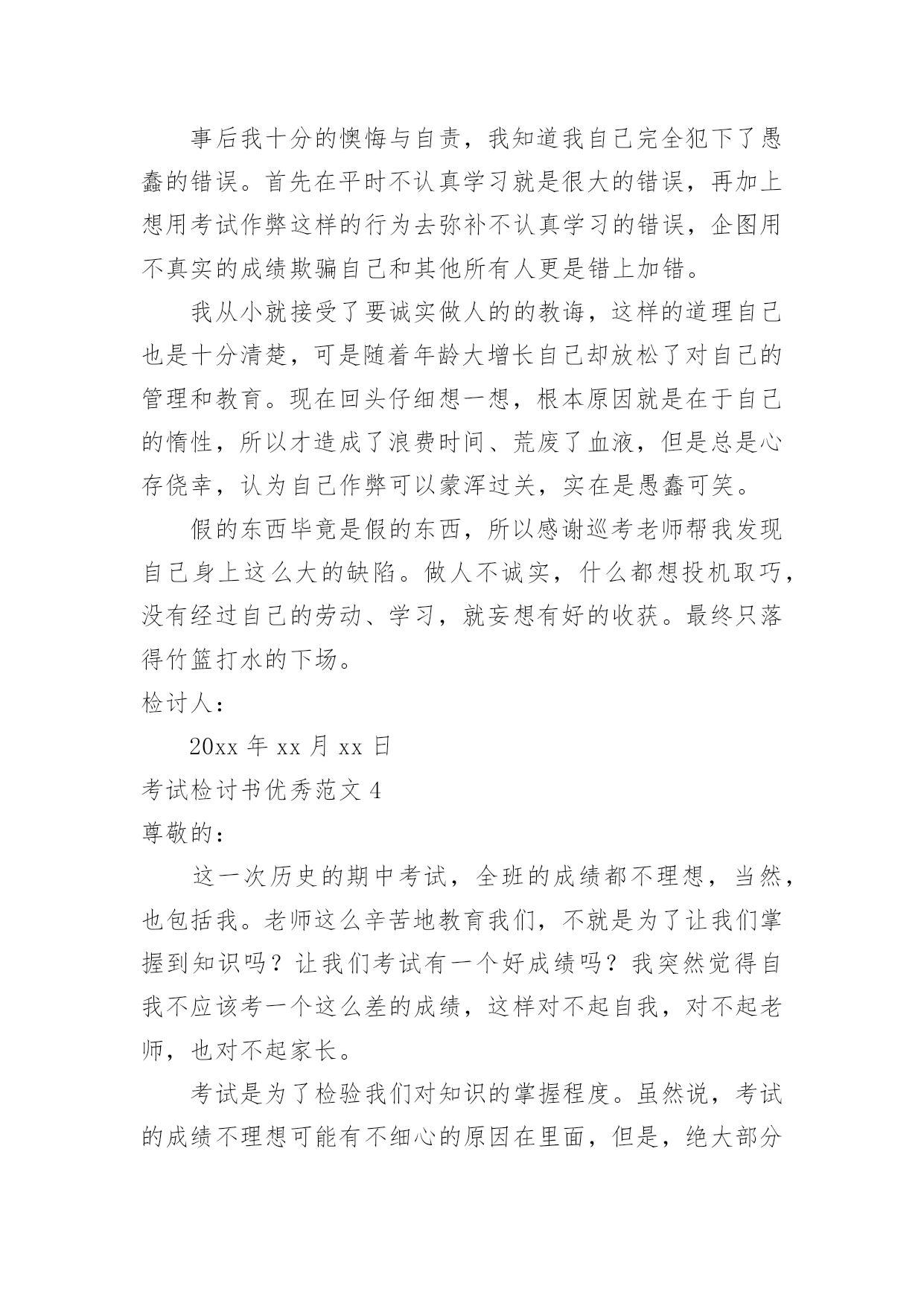 考试检讨书优秀考试检讨书优秀范文(优选5篇)当我们做某件事,出现了失误后,我们常常被要求写检讨书,以对出现的问题和过错进行检讨,在写检讨书的时候,我们的用语要非常注意。还是对检讨书一筹莫展吗?以下是小编收集整理的考试检讨书优秀范文,希望对大家有所帮助。考试检讨书优秀范文1亲爱的老师、父母:你们好,很遗憾地向你们递交这份考试没考好的检讨书。关于我此次的期中考试我未能取得预期的成绩,我感到深深地自责。我绝对有些对不起父母的关心和老师的教导,特此递交这份检讨书,表达我的歉意。关于我此次期中考试的成绩不理想,我总结了如下几点原因:第一,我的`学习态度不好。在上半学期的学习当中,因为有时候上课不听讲,思想开小差常常错过老师讲到的知识点,也耽误了学习。第二,我在课后没有及时复习,在上半学期的学习当中要说我上课不听讲还可以在课后通过写练习题弥补过来,但因为总总原因我还是没有去补习回来,因此对于不懂的知识点没有深入分析和理解。第三,是我的压力过大,其实这份压力不仅仅是父母施加的,父母对我的要求是对我的关心,是希望我有好的成绩,将来能够有出息。但我却辜负了父母,以至于考试时候心情紧张,握笔的手都会因为做不出试题而瑟瑟发抖。关于我此次成绩不好的原因还有很多的,但归根结底我此次未能考好期中考试的事实已经摆在眼前了,我在反省检讨错误的同时,我已经将目光投入在了期末考试。在此递上这份考试没考好的检讨书,恳求父母和老师的原谅。下次一定会考好的,在给我一机会!此致敬礼检讨人:20xx年X月XX日考试检讨书优秀范文2尊敬的校领导,系领导,你们好!我是XX大学XX学院专业XX级的一名学生,我叫,在参加年度高数考试中作弊,现在我面对大家做最为深刻的检讨。针对此次我的考试作弊,完全是因为一时的侥幸心理和对自己没有自信导致,并不是因为学习中的困难和专业知识的匮乏导致,对于这件事,我深刻的剖析了自己的错误,我深知问题的严重性,影响的广泛性和对学校的负面影响深度,现在我将我的认识和体会向大家做一个汇报,希望能在我知道和反省错误的同时,给予我帮助和支持,让我能在以后的学习和工作生活中,摒弃恶习,扎实学好专业课,做一个对社会有用的人。首先,是我对专业课考试的认识不够在此次考试中,我没有认识到考试的重要性和对学生年度知识考核的严肃性,针对考试评估,我没有端正自己的态度,采用了投机取巧的方式来应付,完全忽视了学校对学生在德治上的引导和教育。同时也辜负了在远方遥望着我学业有成的父母,对我等谆谆教诲的师长的教育,在生活中耐心帮助过我的学长和同学,正所谓“一失足成千古恨”,在事情发生后,我将自己封闭起来。认真的考虑这次作弊事件中我所犯下的错误,我在得到那么多人的帮助下,没有将老师所教授的课程学习好,没有将所学知识融会贯通到我自己的思想中,是第一个错误;在没有学好专业课。而是采取投机取巧的方式来应付考试,忽视学校的校规校纪是我所犯的第二个错误;在我犯错之后,我认真的反省了自己,考试是严肃的,校规校纪的制定是对学生正常生活秩序起到引导作用的,而我,完全没有看到这种本应该严肃认真的考核方式,完全无视了对自身考核评定的大好机会,这将是我一生的损失,也是因为我青春路上的一次开小差,更是我成长路上的一次教训。因为我不光伤害了我自己,在我将得到应有的处罚的同时,我还使得大家为我的学业操心费神,我知道自己错了,错的那样的无知,也错的那样的令人耻笑,但是我希望学校不要因为我的一时犯错,而完全放弃我,我希望能够给我一个改正自己错误的机会,让我在以后的学习中用更多的努力来弥补。其次,是我对作弊考试的侥幸心理在这种综合考核学生整体能力和学习成绩效率的时候,我没有摆正自己的位置,没有很好的认识考试的重要性。而是采取了作弊方式来应对,而且在作弊中存在着侥幸心理,以为这样做无人知晓,想以虚假的方式骗取对自己一年学习的评估,这是对自己的不负责任,同时也伤害和连累了同学,以自己侥幸的方式是不可能通过对个人的考核的,我在此次考试中不光失去了对自己评价的机会。更加失去了对个人道德的考核机会,我因为一时的`不理智,而犯下了如此大的错误,这会是我一生的教训,更会是我在以后成长中的一个警钟,以后我会在这个警示牌下认认真真学习,坦率做人,坦诚做事,完全按照国家所培养的合格,优秀毕业生的方向努力。古人讲“以史为鉴”,我则会以此为鉴,为我以后的学习生活点亮明灯,压力面前我不会再退缩,我会勇往直前,踏踏实实,认真学习,用更多的努力来弥补我所犯下的错。再次,希望学院给我一个能够改正错误的机会都说“浪子回头金不换”,我虽然犯下了极为严重的错误,但是我想请求学院能够给我一个机会,让我来改正我所犯下的错误。正所谓“知错能改,善莫大焉”,我现在已经深刻的认识到了自己的错误,并且我也有决心来改正自己的错误,希望学院能够帮助我,支持我,让我能在