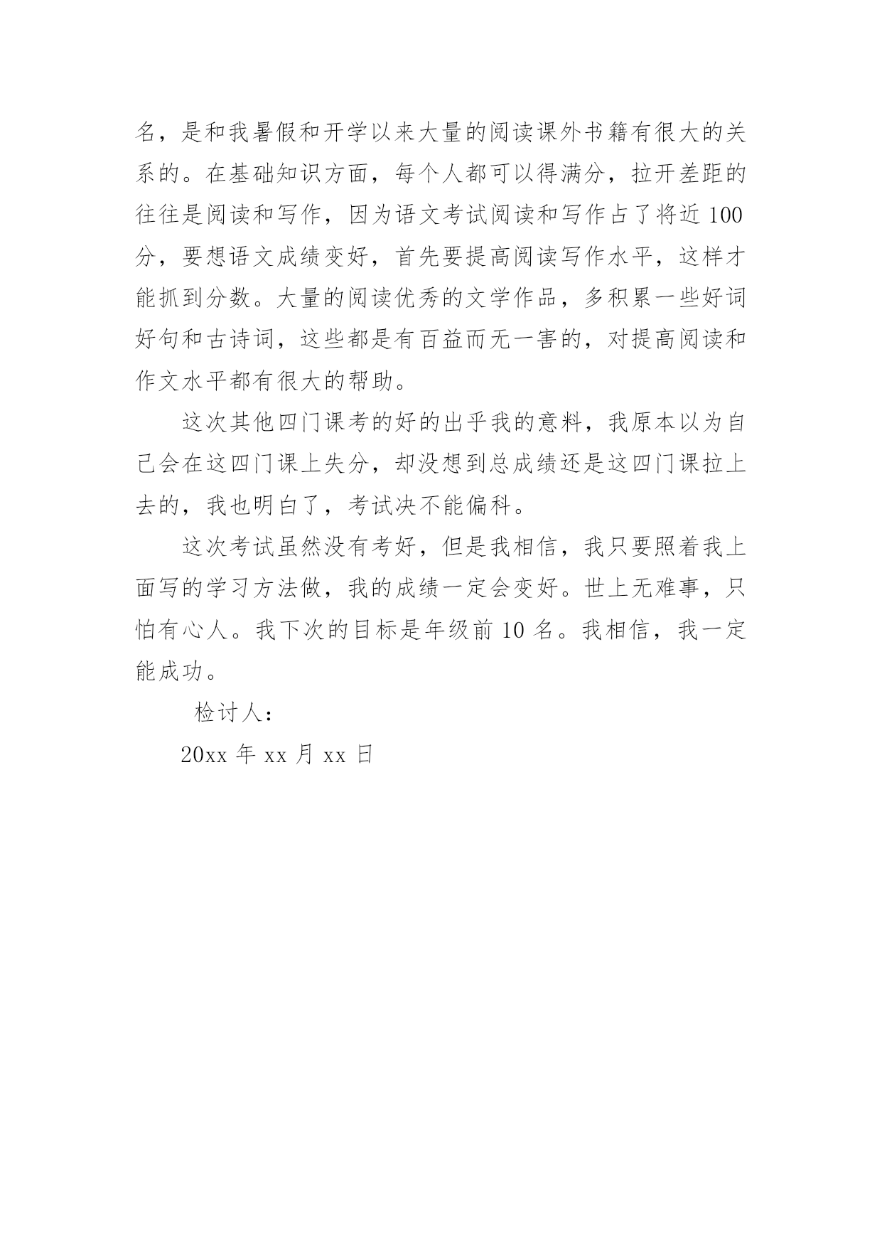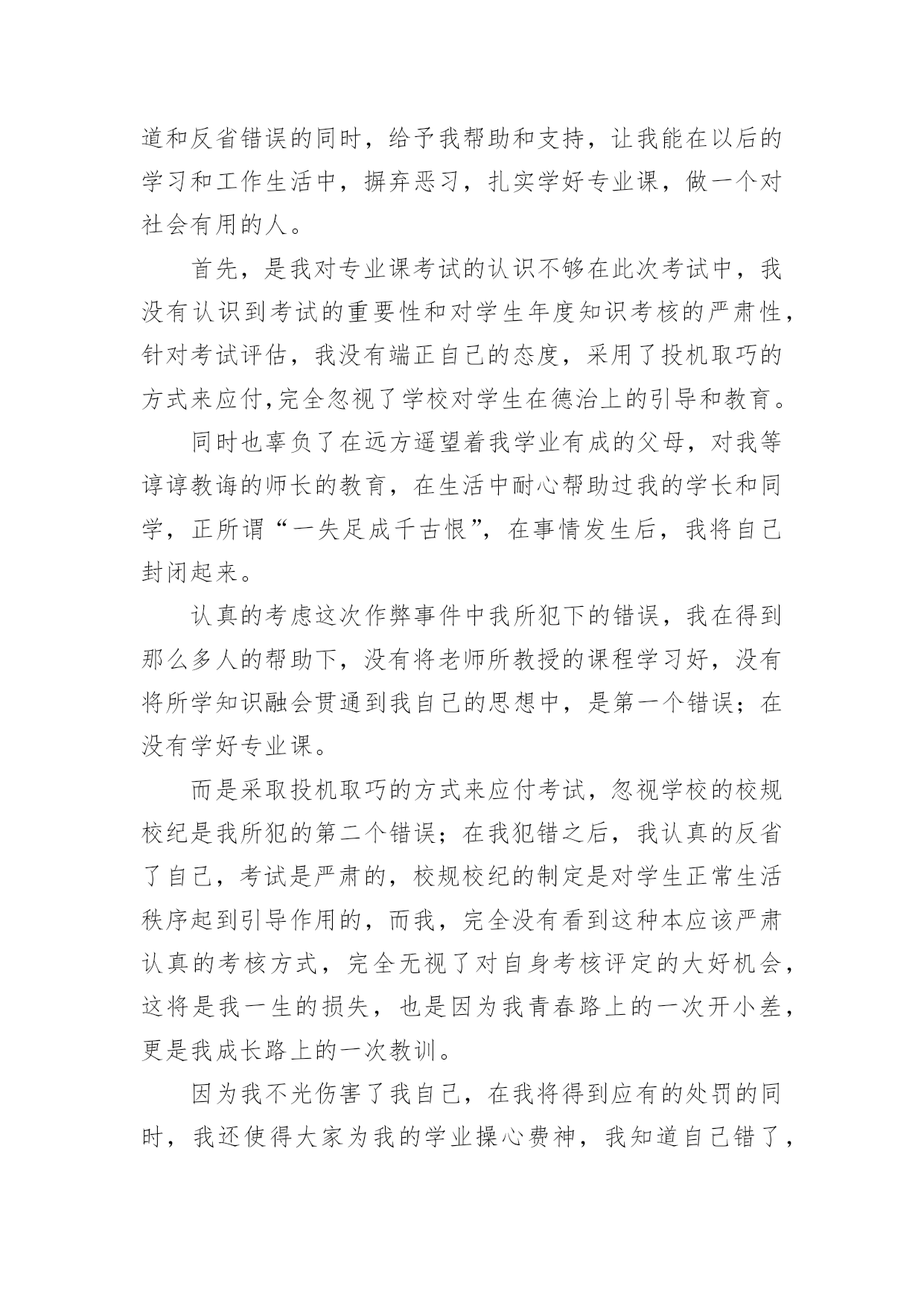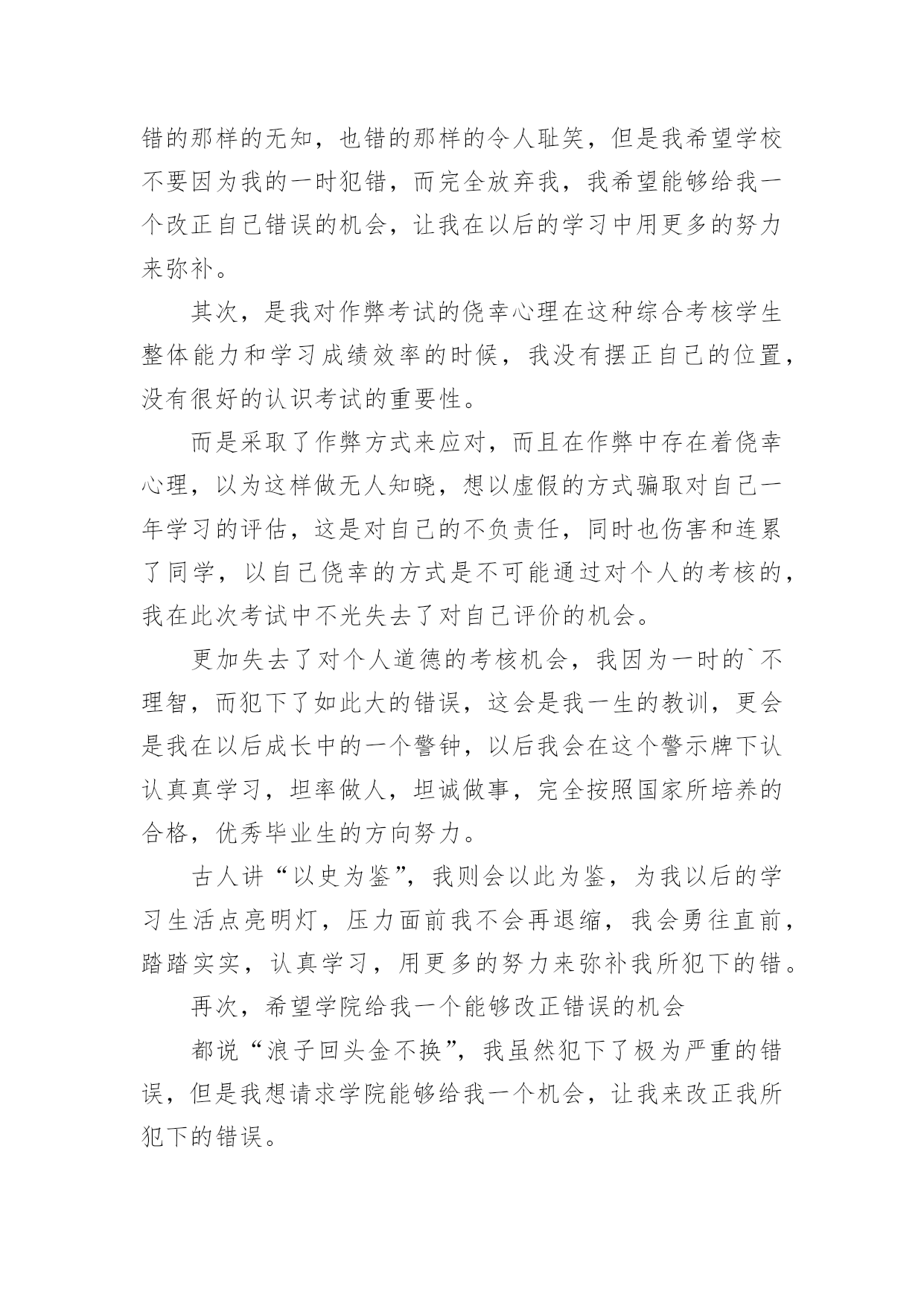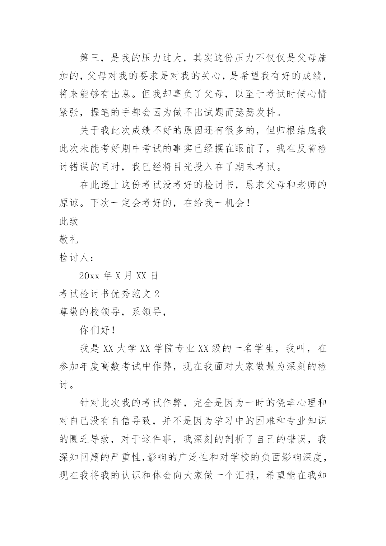 考试检讨书优秀考试检讨书优秀范文(优选5篇)当我们做某件事,出现了失误后,我们常常被要求写检讨书,以对出现的问题和过错进行检讨,在写检讨书的时候,我们的用语要非常注意。还是对检讨书一筹莫展吗?以下是小编收集整理的考试检讨书优秀范文,希望对大家有所帮助。考试检讨书优秀范文1亲爱的老师、父母:你们好,很遗憾地向你们递交这份考试没考好的检讨书。关于我此次的期中考试我未能取得预期的成绩,我感到深深地自责。我绝对有些对不起父母的关心和老师的教导,特此递交这份检讨书,表达我的歉意。关于我此次期中考试的成绩不理想,我总结了如下几点原因:第一,我的`学习态度不好。在上半学期的学习当中,因为有时候上课不听讲,思想开小差常常错过老师讲到的知识点,也耽误了学习。第二,我在课后没有及时复习,在上半学期的学习当中要说我上课不听讲还可以在课后通过写练习题弥补过来,但因为总总原因我还是没有去补习回来,因此对于不懂的知识点没有深入分析和理解。第三,是我的压力过大,其实这份压力不仅仅是父母施加的,父母对我的要求是对我的关心,是希望我有好的成绩,将来能够有出息。但我却辜负了父母,以至于考试时候心情紧张,握笔的手都会因为做不出试题而瑟瑟发抖。关于我此次成绩不好的原因还有很多的,但归根结底我此次未能考好期中考试的事实已经摆在眼前了,我在反省检讨错误的同时,我已经将目光投入在了期末考试。在此递上这份考试没考好的检讨书,恳求父母和老师的原谅。下次一定会考好的,在给我一机会!此致敬礼检讨人:20xx年X月XX日考试检讨书优秀范文2尊敬的校领导,系领导,你们好!我是XX大学XX学院专业XX级的一名学生,我叫,在参加年度高数考试中作弊,现在我面对大家做最为深刻的检讨。针对此次我的考试作弊,完全是因为一时的侥幸心理和对自己没有自信导致,并不是因为学习中的困难和专业知识的匮乏导致,对于这件事,我深刻的剖析了自己的错误,我深知问题的严重性,影响的广泛性和对学校的负面影响深度,现在我将我的认识和体会向大家做一个汇报,希望能在我知道和反省错误的同时,给予我帮助和支持,让我能在以后的学习和工作生活中,摒弃恶习,扎实学好专业课,做一个对社会有用的人。首先,是我对专业课考试的认识不够在此次考试中,我没有认识到考试的重要性和对学生年度知识考核的严肃性,针对考试评估,我没有端正自己的态度,采用了投机取巧的方式来应付,完全忽视了学校对学生在德治上的引导和教育。同时也辜负了在远方遥望着我学业有成的父母,对我等谆谆教诲的师长的教育,在生活中耐心帮助过我的学长和同学,正所谓“一失足成千古恨”,在事情发生后,我将自己封闭起来。认真的考虑这次作弊事件中我所犯下的错误,我在得到那么多人的帮助下,没有将老师所教授的课程学习好,没有将所学知识融会贯通到我自己的思想中,是第一个错误;在没有学好专业课。而是采取投机取巧的方式来应付考试,忽视学校的校规校纪是我所犯的第二个错误;在我犯错之后,我认真的反省了自己,考试是严肃的,校规校纪的制定是对学生正常生活秩序起到引导作用的,而我,完全没有看到这种本应该严肃认真的考核方式,完全无视了对自身考核评定的大好机会,这将是我一生的损失,也是因为我青春路上的一次开小差,更是我成长路上的一次教训。因为我不光伤害了我自己,在我将得到应有的处罚的同时,我还使得大家为我的学业操心费神,我知道自己错了,错的那样的无知,也错的那样的令人耻笑,但是我希望学校不要因为我的一时犯错,而完全放弃我,我希望能够给我一个改正自己错误的机会,让我在以后的学习中用更多的努力来弥补。其次,是我对作弊考试的侥幸心理在这种综合考核学生整体能力和学习成绩效率的时候,我没有摆正自己的位置,没有很好的认识考试的重要性。而是采取了作弊方式来应对,而且在作弊中存在着侥幸心理,以为这样做无人知晓,想以虚假的方式骗取对自己一年学习的评估,这是对自己的不负责任,同时也伤害和连累了同学,以自己侥幸的方式是不可能通过对个人的考核的,我在此次考试中不光失去了对自己评价的机会。更加失去了对个人道德的考核机会,我因为一时的`不理智,而犯下了如此大的错误,这会是我一生的教训,更会是我在以后成长中的一个警钟,以后我会在这个警示牌下认认真真学习,坦率做人,坦诚做事,完全按照国家所培养的合格,优秀毕业生的方向努力。古人讲“以史为鉴”,我则会以此为鉴,为我以后的学习生活点亮明灯,压力面前我不会再退缩,我会勇往直前,踏踏实实,认真学习,用更多的努力来弥补我所犯下的错。再次,希望学院给我一个能够改正错误的机会都说“浪子回头金不换”,我虽然犯下了极为严重的错误,但是我想请求学院能够给我一个机会,让我来改正我所犯下的错误。正所谓“知错能改,善莫大焉”,我现在已经深刻的认识到了自己的错误,并且我也有决心来改正自己的错误,希望学院能够帮助我,支持我,让我能在