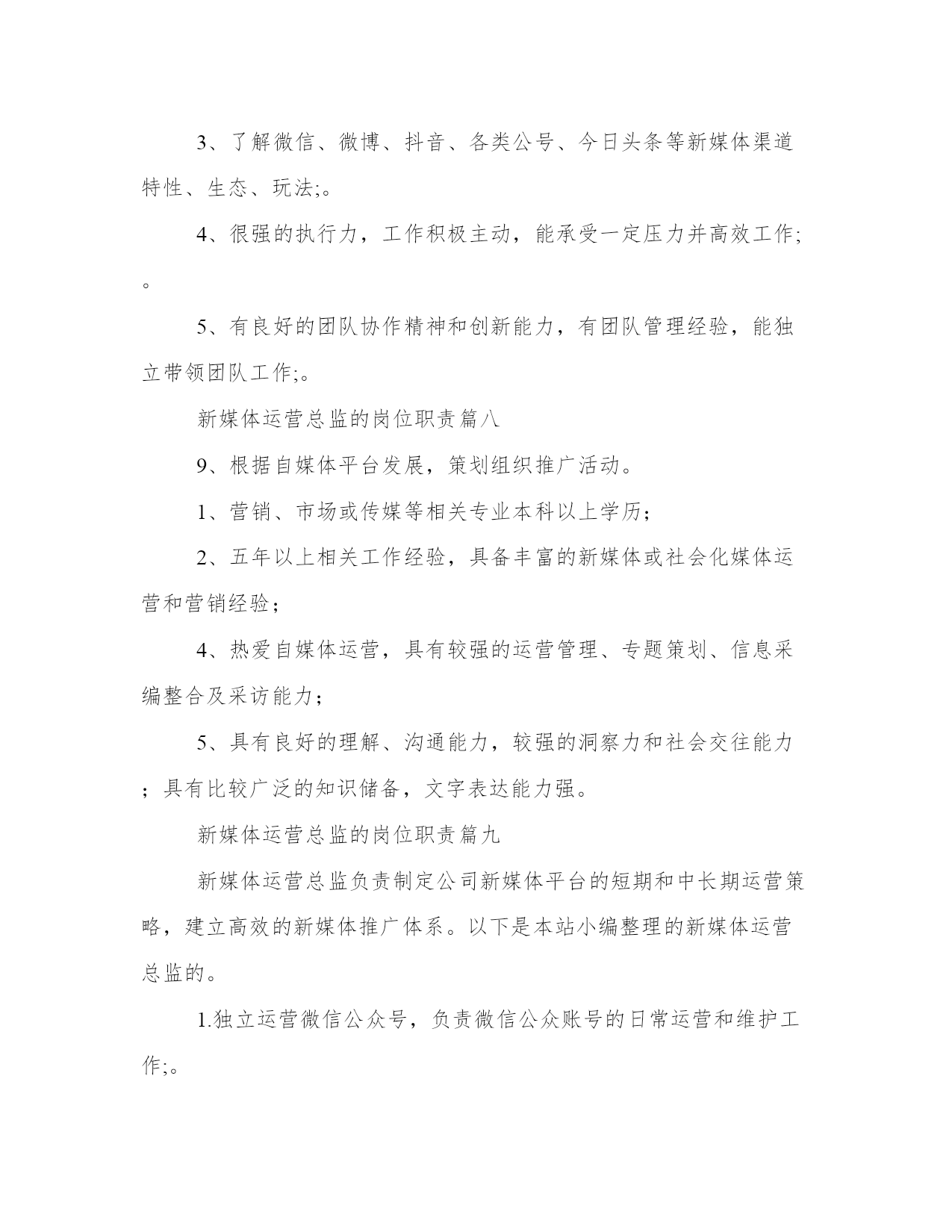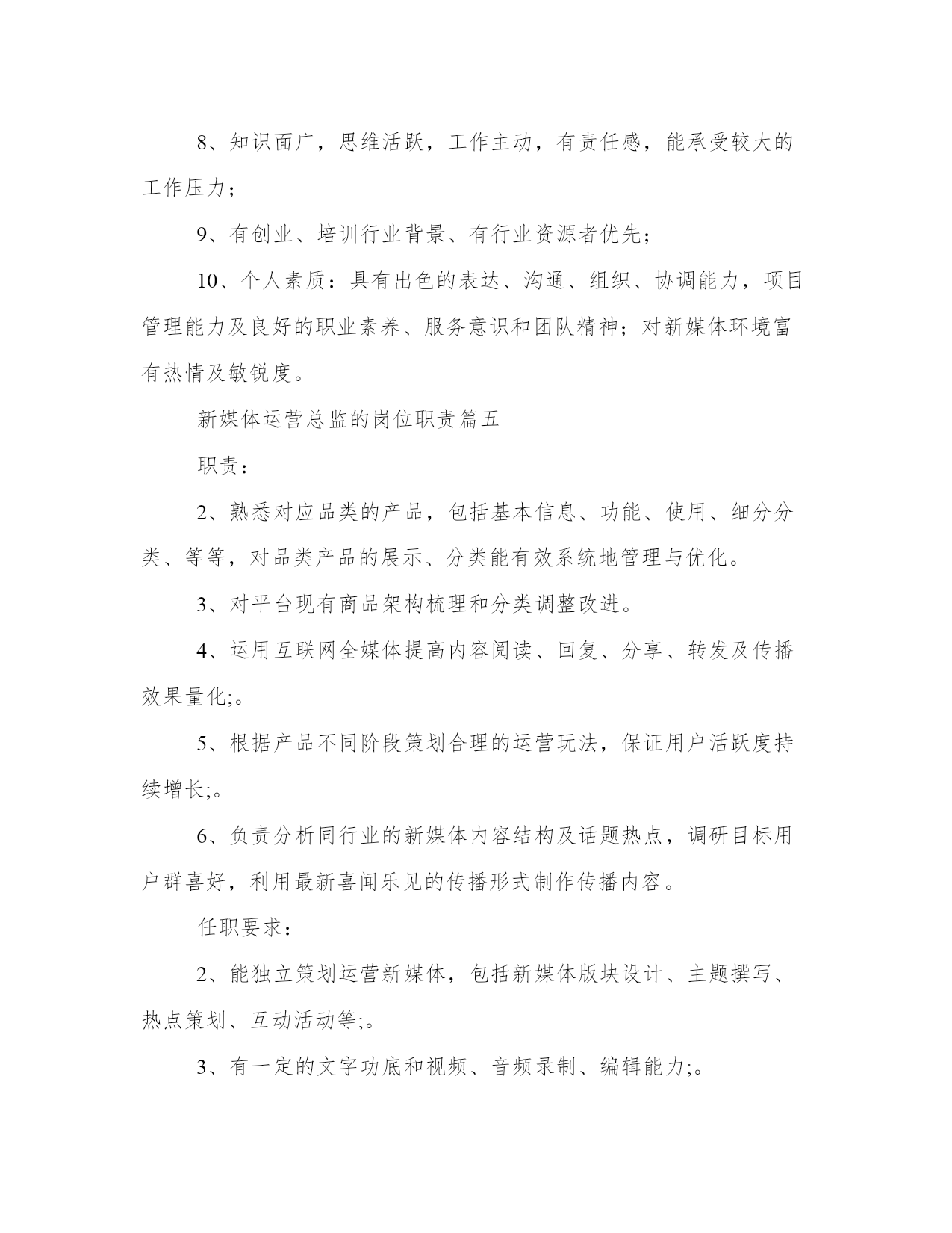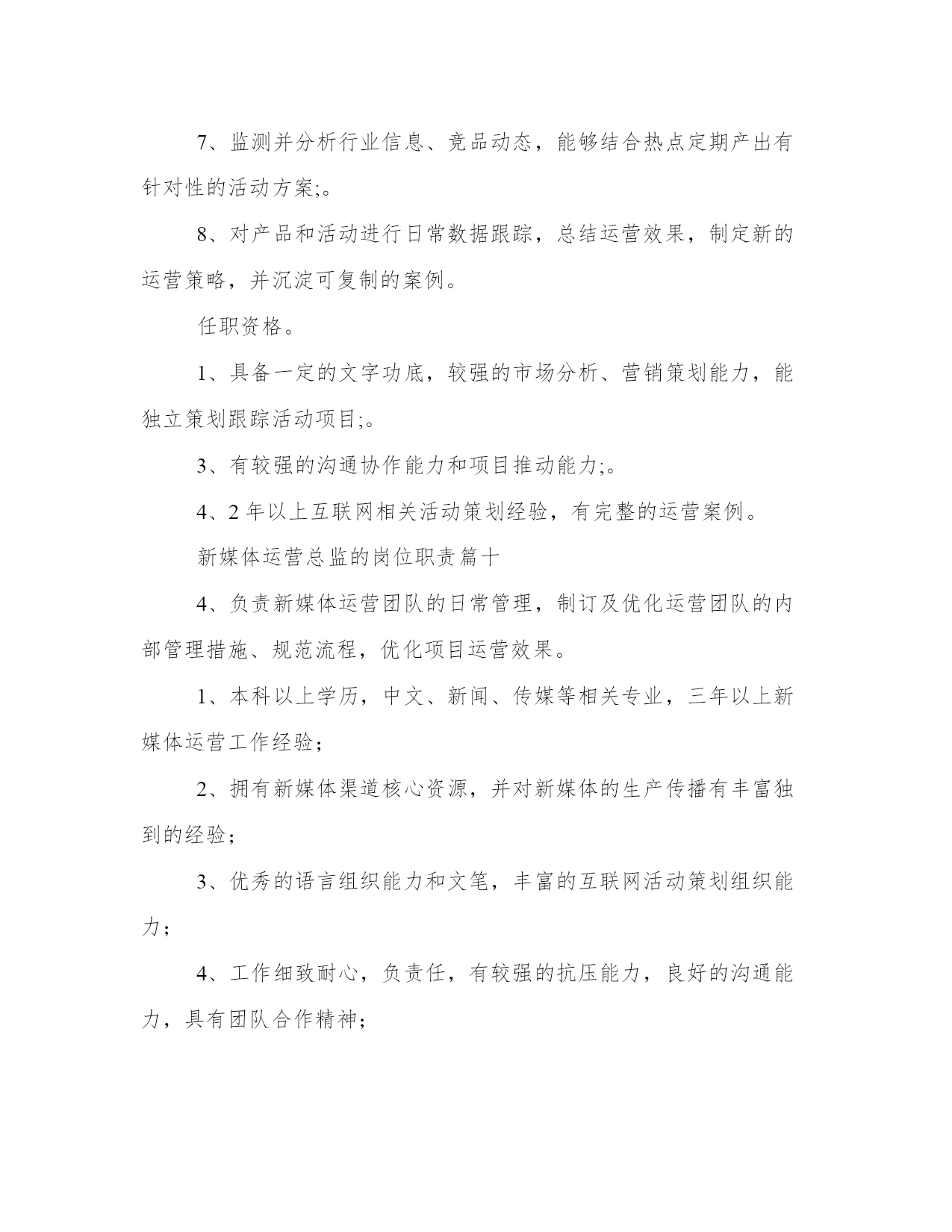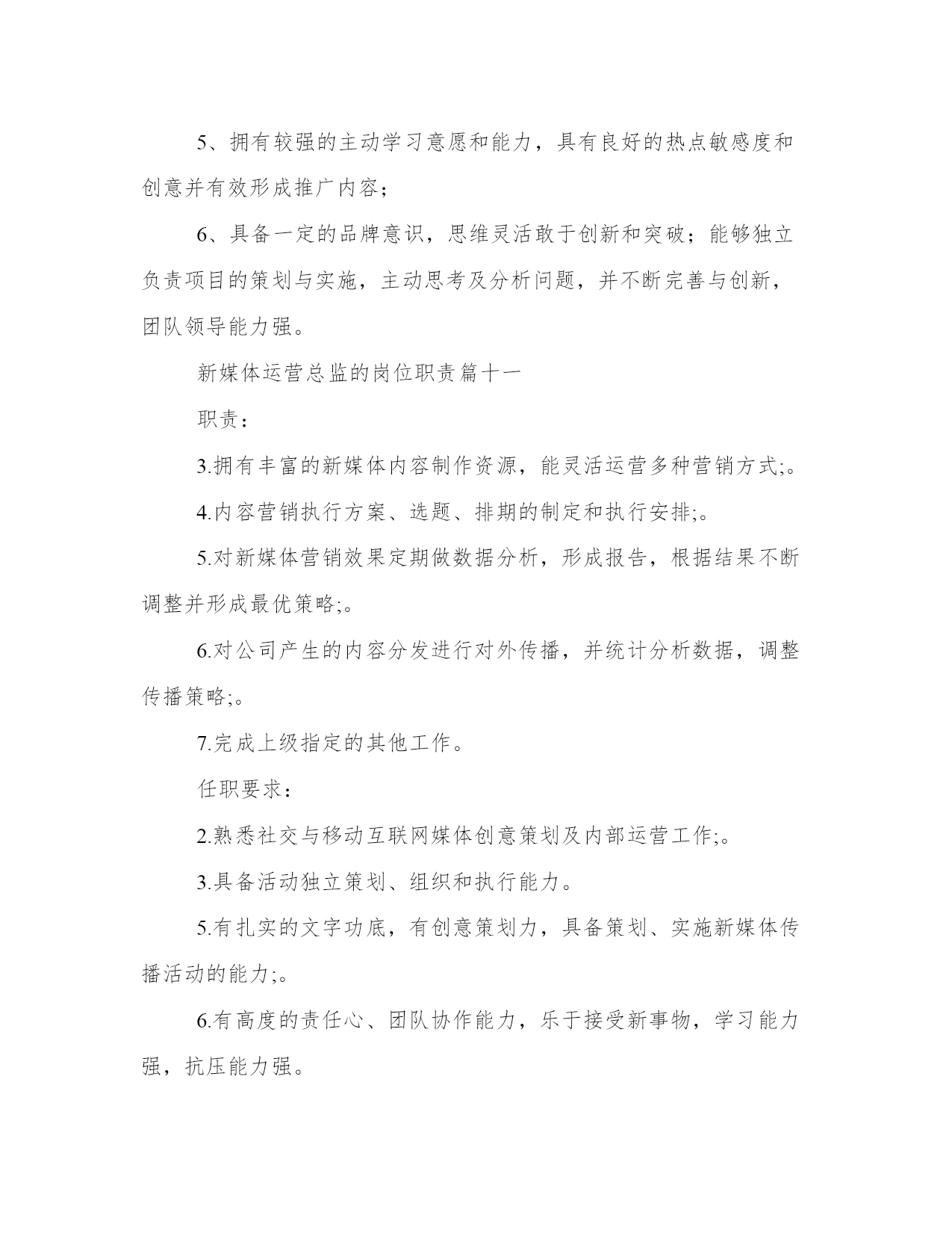2024年新媒体运营总监的岗位职责(汇总11篇)承载着丰富知识和文化的语文学科,在我们的学习和成长中起着重要的作用。写总结时要注重围绕主题进行,避免过多的细节和无关内容。通过学习别人的经验和教训,我们可以避免犯同样的错误。新媒体运营总监的岗位职责篇一5.组织部门定期组织内部沟通会议,对项目人及创意人进行创意等培训。2.思维敏捷,创意独特,文笔优秀,逻辑性强,工作风格细致认真;4,新媒体创意及策划造诣深厚,有创意的思想和行动能力,能够胜任系统的创意工作;5、服务过知名互联网公司及知名品牌优先新媒体运营总监的岗位职责篇二(4)收集社交媒体平台的热门文章、信息,进行整合分享。(1)广告传播、计算机、新闻或文学相关专业;(2)热爱社交媒体,如微博、微信等;(3)有文案、策划、媒体实习经历者优先;(4)对新媒体营销和传播方式的了解;(5)责任心强、亲和力,有良好的沟通、实施能力及团队合作精神;(6)有文字功底,阅读能力;(7)懂点平面设计如ps、摄影剪辑。新媒体运营总监的岗位职责篇三4、跟踪营销推广效果,分析数据并反馈,总结经验,建立有效运营售端提升用户活跃度,增加粉丝数量。1、具备紧跟新媒体发展趋势,广泛关注标杆性媒体,积极探索新媒体运营模式‘2、热爱并擅长文案创作和创意营销并由相关新媒体编辑经验;3、文字功底深厚,创作能力强,营销西路清晰4、由运营新媒体的经验;5、大专及以上学历,编辑出版,新闻学,新媒体等相关专业优先。新媒体运营总监的岗位职责篇四5、通过数据有效分析媒体推广效果。1、大专以上学历,营销、策划、传播、中文学、新闻学、广告学等专业优先;2、3年以上新媒体、自媒体、网络运营、网站运营、seo、色盲推广策划经验、案例;5、能根据不同项目定位,开发并策划有创意的`新媒体推广方案;8、知识面广,思维活跃,工作主动,有责任感,能承受较大的工作压力;9、有创业、培训行业背景、有行业资源者优先;10、个人素质:具有出色的表达、沟通、组织、协调能力,项目管理能力及良好的职业素养、服务意识和团队精神;对新媒体环境富有热情及敏锐度。新媒体运营总监的岗位职责篇五职责:2、熟悉对应品类的产品,包括基本信息、功能、使用、细分分类、等等,对品类产品的展示、分类能有效系统地管理与优化。3、对平台现有商品架构梳理和分类调整改进。4、运用互联网全媒体提高内容阅读、回复、分享、转发及传播效果量化;。5、根据产品不同阶段策划合理的运营玩法,保证用户活跃度持续增长;。6、负责分析同行业的新媒体内容结构及话题热点,调研目标用户群喜好,利用最新喜闻乐见的传播形式制作传播内容。任职要求:2、能独立策划运营新媒体,包括新媒体版块设计、主题撰写、热点策划、互动活动等;。3、有一定的文字功底和视频、音频录制、编辑能力;。4、学习领悟力强,热爱电子商务工作;。5、有良好的团队合作精神和沟通能力,工作责任心强,新媒体运营总监的岗位职责篇六5、积极开展运营相关商务拓展合作,并合理构建人才梯队;。6、根据公司的经营战略和经营计划,制定平台内容规划和整体运营推广计划;。8、整合国内外媒体资源,完善品牌危机公关事件营销部署预案;。9、制定各平台整体及阶段性的运营规划,组织协调各相关部门共同实施运营目标。新媒体运营总监的岗位职责篇七职责:1、负责公司微信、微博、抖音、各类公号、头条号的整体业务规划和运营,负责平台的内容建设和引流。2、负责公司级重大项目和活动的社会化营销传播方案;。4、整合各方资源,通过新媒体运营渠道,完成整体业务目标。5、关注新媒体传播的趋势和变化,定期提出创新推广方案并进行实践;。6、搭建公司新媒体矩阵。任职要求:2、具有丰富社群运营经验和活动策划经验;。3、了解微信、微博、抖音、各类公号、今日头条等新媒体渠道特性、生态、玩法;。4、很强的执行力,工作积极主动,能承受一定压力并高效工作;。5、有良好的团队协作精神和创新能力,有团队管理经验,能独立带领团队工作;。新媒体运营总监的岗位职责篇八9、根据自媒体平台发展,策划组织推广活动。1、营销、市场或传媒等相关专业本科以上学历;2、五年以上相关工作经验,具备丰富的新媒体或社会化媒体运营和营销经验;4、热爱自媒体运营,具有较强的运营管理、专题策划、信息采编整合及采访能力;5、具有良好的理解、沟通能力,较强的洞察力和社会交往能力;具有比较广泛的知识储备,文字表达能力强。新媒体运营总监的岗位职责篇九新媒体运营总监负责制定公司新媒体平台的短期和中长期运营策略,建立高效的新媒体推广体系。以下是本站小编整理的新媒体运营总监的。1.独立运营微信公众号,负责微信公众账号的日常运营和维护工作;。2.