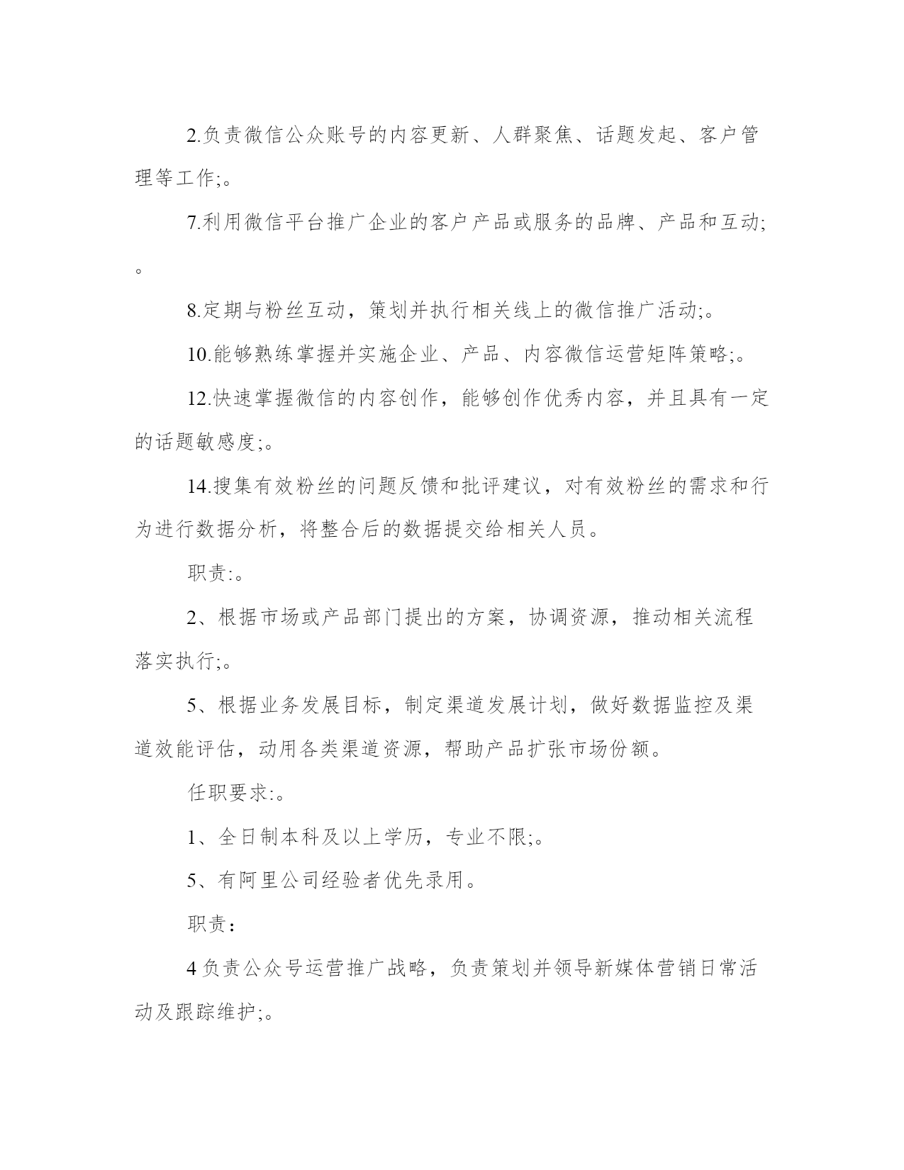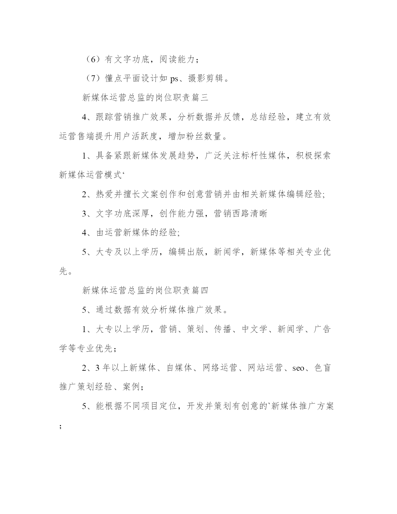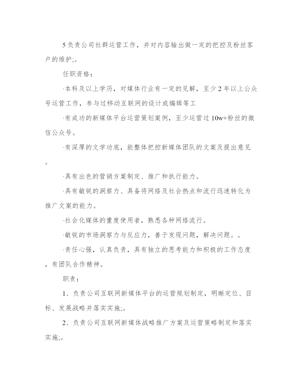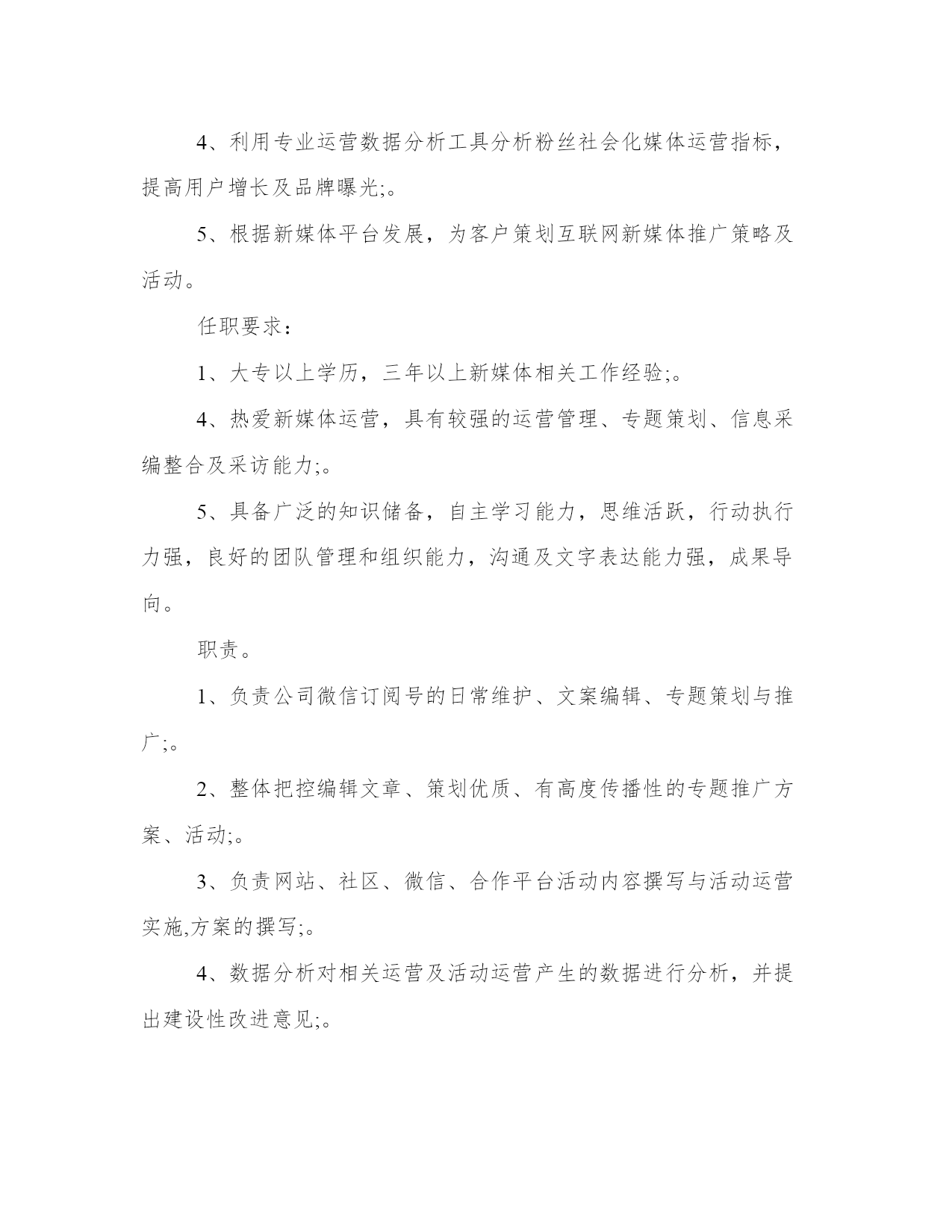 2024年新媒体运营总监的岗位职责(汇总11篇)承载着丰富知识和文化的语文学科,在我们的学习和成长中起着重要的作用。写总结时要注重围绕主题进行,避免过多的细节和无关内容。通过学习别人的经验和教训,我们可以避免犯同样的错误。新媒体运营总监的岗位职责篇一5.组织部门定期组织内部沟通会议,对项目人及创意人进行创意等培训。2.思维敏捷,创意独特,文笔优秀,逻辑性强,工作风格细致认真;4,新媒体创意及策划造诣深厚,有创意的思想和行动能力,能够胜任系统的创意工作;5、服务过知名互联网公司及知名品牌优先新媒体运营总监的岗位职责篇二(4)收集社交媒体平台的热门文章、信息,进行整合分享。(1)广告传播、计算机、新闻或文学相关专业;(2)热爱社交媒体,如微博、微信等;(3)有文案、策划、媒体实习经历者优先;(4)对新媒体营销和传播方式的了解;(5)责任心强、亲和力,有良好的沟通、实施能力及团队合作精神;(6)有文字功底,阅读能力;(7)懂点平面设计如ps、摄影剪辑。新媒体运营总监的岗位职责篇三4、跟踪营销推广效果,分析数据并反馈,总结经验,建立有效运营售端提升用户活跃度,增加粉丝数量。1、具备紧跟新媒体发展趋势,广泛关注标杆性媒体,积极探索新媒体运营模式‘2、热爱并擅长文案创作和创意营销并由相关新媒体编辑经验;3、文字功底深厚,创作能力强,营销西路清晰4、由运营新媒体的经验;5、大专及以上学历,编辑出版,新闻学,新媒体等相关专业优先。新媒体运营总监的岗位职责篇四5、通过数据有效分析媒体推广效果。1、大专以上学历,营销、策划、传播、中文学、新闻学、广告学等专业优先;2、3年以上新媒体、自媒体、网络运营、网站运营、seo、色盲推广策划经验、案例;5、能根据不同项目定位,开发并策划有创意的`新媒体推广方案;8、知识面广,思维活跃,工作主动,有责任感,能承受较大的工作压力;9、有创业、培训行业背景、有行业资源者优先;10、个人素质:具有出色的表达、沟通、组织、协调能力,项目管理能力及良好的职业素养、服务意识和团队精神;对新媒体环境富有热情及敏锐度。新媒体运营总监的岗位职责篇五职责:2、熟悉对应品类的产品,包括基本信息、功能、使用、细分分类、等等,对品类产品的展示、分类能有效系统地管理与优化。3、对平台现有商品架构梳理和分类调整改进。4、运用互联网全媒体提高内容阅读、回复、分享、转发及传播效果量化;。5、根据产品不同阶段策划合理的运营玩法,保证用户活跃度持续增长;。6、负责分析同行业的新媒体内容结构及话题热点,调研目标用户群喜好,利用最新喜闻乐见的传播形式制作传播内容。任职要求:2、能独立策划运营新媒体,包括新媒体版块设计、主题撰写、热点策划、互动活动等;。3、有一定的文字功底和视频、音频录制、编辑能力;。4、学习领悟力强,热爱电子商务工作;。5、有良好的团队合作精神和沟通能力,工作责任心强,新媒体运营总监的岗位职责篇六5、积极开展运营相关商务拓展合作,并合理构建人才梯队;。6、根据公司的经营战略和经营计划,制定平台内容规划和整体运营推广计划;。8、整合国内外媒体资源,完善品牌危机公关事件营销部署预案;。9、制定各平台整体及阶段性的运营规划,组织协调各相关部门共同实施运营目标。新媒体运营总监的岗位职责篇七职责:1、负责公司微信、微博、抖音、各类公号、头条号的整体业务规划和运营,负责平台的内容建设和引流。2、负责公司级重大项目和活动的社会化营销传播方案;。4、整合各方资源,通过新媒体运营渠道,完成整体业务目标。5、关注新媒体传播的趋势和变化,定期提出创新推广方案并进行实践;。6、搭建公司新媒体矩阵。任职要求:2、具有丰富社群运营经验和活动策划经验;。3、了解微信、微博、抖音、各类公号、今日头条等新媒体渠道特性、生态、玩法;。4、很强的执行力,工作积极主动,能承受一定压力并高效工作;。5、有良好的团队协作精神和创新能力,有团队管理经验,能独立带领团队工作;。新媒体运营总监的岗位职责篇八9、根据自媒体平台发展,策划组织推广活动。1、营销、市场或传媒等相关专业本科以上学历;2、五年以上相关工作经验,具备丰富的新媒体或社会化媒体运营和营销经验;4、热爱自媒体运营,具有较强的运营管理、专题策划、信息采编整合及采访能力;5、具有良好的理解、沟通能力,较强的洞察力和社会交往能力;具有比较广泛的知识储备,文字表达能力强。新媒体运营总监的岗位职责篇九新媒体运营总监负责制定公司新媒体平台的短期和中长期运营策略,建立高效的新媒体推广体系。以下是本站小编整理的新媒体运营总监的。1.独立运营微信公众号,负责微信公众账号的日常运营和维护工作;。2.