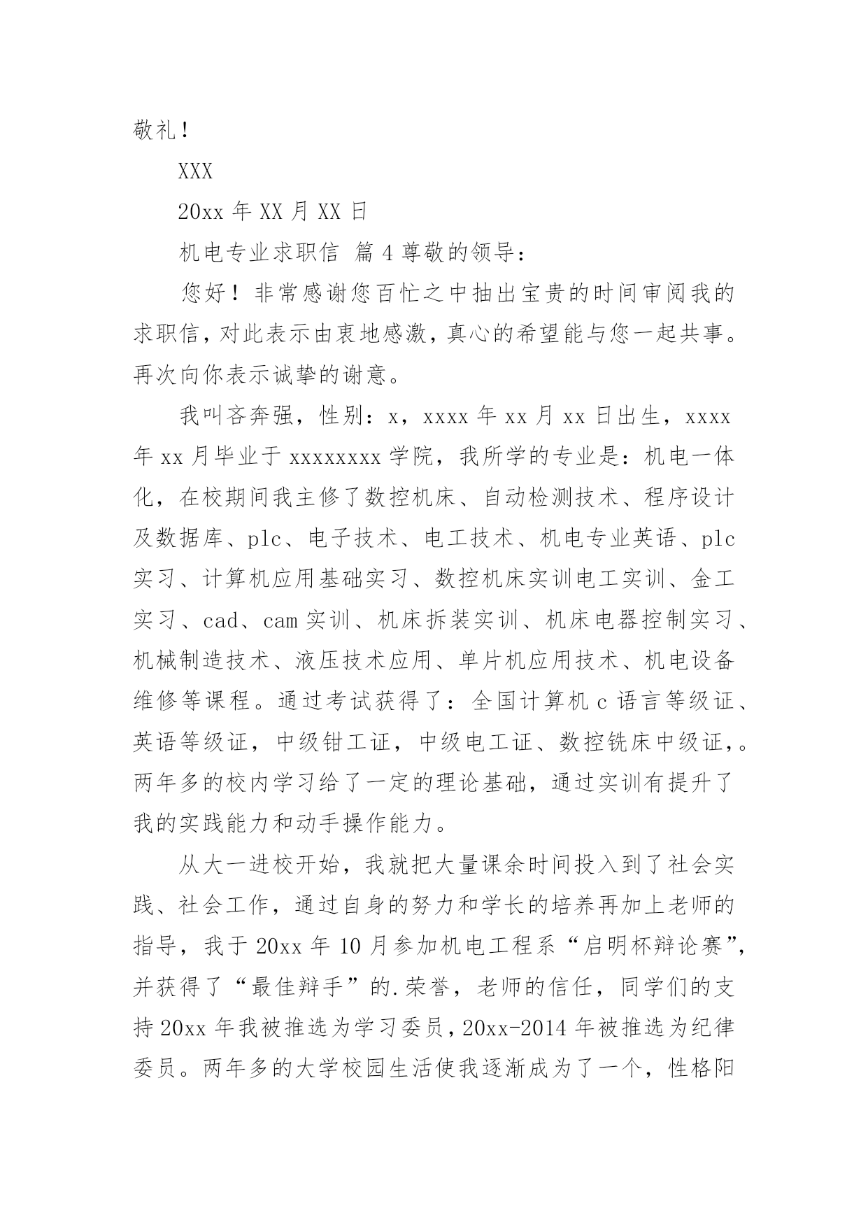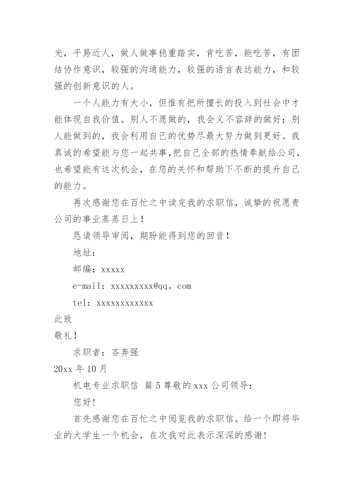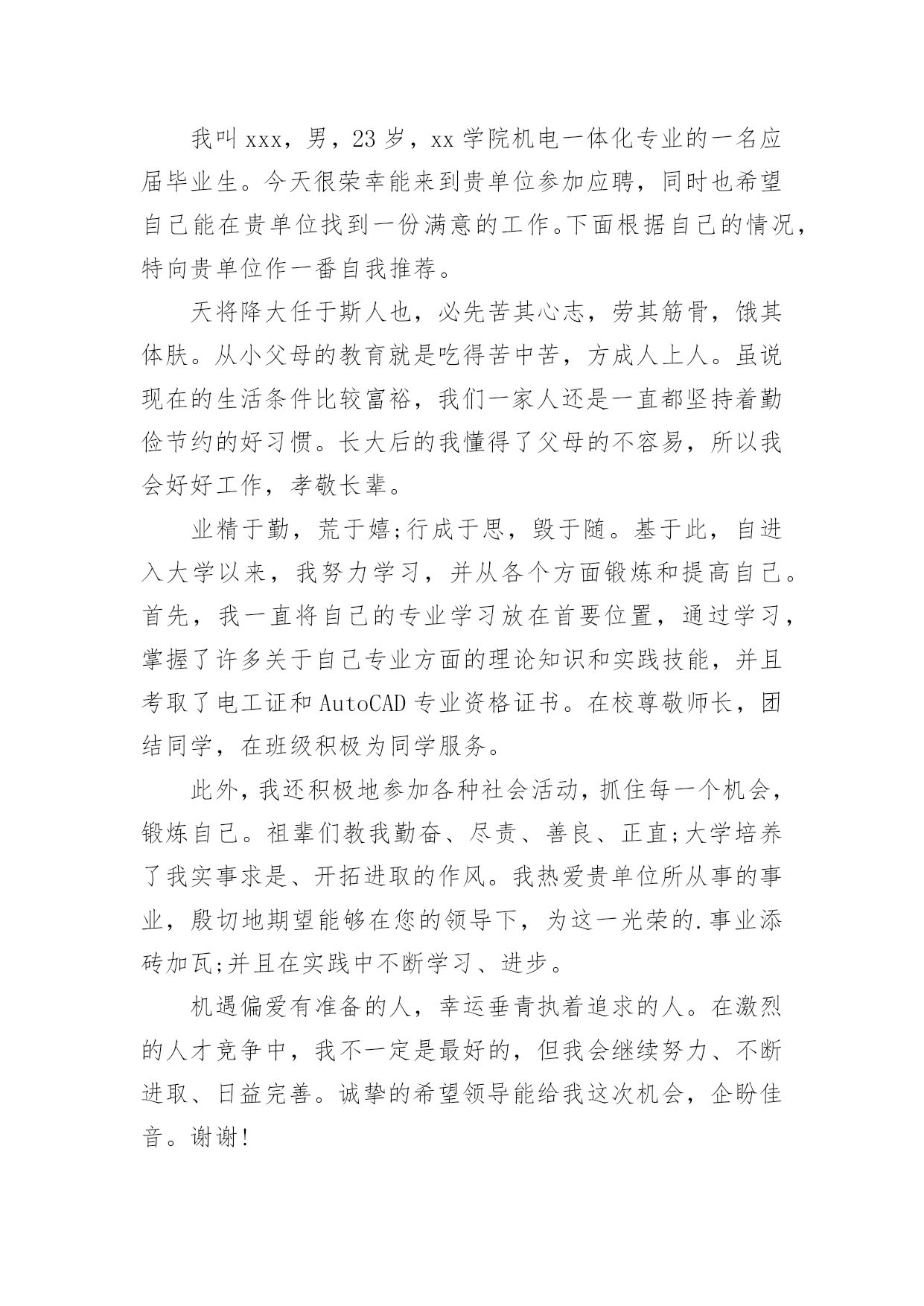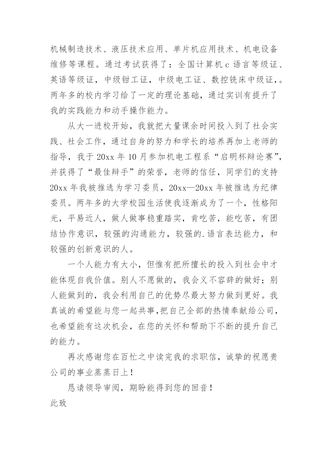 机电专业求职信机电专业求职信14篇日子如同白驹过隙,不经意间,我们又将打开新的篇章,寻求新的工作机会,这时一封好的求职信可以起到毛遂自荐的作用哦。但是怎么写才更能吸引眼球呢?下面是小编精心整理的机电专业求职信,仅供参考,欢迎大家阅读。机电专业求职信篇1尊崇的贵公司指导:您好首先真诚地感激您在百忙之中阅读我的求职信,这对一个行将迈出校门的先生而言,将是一份莫大的鼓舞。这是一份复杂而又朴实的求职信。也许它的普通没深深地吸住您的目光,但它却蕴涵着一颗真诚的心。为此,我诚心央求您能阅读这份普通的求职信!我是一名榆林工业学院机电一体化专业行将毕业的一名先生,名叫樊广艳,我怀着一颗热诚的心和对事业的固执追求,真诚地向您引荐本人。我是在几年的学习生活中,我零碎学习了机械根底、机电一体化零碎等专业知识。在校时期停止过屡次机械及电学的课程设计实习和屡次社会理论活动,并曾在多家公司做过兼职任务。我深知本人短少了“名牌大学毕业生”这一光环,因而,我付出了加倍的努力来补偿,以进步本人的'竞争力。本人四年来的耕耘获得了播种,我自信本人已具有了争取失业时机的实力,而将来的事业更要靠本人去探究和拼搏。我作为一名刚从学校走出来的大先生,我的经历缺乏或许您优柔寡断,但请您置信我的干劲与努力将补偿这暂时的缺乏,也许我不是最好的,但我相对是最努力的。我置信:用心一定能博得精彩!再次感激您为我留出工夫,来阅读我的自荐书,谨祝贵公司业绩蒸蒸日上!此致敬礼!机电专业求职信篇2尊敬的xx:首先衷心感谢您在百忙之中浏览我的自荐信,为一位满腔热情的我开启一扇希望之门。我叫xxx,是一名即将于20xx年07月毕业于云南省楚雄州技工学校,机电制药专业的学生。借此择业之际,我怀着一颗赤诚的心和对事业的执著追求,真诚地推荐自己。我热爱视光学与应用专业,在校期间,系统学习了机电制药专业的理论与实践知识,还学习了有关机电设备方面的知识,并且以社会对人才的'需求为向导,努力使自己向复合型人才方向发展,在课余时间,学习计算机知识,熟悉Windows98操作系统,熟练使用网络,能够快速的在网上查找所需要的资料。在20xx年07月通过了电工计算机等考试,并取得了优异成绩。就个人来讲,在校参加绘画大赛获得二等奖,在校期间一直担任学生干部,在班内一直任团支部一职,具有一定的工作能力及组织协调能力,具有较强的责任心,能够吃苦耐劳、诚实、自信、敬业。我有很强的动手能力,并且脚踏实地的努力的办好每一件事。积极参加操作性较强的实习和设计,因为我深知,在现今社会中,空有理论是远远不够的,需要将所学理论应用到实际中去,例如深入了解机电制药的知识,还有到制药厂进行了解。过去并不代表未来,勤奋才是真实的内涵,对于实际工作我相信,我能够很快适应工作环境,熟悉业务,并且在实际工作中不断学习,不断完善自己,做好本职工作。“惧怀逸兴思斗志,欲上青天揽日月。”期待您的反馈!此致敬礼机电专业求职信篇3尊敬的领导:非常感谢您百忙之中抽出宝贵的时间审阅我的求职信,对此表示由衷地感激,真心的希望能与您一起共事。再次向你表示诚挚的谢意。我叫吝奔强,性别:x,20xx年xx月xx日出生,20xx年xx月毕业于xxxxxxxx学院,我所学的专业是:机电一体化,在校期间我主修了数控机床、自动检测技术、程序设计及数据库、plc、电子技术、电工技术、机电专业英语、plc实习、计算机应用基础实习、数控机床实训电工实训、金工实习、cad、cam实训、机床拆装实训、机床电器控制实习、机械制造技术、液压技术应用、单片机应用技术、机电设备维修等课程。通过考试获得了:全国计算机c语言等级证、英语等级证,中级钳工证,中级电工证、数控铣床中级证,。两年多的校内学习给了一定的理论基础,通过实训有提升了我的实践能力和动手操作能力。从大一进校开始,我就把大量课余时间投入到了社会实践、社会工作,通过自身的努力和学长的培养再加上老师的指导,我于20xx年10月参加机电工程系“启明杯辩论赛”,并获得了“最佳辩手”的荣誉,老师的信任,同学们的支持20xx年我被推选为学习委员,20xx—20xx年被推选为纪律委员。两年多的大学校园生活使我逐渐成为了一个,性格阳光,平易近人,做人做事稳重踏实,肯吃苦,能吃苦,有团结协作意识,较强的沟通能力,较强的.语言表达能力,和较强的创新意识的人。一个人能力有大小,但惟有把所擅长的投入到社会中才能体现自我价值。别人不愿做的,我会义不容辞的做好;别人能做到的,我会利用自己的优势尽最大努力做到更好。我真诚的希望能与您一起共事,把自己全部的热情奉献给公司,也希望能有这次机会,在您的关怀和帮助下不断的提升自己的能力。再次感谢您在百忙之中读完我的求职信,诚挚的祝愿贵公司的事业蒸蒸日上!恳请领导审阅,期盼能得到您的回音!此致敬礼!XXX20xx年XX