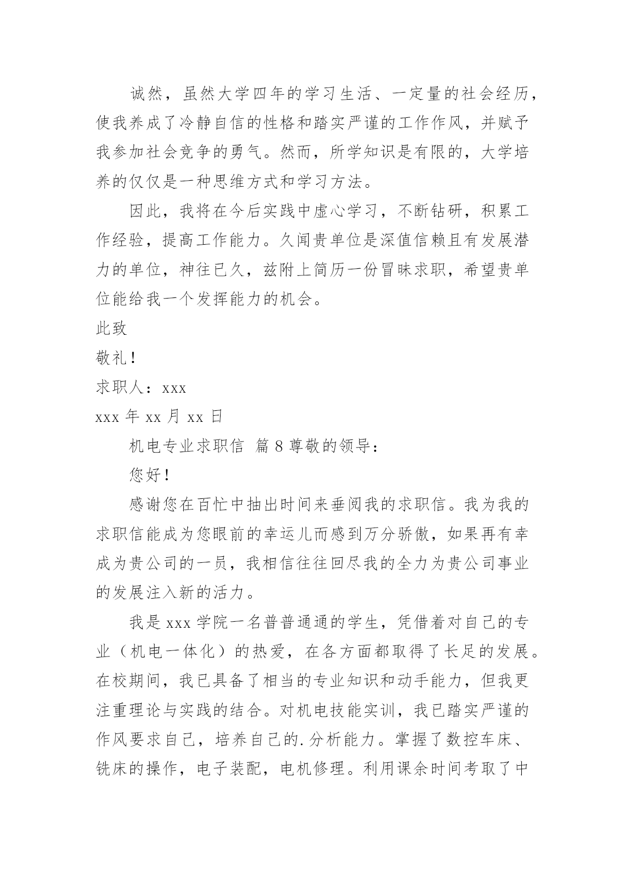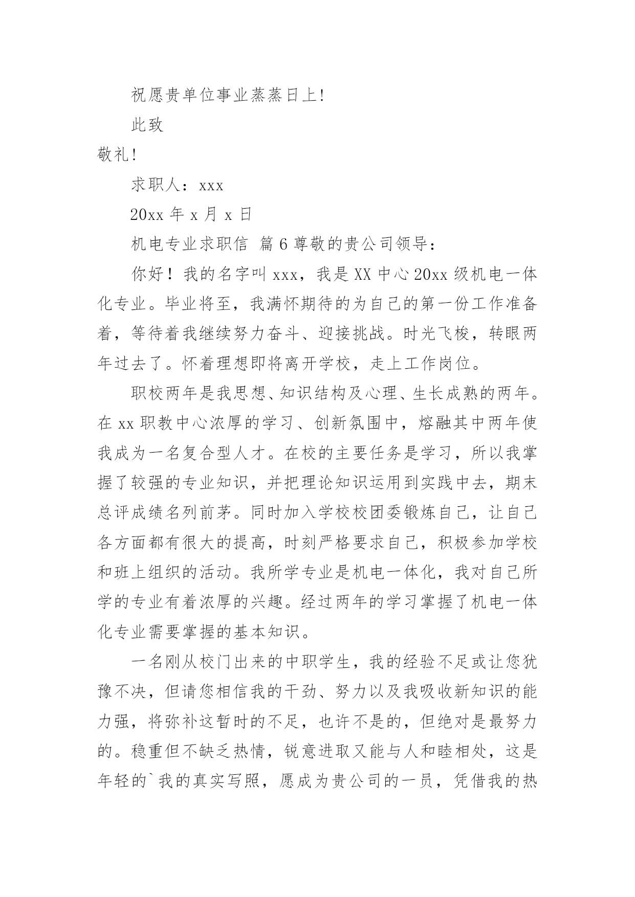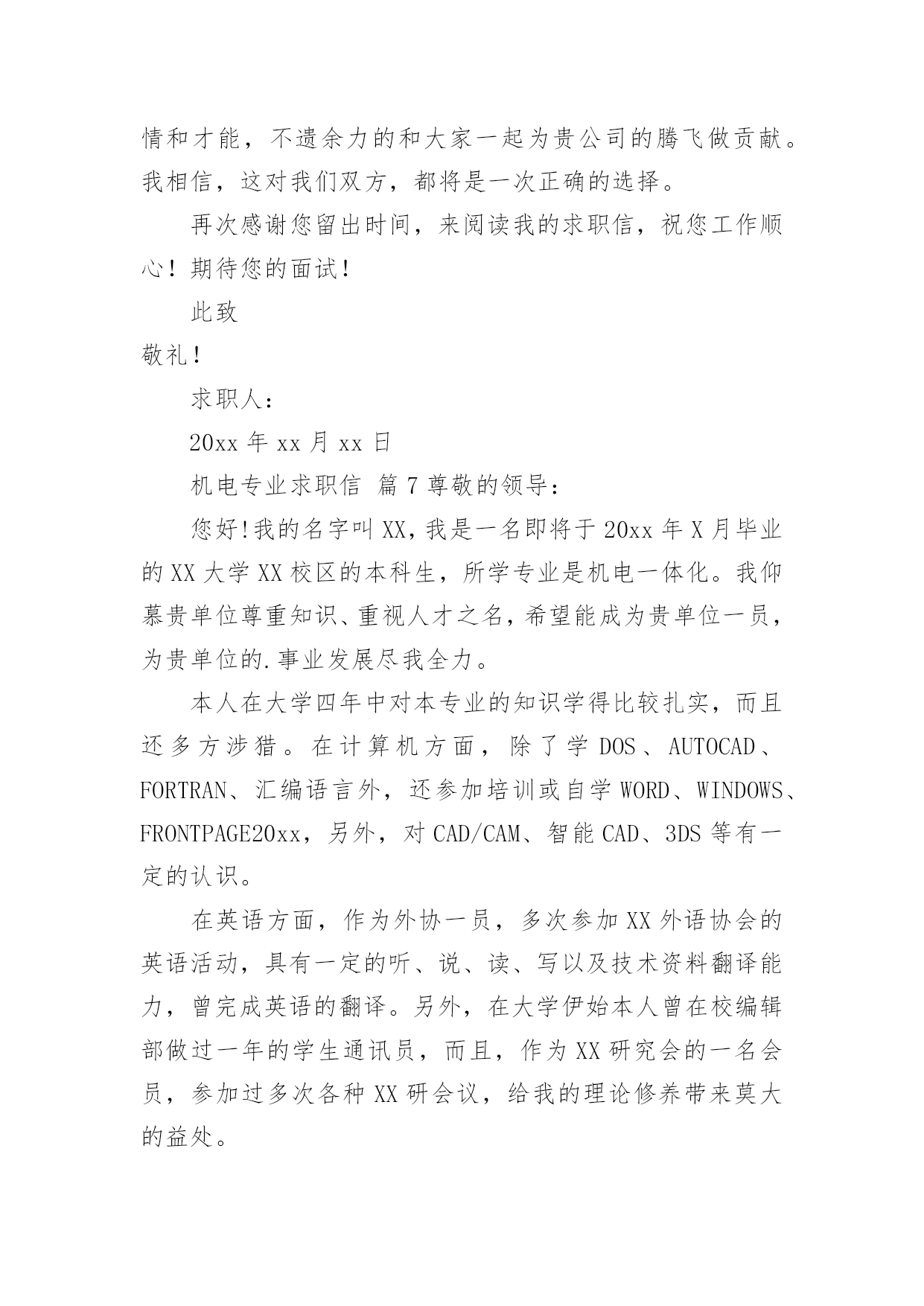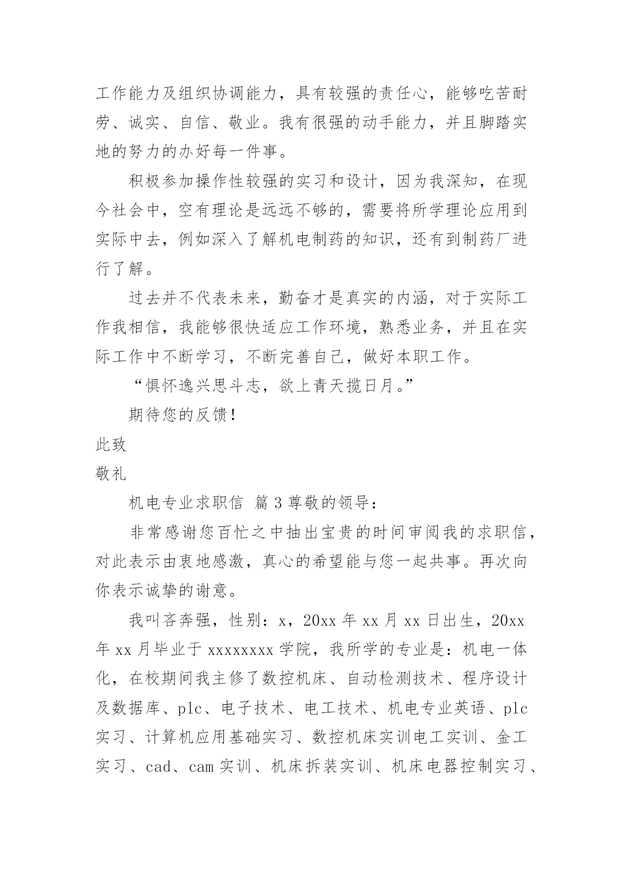 机电专业求职信机电专业求职信14篇日子如同白驹过隙,不经意间,我们又将打开新的篇章,寻求新的工作机会,这时一封好的求职信可以起到毛遂自荐的作用哦。但是怎么写才更能吸引眼球呢?下面是小编精心整理的机电专业求职信,仅供参考,欢迎大家阅读。机电专业求职信篇1尊崇的贵公司指导:您好首先真诚地感激您在百忙之中阅读我的求职信,这对一个行将迈出校门的先生而言,将是一份莫大的鼓舞。这是一份复杂而又朴实的求职信。也许它的普通没深深地吸住您的目光,但它却蕴涵着一颗真诚的心。为此,我诚心央求您能阅读这份普通的求职信!我是一名榆林工业学院机电一体化专业行将毕业的一名先生,名叫樊广艳,我怀着一颗热诚的心和对事业的固执追求,真诚地向您引荐本人。我是在几年的学习生活中,我零碎学习了机械根底、机电一体化零碎等专业知识。在校时期停止过屡次机械及电学的课程设计实习和屡次社会理论活动,并曾在多家公司做过兼职任务。我深知本人短少了“名牌大学毕业生”这一光环,因而,我付出了加倍的努力来补偿,以进步本人的'竞争力。本人四年来的耕耘获得了播种,我自信本人已具有了争取失业时机的实力,而将来的事业更要靠本人去探究和拼搏。我作为一名刚从学校走出来的大先生,我的经历缺乏或许您优柔寡断,但请您置信我的干劲与努力将补偿这暂时的缺乏,也许我不是最好的,但我相对是最努力的。我置信:用心一定能博得精彩!再次感激您为我留出工夫,来阅读我的自荐书,谨祝贵公司业绩蒸蒸日上!此致敬礼!机电专业求职信篇2尊敬的xx:首先衷心感谢您在百忙之中浏览我的自荐信,为一位满腔热情的我开启一扇希望之门。我叫xxx,是一名即将于20xx年07月毕业于云南省楚雄州技工学校,机电制药专业的学生。借此择业之际,我怀着一颗赤诚的心和对事业的执著追求,真诚地推荐自己。我热爱视光学与应用专业,在校期间,系统学习了机电制药专业的理论与实践知识,还学习了有关机电设备方面的知识,并且以社会对人才的'需求为向导,努力使自己向复合型人才方向发展,在课余时间,学习计算机知识,熟悉Windows98操作系统,熟练使用网络,能够快速的在网上查找所需要的资料。在20xx年07月通过了电工计算机等考试,并取得了优异成绩。就个人来讲,在校参加绘画大赛获得二等奖,在校期间一直担任学生干部,在班内一直任团支部一职,具有一定的工作能力及组织协调能力,具有较强的责任心,能够吃苦耐劳、诚实、自信、敬业。我有很强的动手能力,并且脚踏实地的努力的办好每一件事。积极参加操作性较强的实习和设计,因为我深知,在现今社会中,空有理论是远远不够的,需要将所学理论应用到实际中去,例如深入了解机电制药的知识,还有到制药厂进行了解。过去并不代表未来,勤奋才是真实的内涵,对于实际工作我相信,我能够很快适应工作环境,熟悉业务,并且在实际工作中不断学习,不断完善自己,做好本职工作。“惧怀逸兴思斗志,欲上青天揽日月。”期待您的反馈!此致敬礼机电专业求职信篇3尊敬的领导:非常感谢您百忙之中抽出宝贵的时间审阅我的求职信,对此表示由衷地感激,真心的希望能与您一起共事。再次向你表示诚挚的谢意。我叫吝奔强,性别:x,20xx年xx月xx日出生,20xx年xx月毕业于xxxxxxxx学院,我所学的专业是:机电一体化,在校期间我主修了数控机床、自动检测技术、程序设计及数据库、plc、电子技术、电工技术、机电专业英语、plc实习、计算机应用基础实习、数控机床实训电工实训、金工实习、cad、cam实训、机床拆装实训、机床电器控制实习、机械制造技术、液压技术应用、单片机应用技术、机电设备维修等课程。通过考试获得了:全国计算机c语言等级证、英语等级证,中级钳工证,中级电工证、数控铣床中级证,。两年多的校内学习给了一定的理论基础,通过实训有提升了我的实践能力和动手操作能力。从大一进校开始,我就把大量课余时间投入到了社会实践、社会工作,通过自身的努力和学长的培养再加上老师的指导,我于20xx年10月参加机电工程系“启明杯辩论赛”,并获得了“最佳辩手”的荣誉,老师的信任,同学们的支持20xx年我被推选为学习委员,20xx—20xx年被推选为纪律委员。两年多的大学校园生活使我逐渐成为了一个,性格阳光,平易近人,做人做事稳重踏实,肯吃苦,能吃苦,有团结协作意识,较强的沟通能力,较强的.语言表达能力,和较强的创新意识的人。一个人能力有大小,但惟有把所擅长的投入到社会中才能体现自我价值。别人不愿做的,我会义不容辞的做好;别人能做到的,我会利用自己的优势尽最大努力做到更好。我真诚的希望能与您一起共事,把自己全部的热情奉献给公司,也希望能有这次机会,在您的关怀和帮助下不断的提升自己的能力。再次感谢您在百忙之中读完我的求职信,诚挚的祝愿贵公司的事业蒸蒸日上!恳请领导审阅,期盼能得到您的回音!此致敬礼!XXX20xx年XX