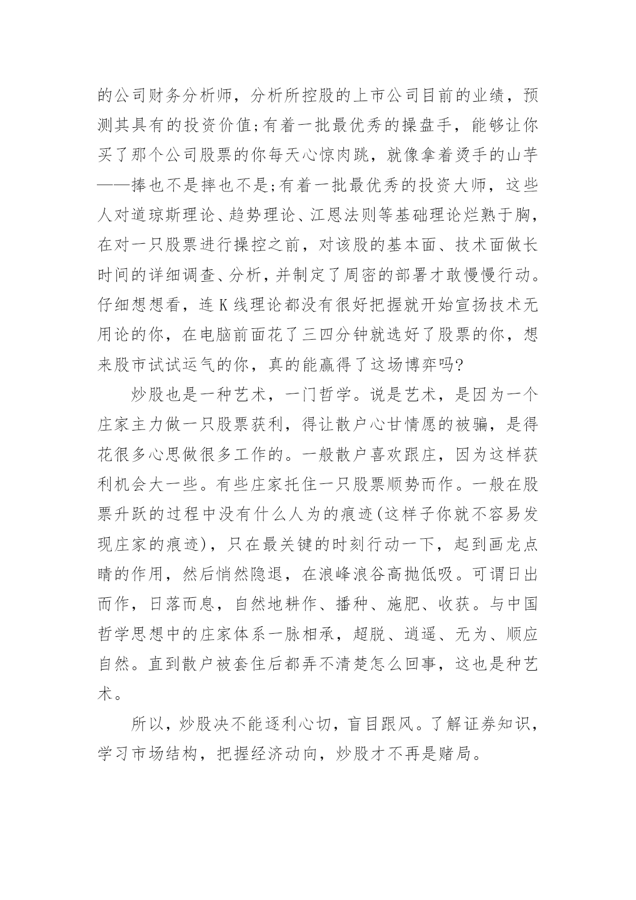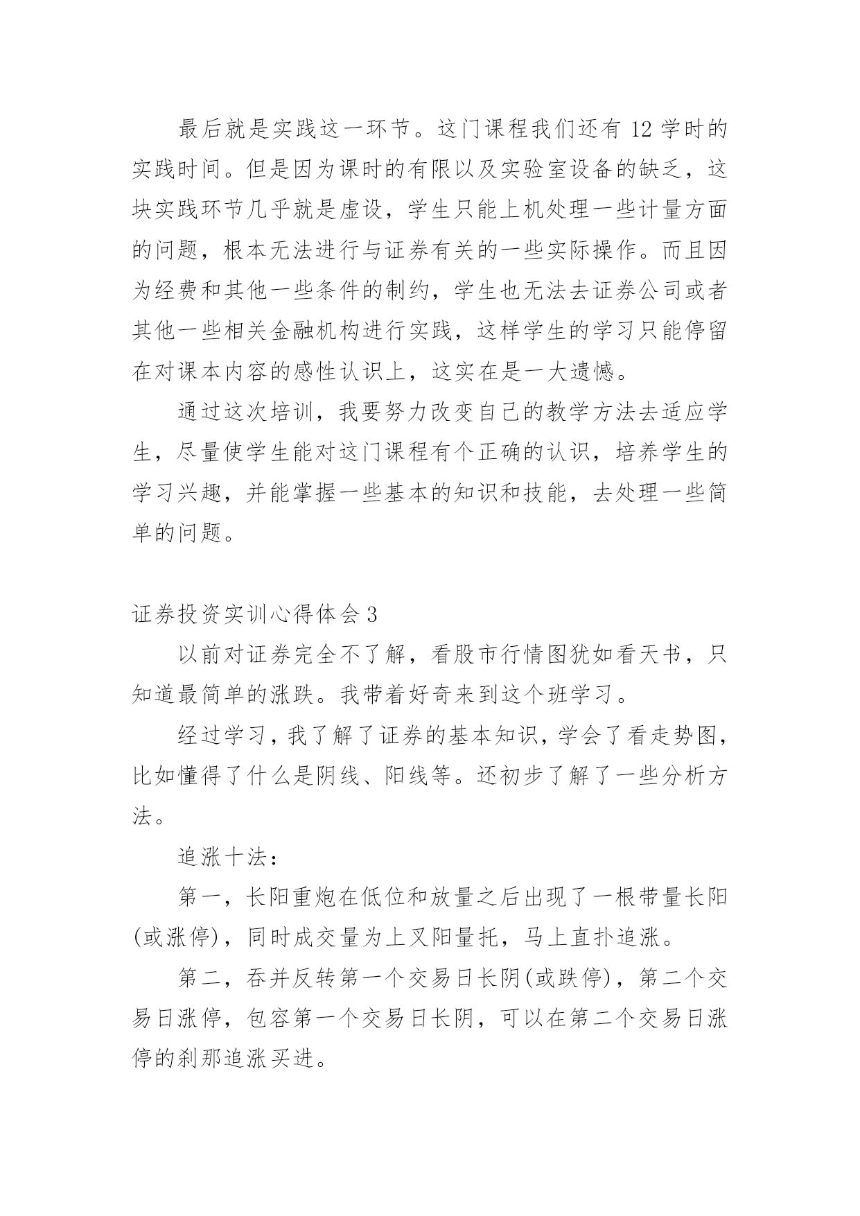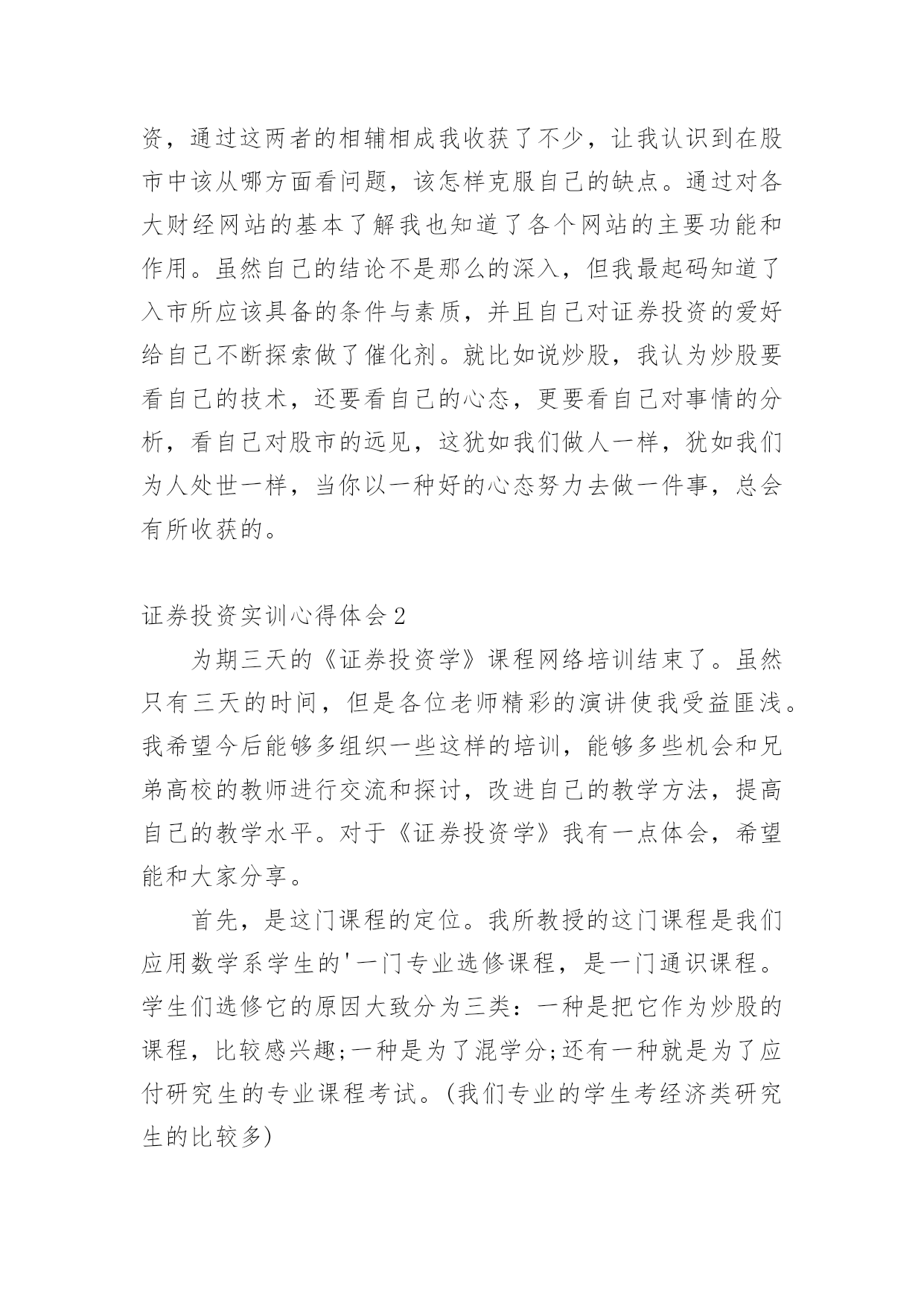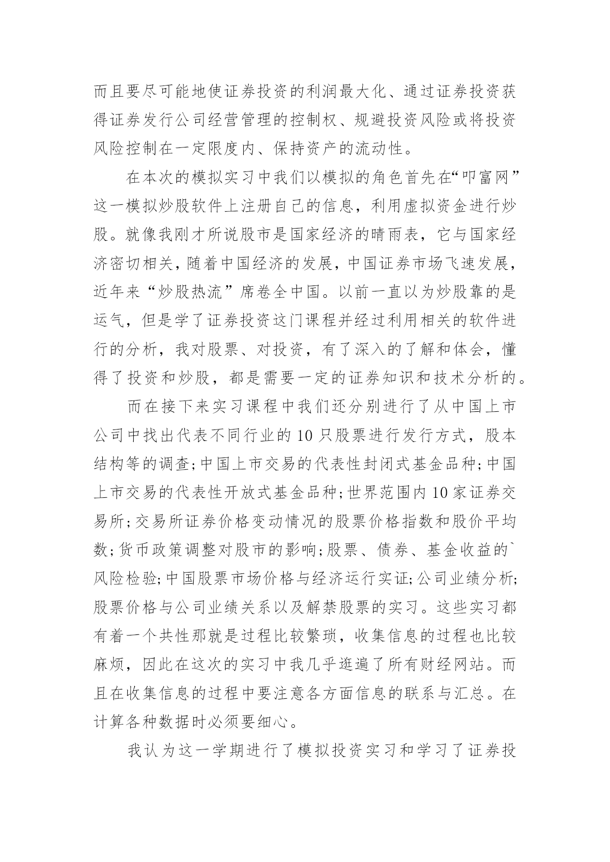 证券投资实训心得体会当我们有一些感想时,就很有必要写一篇心得体会,这样可以不断更新自己的想法。那么你知道心得体会如何写吗?下面是小编帮大家整理的证券投资实训心得体会,仅供参考,大家一起来看看吧。证券投资实训心得体会1我们金融辅修专业进行了一个星期的模拟证券投资和模拟保险实务的实习。在模拟操作中通过这次模拟炒股和各类分析软件,我学到了从理论到实践的运用,巩固了证券投资专业知识,了解到不少上市公司的状况,对整个市场经济也有了更深入的了解,更重要的是培养了关注财经新闻的好习惯。在以前就经常听说“股市是经济的晴雨表”这一说法,而在本学期证券投资学理论的学习中我对这句话的理解也更加深入。我们都知道证券投资是一定的投资主体为了获取预期的不确定的收益购买资本证券以形成金融资产的经济活动。简言之,证券投资就是购买资本证券。证券投资有不同的的证券主体,通过在课堂上的学习我们知道个人投资者、机构投资者、企业投资者、政府投资者是证券市场上主要的主体和组成成分。这四者或通过制定有关政策或经过参加市场操作,例如买进卖出股票和债券来多多少少地影响着证券市场。他们采取各种行为的目的,无非有四种:获取利润,而且要尽可能地使证券投资的利润最大化、通过证券投资获得证券发行公司经营管理的控制权、规避投资风险或将投资风险控制在一定限度内、保持资产的流动性。在本次的模拟实习中我们以模拟的角色首先在“叩富网”这一模拟炒股软件上注册自己的信息,利用虚拟资金进行炒股。就像我刚才所说股市是国家经济的晴雨表,它与国家经济密切相关,随着中国经济的发展,中国证券市场飞速发展,近年来“炒股热流”席卷全中国。以前一直以为炒股靠的是运气,但是学了证券投资这门课程并经过利用相关的软件进行的分析,我对股票、对投资,有了深入的了解和体会,懂得了投资和炒股,都是需要一定的证券知识和技术分析的。而在接下来实习课程中我们还分别进行了从中国上市公司中找出代表不同行业的10只股票进行发行方式,股本结构等的调查;中国上市交易的代表性封闭式基金品种;中国上市交易的代表性开放式基金品种;世界范围内10家证券交易所;交易所证券价格变动情况的股票价格指数和股价平均数;货币政策调整对股市的影响;股票、债券、基金收益的`风险检验;中国股票市场价格与经济运行实证;公司业绩分析;股票价格与公司业绩关系以及解禁股票的实习。这些实习都有着一个共性那就是过程比较繁琐,收集信息的过程也比较麻烦,因此在这次的实习中我几乎逛遍了所有财经网站。而且在收集信息的过程中要注意各方面信息的联系与汇总。在计算各种数据时必须要细心。我认为这一学期进行了模拟投资实习和学习了证券投资,通过这两者的相辅相成我收获了不少,让我认识到在股市中该从哪方面看问题,该怎样克服自己的缺点。通过对各大财经网站的基本了解我也知道了各个网站的主要功能和作用。虽然自己的结论不是那么的深入,但我最起码知道了入市所应该具备的条件与素质,并且自己对证券投资的爱好给自己不断探索做了催化剂。就比如说炒股,我认为炒股要看自己的技术,还要看自己的心态,更要看自己对事情的分析,看自己对股市的远见,这犹如我们做人一样,犹如我们为人处世一样,当你以一种好的心态努力去做一件事,总会有所收获的。证券投资实训心得体会2为期三天的《证券投资学》课程网络培训结束了。虽然只有三天的时间,但是各位老师精彩的演讲使我受益匪浅。我希望今后能够多组织一些这样的培训,能够多些机会和兄弟高校的教师进行交流和探讨,改进自己的教学方法,提高自己的教学水平。对于《证券投资学》我有一点体会,希望能和大家分享。首先,是这门课程的定位。我所教授的这门课程是我们应用数学系学生的'一门专业选修课程,是一门通识课程。学生们选修它的原因大致分为三类:一种是把它作为炒股的课程,比较感兴趣;一种是为了混学分;还有一种就是为了应付研究生的专业课程考试。(我们专业的学生考经济类研究生的比较多)因为是专业选修课,所以课时很有限,只有48学时。这48学时只能选择一些比较重要的内容讲解,大部分的内容需要学生自己学习。而且因为这门课程涉及到宏观经济学、微观经济学、金融学、统计学、财务管理、法律制度、政策规范、心理学等方面的知识,是一门综合性学科。而这些学科我们专业都要求学生或必修或选修,所以有些交叉的内容就可以和其他老师沟通一下,避免重复讲解。比如这门课程需要用的统计学和计量方面的内容就可以不用深入讲解,因为学生都已经学过,只要直接拿来用即可。其次,是重点和难点。对于我们理科类专业的学生而言,本门课程的重点为:证券投资工具,包括股票、债券、证券投资基金;证券市场,包括证券发行市场和证券交易市场;证券投资价值分析;证券投资基本面分析,包括宏观分析、行业和板块分析、公司分析;技术分析,包括图形分析、指标分析。难点主要集中在:证券发行市场和证券交易市