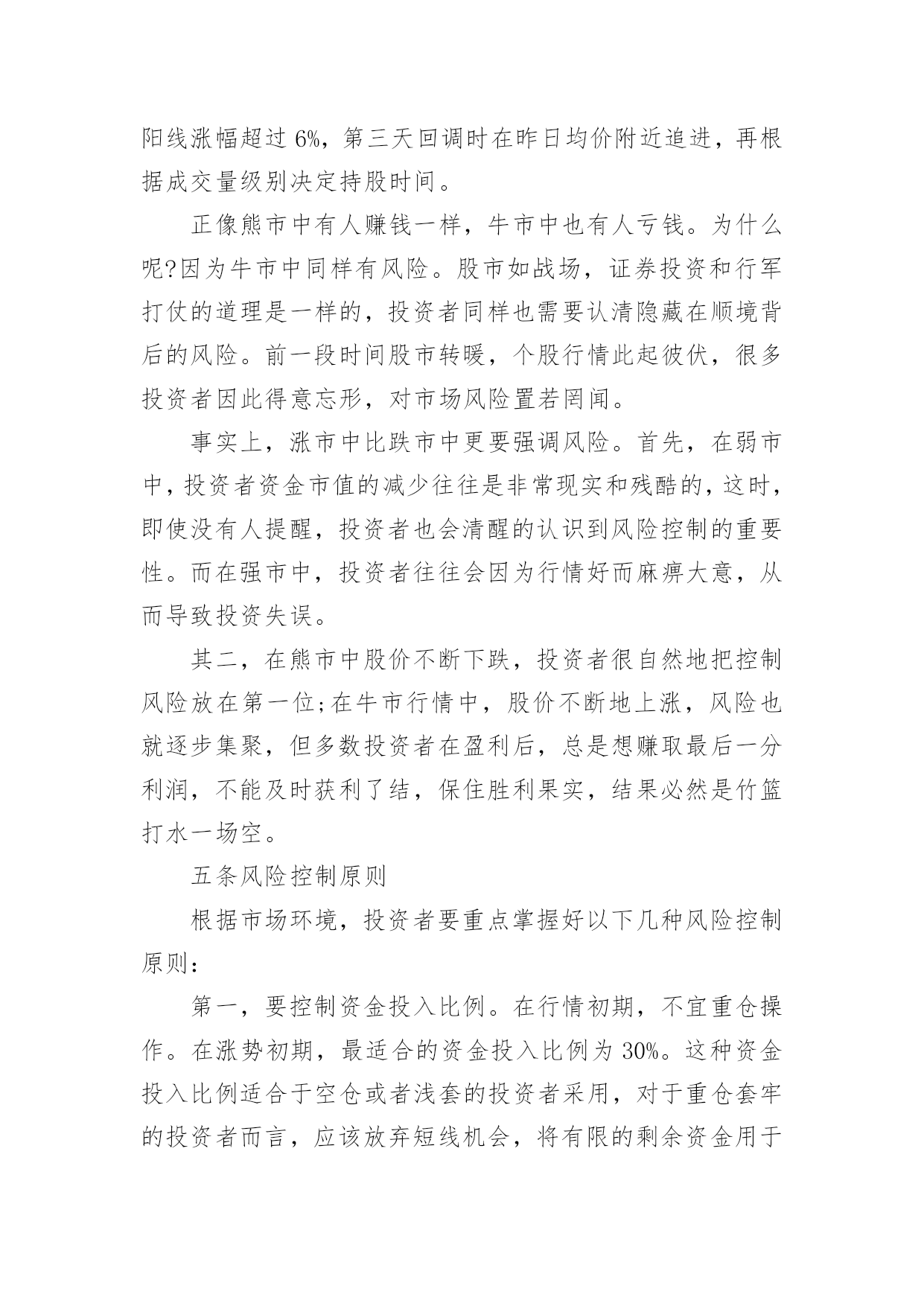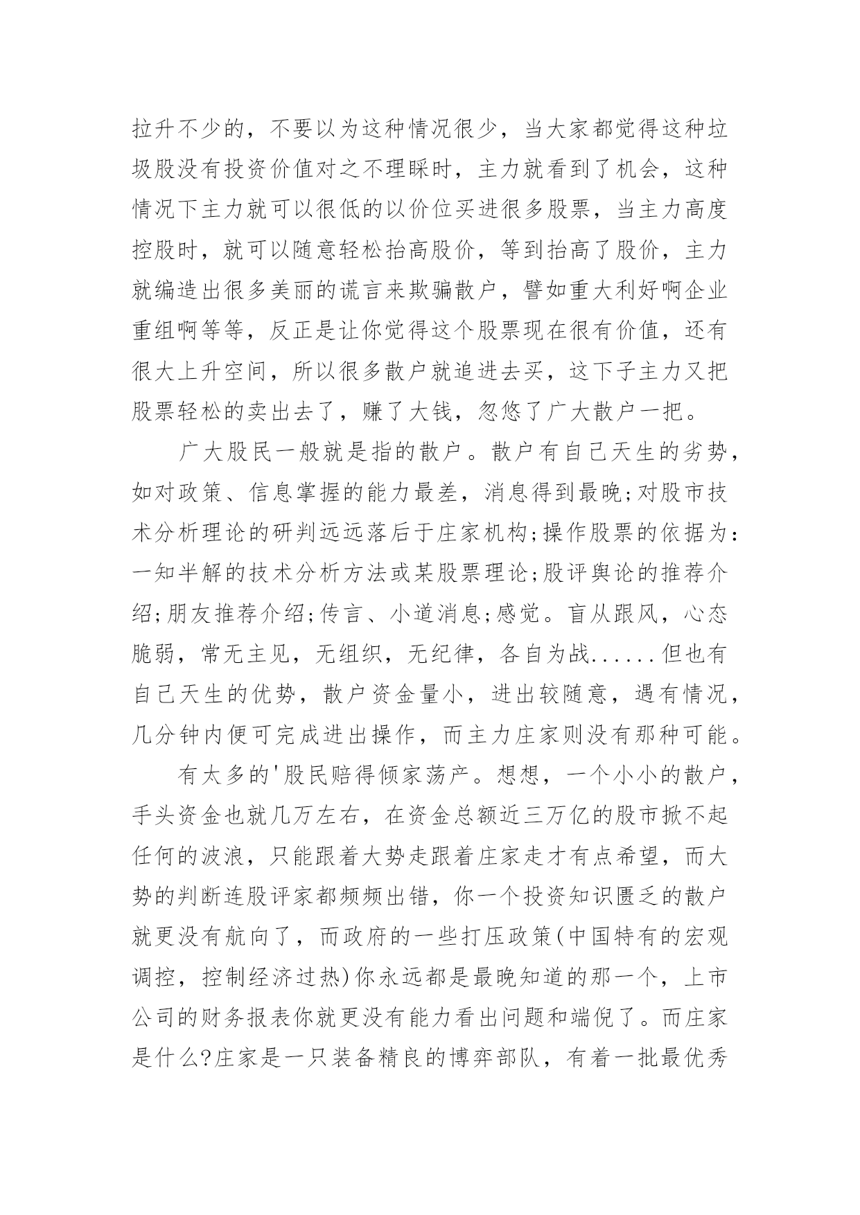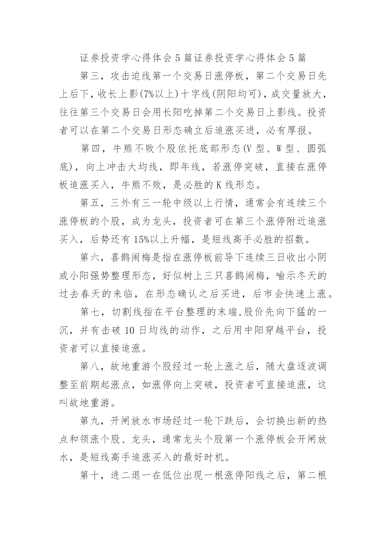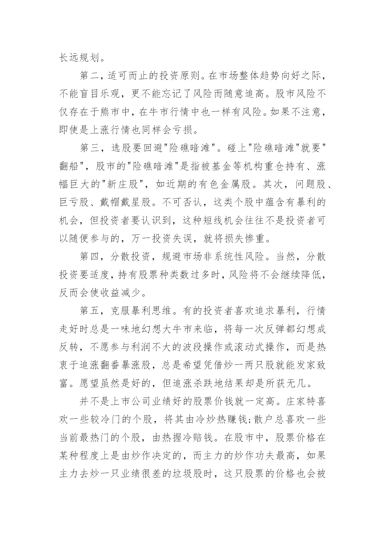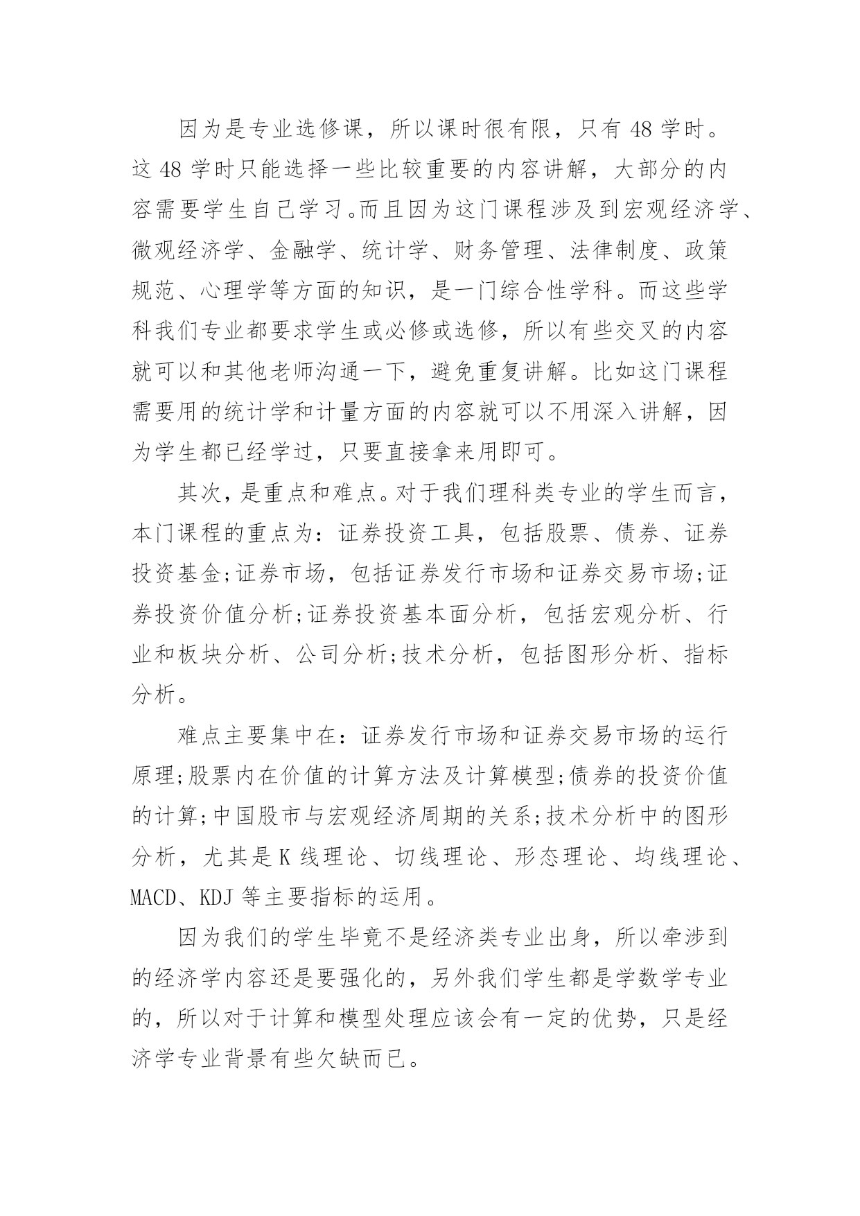 证券投资实训心得体会当我们有一些感想时,就很有必要写一篇心得体会,这样可以不断更新自己的想法。那么你知道心得体会如何写吗?下面是小编帮大家整理的证券投资实训心得体会,仅供参考,大家一起来看看吧。证券投资实训心得体会1我们金融辅修专业进行了一个星期的模拟证券投资和模拟保险实务的实习。在模拟操作中通过这次模拟炒股和各类分析软件,我学到了从理论到实践的运用,巩固了证券投资专业知识,了解到不少上市公司的状况,对整个市场经济也有了更深入的了解,更重要的是培养了关注财经新闻的好习惯。在以前就经常听说“股市是经济的晴雨表”这一说法,而在本学期证券投资学理论的学习中我对这句话的理解也更加深入。我们都知道证券投资是一定的投资主体为了获取预期的不确定的收益购买资本证券以形成金融资产的经济活动。简言之,证券投资就是购买资本证券。证券投资有不同的的证券主体,通过在课堂上的学习我们知道个人投资者、机构投资者、企业投资者、政府投资者是证券市场上主要的主体和组成成分。这四者或通过制定有关政策或经过参加市场操作,例如买进卖出股票和债券来多多少少地影响着证券市场。他们采取各种行为的目的,无非有四种:获取利润,而且要尽可能地使证券投资的利润最大化、通过证券投资获得证券发行公司经营管理的控制权、规避投资风险或将投资风险控制在一定限度内、保持资产的流动性。在本次的模拟实习中我们以模拟的角色首先在“叩富网”这一模拟炒股软件上注册自己的信息,利用虚拟资金进行炒股。就像我刚才所说股市是国家经济的晴雨表,它与国家经济密切相关,随着中国经济的发展,中国证券市场飞速发展,近年来“炒股热流”席卷全中国。以前一直以为炒股靠的是运气,但是学了证券投资这门课程并经过利用相关的软件进行的分析,我对股票、对投资,有了深入的了解和体会,懂得了投资和炒股,都是需要一定的证券知识和技术分析的。而在接下来实习课程中我们还分别进行了从中国上市公司中找出代表不同行业的10只股票进行发行方式,股本结构等的调查;中国上市交易的代表性封闭式基金品种;中国上市交易的代表性开放式基金品种;世界范围内10家证券交易所;交易所证券价格变动情况的股票价格指数和股价平均数;货币政策调整对股市的影响;股票、债券、基金收益的`风险检验;中国股票市场价格与经济运行实证;公司业绩分析;股票价格与公司业绩关系以及解禁股票的实习。这些实习都有着一个共性那就是过程比较繁琐,收集信息的过程也比较麻烦,因此在这次的实习中我几乎逛遍了所有财经网站。而且在收集信息的过程中要注意各方面信息的联系与汇总。在计算各种数据时必须要细心。我认为这一学期进行了模拟投资实习和学习了证券投资,通过这两者的相辅相成我收获了不少,让我认识到在股市中该从哪方面看问题,该怎样克服自己的缺点。通过对各大财经网站的基本了解我也知道了各个网站的主要功能和作用。虽然自己的结论不是那么的深入,但我最起码知道了入市所应该具备的条件与素质,并且自己对证券投资的爱好给自己不断探索做了催化剂。就比如说炒股,我认为炒股要看自己的技术,还要看自己的心态,更要看自己对事情的分析,看自己对股市的远见,这犹如我们做人一样,犹如我们为人处世一样,当你以一种好的心态努力去做一件事,总会有所收获的。证券投资实训心得体会2为期三天的《证券投资学》课程网络培训结束了。虽然只有三天的时间,但是各位老师精彩的演讲使我受益匪浅。我希望今后能够多组织一些这样的培训,能够多些机会和兄弟高校的教师进行交流和探讨,改进自己的教学方法,提高自己的教学水平。对于《证券投资学》我有一点体会,希望能和大家分享。首先,是这门课程的定位。我所教授的这门课程是我们应用数学系学生的'一门专业选修课程,是一门通识课程。学生们选修它的原因大致分为三类:一种是把它作为炒股的课程,比较感兴趣;一种是为了混学分;还有一种就是为了应付研究生的专业课程考试。(我们专业的学生考经济类研究生的比较多)因为是专业选修课,所以课时很有限,只有48学时。这48学时只能选择一些比较重要的内容讲解,大部分的内容需要学生自己学习。而且因为这门课程涉及到宏观经济学、微观经济学、金融学、统计学、财务管理、法律制度、政策规范、心理学等方面的知识,是一门综合性学科。而这些学科我们专业都要求学生或必修或选修,所以有些交叉的内容就可以和其他老师沟通一下,避免重复讲解。比如这门课程需要用的统计学和计量方面的内容就可以不用深入讲解,因为学生都已经学过,只要直接拿来用即可。其次,是重点和难点。对于我们理科类专业的学生而言,本门课程的重点为:证券投资工具,包括股票、债券、证券投资基金;证券市场,包括证券发行市场和证券交易市场;证券投资价值分析;证券投资基本面分析,包括宏观分析、行业和板块分析、公司分析;技术分析,包括图形分析、指标分析。难点主要集中在:证券发行市场和证券交易市