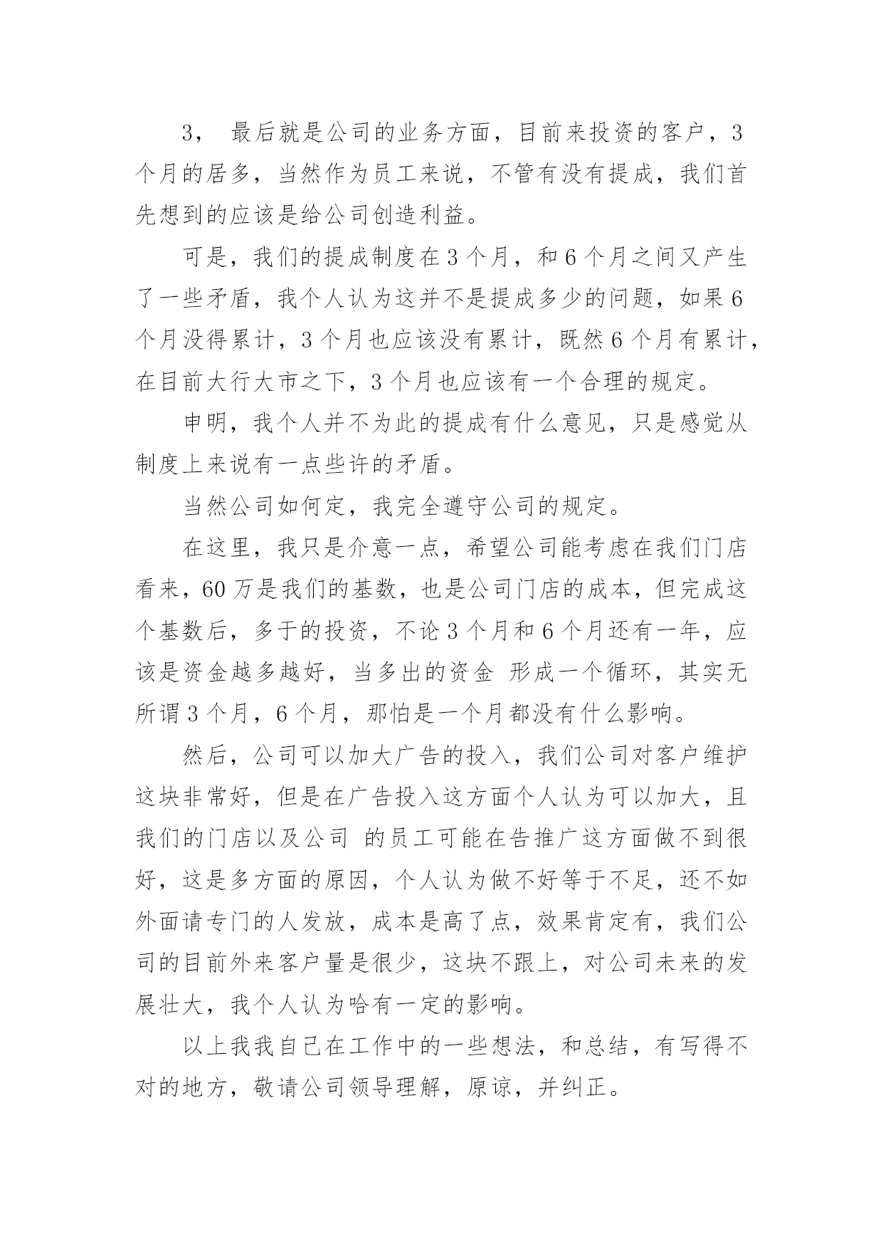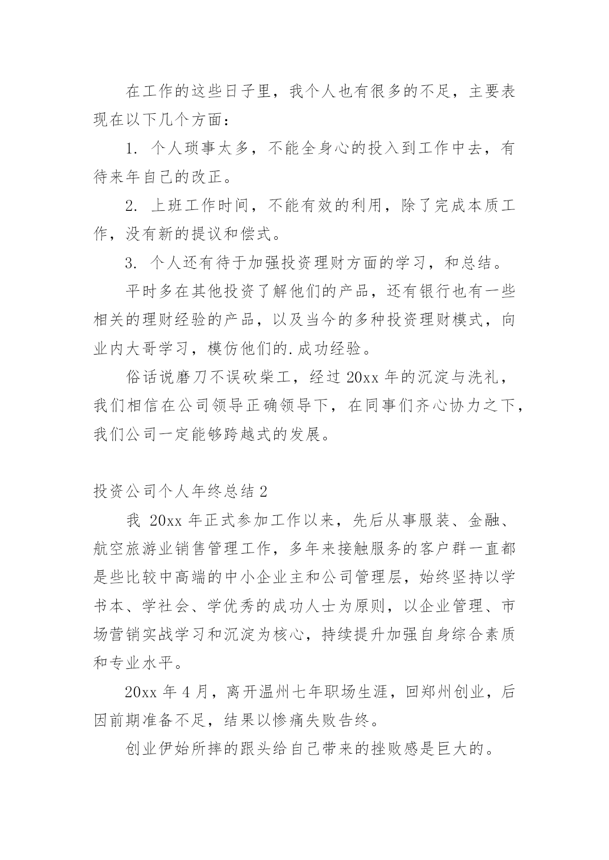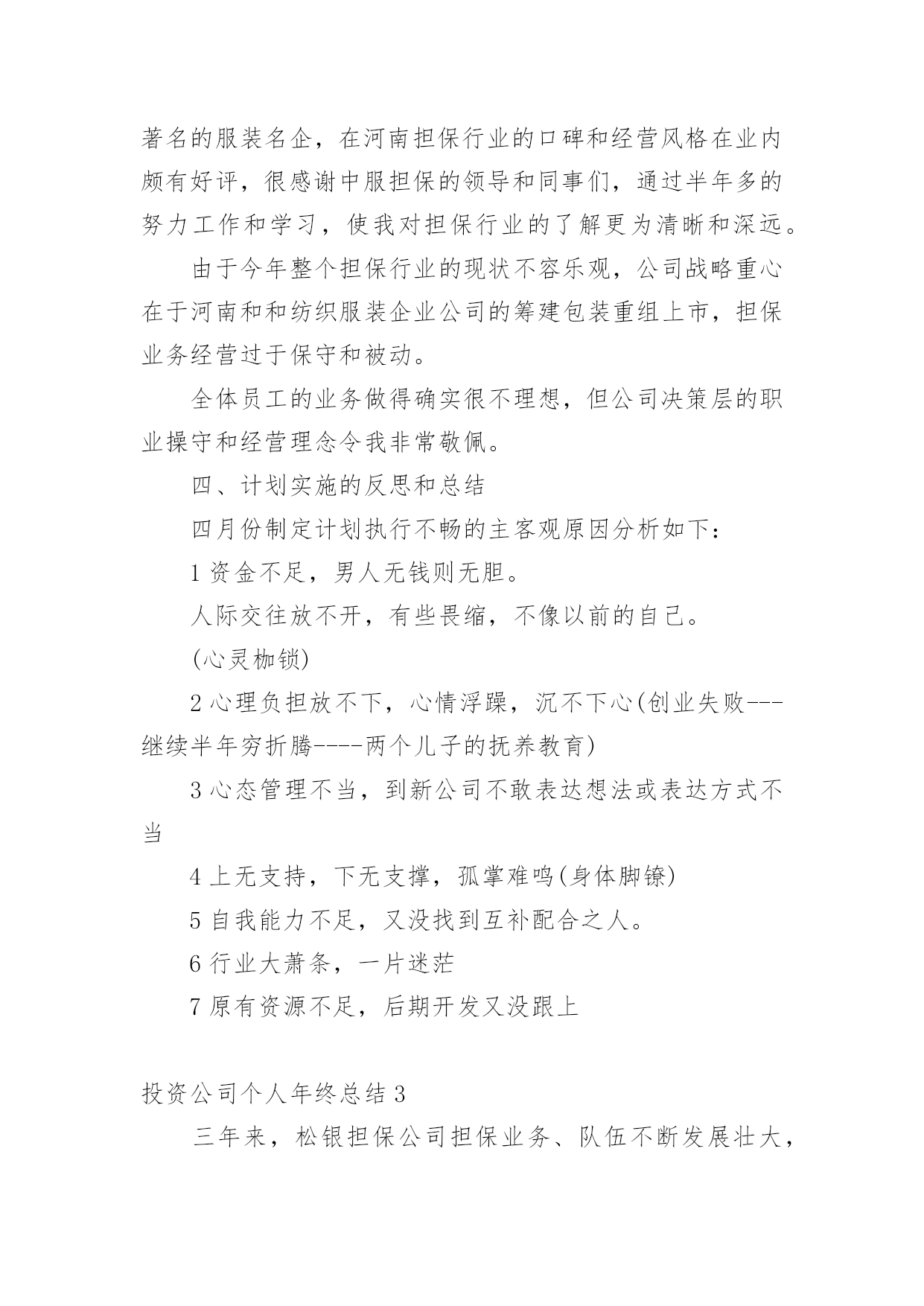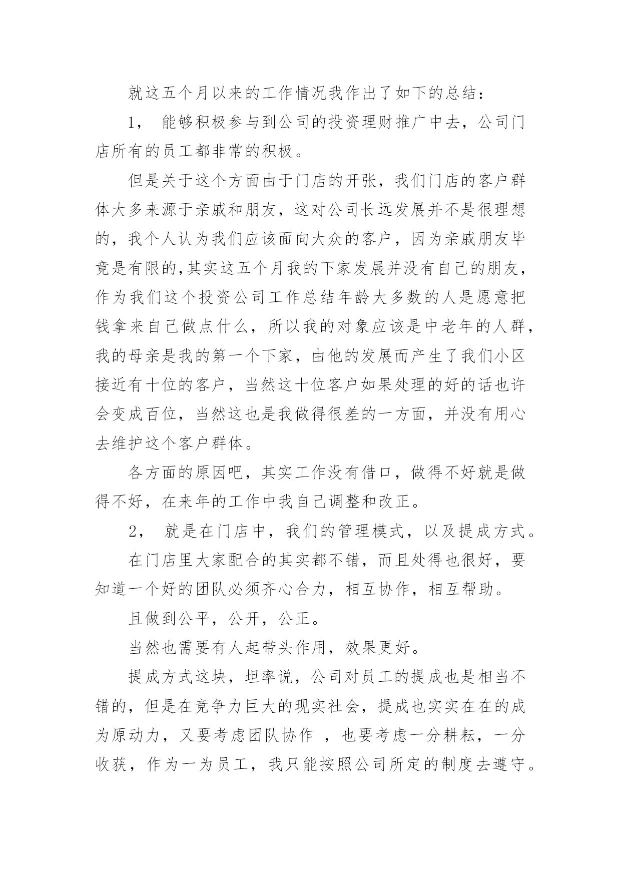投资公司个人年终总结总结是在某一特定时间段对学习和工作生活或其完成情况,包括取得的成绩、存在的问题及得到的经验和教训加以回顾和分析的书面材料,它是增长才干的一种好办法,让我们来为自己写一份总结吧。但是总结有什么要求呢?下面是小编帮大家整理的投资公司个人年终总结,希望能够帮助到大家。投资公司个人年终总结1时间一晃而过,弹指之间,20xx年已接近尾声,过去的一年在领导和同事们的悉心关怀和指导下,通过和同事的不懈努力,在工作上取得了一定的成果,但也存在了诸多不足。回顾过去的一年,现将工作总结如下:从8月23日到公司工作已有近五个月的时间,从外围业务员到坐班,从无工资到每月四千左右的工资,感谢公司给予的机会和信任,在这五个月的工作中,也遇到了很多的问题,对于公司的发展,以及公司对员工的那种亲切感让我非常的感动,在投资这个行业,目前竞争力是非常的大的,从另外一个角度上来说,资阳这么多投资公司,各个公司的发展方向,目的都不一样,且国家的政策也不太明确,说白了每个公司都在摸索中发展。对于我公司的发展方向,和长远的规化,我个人是非常认同,并且有愿意积极参与到公司的发展中去。就这五个月以来的工作情况我作出了如下的总结:1,能够积极参与到公司的投资理财推广中去,公司门店所有的员工都非常的积极。但是关于这个方面由于门店的开张,我们门店的客户群体大多来源于亲戚和朋友,这对公司长远发展并不是很理想的,我个人认为我们应该面向大众的客户,因为亲戚朋友毕竟是有限的,其实这五个月我的下家发展并没有自己的朋友,作为我们这个投资公司工作总结年龄大多数的人是愿意把钱拿来自己做点什么,所以我的对象应该是中老年的人群,我的母亲是我的第一个下家,由他的发展而产生了我们小区接近有十位的客户,当然这十位客户如果处理的好的话也许会变成百位,当然这也是我做得很差的一方面,并没有用心去维护这个客户群体。各方面的原因吧,其实工作没有借口,做得不好就是做得不好,在来年的工作中我自己调整和改正。2,就是在门店中,我们的管理模式,以及提成方式。在门店里大家配合的其实都不错,而且处得也很好,要知道一个好的团队必须齐心合力,相互协作,相互帮助。且做到公平,公开,公正。当然也需要有人起带头作用,效果更好。提成方式这块,坦率说,公司对员工的提成也是相当不错的,但是在竞争力巨大的现实社会,提成也实实在在的成为原动力,又要考虑团队协作,也要考虑一分耕耘,一分收获,作为一为员工,我只能按照公司所定的制度去遵守。3,最后就是公司的业务方面,目前来投资的客户,3个月的居多,当然作为员工来说,不管有没有提成,我们首先想到的应该是给公司创造利益。可是,我们的提成制度在3个月,和6个月之间又产生了一些矛盾,我个人认为这并不是提成多少的问题,如果6个月没得累计,3个月也应该没有累计,既然6个月有累计,在目前大行大市之下,3个月也应该有一个合理的规定。申明,我个人并不为此的提成有什么意见,只是感觉从制度上来说有一点些许的矛盾。当然公司如何定,我完全遵守公司的规定。在这里,我只是介意一点,希望公司能考虑在我们门店看来,60万是我们的基数,也是公司门店的成本,但完成这个基数后,多于的投资,不论3个月和6个月还有一年,应该是资金越多越好,当多出的资金形成一个循环,其实无所谓3个月,6个月,那怕是一个月都没有什么影响。然后,公司可以加大广告的投入,我们公司对客户维护这块非常好,但是在广告投入这方面个人认为可以加大,且我们的门店以及公司的员工可能在告推广这方面做不到很好,这是多方面的原因,个人认为做不好等于不足,还不如外面请专门的人发放,成本是高了点,效果肯定有,我们公司的目前外来客户量是很少,这块不跟上,对公司未来的发展壮大,我个人认为哈有一定的影响。以上我我自己在工作中的一些想法,和总结,有写得不对的地方,敬请公司领导理解,原谅,并纠正。在工作的这些日子里,我个人也有很多的不足,主要表现在以下几个方面:1.个人琐事太多,不能全身心的投入到工作中去,有待来年自己的改正。2.上班工作时间,不能有效的利用,除了完成本质工作,没有新的提议和偿式。3.个人还有待于加强投资理财方面的学习,和总结。平时多在其他投资了解他们的产品,还有银行也有一些相关的理财经验的产品,以及当今的多种投资理财模式,向业内大哥学习,模仿他们的.成功经验。俗话说磨刀不误砍柴工,经过20xx年的沉淀与洗礼,我们相信在公司领导正确领导下,在同事们齐心协力之下,我们公司一定能够跨越式的发展。投资公司个人年终总结2我20xx年正式参加工作以来,先后从事服装、金融、航空旅游业销售管理工作,多年来接触服务的客户群一直都是些比较中高端的中小企业主和公司管理层,始终坚持以学书本、学社会、学优秀的成功人士为原则,以企业管理、市场营销实战学习和沉淀为核心,持续提升加强自身综合