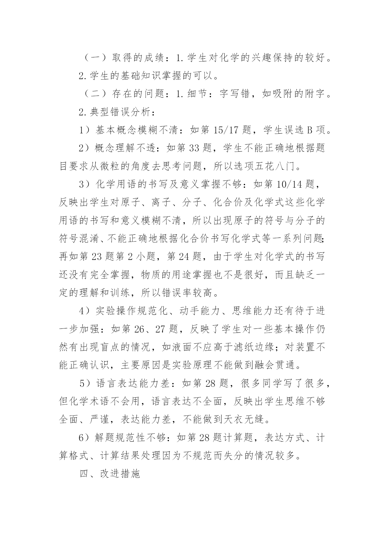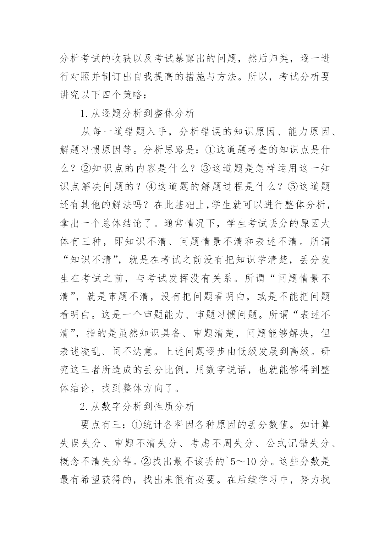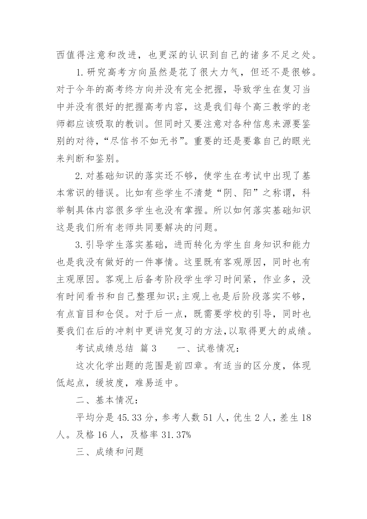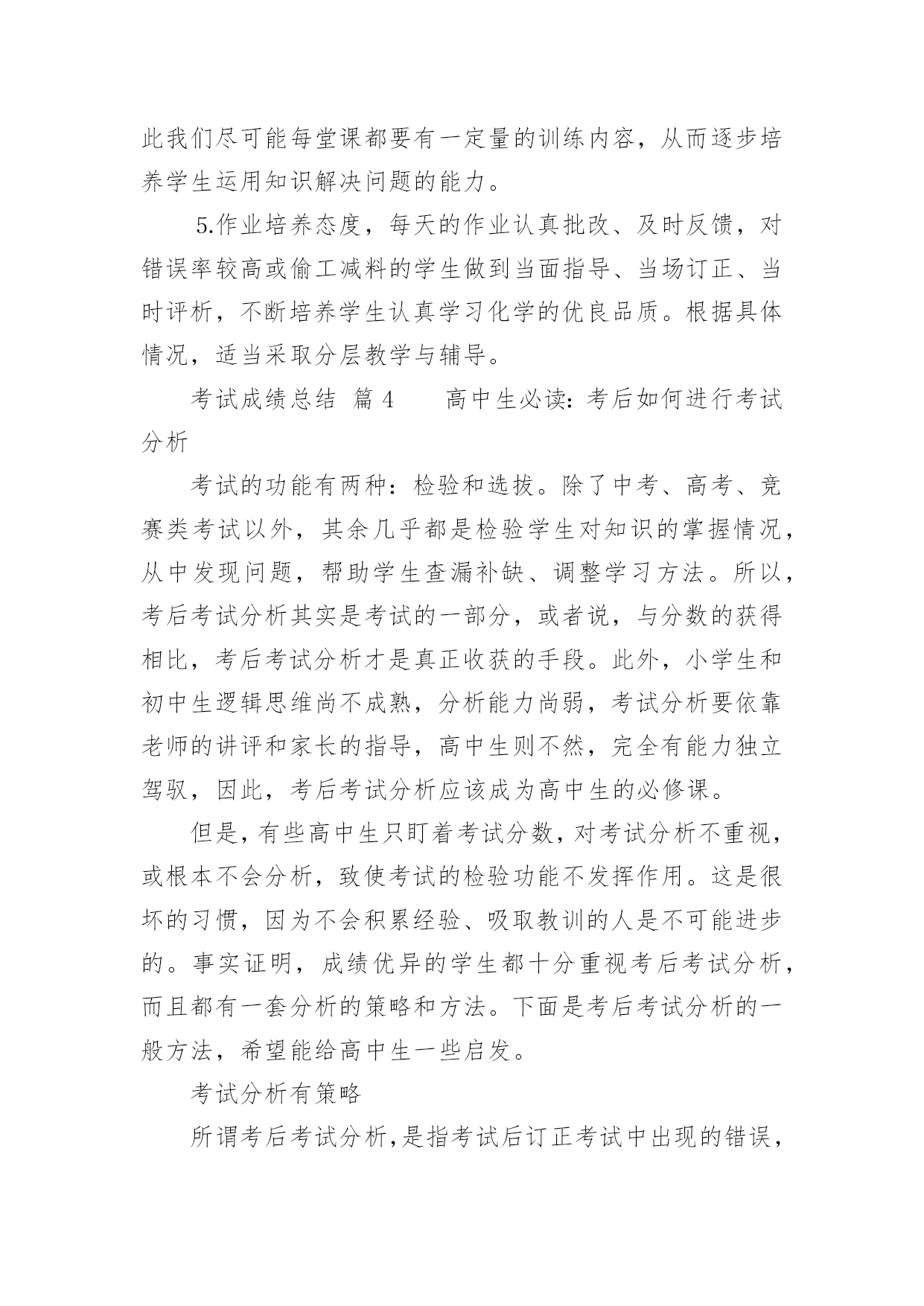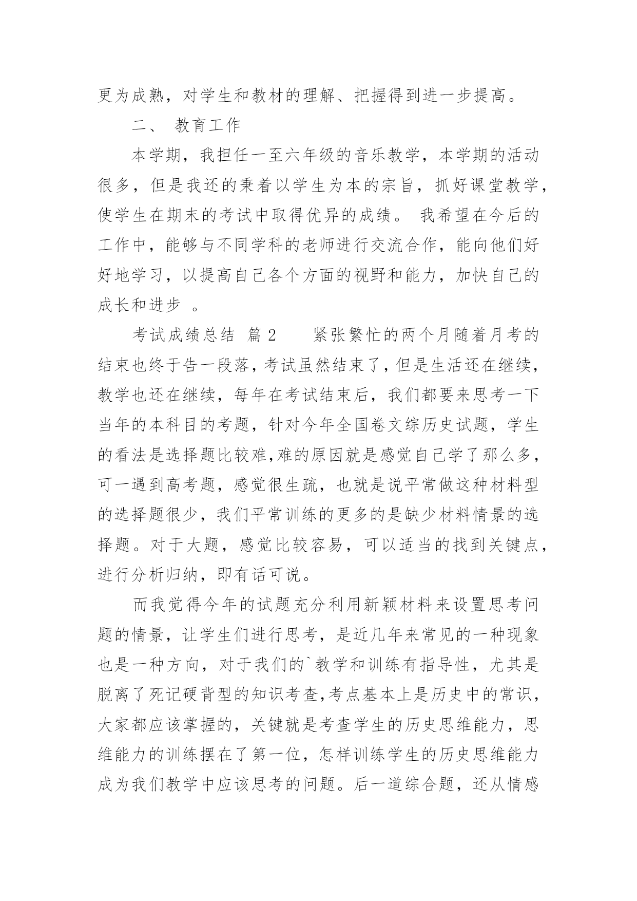 考试成绩总结考试成绩总结总结是指对某一阶段的工作、学习或思想中的经验或情况加以总结和概括的书面材料,他能够提升我们的书面表达能力,是时候写一份总结了。总结怎么写才能发挥它的作用呢?以下是小编帮大家整理的考试成绩总结,仅供参考,大家一起来看看吧。考试成绩总结篇1时光荏苒,忙碌中时间脚步已经悄然走远,转眼一个学期就要过去了。的确,我们在过去的一学期中忙碌着、辛苦着、奔波着,同时也收获着,在这里,我对自己这一学期来的思想和工作情况做一个回顾和总结,以促进今后能更好的做好教育教学的工作。一、教学方面:1、认真备课:本学期我采用的是书面备课的形式,按要求有单元教学目标、教材分析,每一课也都有教学目标、教学重难点、教学准备和详细的教学过程(学生、教师活动预设)。反思:在备课中,还没有能够做到对教材的充分理解和把握,对学生活动的预设考虑不够周全,应在备课之前增加对学生情况的分析,这样才能在备课中更加全面和完善。2、认真制定教学计划:在对各年级的学生进行分析、对教材进行了解的基础上,以《音乐课程标准》为依据,制定出相应的教学计划。当然教学计划应根据儿童身心发展的规律,结合孩子的实际情况,教学计划应该再详细一点。3、认真上课:注意培养学生的学习习惯,如听音乐起立问好、听到相应的音乐保持安静。按照备课的准备实施教学活动,完成教学目标,本学期期末,多数同学能达到优秀。反思:在课堂教学中,虽然有预先制定的教学目标和详细的过程,但是,学生的回答不可能完全按照老师的意愿进行,这给教师提出了新的要求,要及时、灵活的对学生的回答做出有效评价,这是我在今后的教学中要改进的地方;另外,在制定教学目标和教学重难点上,要结合学生实际情况,不能过难或者过于简单,除了活跃课堂气氛外,要让学生真正地参与到音乐活动中来,让学生对音乐产生、保持浓厚的'兴趣……这些都是我在今后的工作应该努力和改进的地方。4、认真考核:按照《xx——xx年学年度上期期末检测方案》对学生进行考核。反思:在制定方案中,有些可能还不够完善,检测、评价的方式较单一,不利于孩子音乐素质的全面提高,这是我在今后的工作中还应该思考和努力的地方。5、课后反思:本学期,由于镇里举行了体艺21活动展示,老师们精心组织,学生认真练习,精心准备,活动展示受到了区级领导老师的一致好评。总的说来,本学期,在教学工作中我做的还不够,作为一名年轻教师,很多地方还需要提高,应该虚心向其他教师请教学习,多参与听、评课的活动,努力使自己的课堂教学更为成熟,对学生和教材的理解、把握得到进一步提高。二、教育工作本学期,我担任一至六年级的音乐教学,本学期的活动很多,但是我还的秉着以学生为本的宗旨,抓好课堂教学,使学生在期末的考试中取得优异的成绩。我希望在今后的工作中,能够与不同学科的老师进行交流合作,能向他们好好地学习,以提高自己各个方面的视野和能力,加快自己的成长和进步。考试成绩总结篇2紧张繁忙的两个月随着月考的结束也终于告一段落,考试虽然结束了,但是生活还在继续,教学也还在继续,每年在考试结束后,我们都要来思考一下当年的本科目的考题,针对今年全国卷文综历史试题,学生的看法是选择题比较难,难的原因就是感觉自己学了那么多,可一遇到高考题,感觉很生疏,也就是说平常做这种材料型的选择题很少,我们平常训练的更多的是缺少材料情景的选择题。对于大题,感觉比较容易,可以适当的找到关键点,进行分析归纳,即有话可说。而我觉得今年的试题充分利用新颖材料来设置思考问题的情景,让学生们进行思考,是近几年来常见的一种现象也是一种方向,对于我们的`教学和训练有指导性,尤其是脱离了死记硬背型的知识考查,考点基本上是历史中的常识,大家都应该掌握的,关键就是考查学生的历史思维能力,思维能力的训练摆在了第一位,怎样训练学生的历史思维能力成为我们教学中应该思考的问题。后一道综合题,还从情感态度价值观角度进行了考查,这也是今年的一个新的结合新课程改革的表现,也应该是一种方向。总之今年的历史高考题还不错,能代表一种方向,具有引导性。从事高三历史教学也有几年了,每年都在思考总结,去年总结时感觉自己还是认识很深的,而且能够吸取经验教训,在今年复习时能有自己的一些成型的套路,特别是引导学生渐渐地进入自主学习状态,把他们真正调动起来是关键的,在复习中我也注意到了提取信息能力的训练,也注意到了引导学生把知识联系起来,建立一定的知识体系,并对学生掌握知识的方法也做了指导,比如让学生“说”历史、小组合作、每日作业进行交流等。但有一项不满意,也是坏的一项,就是做题训练所使用的资料,还是有些陈旧,没有能很好地指导引导学生进行训练,要是能结合高考要求进行一些专门训练,会更加适应高考要求的。另外,在高三历史复习中还是注重、要求学生知识的记忆,还没有把学生从记忆的黑洞中引出来,有时感觉学生中有许多