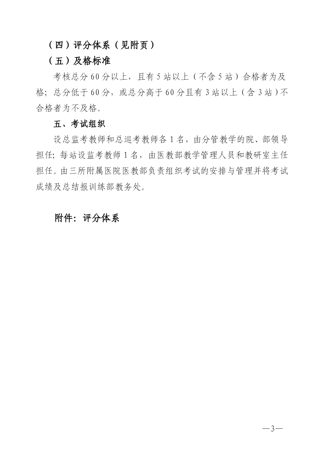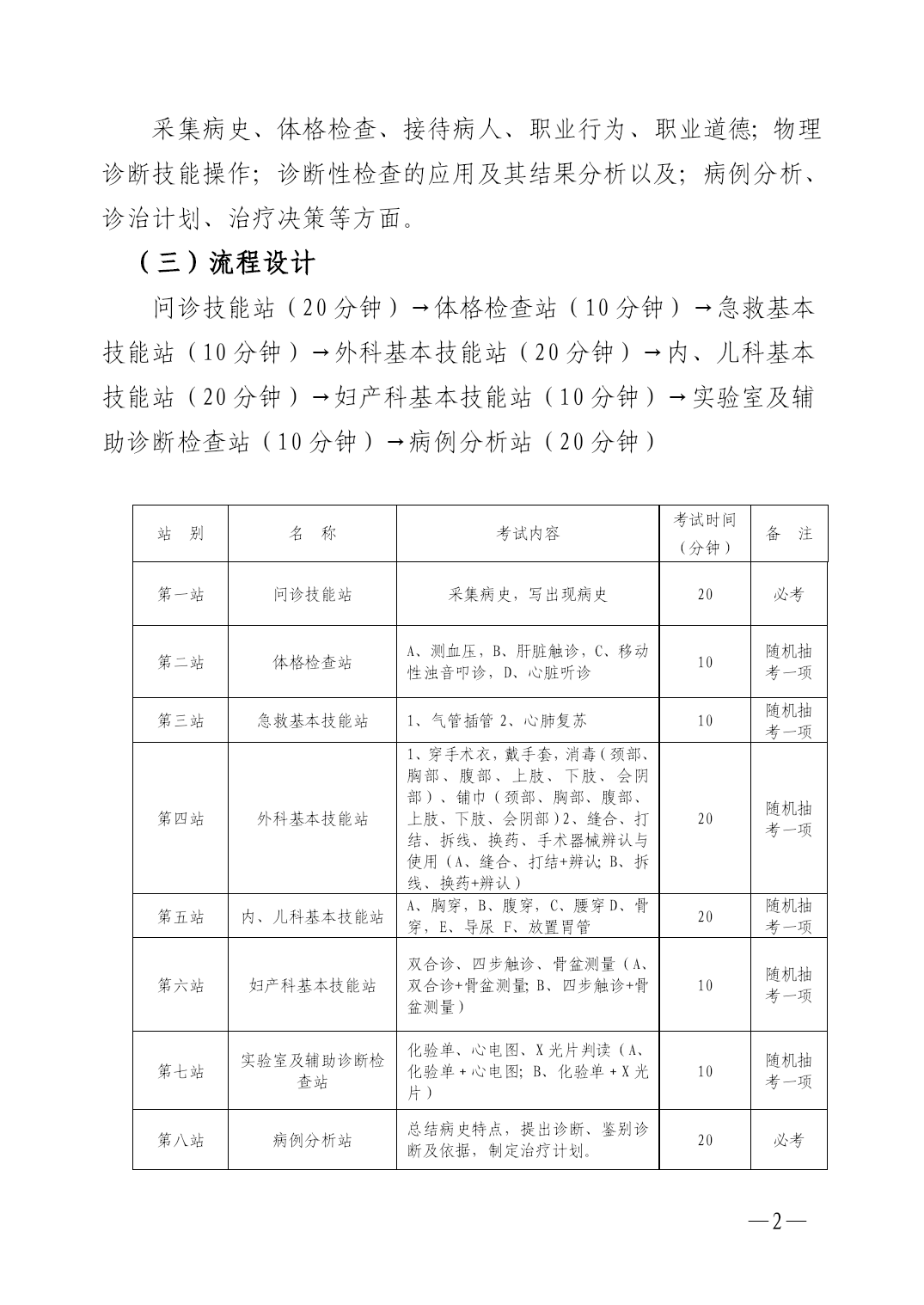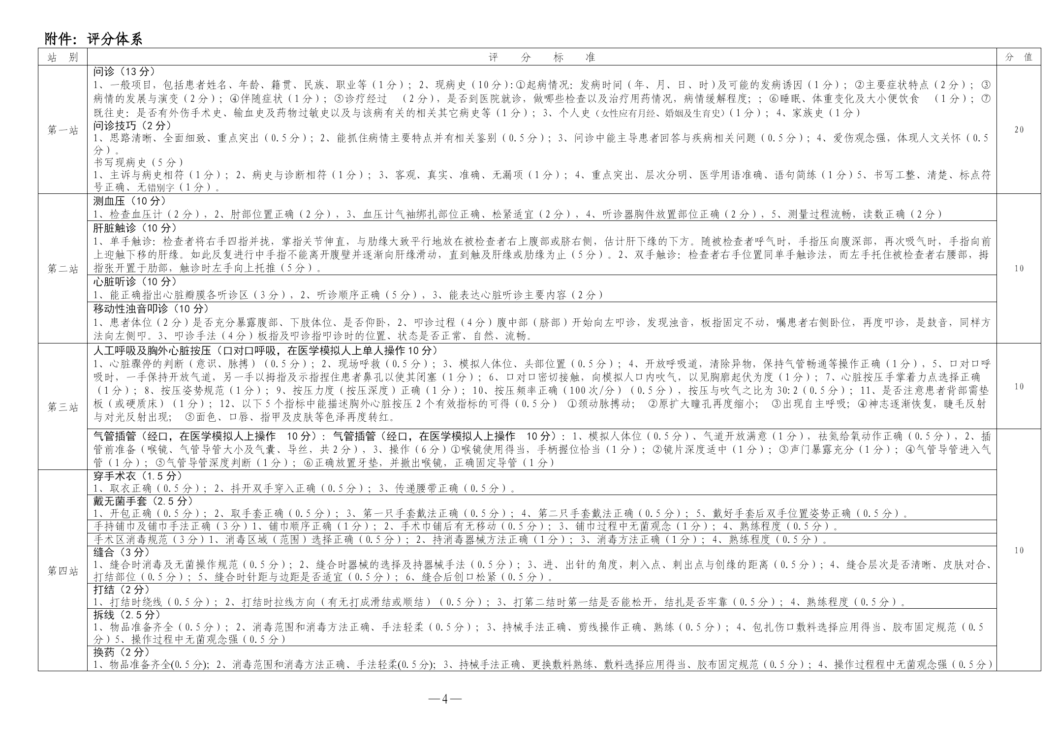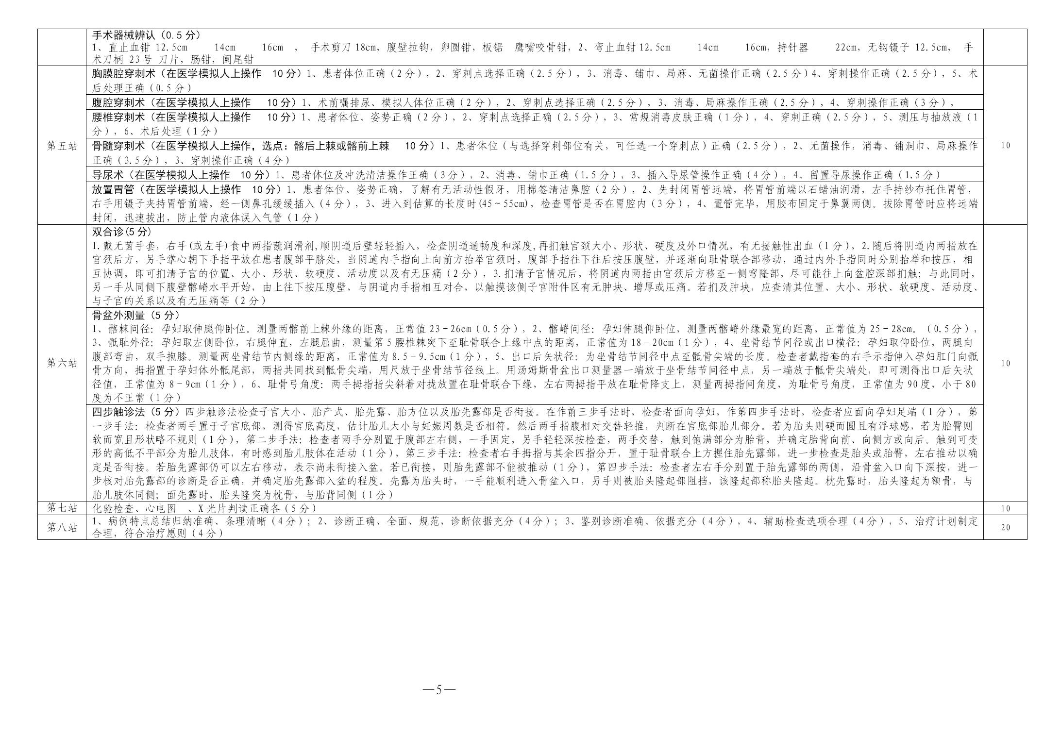 PAGE—PAGE6—客观结构化临床考试方案为进一步规范我校临床实习技能考核,提高临床教学质量和水平,依据医学教育国际标准,结合国家执业医师考试的基本要求,特制定本方案。一、指导思想遵循医学教育国际标准和国家执业医师考核标准,以及强技能、强素质的人才培养要求,坚持实践性原则、客观性原则、保护性原则,强化考核规范,提高实习效果,逐步建立具有我校特色的多站式技能考核系统。二、考试对象临床医学专业五年制本科学员。三、考核时间每学年6月上旬进行,具体时间另行通知。四、考试方法(一)站点设置共设八个站,其中长、短站各4个,分别是第一站(问诊技能站)、第二站(体格检查站)、第三站(急救基本技能站)、第四站(外科基本技能站)、第五站(内、儿科基本技能站)、第六站(妇产科基本技能站)、第七站(实验室及辅助诊断检查站)、第八站(病例分析站)。(二)考试范围采集病史、体格检查、接待病人、职业行为、职业道德;物理诊断技能操作;诊断性检查的应用及其结果分析以及;病例分析、诊治计划、治疗决策等方面。(三)流程设计问诊技能站(20分钟)→体格检查站(10分钟)→急救基本技能站(10分钟)→外科基本技能站(20分钟)→内、儿科基本技能站(20分钟)→妇产科基本技能站(10分钟)→实验室及辅助诊断检查站(10分钟)→病例分析站(20分钟)站别名称考试内容考试时间(分钟)备注第一站问诊技能站采集病史,写出现病史20必考第二站体格检查站A、测血压,B、肝脏触诊,C、移动性浊音叩诊,D、心脏听诊10随机抽考一项第三站急救基本技能站1、气管插管2、心肺复苏10随机抽考一项第四站外科基本技能站1、穿手术衣,戴手套,消毒(颈部、胸部、腹部、上肢、下肢、会阴部)、铺巾(颈部、胸部、腹部、上肢、下肢、会阴部)2、缝合、打结、拆线、换药、手术器械辨认与使用(A、缝合、打结+辨认;B、拆线、换药+辨认)20随机抽考一项第五站内、儿科基本技能站A、胸穿,B、腹穿,C、腰穿D、骨穿,E、导尿F、放置胃管20随机抽考一项第六站妇产科基本技能站双合诊、四步触诊、骨盆测量(A、双合诊+骨盆测量;B、四步触诊+骨盆测量)10随机抽考一项第七站实验室及辅助诊断检查站化验单、心电图、X光片判读(A、化验单﹢心电图;B、化验单﹢X光片)10随机抽考一项第八站病例分析站总结病史特点,提出诊断、鉴别诊断及依据,制定治疗计划。20必考(四)评分体系(见附页)(五)及格标准考核总分60分以上,且有5站以上(不含5站)合格者为及格;总分低于60分,或总分高于60分且有3站以上(含3站)不合格者为不及格。五、考试组织设总监考教师和总巡考教师各1名,由分管教学的院、部领导担任;每站设监考教师1名,由医教部教学管理人员和教研室主任担任。由三所附属医院医教部负责组织考试的安排与管理并将考试成绩及总结报训练部教务处。附件:评分体系附件:评分体系站别评分标准分值第一站问诊(13分)1、一般项目,包括患者姓名、年龄、籍贯、民族、职业等(1分);2、现病史(10分):①起病情况:发病时间(年、月、日、时)及可能的发病诱因(1分);②主要症状特点(2分);③病情的发展与演变(2分);④伴随症状(1分);⑤诊疗经过(2分),是否到医院就诊,做哪些检查以及治疗用药情况,病情缓解程度;;⑥睡眠、体重变化及大小便饮食(1分);⑦既往史:是否有外伤手术史、输血史及药物过敏史以及与该病有关的相关其它病史等(1分);3、个人史(女性应有月经、婚姻及生育史)(1分);4、家族史(1分)问诊技巧(2分)1、思路清晰、全面细致、重点突出(0.5分);2、能抓住病情主要特点并有相关鉴别(0.5分);3、问诊中能主导患者回答与疾病相关问题(0.5分);4、爱伤观念强,体现人文关怀(0.5分)。书写现病史(5分)1、主诉与病史相符(1分);2、病史与诊断相符(1分);3、客观、真实、准确、无漏项(1分);4、重点突出、层次分明、医学用语准确、语句简练(1分)5、书写工整、清楚、标点符号正确、无错别字(1分)。20第二站测血压(10分)1、检查血压计(2分),2、肘部位置正确(2分),3、血压计气袖绑扎部位正确、松紧适宜(2分),4、听诊器胸件放置部位正确(2分),5、测量过程流畅,读数正确(2分)10肝脏触诊(10分)1、单手触诊:检查者将右手四指并拢,掌指关节伸直,与肋缘大致平行地放在被检查者右上腹部或脐右侧,估计肝下缘的下方。随被检查者呼气时,手指压向腹深部,再次吸气时,手指向前上迎触下移的肝缘。如此反复进行中手指不能离开腹壁并逐渐向肝缘滑动,直到触及肝缘或肋缘为止(5分)。2、双手触诊:检查者右手位置同单手触诊法,而左手托住被检查者右腰部,拇指张
