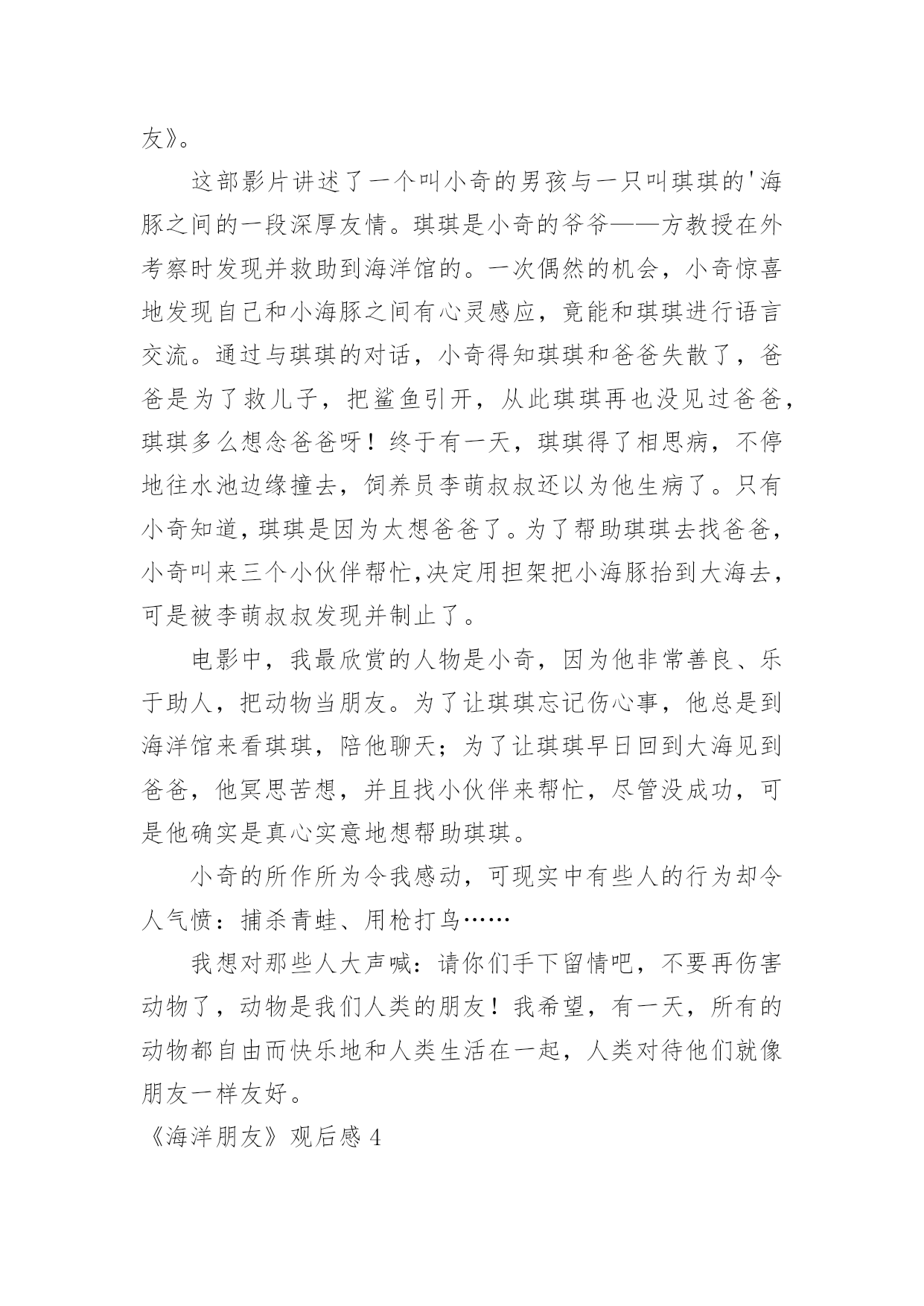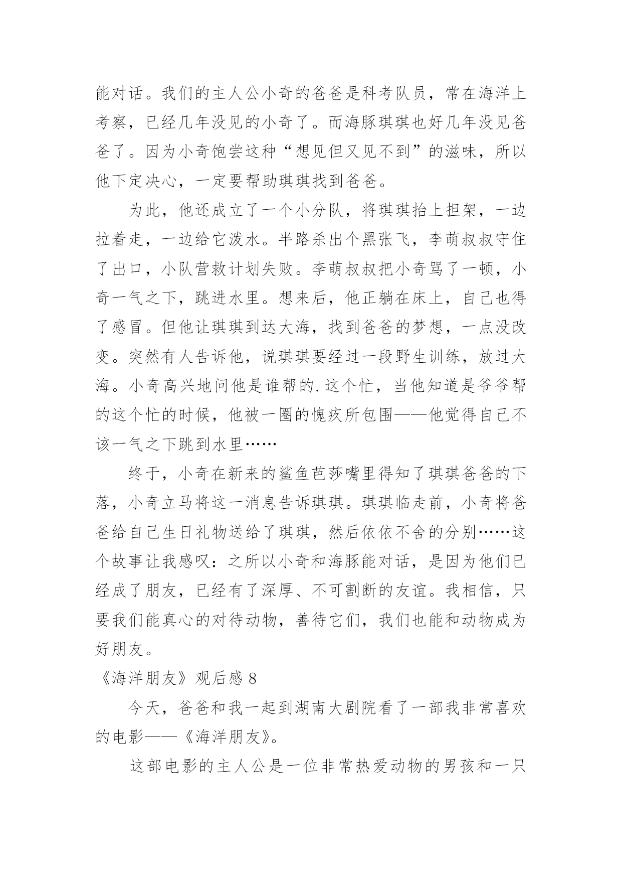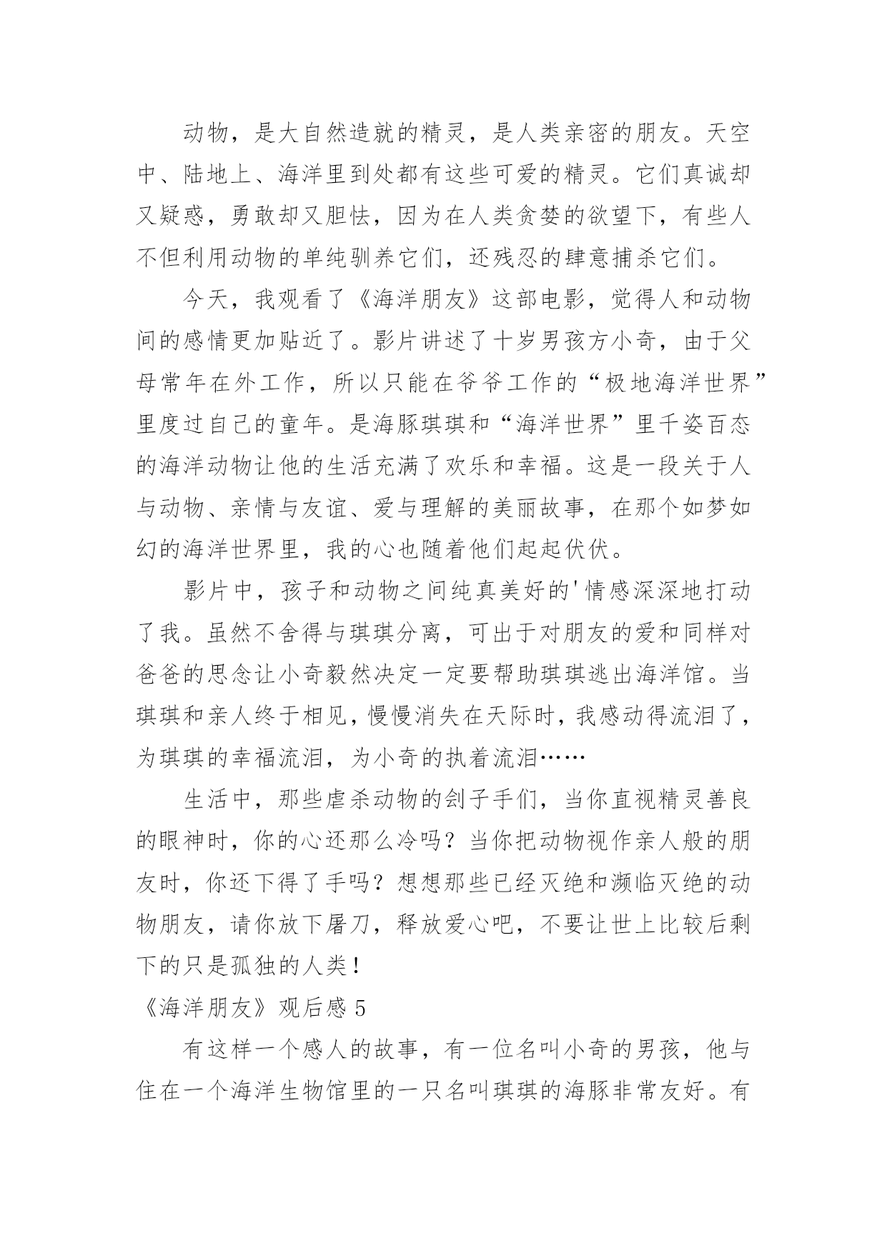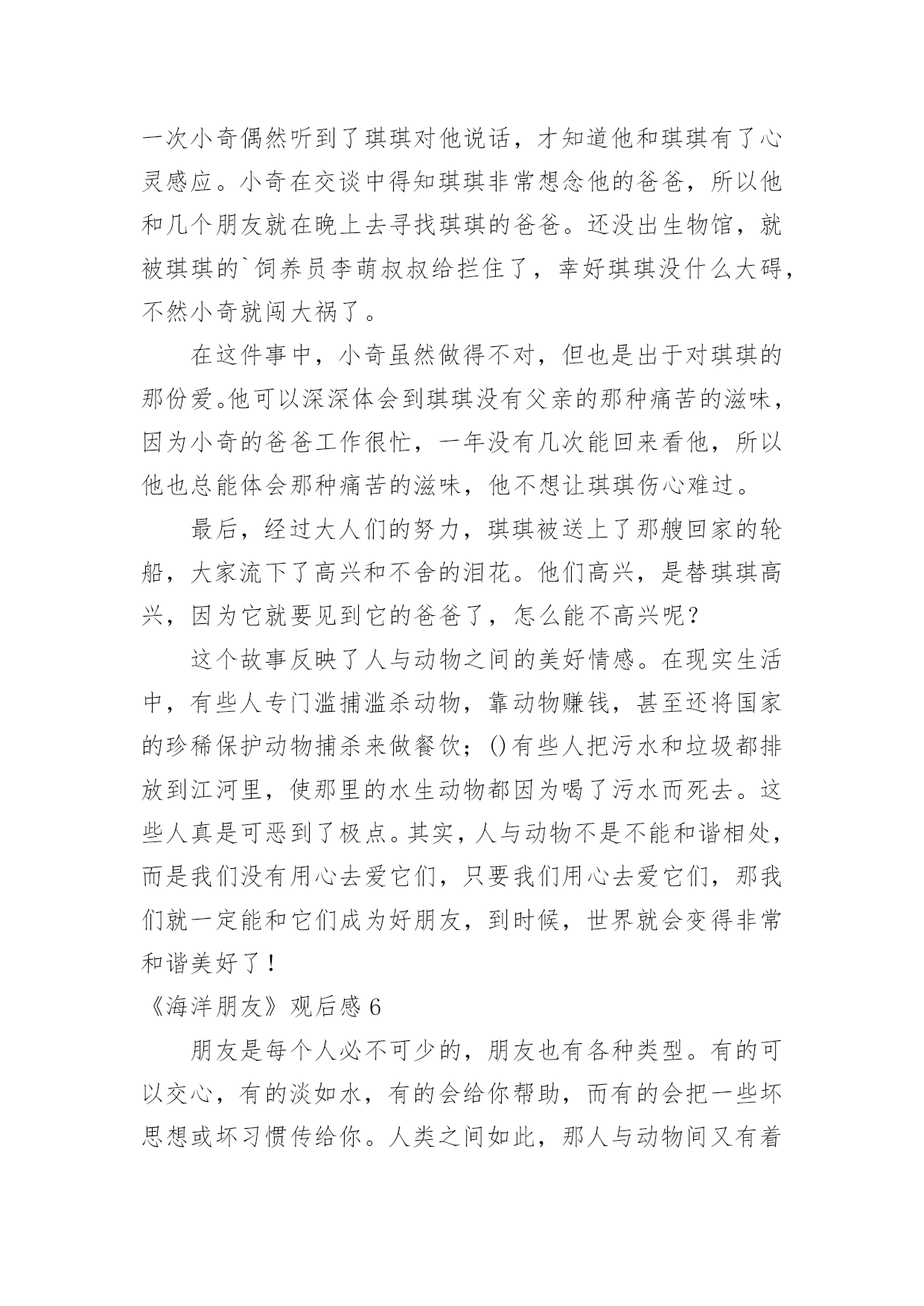 《海洋朋友》观后感《海洋朋友》观后感(通用)当观看完一部作品后,从中我们可以吸收新的思想,为此需要好好认真地写观后感。到底应如何写观后感呢?以下是小编为大家收集的《海洋朋友》观后感,希望对大家有所帮助。《海洋朋友》观后感1夜已深了,我躺在床上,脑子里不停地出现电影《海洋朋友》中小奇和伙伴们的身影。影片中的小奇非常喜欢海豚,竟然能和海豚心灵相通。小海豚想爸爸想得不吃不喝,小奇不管家人的反对,他和他的伙伴们要把海豚带走,去和它爸爸团圆,可是被家人发现。最后小奇的爱心终于感动了他的家人,家人让他帮助小海豚回到故乡,放心地去找爸爸了。影片中热爱动物的人使我敬佩,他们不管家人的反对用自己热爱动物的心感动了家人。动物是大自然的天使,没有它们人类的.生活将会很枯燥,早晨不再有公鸡叫我们起床,晚上不再有虫儿悦耳的鸣叫。法国有句格言:把爱拿走,我们的地球将会变成一座坟墓!这时,我不由得想起了我们的课文《那只松鼠》,作者好不容易捉到了一只活泼、伶俐、可爱至极的小松鼠,可是他看到了松鼠绝望、乞求的目光,决定把它放了。作者不就是一个有爱心的人吗?是啊,人人都要有爱心,不仅是要爱护动物,还要关心身边每件事、每个人,任何一个人有困难时都要伸出援助之手。如果每个人都有一颗爱心,那该多好呀!《海洋朋友》观后感2夜已深了,我躺在床上,脑子里不停地出现电影《海洋朋友》中小奇和伙伴们的身影。影片中的小奇非常喜欢海豚,竟然能和海豚心灵相通。小海豚想爸爸想得不吃不喝,小奇不管家人的反对,他和他的伙伴们要把海豚带走,去和它爸爸团圆,可是被家人发现。最后小奇的'爱心终于感动了他的家人,家人让他帮助小海豚回到故乡,放心地去找爸爸了。影片中热爱动物的人使我敬佩,他们不管家人的反对用自己热爱动物的心感动了家人。动物是大自然的天使,没有它们人类的生活将会很枯燥,早晨不再有公鸡叫我们起床,晚上不再有虫儿悦耳的鸣叫。法国有句格言:把爱拿走,我们的地球将会变成一座坟墓!这时,我不由得想起了我们的课文《那只松鼠》,作者好不容易捉到了一只活泼、伶俐、可爱至极的小松鼠,可是他看到了松鼠绝望、乞求的目光,决定把它放了。作者不就是一个有爱心的人吗?是啊,人人都要有爱心,不仅是要爱护动物,还要关心身边每件事、每个人,任何一个人有困难时都要伸出援助之手。如果每个人都有一颗爱心,那该多好呀!《海洋朋友》观后感3我看过许许多多电影,最令我难以忘怀的是《海洋朋友》。这部影片讲述了一个叫小奇的男孩与一只叫琪琪的'海豚之间的一段深厚友情。琪琪是小奇的爷爷——方教授在外考察时发现并救助到海洋馆的。一次偶然的机会,小奇惊喜地发现自己和小海豚之间有心灵感应,竟能和琪琪进行语言交流。通过与琪琪的对话,小奇得知琪琪和爸爸失散了,爸爸是为了救儿子,把鲨鱼引开,从此琪琪再也没见过爸爸,琪琪多么想念爸爸呀!终于有一天,琪琪得了相思病,不停地往水池边缘撞去,饲养员李萌叔叔还以为他生病了。只有小奇知道,琪琪是因为太想爸爸了。为了帮助琪琪去找爸爸,小奇叫来三个小伙伴帮忙,决定用担架把小海豚抬到大海去,可是被李萌叔叔发现并制止了。电影中,我最欣赏的人物是小奇,因为他非常善良、乐于助人,把动物当朋友。为了让琪琪忘记伤心事,他总是到海洋馆来看琪琪,陪他聊天;为了让琪琪早日回到大海见到爸爸,他冥思苦想,并且找小伙伴来帮忙,尽管没成功,可是他确实是真心实意地想帮助琪琪。小奇的所作所为令我感动,可现实中有些人的行为却令人气愤:捕杀青蛙、用枪打鸟……我想对那些人大声喊:请你们手下留情吧,不要再伤害动物了,动物是我们人类的朋友!我希望,有一天,所有的动物都自由而快乐地和人类生活在一起,人类对待他们就像朋友一样友好。《海洋朋友》观后感4动物,是大自然造就的精灵,是人类亲密的朋友。天空中、陆地上、海洋里到处都有这些可爱的精灵。它们真诚却又疑惑,勇敢却又胆怯,因为在人类贪婪的欲望下,有些人不但利用动物的单纯驯养它们,还残忍的肆意捕杀它们。今天,我观看了《海洋朋友》这部电影,觉得人和动物间的感情更加贴近了。影片讲述了十岁男孩方小奇,由于父母常年在外工作,所以只能在爷爷工作的“极地海洋世界”里度过自己的童年。是海豚琪琪和“海洋世界”里千姿百态的海洋动物让他的生活充满了欢乐和幸福。这是一段关于人与动物、亲情与友谊、爱与理解的美丽故事,在那个如梦如幻的海洋世界里,我的心也随着他们起起伏伏。影片中,孩子和动物之间纯真美好的'情感深深地打动了我。虽然不舍得与琪琪分离,可出于对朋友的爱和同样对爸爸的思念让小奇毅然决定一定要帮助琪琪逃出海洋馆。当琪琪和亲人终于相见,慢慢消失在天际时,我感动得流泪了,为琪琪的幸福流泪,为小奇的执着流泪……生活中,那些虐杀动物的刽子手们,当你直视精灵善良的眼神时,你的心还那么冷吗?当你把动物视作亲人般的朋友时,你还下得了手吗?想想那些