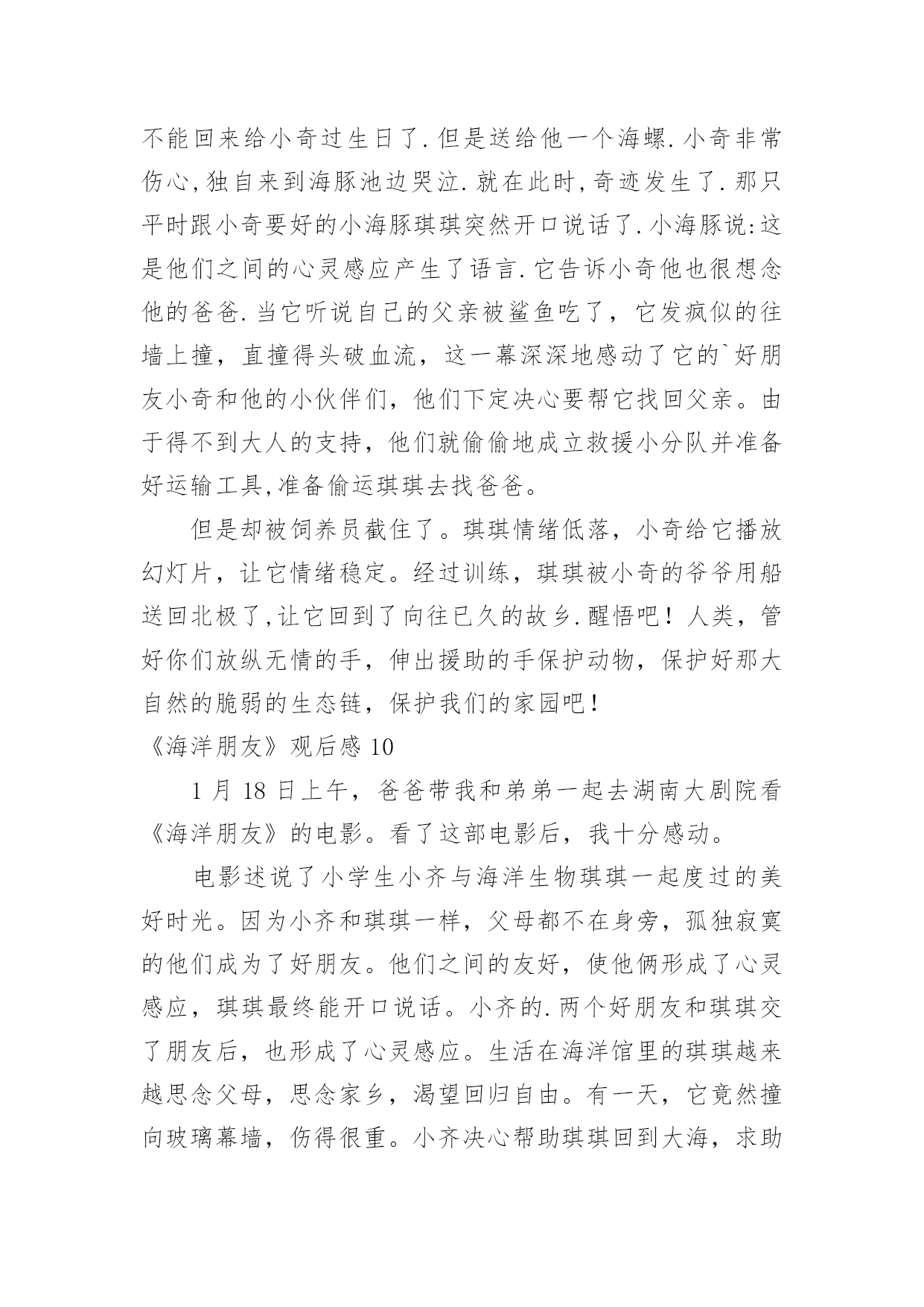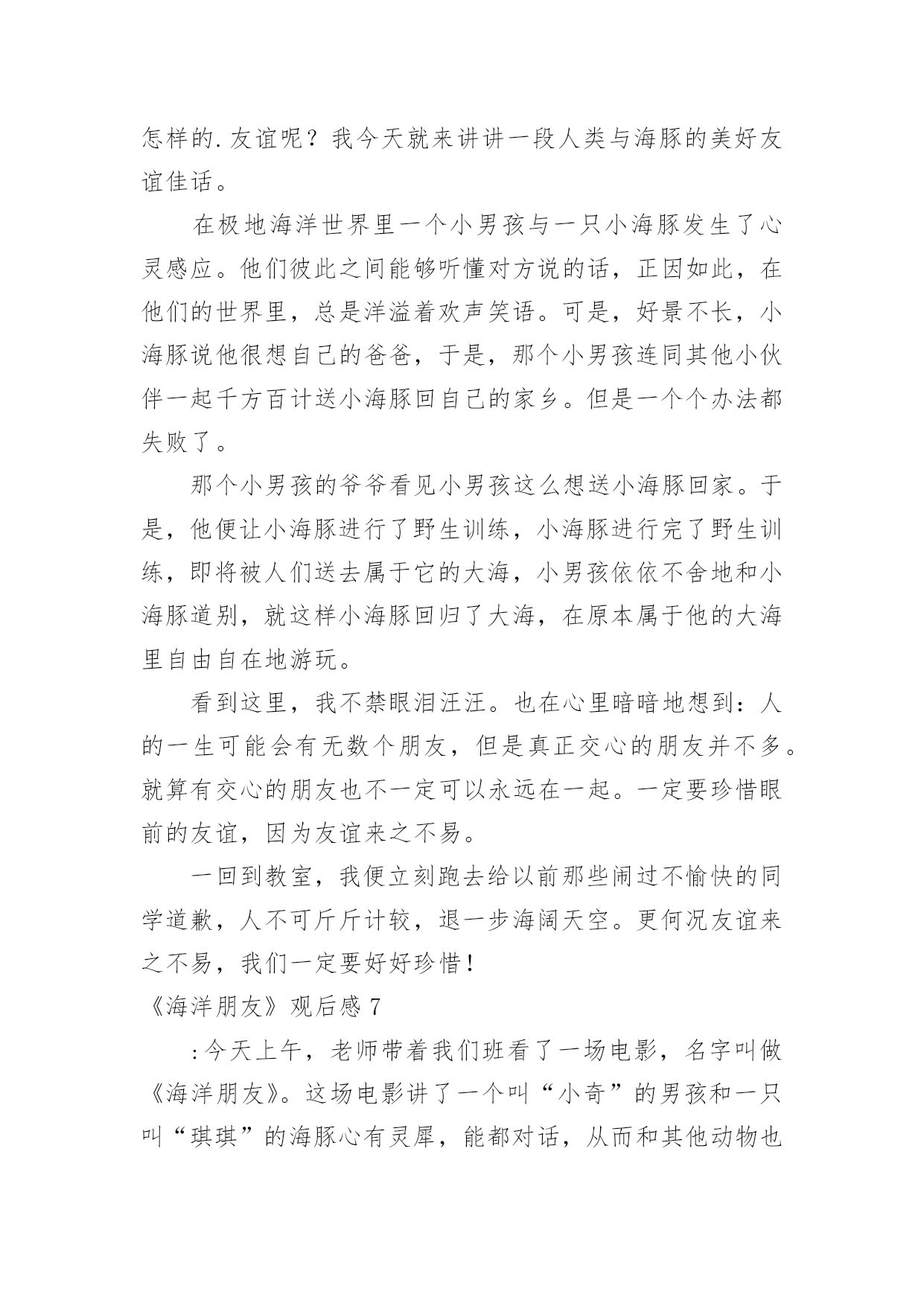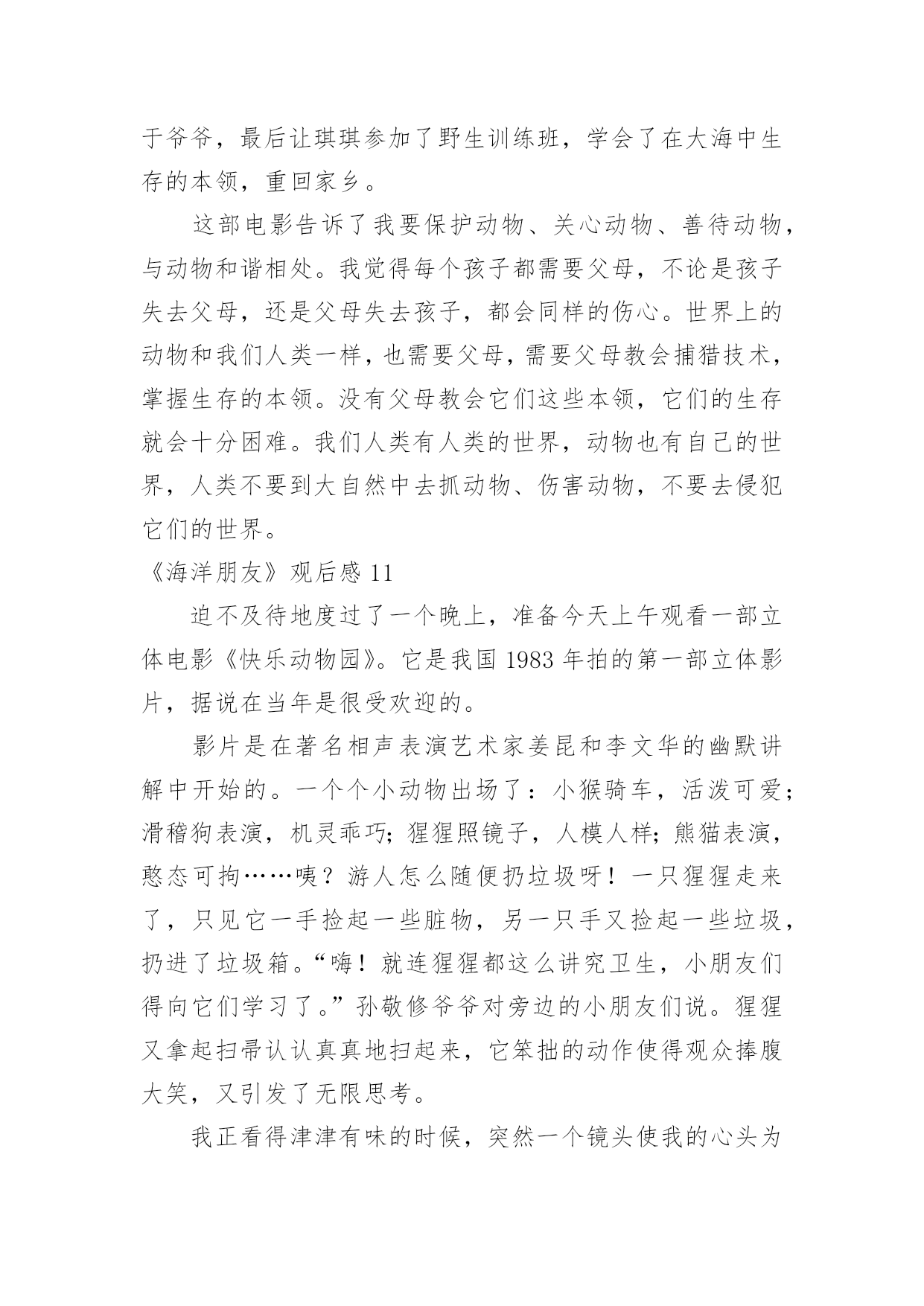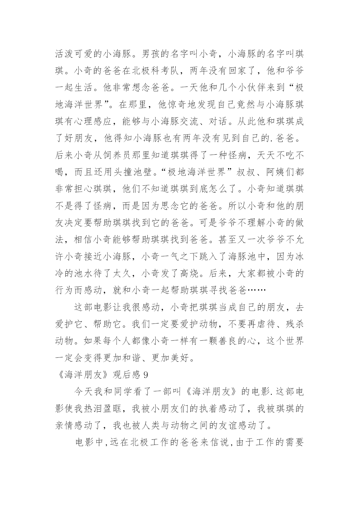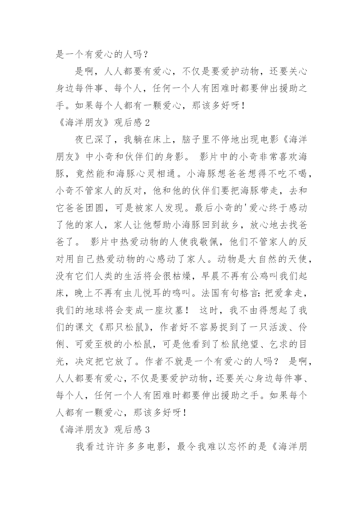 《海洋朋友》观后感《海洋朋友》观后感(通用)当观看完一部作品后,从中我们可以吸收新的思想,为此需要好好认真地写观后感。到底应如何写观后感呢?以下是小编为大家收集的《海洋朋友》观后感,希望对大家有所帮助。《海洋朋友》观后感1夜已深了,我躺在床上,脑子里不停地出现电影《海洋朋友》中小奇和伙伴们的身影。影片中的小奇非常喜欢海豚,竟然能和海豚心灵相通。小海豚想爸爸想得不吃不喝,小奇不管家人的反对,他和他的伙伴们要把海豚带走,去和它爸爸团圆,可是被家人发现。最后小奇的爱心终于感动了他的家人,家人让他帮助小海豚回到故乡,放心地去找爸爸了。影片中热爱动物的人使我敬佩,他们不管家人的反对用自己热爱动物的心感动了家人。动物是大自然的天使,没有它们人类的.生活将会很枯燥,早晨不再有公鸡叫我们起床,晚上不再有虫儿悦耳的鸣叫。法国有句格言:把爱拿走,我们的地球将会变成一座坟墓!这时,我不由得想起了我们的课文《那只松鼠》,作者好不容易捉到了一只活泼、伶俐、可爱至极的小松鼠,可是他看到了松鼠绝望、乞求的目光,决定把它放了。作者不就是一个有爱心的人吗?是啊,人人都要有爱心,不仅是要爱护动物,还要关心身边每件事、每个人,任何一个人有困难时都要伸出援助之手。如果每个人都有一颗爱心,那该多好呀!《海洋朋友》观后感2夜已深了,我躺在床上,脑子里不停地出现电影《海洋朋友》中小奇和伙伴们的身影。影片中的小奇非常喜欢海豚,竟然能和海豚心灵相通。小海豚想爸爸想得不吃不喝,小奇不管家人的反对,他和他的伙伴们要把海豚带走,去和它爸爸团圆,可是被家人发现。最后小奇的'爱心终于感动了他的家人,家人让他帮助小海豚回到故乡,放心地去找爸爸了。影片中热爱动物的人使我敬佩,他们不管家人的反对用自己热爱动物的心感动了家人。动物是大自然的天使,没有它们人类的生活将会很枯燥,早晨不再有公鸡叫我们起床,晚上不再有虫儿悦耳的鸣叫。法国有句格言:把爱拿走,我们的地球将会变成一座坟墓!这时,我不由得想起了我们的课文《那只松鼠》,作者好不容易捉到了一只活泼、伶俐、可爱至极的小松鼠,可是他看到了松鼠绝望、乞求的目光,决定把它放了。作者不就是一个有爱心的人吗?是啊,人人都要有爱心,不仅是要爱护动物,还要关心身边每件事、每个人,任何一个人有困难时都要伸出援助之手。如果每个人都有一颗爱心,那该多好呀!《海洋朋友》观后感3我看过许许多多电影,最令我难以忘怀的是《海洋朋友》。这部影片讲述了一个叫小奇的男孩与一只叫琪琪的'海豚之间的一段深厚友情。琪琪是小奇的爷爷——方教授在外考察时发现并救助到海洋馆的。一次偶然的机会,小奇惊喜地发现自己和小海豚之间有心灵感应,竟能和琪琪进行语言交流。通过与琪琪的对话,小奇得知琪琪和爸爸失散了,爸爸是为了救儿子,把鲨鱼引开,从此琪琪再也没见过爸爸,琪琪多么想念爸爸呀!终于有一天,琪琪得了相思病,不停地往水池边缘撞去,饲养员李萌叔叔还以为他生病了。只有小奇知道,琪琪是因为太想爸爸了。为了帮助琪琪去找爸爸,小奇叫来三个小伙伴帮忙,决定用担架把小海豚抬到大海去,可是被李萌叔叔发现并制止了。电影中,我最欣赏的人物是小奇,因为他非常善良、乐于助人,把动物当朋友。为了让琪琪忘记伤心事,他总是到海洋馆来看琪琪,陪他聊天;为了让琪琪早日回到大海见到爸爸,他冥思苦想,并且找小伙伴来帮忙,尽管没成功,可是他确实是真心实意地想帮助琪琪。小奇的所作所为令我感动,可现实中有些人的行为却令人气愤:捕杀青蛙、用枪打鸟……我想对那些人大声喊:请你们手下留情吧,不要再伤害动物了,动物是我们人类的朋友!我希望,有一天,所有的动物都自由而快乐地和人类生活在一起,人类对待他们就像朋友一样友好。《海洋朋友》观后感4动物,是大自然造就的精灵,是人类亲密的朋友。天空中、陆地上、海洋里到处都有这些可爱的精灵。它们真诚却又疑惑,勇敢却又胆怯,因为在人类贪婪的欲望下,有些人不但利用动物的单纯驯养它们,还残忍的肆意捕杀它们。今天,我观看了《海洋朋友》这部电影,觉得人和动物间的感情更加贴近了。影片讲述了十岁男孩方小奇,由于父母常年在外工作,所以只能在爷爷工作的“极地海洋世界”里度过自己的童年。是海豚琪琪和“海洋世界”里千姿百态的海洋动物让他的生活充满了欢乐和幸福。这是一段关于人与动物、亲情与友谊、爱与理解的美丽故事,在那个如梦如幻的海洋世界里,我的心也随着他们起起伏伏。影片中,孩子和动物之间纯真美好的'情感深深地打动了我。虽然不舍得与琪琪分离,可出于对朋友的爱和同样对爸爸的思念让小奇毅然决定一定要帮助琪琪逃出海洋馆。当琪琪和亲人终于相见,慢慢消失在天际时,我感动得流泪了,为琪琪的幸福流泪,为小奇的执着流泪……生活中,那些虐杀动物的刽子手们,当你直视精灵善良的眼神时,你的心还那么冷吗?当你把动物视作亲人般的朋友时,你还下得了手吗?想想那些