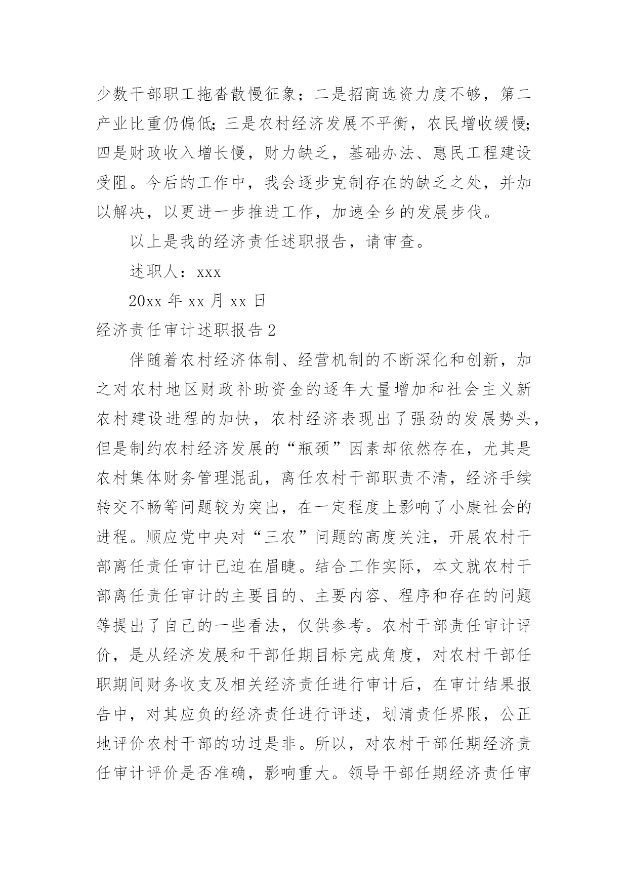 经济责任审计述职报告经济责任审计述职报告(热)在现实生活中,越来越多的事务都会使用到报告,其在写作上具有一定的窍门。那么大家知道标准正式的报告格式吗?下面是小编整理的经济责任审计述职报告,仅供参考,欢迎大家阅读。经济责任审计述职报告1各位领导、各位同志:大家好20xx年x月到20xx年x月期间,我担任XX镇党委书记一职。作为一班之长,我肩负着发展一方经济,致富一方百姓,保持一方稳定的重任。六年来,我认真履行第一责任人的职责,紧紧依靠党委、XXX、政府一班人的集体智慧和全镇广大干部群众的大力支持,总揽全局,统筹运用人力、物力、财力,将更多的精力放在谋划发展上,对事关经济发展全局性、方向性的问题进行适时而果断的决策,进一步理清了发展的思路,明确了目标,稳稳的把握住全镇经济发展的方向和走势,努力推动了XX镇各项工作的全面进步,为XX镇经济社会的持续健康发展发挥了一定作用。现根据上级要求,将本人任职以来的经济工作情况作如下汇报:一、主要经济指标完成情况20xx年,全镇完成国内生产总值10.48亿元,比20xx年增加(下称增加)5.50亿元,增长110.3%;完成固定资产投资2.71亿元,增加2.26亿元,增长498%;外贸出口累计4701万美元;合同利用外资7621万元;完成税收2412万元,增加1405万元,增长71.7%;全镇可支配收入4607.92万元,增加2845.29万元,增长161%;人均年收入6969元,增加2597元,增长59%。六年来,我镇的财政收入是一直在稳步增长,收支基本平衡,财政状况良好。二、社会事业协调发展,人民生活水平显著提高1、优化农业产业结构,农民收入不断增加。我以增加农民收入为目标,不断强化农业在国民经济中的基础地位,不断加大农业产业结构的调整力度,着力打造“XX山茶”、“XX凉果”、“XX大桔”等农业特色品牌。截至20xx年,全镇共有农业专业合作组织11家,其中茶叶专业合作组织就6家,蔬菜种植专业合作组织3家,水稻种植专业合作组织1家。据统计,全镇山茶种植面积达8000多亩,XX大桔种植面积达7000亩,玉米种植面积亩,水稻种植面积亩。20xx年,农民人均纯收入达6969元。2、加大招商引资力度,工业实现腾跃式发展。六年来,我始终把招商选资、发展工业作为经济工作的重中之重,以四项指标、一个带动”标准,多渠道、全方位开展招商选资工作,全力打XXX、XXX和XXX三大工业园区。六年来,我镇通过招商选资共引进项目56宗,投资总额23亿元。截止到20xx年x月,全镇外资民资企业共47家,其中投资规模超千万元的有19家。3、创新经济发展方式,生态旅游业初见成效。我把发展旅游业作为加快转变经济发展方式的重要抓手,依托后发优势和生态优势,深入挖掘、整合XX特色旅游资源,大力开展旅游招商选资工作。六年来,我镇先后引旅游项目共5宗,总投资达16亿元,其中xxxxx投资10亿元,xxxx投资2.5亿元,xxxxx投资2亿,xxxxx投资1亿,xxxxx投资5000万元。4、基础设施不断完善,人民生活不断改善。六年来,多方筹资4.2亿元投入到交通、市政、供水、供电等惠民工程建设,城镇化步伐明显加速,城市化水平明显提升。截止到20xx年,完成的惠民工程有XX文化体育广场、XX商贸新城、XXX、XX客运站、文化效劳中心、11万伏变电站、22万伏变电站、XX至XX自来水供水管线、XXX、XXX、XXX、XXX、XXX等工程建设,新建改造了XXX、XXX、XXX,完善了XX移民新村市政办法改造,对XX主要街道全部进行了硬底化建设,为全镇主要街道都铺上了街砖,建造了下水道,安装路灯近30千米、绿化街道村道50千米。5、科教文卫等各项事业和谐发展,幸福指数进一步增强。六年来,坚持“广覆盖、保基本、多层次、可持续”原则,不断加大文化、教育、卫生等社会事业投入,全力改善民生质量。教育方面,投入3000多万元成功创建“广东省教育强镇”,被省督导验收专家称誉为“穷镇创强镇”的典范,投入200万元新办了1所XX幼儿园,解决XXX幼儿入学难问题;成功引进总投资600多万元的XXXX和总投资250万元的xxxxx。文化体育方面,积极鼓励群众开展各项文化体育活动,成立了篮球协会、书法协会、XXX等组织,大力推动文化体育事业快速、健康发展。在建设好镇文化广场的基础上,投入57万元建成XX、XX、XX、XX、XX等19个行政村体育运动场,投入30万元建成6个农家书屋。医疗卫生方面,投入200万元对其进行全面改造;全镇36个行政村配备“一医生一护士”卫生站,进一步构筑了镇村医疗卫生收集体系,完善了村医疗卫生站设备办法,提高了村医生的医术和效劳水平;新型农村合作医疗保险、新型农村社会养老保险100%覆盖。其它方面,投入4025万元完成村组道硬底化道路1