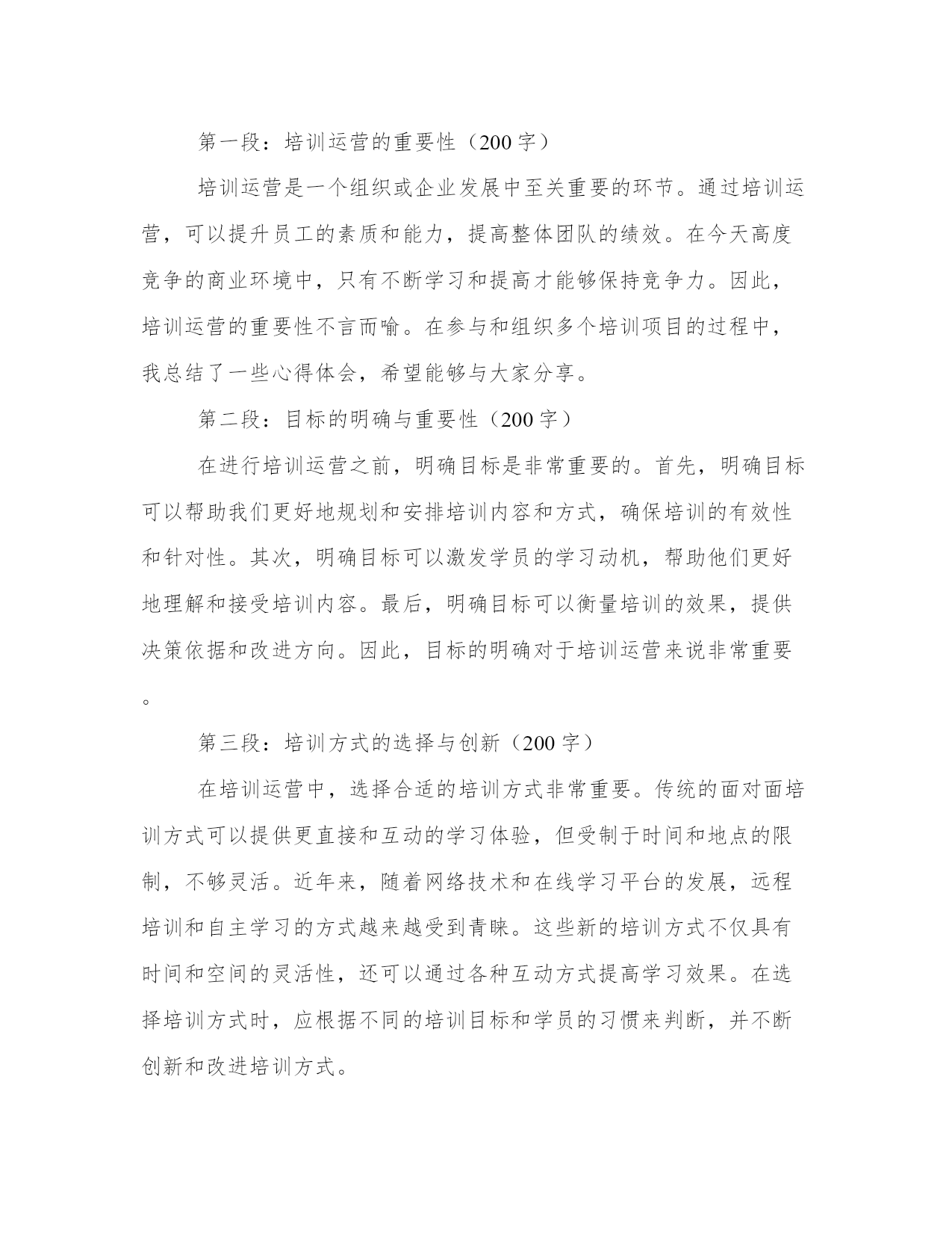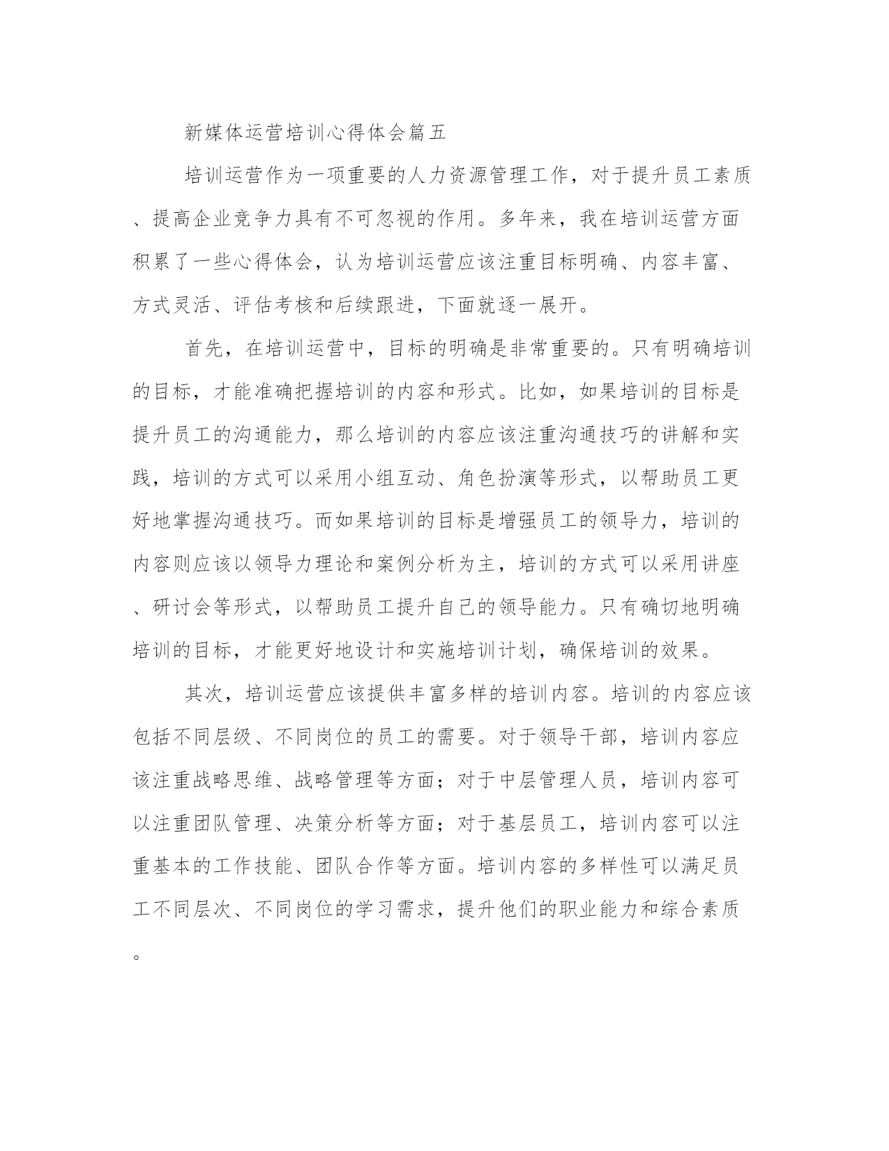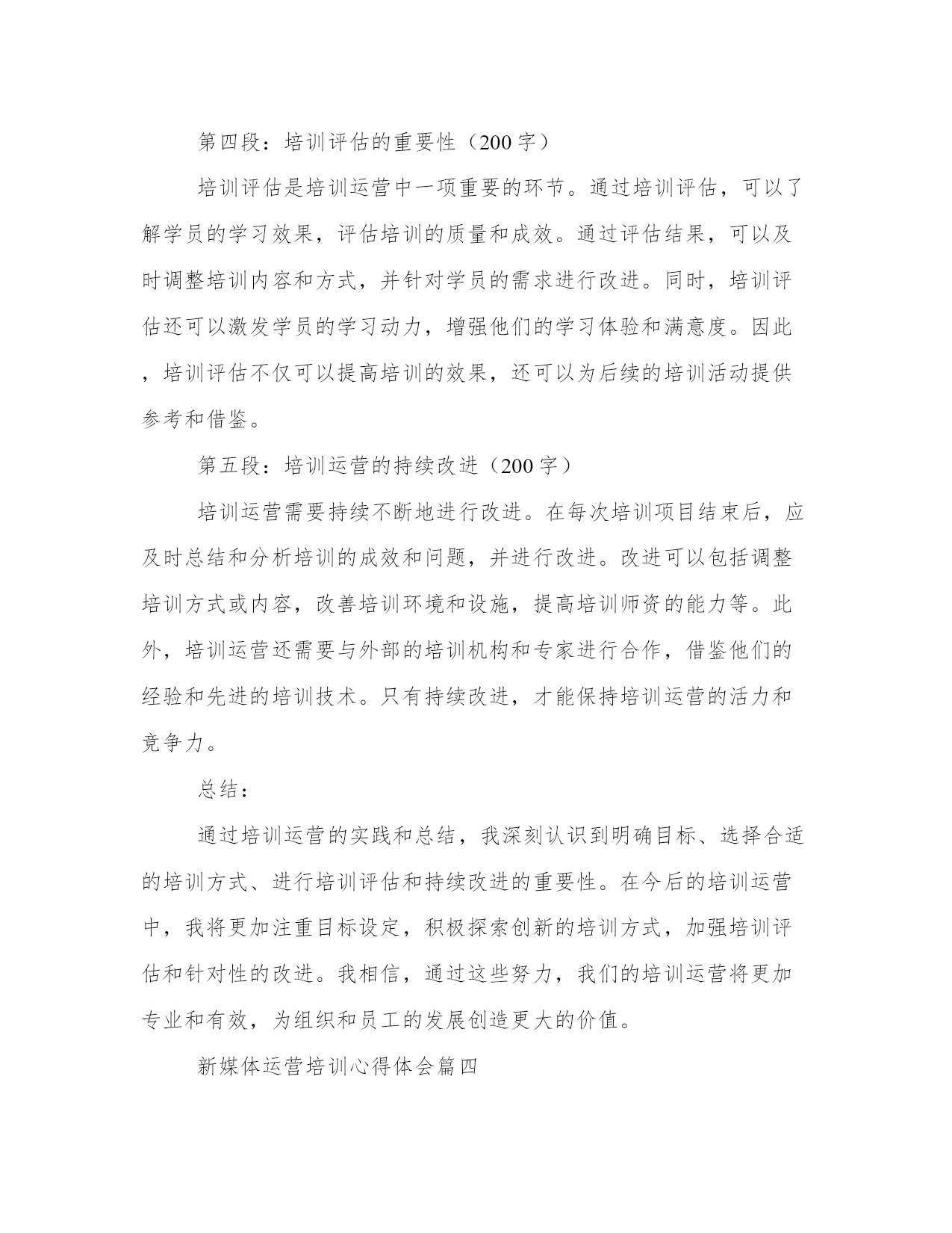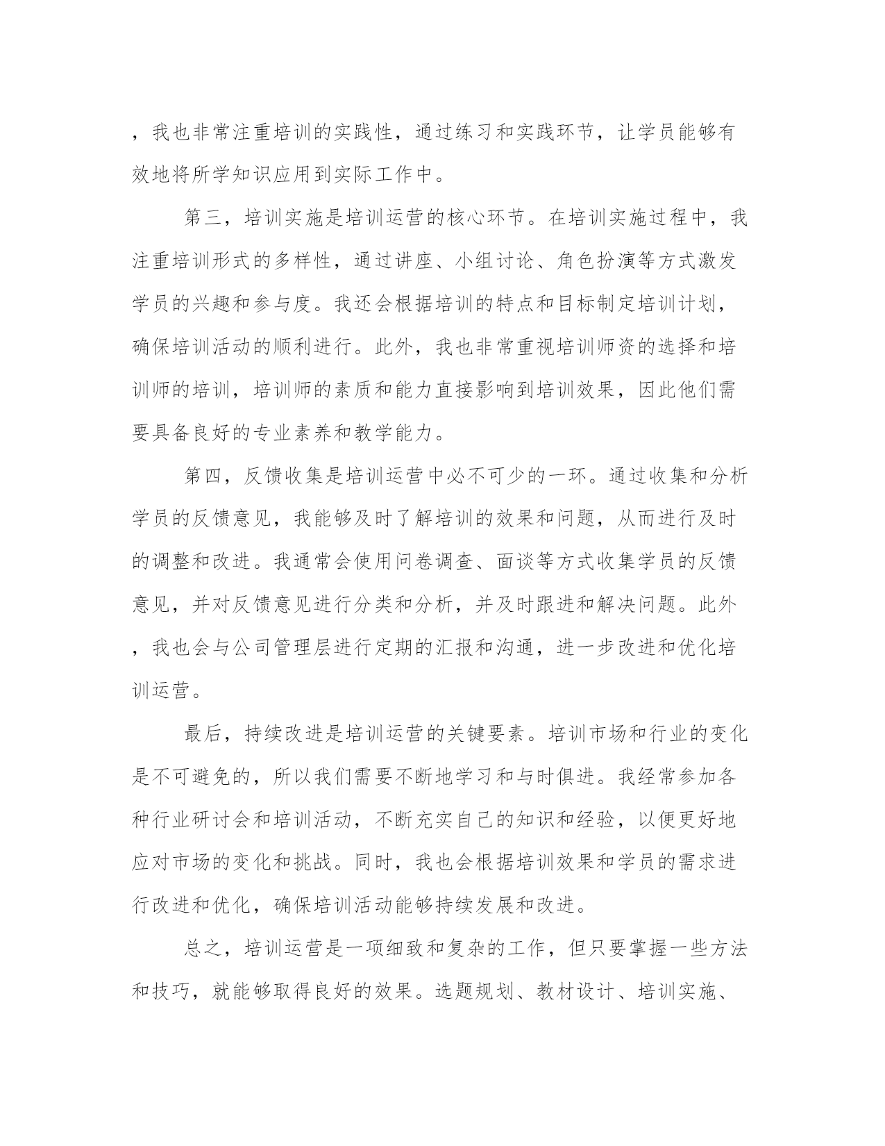 2023年新媒体运营培训心得体会(通用13篇)在平日里,心中难免会有一些新的想法,往往会写一篇心得体会,从而不断地丰富我们的思想。好的心得体会对于我们的帮助很大,所以我们要好好写一篇心得体会以下我给大家整理了一些优质的心得体会范文,希望对大家能够有所帮助。新媒体运营培训心得体会篇一培训是组织和提高员工的关键活动,而有效的培训运营则是保证培训活动顺利进行并取得良好效果的重要方面。作为一名培训经理,我在过去的多年中积累了一些关于培训运营的心得体会,下面将从选题规划、教材设计、培训实施、反馈收集和持续改进五个方面分享我的心得体会。首先,选题规划是培训运营的首要步骤。在选题规划过程中,我会先与公司管理层进行充分的沟通,了解他们对培训的需求和期望。然后,我会根据市场和行业的变化进行信息收集和分析,以便确定最合适的培训课题。此外,我还会关注员工的个人发展需求,确保培训课程既符合公司发展战略,又能够提高员工的技能水平。第二,教材设计是培训运营中的关键环节。一个好的教材设计能够帮助培训者更好地领会和掌握培训内容。在教材设计过程中,我通常会遵循“简洁明了、重点突出、注重实践”的原则。我会用简洁明了的语言表达培训目标和内容,并通过案例分析等方式突出重点。同时,我也非常注重培训的实践性,通过练习和实践环节,让学员能够有效地将所学知识应用到实际工作中。第三,培训实施是培训运营的核心环节。在培训实施过程中,我注重培训形式的多样性,通过讲座、小组讨论、角色扮演等方式激发学员的兴趣和参与度。我还会根据培训的特点和目标制定培训计划,确保培训活动的顺利进行。此外,我也非常重视培训师资的选择和培训师的培训,培训师的素质和能力直接影响到培训效果,因此他们需要具备良好的专业素养和教学能力。第四,反馈收集是培训运营中必不可少的一环。通过收集和分析学员的反馈意见,我能够及时了解培训的效果和问题,从而进行及时的调整和改进。我通常会使用问卷调查、面谈等方式收集学员的反馈意见,并对反馈意见进行分类和分析,并及时跟进和解决问题。此外,我也会与公司管理层进行定期的汇报和沟通,进一步改进和优化培训运营。最后,持续改进是培训运营的关键要素。培训市场和行业的变化是不可避免的,所以我们需要不断地学习和与时俱进。我经常参加各种行业研讨会和培训活动,不断充实自己的知识和经验,以便更好地应对市场的变化和挑战。同时,我也会根据培训效果和学员的需求进行改进和优化,确保培训活动能够持续发展和改进。总之,培训运营是一项细致和复杂的工作,但只要掌握一些方法和技巧,就能够取得良好的效果。选题规划、教材设计、培训实施、反馈收集和持续改进是培训运营的五个重要环节,在实践中,我通过不断地学习和总结,逐渐形成了自己的心得体会,并不断地优化和提升培训运营的效果。希望我的分享能够对大家有所启发和帮助。新媒体运营培训心得体会篇二x年x月x日,在公司的组织下,我与同事们参加了为期三天的微信运营培训。培训主要介绍了与微信类似的信息传递软件的成功运营经验,通过参加这次培训,我获益匪浅。培训通过类似成功案例,展示了微信运营开发的广阔前景,使我了解在微信运营过程中,可以充分利用信息传递便捷的优势,使微信用户感受到随时随地、一对一的.服务,从而为广告客户进行策略性广告营销,进而提高微信运营效益。二、提升了开发技能在培训中,还介绍了进行运营开发中的一些技术和应避免出现的问题,从而提升我的开发技巧。三天的时间虽然短暂,但是在这短暂的时间内,通过共同学习和生活,参加培训的人员形成了一个努力奋进、配合紧密的团队,为我们在今后的工作中配合更加顺畅奠定了良好的基础。综上所述,参与这次培训,无论在工作还是在生活方面,都给予了我莫大的帮助,希望今后还能多参加类似的培训。新媒体运营培训心得体会篇三第一段:培训运营的重要性(200字)培训运营是一个组织或企业发展中至关重要的环节。通过培训运营,可以提升员工的素质和能力,提高整体团队的绩效。在今天高度竞争的商业环境中,只有不断学习和提高才能够保持竞争力。因此,培训运营的重要性不言而喻。在参与和组织多个培训项目的过程中,我总结了一些心得体会,希望能够与大家分享。第二段:目标的明确与重要性(200字)在进行培训运营之前,明确目标是非常重要的。首先,明确目标可以帮助我们更好地规划和安排培训内容和方式,确保培训的有效性和针对性。其次,明确目标可以激发学员的学习动机,帮助他们更好地理解和接受培训内容。最后,明确目标可以衡量培训的效果,提供决策依据和改进方向。因此,目标的明确对于培训运营来说非常重要。第三段:培训方式的选择与创新(200字)在培训运营中,选择合适的培训方式非常重要。传统的面对面培训方式可以提供更直接和互动的学习体验,但受制于时间和地点的限制,不够灵活
