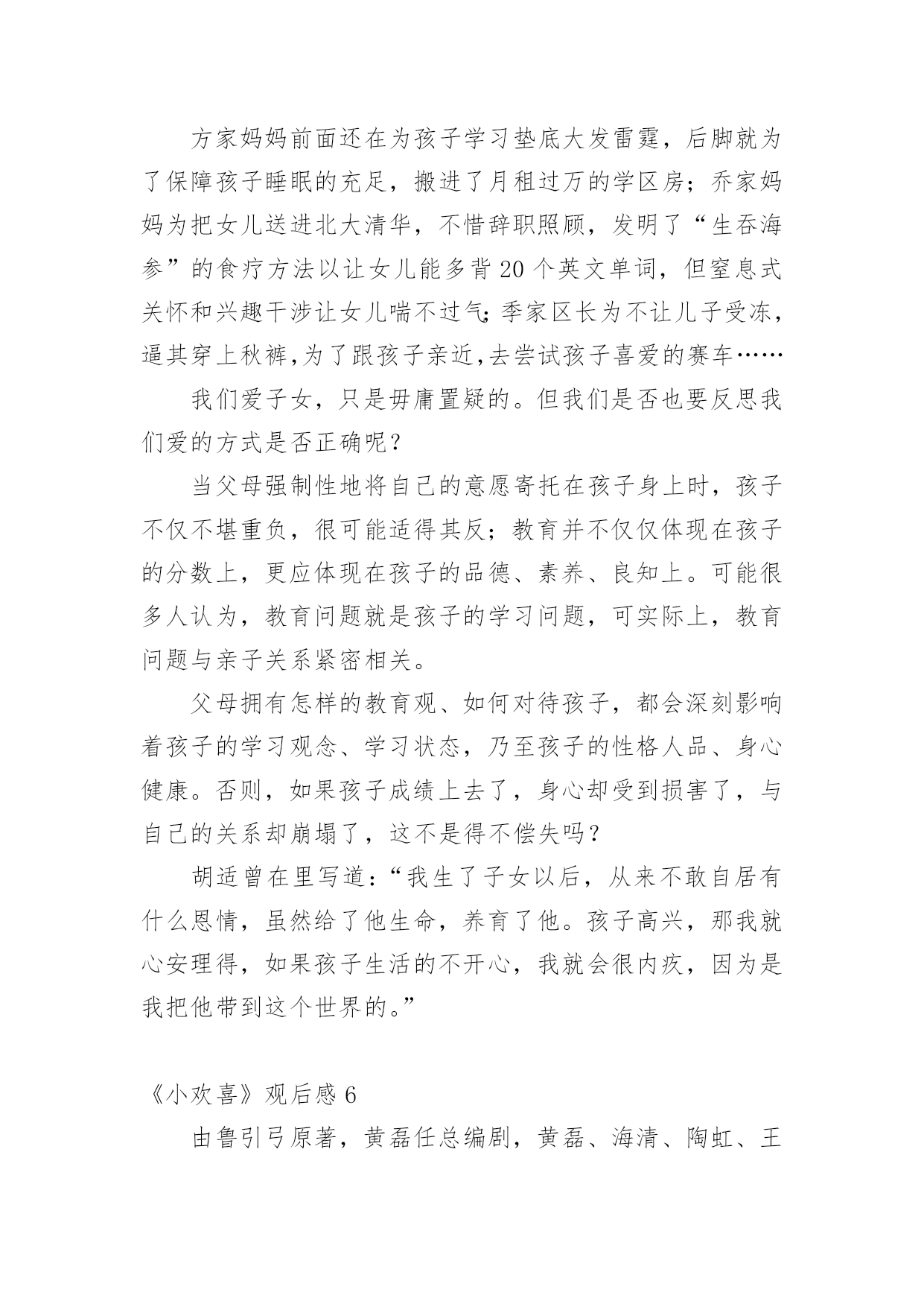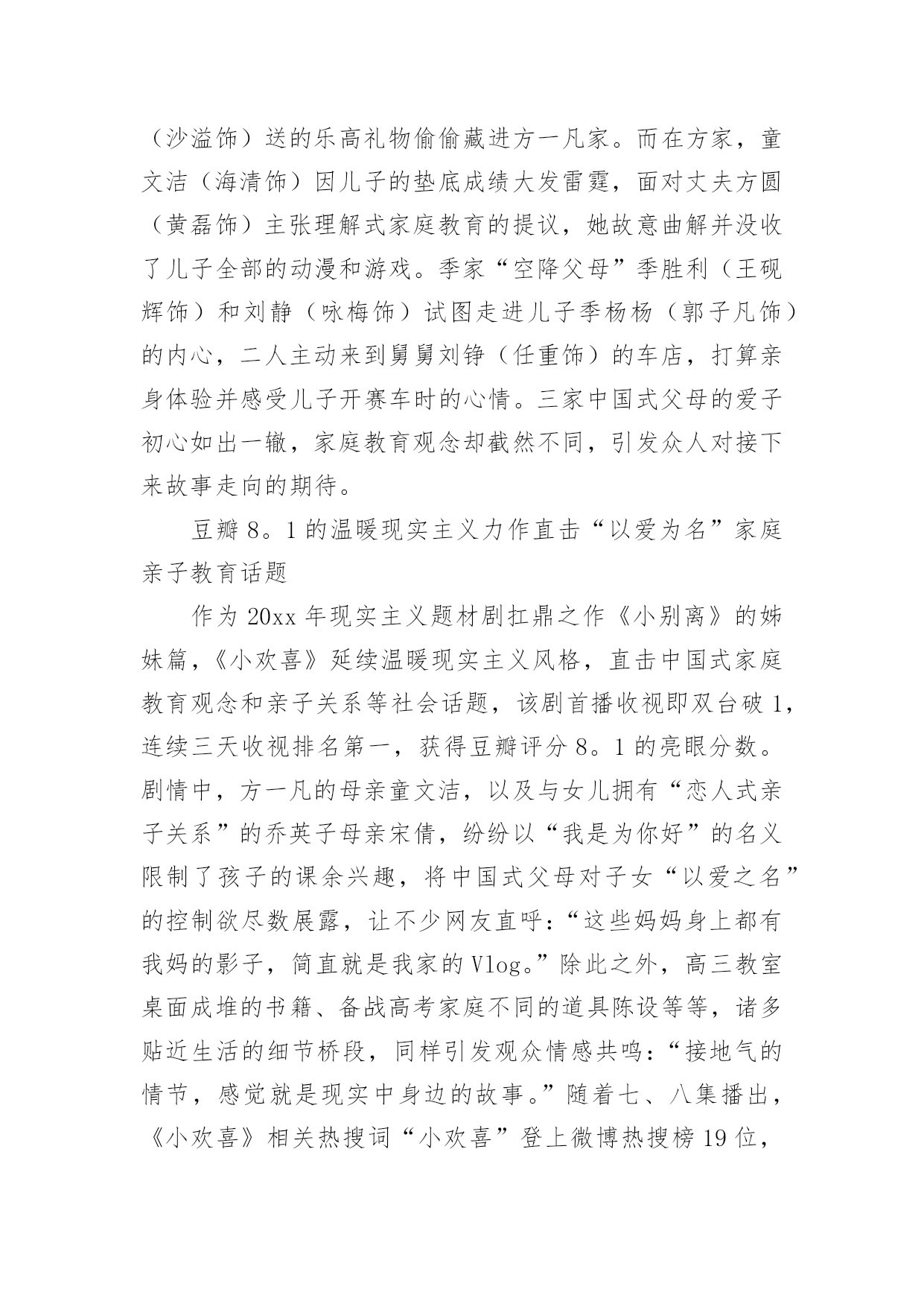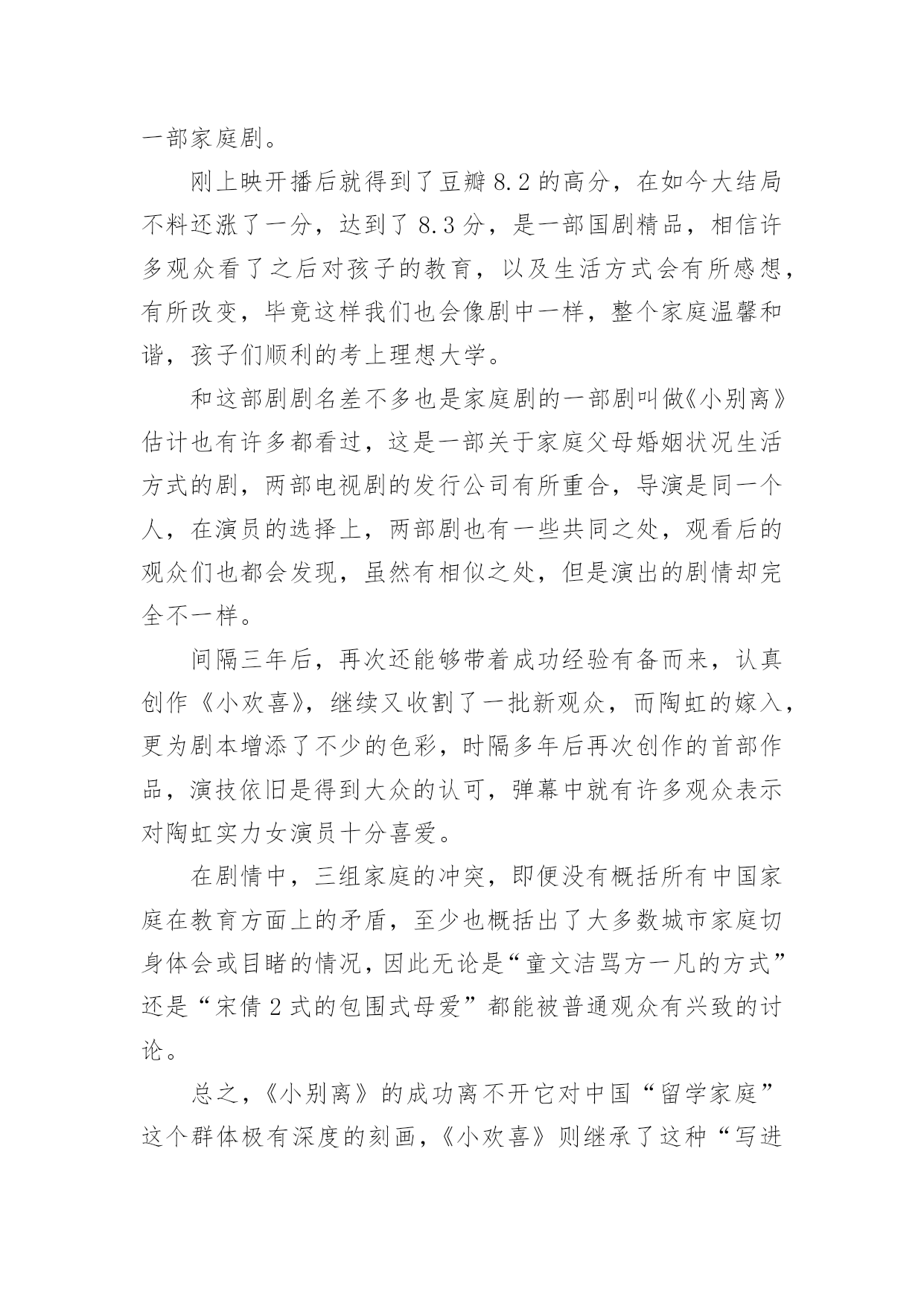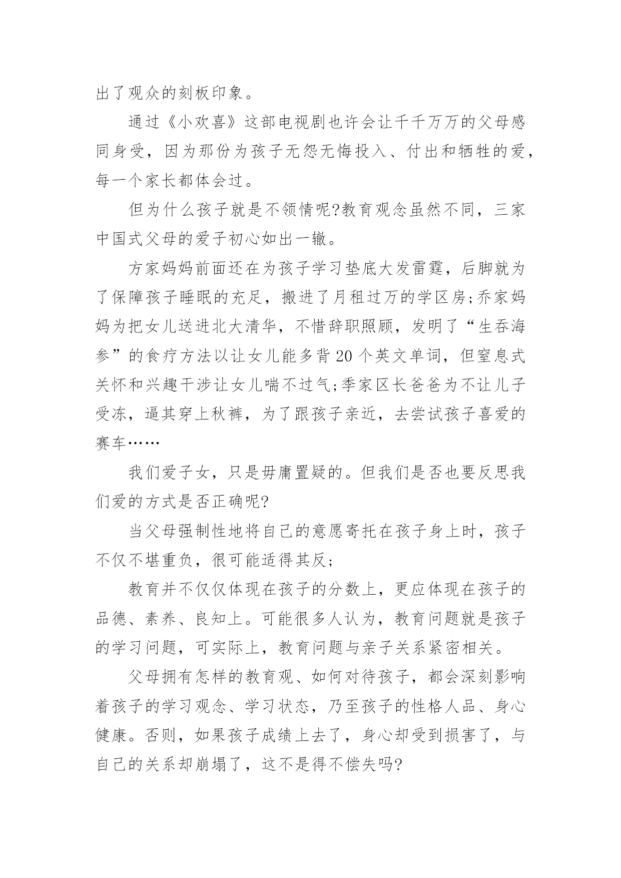 《小欢喜》观后感《小欢喜》观后感10篇看完一部作品以后,相信大家增长不少见闻吧,记录下来很重要哦,一起来写一篇观后感吧。观后感你想好怎么写了吗?下面是小编收集整理的《小欢喜》观后感,仅供参考,希望能够帮助到大家。《小欢喜》观后感1暑期即将结束了,最后一部现代都市家庭剧也是非常的火热,那就是《小欢喜》,自从开播后,无论是号召力收视率还是口碑都是非常不错的,深受观众喜爱,获得了一致好评,作为暑期档的压轴之作,单日收视率破亿,登上影视收视率第一的宝座,细节上的精心打磨和嫉妒贴近生活的剧作设计,非常吸引观众。在最近,剧情高潮片段期间,我们几乎天天都能在热搜上看到剧中人物,比如方一凡、英子、宋倩等主人的名字频繁出现,在这部剧中无论是家长还是学生他们演技都是非常棒的,堪称暑期档的良心大剧。这部剧于7月30日上映,8月27日圆满收官,累计播放量已超过25.1亿,双双丰收,刚上线一周就超越了《长安十二时辰》也是一部暑期档的热播剧,而上线两周后,超过了暑期档霸主《陈情令》,并守擂至今,非常值得赞赏的一部家庭剧。刚上映开播后就得到了豆瓣8.2的高分,在如今大结局不料还涨了一分,达到了8.3分,是一部国剧精品,相信许多观众看了之后对孩子的教育,以及生活方式会有所感想,有所改变,毕竟这样我们也会像剧中一样,整个家庭温馨和谐,孩子们顺利的考上理想大学。和这部剧剧名差不多也是家庭剧的一部剧叫做《小别离》估计也有许多都看过,这是一部关于家庭父母婚姻状况生活方式的剧,两部电视剧的发行公司有所重合,导演是同一个人,在演员的选择上,两部剧也有一些共同之处,观看后的观众们也都会发现,虽然有相似之处,但是演出的剧情却完全不一样。间隔三年后,再次还能够带着成功经验有备而来,认真创作《小欢喜》,继续又收割了一批新观众,而陶虹的嫁入,更为剧本增添了不少的色彩,时隔多年后再次创作的首部作品,演技依旧是得到大众的认可,弹幕中就有许多观众表示对陶虹实力女演员十分喜爱。在剧情中,三组家庭的冲突,即便没有概括所有中国家庭在教育方面上的矛盾,至少也概括出了大多数城市家庭切身体会或目睹的情况,因此无论是“童文洁骂方一凡的方式”还是“宋倩2式的包围式母爱”都能被普通观众有兴致的讨论。总之,《小别离》的成功离不开它对中国“留学家庭”这个群体极有深度的刻画,《小欢喜》则继承了这种“写进观众心坎里”的能力,把“高考家庭”的模样描摹了出来,如此才能够触发观众的心声,引发众多观众的喜爱。正如《小欢喜》这部剧,最后的大结局将看似浅层次的“高考问题”,通过主角的遭遇和取舍,提高了“生命”和“亲情”等层面,观众在与剧中人物剧情产生的感情过程中,也获得了对自己人生的思悟体验,这部剧真的是令观众大赞一致好评的。《小欢喜》观后感2《小别离》之后,终于等来了姊妹剧《小欢喜》的开播。汪俊导演执导,黄磊和海清这对夫妻cp继续出演,又有陶虹、咏梅、王砚辉、沙溢等一众熟悉的演技派演员加盟,为这部剧的高口碑奠定了坚实基础。登录浙江卫视和东方卫视播出不久,《小欢喜》就频上热搜,收视更是连续登顶,豆瓣口碑突破了8.3。《小欢喜》通过普通家庭的教育经历,以及关于亲情支撑的温暖记忆,再次引发了社会对“中国式教育”的关注与思考,其中,剧中三个截然不同的家庭,更是以“一考定终身”的教育方式,生动地演绎了中国式家长的众生相,反映出一些共同的问题。高考是中国普通家庭的关键战役,但两辈人的沟通不能忽视,只有互相尊重,代与代之间才能求同存异,朝着同一个目标努力。就此而言,《小欢喜》对三个家庭有不同以往的细腻刻画,尤其是对乔家这条线的创新描绘,让整部戏跳出了观众的刻板印象。通过《小欢喜》这部电视剧也许会让千千万万的父母感同身受,因为那份为孩子无怨无悔投入、付出和牺牲的爱,每一个家长都体会过。但为什么孩子就是不领情呢?教育观念虽然不同,三家中国式父母的爱子初心如出一辙。方家妈妈前面还在为孩子学习垫底大发雷霆,后脚就为了保障孩子睡眠的充足,搬进了月租过万的学区房;乔家妈妈为把女儿送进北大清华,不惜辞职照顾,发明了“生吞海参”的食疗方法以让女儿能多背20个英文单词,但窒息式关怀和兴趣干涉让女儿喘不过气;季家区长爸爸为不让儿子受冻,逼其穿上秋裤,为了跟孩子亲近,去尝试孩子喜爱的赛车……我们爱子女,只是毋庸置疑的。但我们是否也要反思我们爱的方式是否正确呢?当父母强制性地将自己的意愿寄托在孩子身上时,孩子不仅不堪重负,很可能适得其反;教育并不仅仅体现在孩子的分数上,更应体现在孩子的品德、素养、良知上。可能很多人认为,教育问题就是孩子的学习问题,可实际上,教育问题与亲子关系紧密相关。父母拥有怎样的教育观、如何对待孩子,都会深刻影响着孩子的学习观念、学习状态,乃至孩子的性格人品、身心健康。否则,如果孩子成绩上去了,身心却受到损害了,与自己的关系却崩塌了,