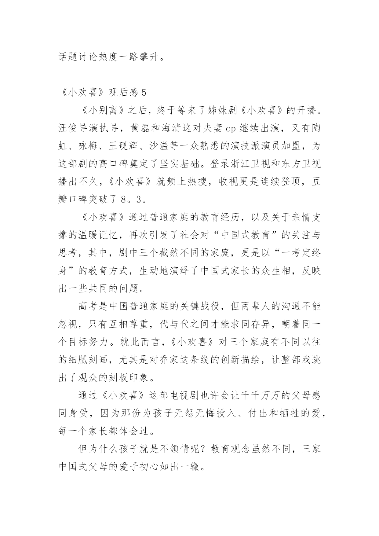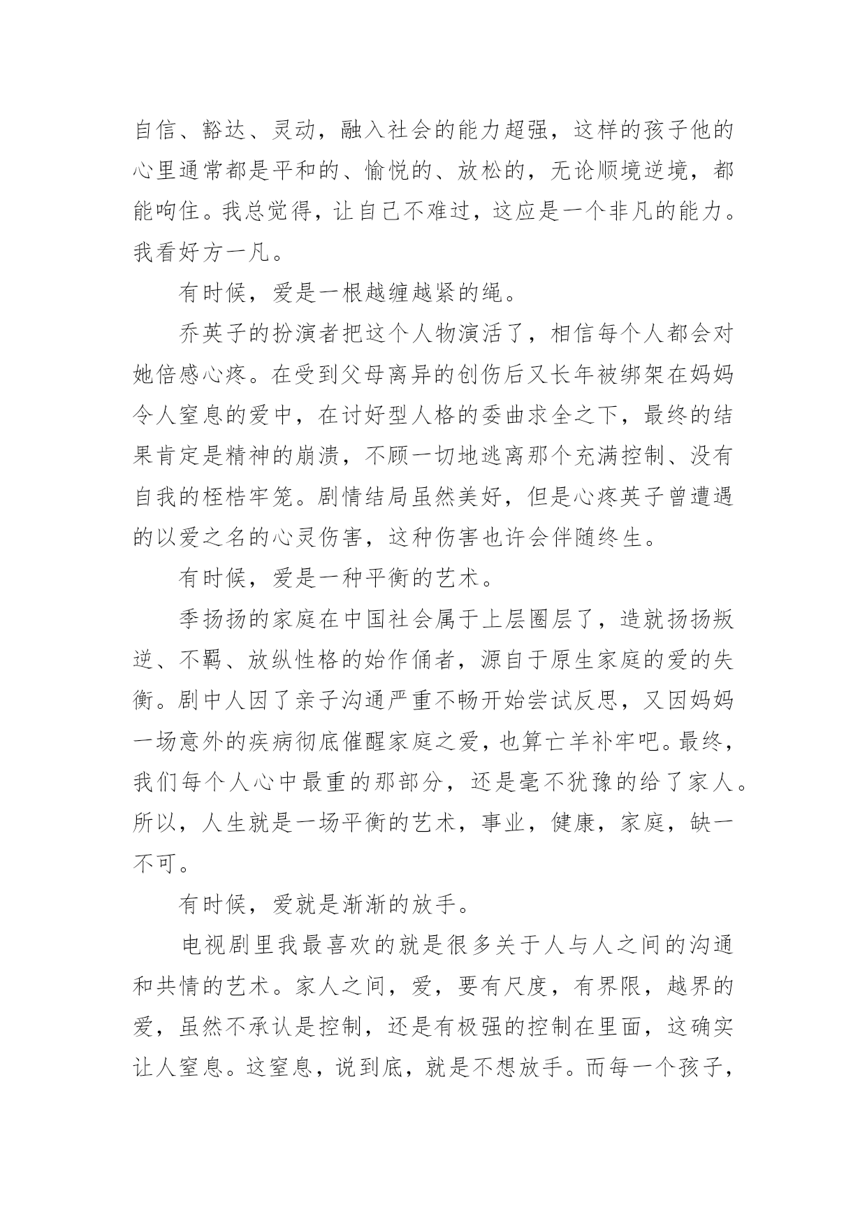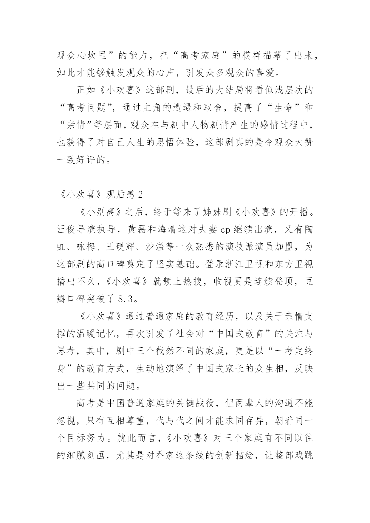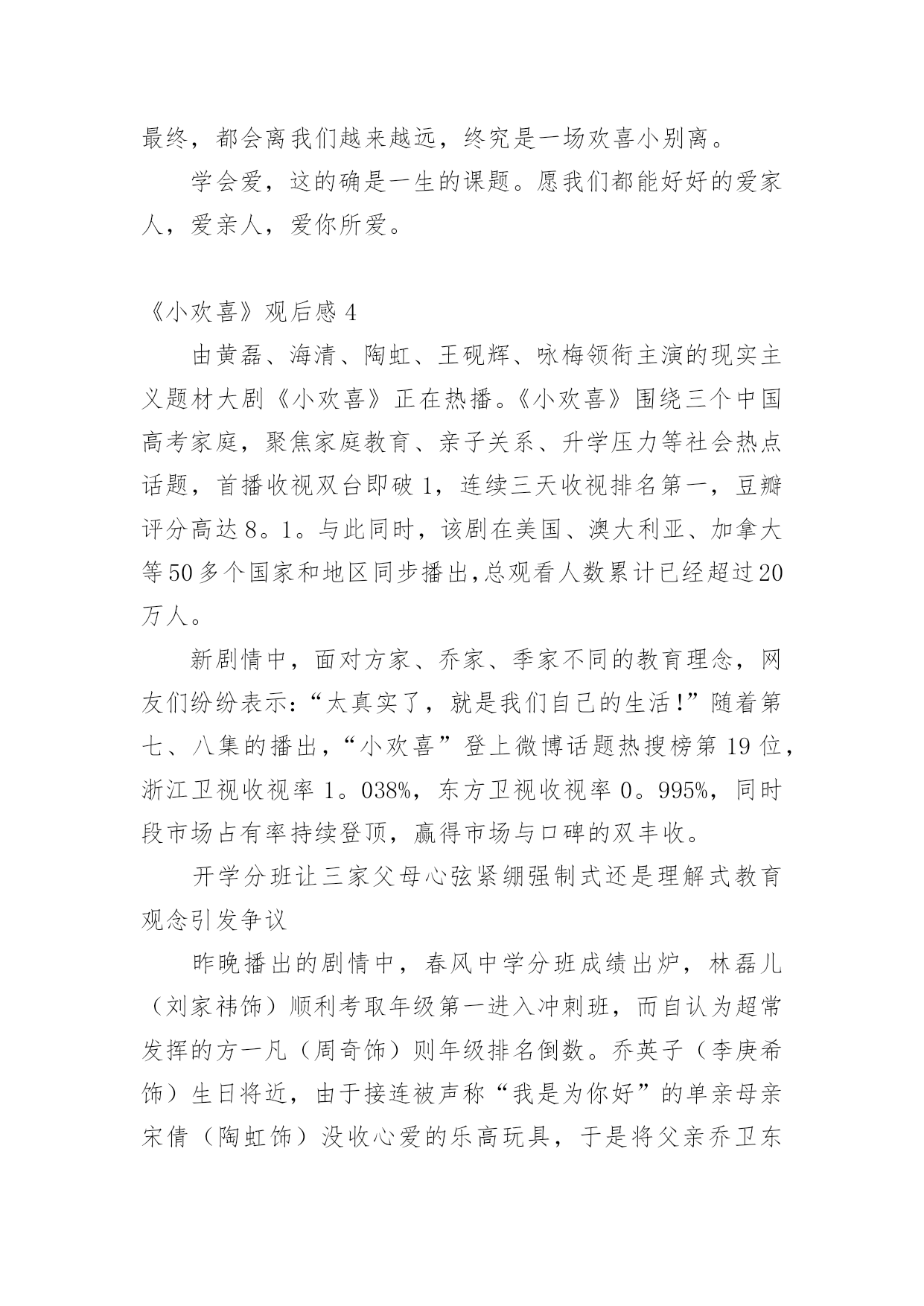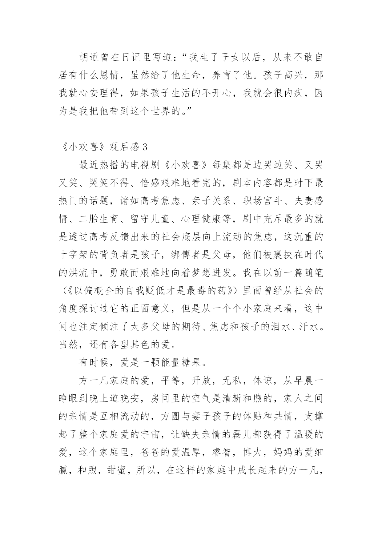 《小欢喜》观后感《小欢喜》观后感10篇看完一部作品以后,相信大家增长不少见闻吧,记录下来很重要哦,一起来写一篇观后感吧。观后感你想好怎么写了吗?下面是小编收集整理的《小欢喜》观后感,仅供参考,希望能够帮助到大家。《小欢喜》观后感1暑期即将结束了,最后一部现代都市家庭剧也是非常的火热,那就是《小欢喜》,自从开播后,无论是号召力收视率还是口碑都是非常不错的,深受观众喜爱,获得了一致好评,作为暑期档的压轴之作,单日收视率破亿,登上影视收视率第一的宝座,细节上的精心打磨和嫉妒贴近生活的剧作设计,非常吸引观众。在最近,剧情高潮片段期间,我们几乎天天都能在热搜上看到剧中人物,比如方一凡、英子、宋倩等主人的名字频繁出现,在这部剧中无论是家长还是学生他们演技都是非常棒的,堪称暑期档的良心大剧。这部剧于7月30日上映,8月27日圆满收官,累计播放量已超过25.1亿,双双丰收,刚上线一周就超越了《长安十二时辰》也是一部暑期档的热播剧,而上线两周后,超过了暑期档霸主《陈情令》,并守擂至今,非常值得赞赏的一部家庭剧。刚上映开播后就得到了豆瓣8.2的高分,在如今大结局不料还涨了一分,达到了8.3分,是一部国剧精品,相信许多观众看了之后对孩子的教育,以及生活方式会有所感想,有所改变,毕竟这样我们也会像剧中一样,整个家庭温馨和谐,孩子们顺利的考上理想大学。和这部剧剧名差不多也是家庭剧的一部剧叫做《小别离》估计也有许多都看过,这是一部关于家庭父母婚姻状况生活方式的剧,两部电视剧的发行公司有所重合,导演是同一个人,在演员的选择上,两部剧也有一些共同之处,观看后的观众们也都会发现,虽然有相似之处,但是演出的剧情却完全不一样。间隔三年后,再次还能够带着成功经验有备而来,认真创作《小欢喜》,继续又收割了一批新观众,而陶虹的嫁入,更为剧本增添了不少的色彩,时隔多年后再次创作的首部作品,演技依旧是得到大众的认可,弹幕中就有许多观众表示对陶虹实力女演员十分喜爱。在剧情中,三组家庭的冲突,即便没有概括所有中国家庭在教育方面上的矛盾,至少也概括出了大多数城市家庭切身体会或目睹的情况,因此无论是“童文洁骂方一凡的方式”还是“宋倩2式的包围式母爱”都能被普通观众有兴致的讨论。总之,《小别离》的成功离不开它对中国“留学家庭”这个群体极有深度的刻画,《小欢喜》则继承了这种“写进观众心坎里”的能力,把“高考家庭”的模样描摹了出来,如此才能够触发观众的心声,引发众多观众的喜爱。正如《小欢喜》这部剧,最后的大结局将看似浅层次的“高考问题”,通过主角的遭遇和取舍,提高了“生命”和“亲情”等层面,观众在与剧中人物剧情产生的感情过程中,也获得了对自己人生的思悟体验,这部剧真的是令观众大赞一致好评的。《小欢喜》观后感2《小别离》之后,终于等来了姊妹剧《小欢喜》的开播。汪俊导演执导,黄磊和海清这对夫妻cp继续出演,又有陶虹、咏梅、王砚辉、沙溢等一众熟悉的演技派演员加盟,为这部剧的高口碑奠定了坚实基础。登录浙江卫视和东方卫视播出不久,《小欢喜》就频上热搜,收视更是连续登顶,豆瓣口碑突破了8.3。《小欢喜》通过普通家庭的教育经历,以及关于亲情支撑的温暖记忆,再次引发了社会对“中国式教育”的关注与思考,其中,剧中三个截然不同的家庭,更是以“一考定终身”的教育方式,生动地演绎了中国式家长的众生相,反映出一些共同的问题。高考是中国普通家庭的关键战役,但两辈人的沟通不能忽视,只有互相尊重,代与代之间才能求同存异,朝着同一个目标努力。就此而言,《小欢喜》对三个家庭有不同以往的细腻刻画,尤其是对乔家这条线的创新描绘,让整部戏跳出了观众的刻板印象。通过《小欢喜》这部电视剧也许会让千千万万的父母感同身受,因为那份为孩子无怨无悔投入、付出和牺牲的爱,每一个家长都体会过。但为什么孩子就是不领情呢?教育观念虽然不同,三家中国式父母的爱子初心如出一辙。方家妈妈前面还在为孩子学习垫底大发雷霆,后脚就为了保障孩子睡眠的充足,搬进了月租过万的学区房;乔家妈妈为把女儿送进北大清华,不惜辞职照顾,发明了“生吞海参”的食疗方法以让女儿能多背20个英文单词,但窒息式关怀和兴趣干涉让女儿喘不过气;季家区长爸爸为不让儿子受冻,逼其穿上秋裤,为了跟孩子亲近,去尝试孩子喜爱的赛车……我们爱子女,只是毋庸置疑的。但我们是否也要反思我们爱的方式是否正确呢?当父母强制性地将自己的意愿寄托在孩子身上时,孩子不仅不堪重负,很可能适得其反;教育并不仅仅体现在孩子的分数上,更应体现在孩子的品德、素养、良知上。可能很多人认为,教育问题就是孩子的学习问题,可实际上,教育问题与亲子关系紧密相关。父母拥有怎样的教育观、如何对待孩子,都会深刻影响着孩子的学习观念、学习状态,乃至孩子的性格人品、身心健康。否则,如果孩子成绩上去了,身心却受到损害了,与自己的关系却崩塌了,