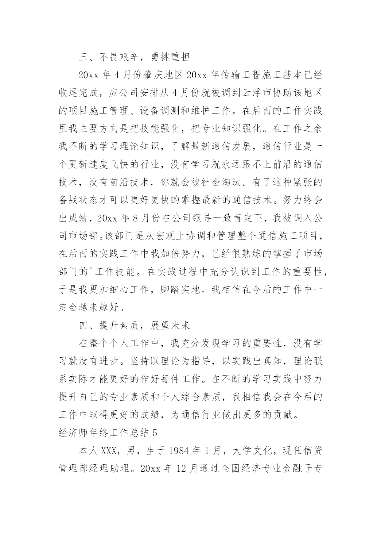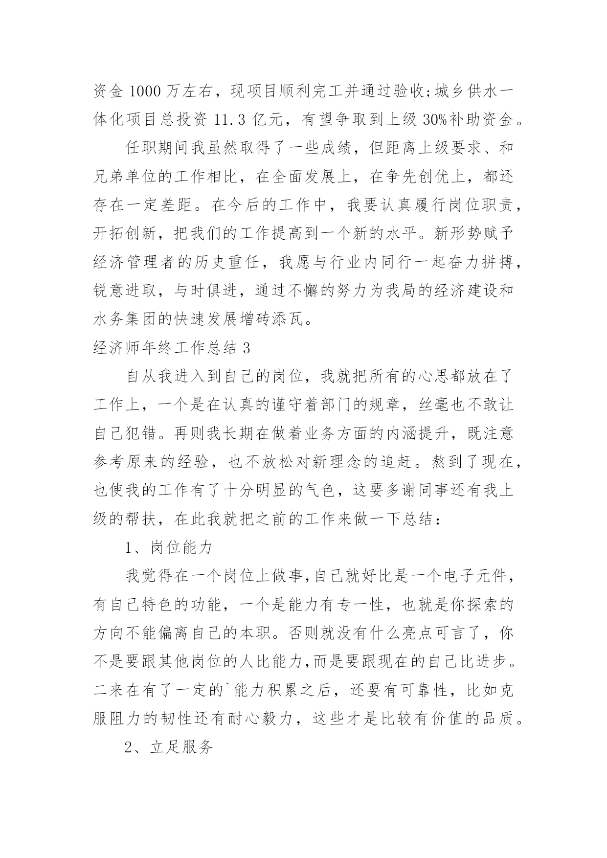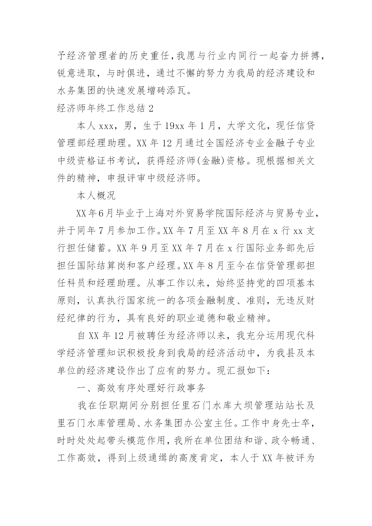 经济师年终工作总结经济师年终工作总结总结是在一段时间内对学习和工作生活等表现加以总结和概括的一种书面材料,它能帮我们理顺知识结构,突出重点,突破难点,因此好好准备一份总结吧。那么你知道总结如何写吗?以下是小编整理的经济师年终工作总结,欢迎大家借鉴与参考,希望对大家有所帮助。经济师年终工作总结1自20xx年12月被聘任为经济师以来,我充分运用现代科学经济管理知识积极投身到我局的经济活动中,为我县及本单位的经济建设作出了应有的努力。现汇报如下:一、高效有序处理好行政事务我在任职期间分别担任xx水库大坝管理站站长及xx水库管理局、水务集团办公室主任。工作中身先士卒,时时处处起带头模范作用,我所在单位团结和谐、政令畅通、工作高效,得到上级通缉的高度肯定,本人于20xx年被评为县优秀共产党员。二、及时提出天台县城乡供水一体化方案并付诸实施结合我县实际,我于20xx年1月份向县领导提出了天台县城乡供水一体化的建议,此建议得到县主要领导的高度肯定,随后我进一步做了深入细致的调研,以正式行文上报县政府《关于天台县城乡供水一体化调研报告》,县党委会研究后一致通过该方案,XX也及时跟进以20xx年人代会一号议案提出。该工程现已通过省级立项,拟列入20xx年度省级重点工程。该工程总投资11.3亿元。项目的成功实施能有效解决我县区域性供水矛盾、城乡供水保障能力差、水资源统筹规划滞后等一系列问题。在原水管线没建成前,城关水厂已提前由里石水库通过北干渠提供源水,给xx水库管理局带来300万元的年收益。我现主要负责建设资金的筹措工作,正同钱江水利、中国水电等上市公司洽谈,基本形成合作框架,有望在20xx年7月份签订合作协议。三、主持完成天台水务集团的组建工作为明确城乡供水一体化项目实施主体,搭建融资平台,我就命于水务集团组建工作。水务集团组建主要是对我县涉水单位进行公司制改造后重组而成,期间涉及单位、部门之间的利益搏奕,我会同班子成员对相关单位及有关县领导做好细致的沟通工作,最终达成一致意见。从20xx年9月份对相关单位进行清产核资到11月28日公司制改造完成后注册成立,共用3个月时间。天台水务集团有限公司,注册资本2亿元,下属五家子公司总资产约6.5亿元,是县政府直属并实行公司化、市场化运作的经营性公司,代行县政府供水一体化建设主体职责,是我县第一家国有独资集团公司。四、优化水电站经济运行方案合溪水电站发电用水来自里石水库北干渠,因北干渠水位不稳定,长期导致机组出力不足。为此,我带领电站技术骨干,实施技术改造及改变运行方式。一是在压力前池增设二台节制闸,通过节制闸来抬高及稳定水位;二是通过节制闸调节,改变运行方式,多发峰电少发谷电。通过以上二项措施,合溪水电站及后来投产的渡槽电站共增年发电量20万度,加上峰谷电差收入,共年增收10多万元。五、参与水利、水电工程项目争取及工程建设管理任职期间我共参与争取到项目资金1.435亿元,其中国家农业综合开发xx水库灌区节水配套改造项目一期总投资2480万元,二期工程总投资2650万元,“十一五”期间农业综合开发项目二次落户天台,为全省首例,该项目实现当年申报、当年立项、当年正式开工建设,该项目已全面竣工;浙江省“千万亩十亿方”xx水库灌区节水配套改造项目一期工程总投资1680万元,三期工程总投资1800万元,已全面完成施工项目;大坝除险加固改造工程总投资3210万元,已完成工程建设内容,正在做竣工验收准备工作;xx水电站报废重建项目总投资2525.8万元,共争取到上级补助资金1000万左右,现项目顺利完工并通过验收;城乡供水一体化项目总投资11.3亿元,有望争取到上级30%补助资金。任职期间我虽然取得了一些成绩,但距离上级要求、和兄弟单位的工作相比,在全面发展上,在争先创优上,都还存在一定差距。在今后的工作中,我要认真履行岗位职责,开拓创新,把我们的`工作提高到一个新的水平。新形势赋予经济管理者的历史重任,我愿与行业内同行一起奋力拼搏,锐意进取,与时俱进,通过不懈的努力为我局的经济建设和水务集团的快速发展增砖添瓦。经济师年终工作总结2本人xxx,男,生于19xx年1月,大学文化,现任信贷管理部经理助理。XX年12月通过全国经济专业金融子专业中级资格证书考试,获得经济师(金融)资格。现根据相关文件的精神,申报评审中级经济师。本人概况XX年6月毕业于上海对外贸易学院国际经济与贸易专业,并于同年7月参加工作。XX年7月至XX年8月在x行xx支行担任储蓄。XX年9月至XX年7月在x行国际业务部先后担任国际结算岗和客户经理。XX年8月至今在信贷管理部担任科员和经理助理。从事工作以来,始终坚持党的四项基本原则,认真执行国家统一的各项金融制度、准则,无违反财经纪律的行为,具有良好的职业道德和敬业精神。自XX年12月被聘任为经