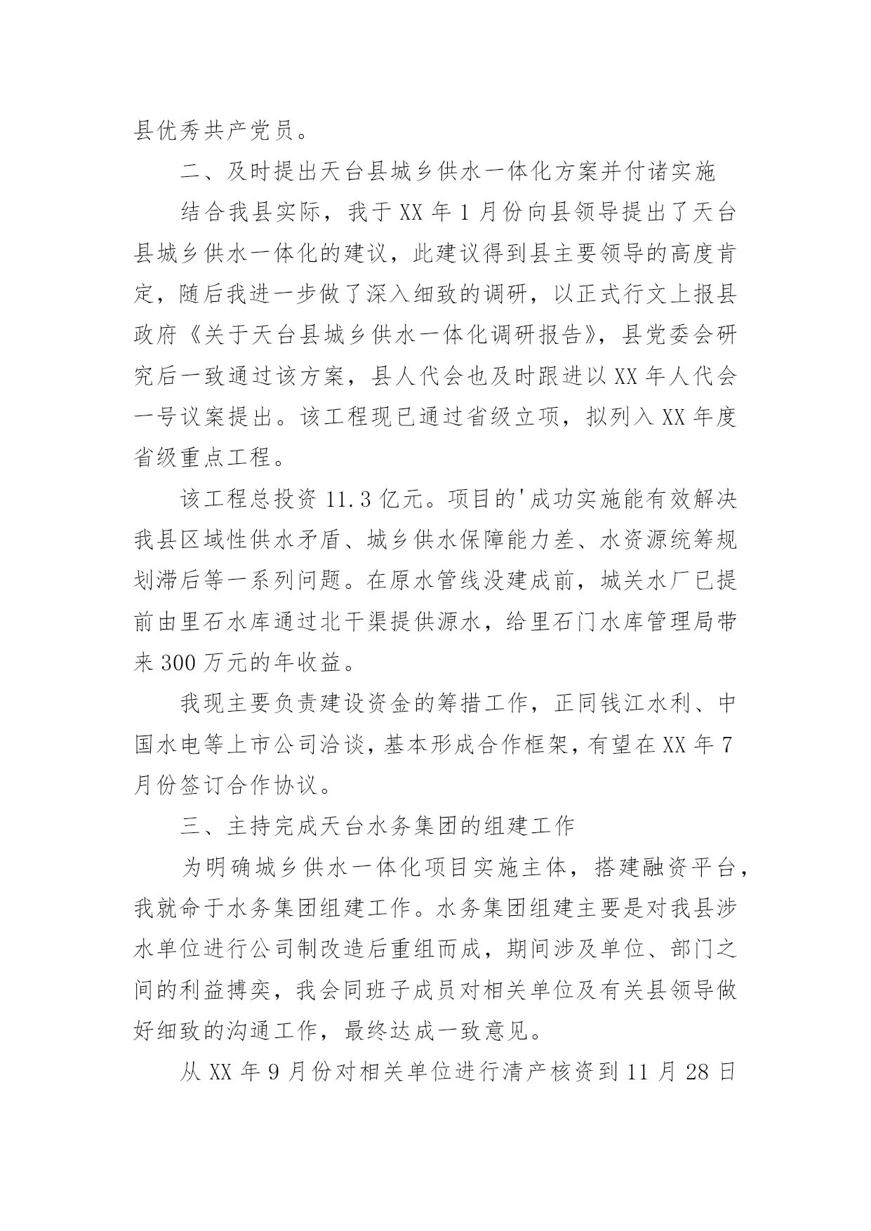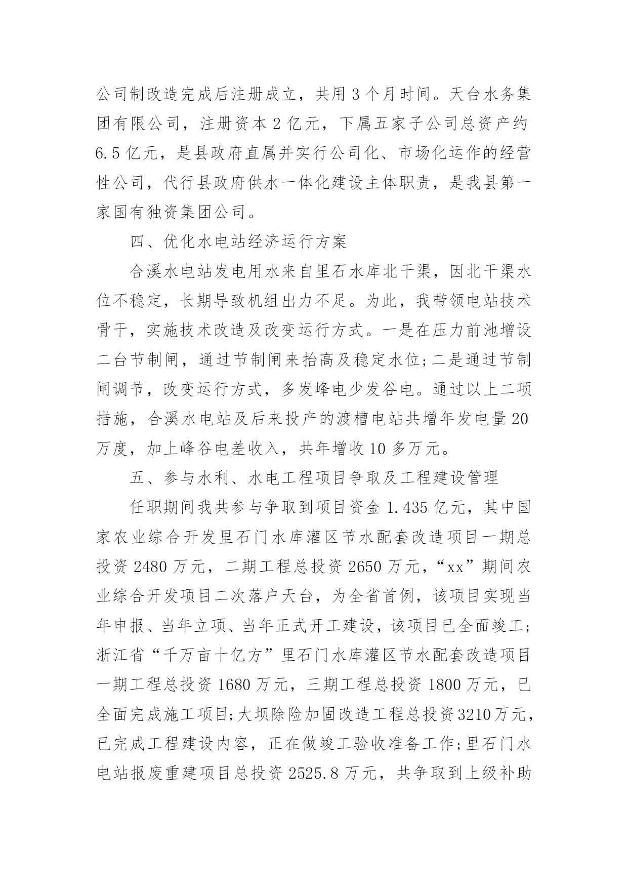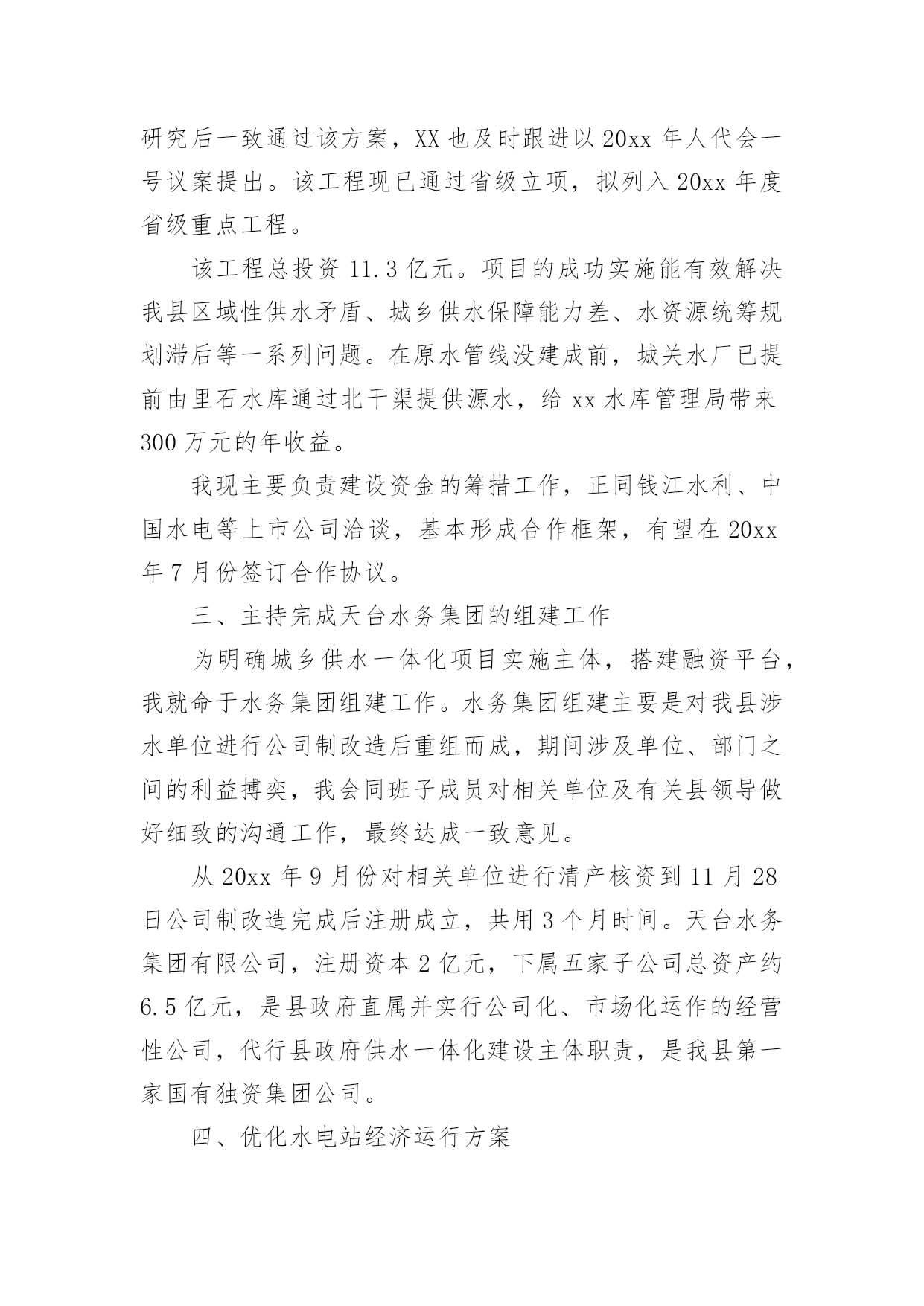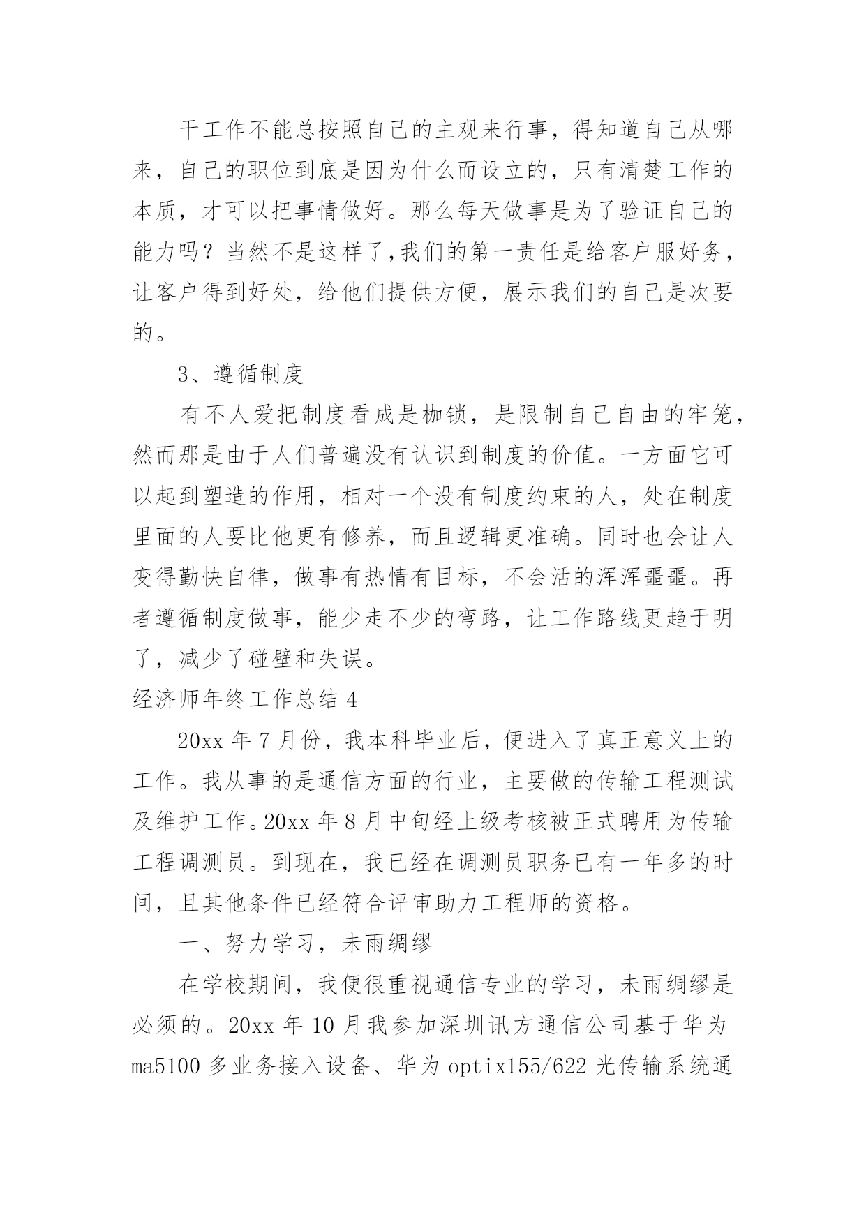 经济师年终工作总结经济师年终工作总结总结是在一段时间内对学习和工作生活等表现加以总结和概括的一种书面材料,它能帮我们理顺知识结构,突出重点,突破难点,因此好好准备一份总结吧。那么你知道总结如何写吗?以下是小编整理的经济师年终工作总结,欢迎大家借鉴与参考,希望对大家有所帮助。经济师年终工作总结1自20xx年12月被聘任为经济师以来,我充分运用现代科学经济管理知识积极投身到我局的经济活动中,为我县及本单位的经济建设作出了应有的努力。现汇报如下:一、高效有序处理好行政事务我在任职期间分别担任xx水库大坝管理站站长及xx水库管理局、水务集团办公室主任。工作中身先士卒,时时处处起带头模范作用,我所在单位团结和谐、政令畅通、工作高效,得到上级通缉的高度肯定,本人于20xx年被评为县优秀共产党员。二、及时提出天台县城乡供水一体化方案并付诸实施结合我县实际,我于20xx年1月份向县领导提出了天台县城乡供水一体化的建议,此建议得到县主要领导的高度肯定,随后我进一步做了深入细致的调研,以正式行文上报县政府《关于天台县城乡供水一体化调研报告》,县党委会研究后一致通过该方案,XX也及时跟进以20xx年人代会一号议案提出。该工程现已通过省级立项,拟列入20xx年度省级重点工程。该工程总投资11.3亿元。项目的成功实施能有效解决我县区域性供水矛盾、城乡供水保障能力差、水资源统筹规划滞后等一系列问题。在原水管线没建成前,城关水厂已提前由里石水库通过北干渠提供源水,给xx水库管理局带来300万元的年收益。我现主要负责建设资金的筹措工作,正同钱江水利、中国水电等上市公司洽谈,基本形成合作框架,有望在20xx年7月份签订合作协议。三、主持完成天台水务集团的组建工作为明确城乡供水一体化项目实施主体,搭建融资平台,我就命于水务集团组建工作。水务集团组建主要是对我县涉水单位进行公司制改造后重组而成,期间涉及单位、部门之间的利益搏奕,我会同班子成员对相关单位及有关县领导做好细致的沟通工作,最终达成一致意见。从20xx年9月份对相关单位进行清产核资到11月28日公司制改造完成后注册成立,共用3个月时间。天台水务集团有限公司,注册资本2亿元,下属五家子公司总资产约6.5亿元,是县政府直属并实行公司化、市场化运作的经营性公司,代行县政府供水一体化建设主体职责,是我县第一家国有独资集团公司。四、优化水电站经济运行方案合溪水电站发电用水来自里石水库北干渠,因北干渠水位不稳定,长期导致机组出力不足。为此,我带领电站技术骨干,实施技术改造及改变运行方式。一是在压力前池增设二台节制闸,通过节制闸来抬高及稳定水位;二是通过节制闸调节,改变运行方式,多发峰电少发谷电。通过以上二项措施,合溪水电站及后来投产的渡槽电站共增年发电量20万度,加上峰谷电差收入,共年增收10多万元。五、参与水利、水电工程项目争取及工程建设管理任职期间我共参与争取到项目资金1.435亿元,其中国家农业综合开发xx水库灌区节水配套改造项目一期总投资2480万元,二期工程总投资2650万元,“十一五”期间农业综合开发项目二次落户天台,为全省首例,该项目实现当年申报、当年立项、当年正式开工建设,该项目已全面竣工;浙江省“千万亩十亿方”xx水库灌区节水配套改造项目一期工程总投资1680万元,三期工程总投资1800万元,已全面完成施工项目;大坝除险加固改造工程总投资3210万元,已完成工程建设内容,正在做竣工验收准备工作;xx水电站报废重建项目总投资2525.8万元,共争取到上级补助资金1000万左右,现项目顺利完工并通过验收;城乡供水一体化项目总投资11.3亿元,有望争取到上级30%补助资金。任职期间我虽然取得了一些成绩,但距离上级要求、和兄弟单位的工作相比,在全面发展上,在争先创优上,都还存在一定差距。在今后的工作中,我要认真履行岗位职责,开拓创新,把我们的`工作提高到一个新的水平。新形势赋予经济管理者的历史重任,我愿与行业内同行一起奋力拼搏,锐意进取,与时俱进,通过不懈的努力为我局的经济建设和水务集团的快速发展增砖添瓦。经济师年终工作总结2本人xxx,男,生于19xx年1月,大学文化,现任信贷管理部经理助理。XX年12月通过全国经济专业金融子专业中级资格证书考试,获得经济师(金融)资格。现根据相关文件的精神,申报评审中级经济师。本人概况XX年6月毕业于上海对外贸易学院国际经济与贸易专业,并于同年7月参加工作。XX年7月至XX年8月在x行xx支行担任储蓄。XX年9月至XX年7月在x行国际业务部先后担任国际结算岗和客户经理。XX年8月至今在信贷管理部担任科员和经理助理。从事工作以来,始终坚持党的四项基本原则,认真执行国家统一的各项金融制度、准则,无违反财经纪律的行为,具有良好的职业道德和敬业精神。自XX年12月被聘任为经