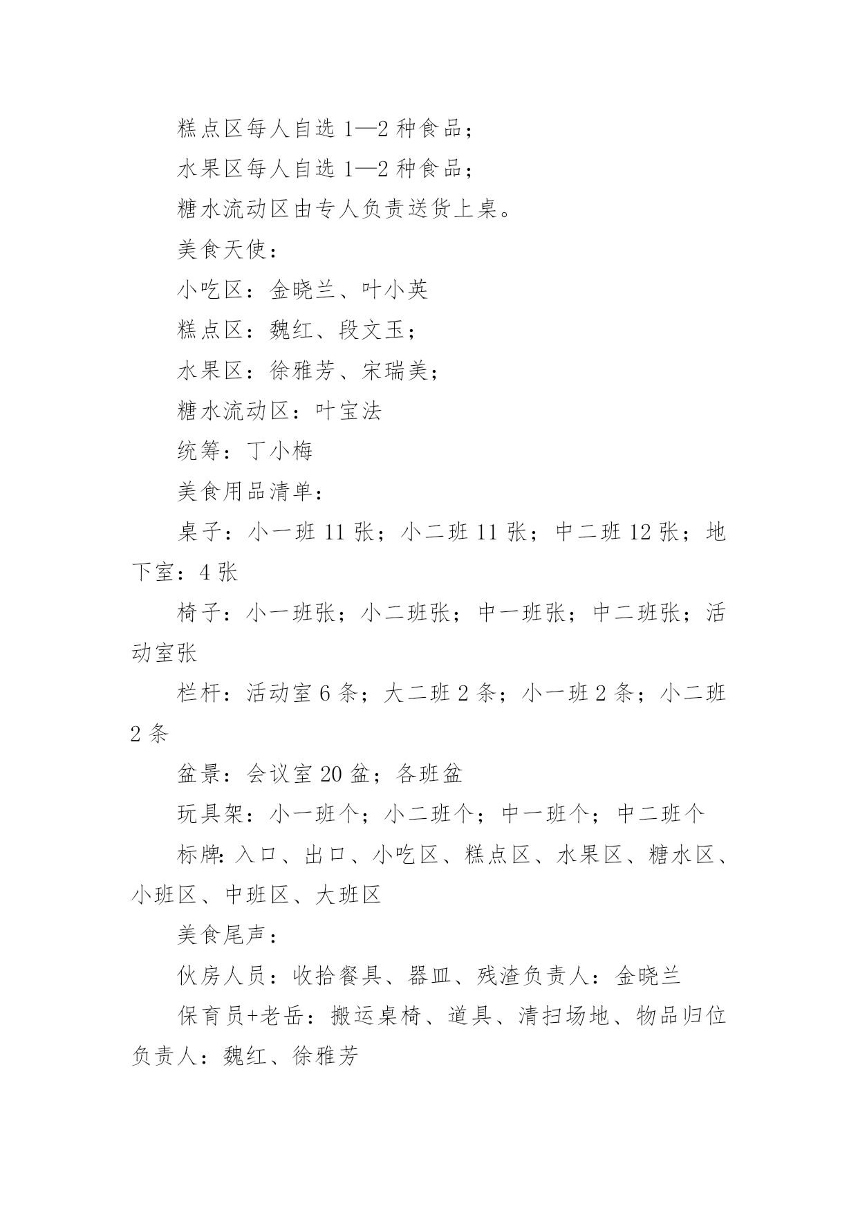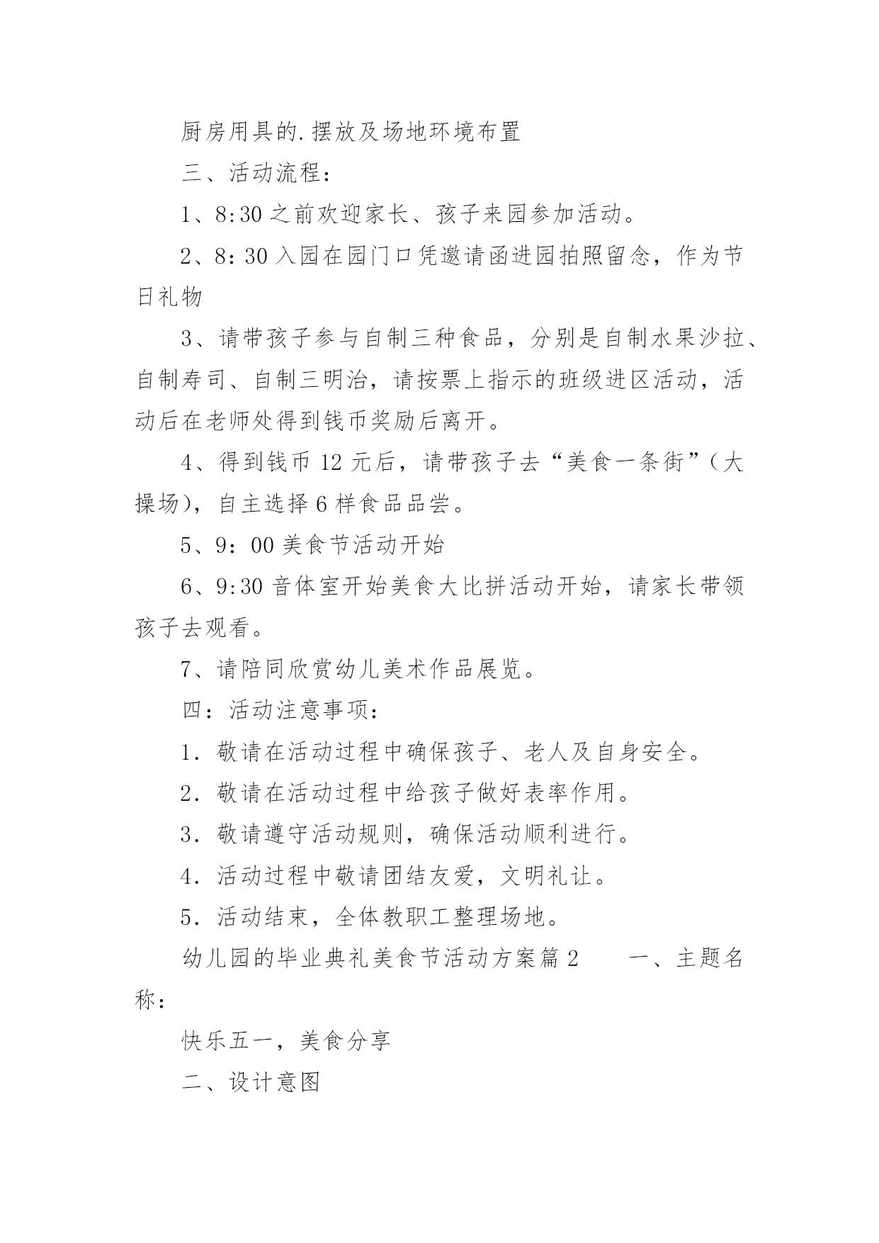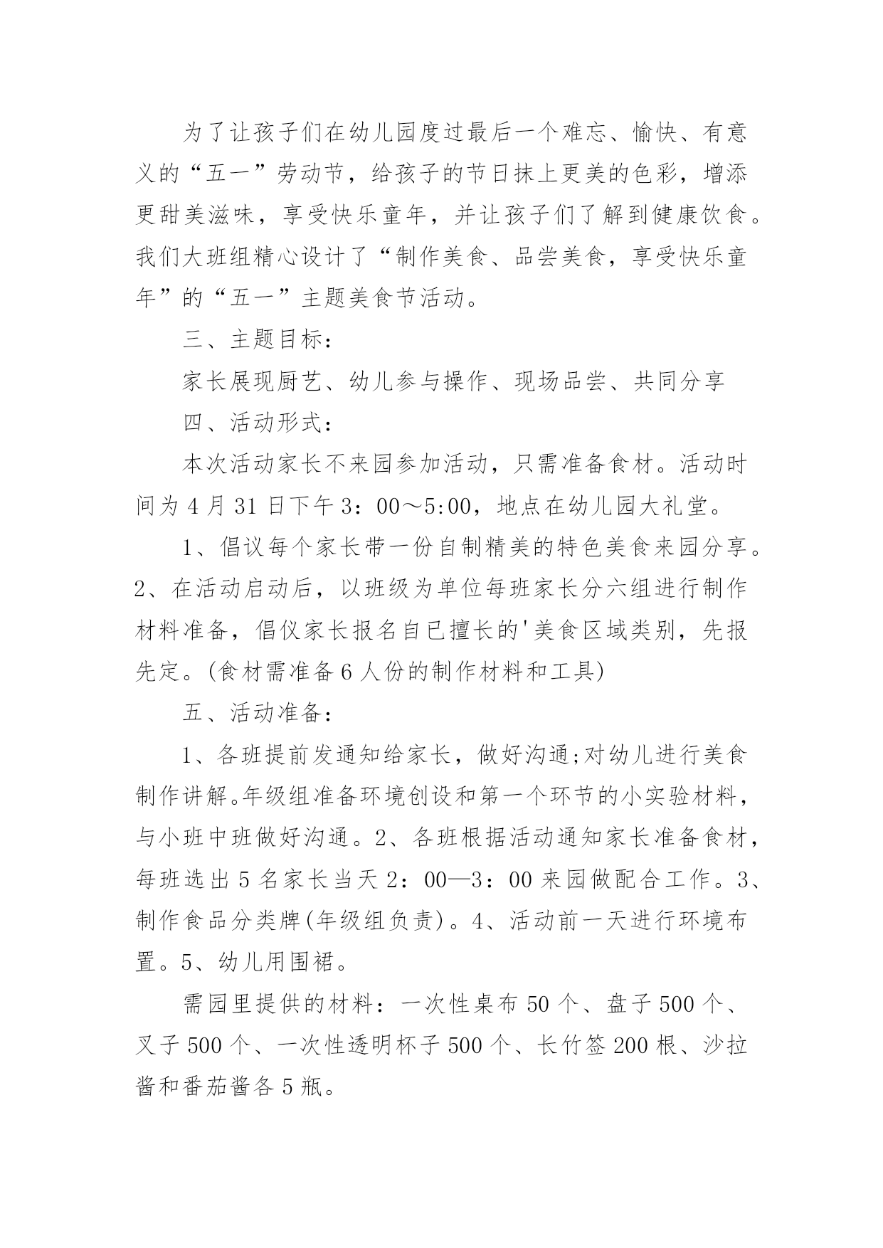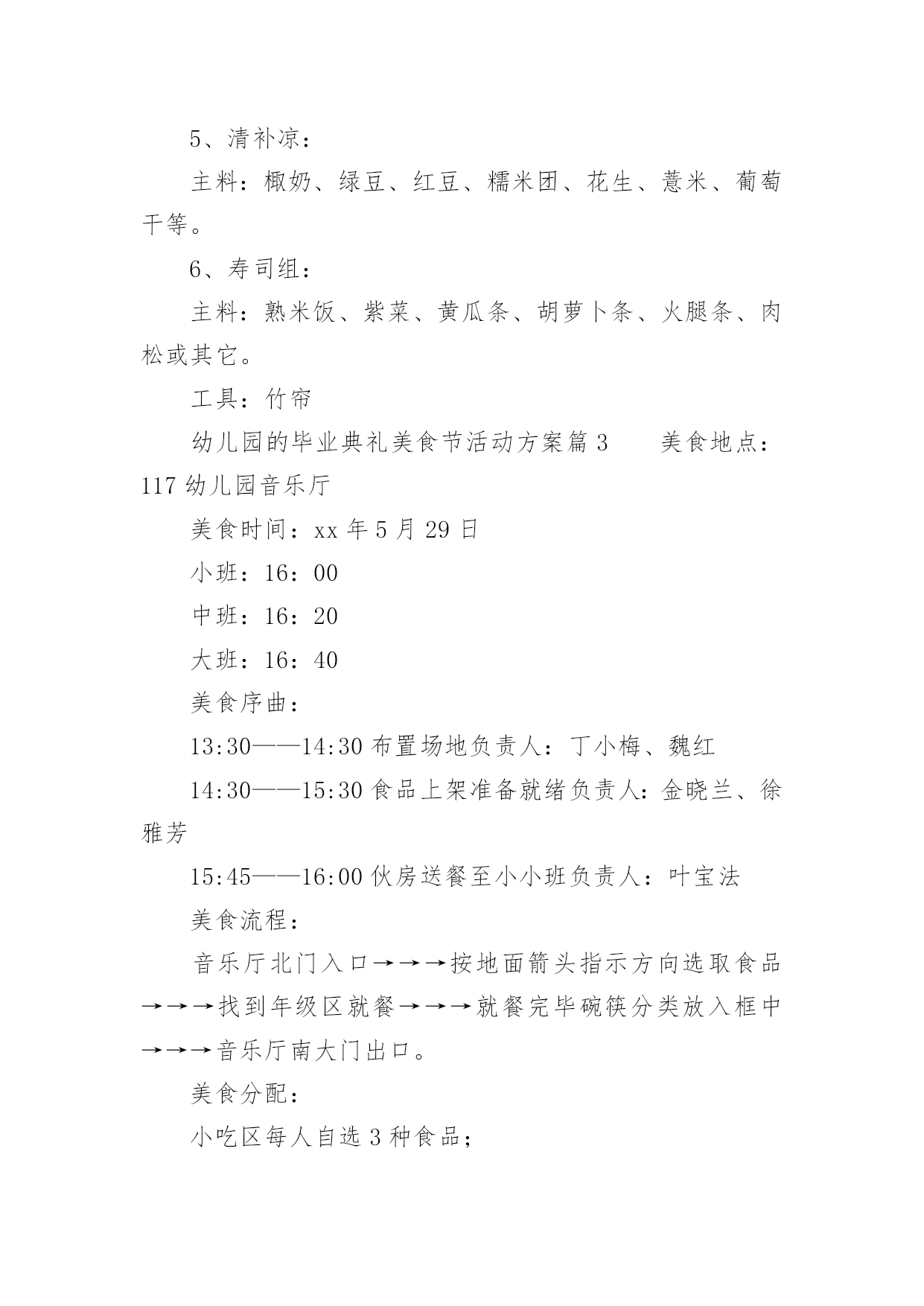幼儿园的毕业典礼美食节活动方案幼儿园的毕业典礼美食节活动方案(精选12篇)为了确保活动有效开展,常常需要预先准备活动方案,一份好的活动方案一定会注重受众的参与性及互动性。那么什么样的活动方案才是好的呢?下面是小编为大家整理的幼儿园的毕业典礼美食节活动方案(精选12篇),欢迎阅读与收藏。幼儿园的毕业典礼美食节活动方案篇1为了丰富幼儿园饮食文化生活,培养孩子动手能力,增强亲子情感交流,并充分展示幼儿家长厨艺,为幼儿的健康成长打造美食天地。我园特此举办“美食一条街”活动,邀请家长与孩子共同参加,以达到提高幼儿饮食质量,促进幼儿身体健康,家园相互交流的目的。一、具体负责人:园长,各级领导,各班班长全体教师以及各班家长委员会二、各项准备:1.物品准备:班级特色食物、各种水果、蔬菜、菜板、刀子、围裙、沙拉酱等等。2.人员准备:家委会成员3.场地准备:厨房用具的.摆放及场地环境布置三、活动流程:1、8:30之前欢迎家长、孩子来园参加活动。2、8:30入园在园门口凭邀请函进园拍照留念,作为节日礼物3、请带孩子参与自制三种食品,分别是自制水果沙拉、自制寿司、自制三明治,请按票上指示的班级进区活动,活动后在老师处得到钱币奖励后离开。4、得到钱币12元后,请带孩子去“美食一条街”(大操场),自主选择6样食品品尝。5、9:00美食节活动开始6、9:30音体室开始美食大比拼活动开始,请家长带领孩子去观看。7、请陪同欣赏幼儿美术作品展览。四:活动注意事项:1.敬请在活动过程中确保孩子、老人及自身安全。2.敬请在活动过程中给孩子做好表率作用。3.敬请遵守活动规则,确保活动顺利进行。4.活动过程中敬请团结友爱,文明礼让。5.活动结束,全体教职工整理场地。幼儿园的毕业典礼美食节活动方案篇2一、主题名称:快乐五一,美食分享二、设计意图为了让孩子们在幼儿园度过最后一个难忘、愉快、有意义的“五一”劳动节,给孩子的节日抹上更美的色彩,增添更甜美滋味,享受快乐童年,并让孩子们了解到健康饮食。我们大班组精心设计了“制作美食、品尝美食,享受快乐童年”的“五一”主题美食节活动。三、主题目标:家长展现厨艺、幼儿参与操作、现场品尝、共同分享四、活动形式:本次活动家长不来园参加活动,只需准备食材。活动时间为4月31日下午3:00~5:00,地点在幼儿园大礼堂。1、倡议每个家长带一份自制精美的特色美食来园分享。2、在活动启动后,以班级为单位每班家长分六组进行制作材料准备,倡仪家长报名自已擅长的'美食区域类别,先报先定。(食材需准备6人份的制作材料和工具)五、活动准备:1、各班提前发通知给家长,做好沟通;对幼儿进行美食制作讲解。年级组准备环境创设和第一个环节的小实验材料,与小班中班做好沟通。2、各班根据活动通知家长准备食材,每班选出5名家长当天2:00—3:00来园做配合工作。3、制作食品分类牌(年级组负责)。4、活动前一天进行环境布置。5、幼儿用围裙。需园里提供的材料:一次性桌布50个、盘子500个、叉子500个、一次性透明杯子500个、长竹签200根、沙拉酱和番茄酱各5瓶。家长准备:一、每个家庭准备一份自制精美小吃于当天带来幼儿园和小朋友分享(内容自选)。二、每位幼儿在准备食材的6项中选择一种食品准备材料,用于幼儿当天制作,并于当天上午带来园。(食材需准备6人份的材料和工具)六、活动流程:1、观看小实验,了解饮料的制作过程。2、自己动手制作美食。3、邀请小班和中班的弟弟妹妹一起分享美食。备注:幼儿制作美食分类:1、创意饭团组制作主料:熟米饭(大米和糯米)制作辅料:水果类或蔬菜类等做饰物、花生米,肉松、紫菜、海鲜酱、番茄酱。2、春卷组主料:豆腐皮、酱肉丝、胡萝卜丝、黄瓜丝。3、三明治组:主料:切片吐司面包、火腿肠、生菜、奶酪片、西红杮、千岛酱4、蔬菜沙拉组:主料:熟土豆块、鹿茸菜、紫甘蓝、西红柿、红腰豆、蓝莓、七彩椒等,千岛酱或沙拉酱。5、清补凉:主料:棷奶、绿豆、红豆、糯米团、花生、薏米、葡萄干等。6、寿司组:主料:熟米饭、紫菜、黄瓜条、胡萝卜条、火腿条、肉松或其它。工具:竹帘幼儿园的毕业典礼美食节活动方案篇3美食地点:117幼儿园音乐厅美食时间:xx年5月29日小班:16:00中班:16:20大班:16:40美食序曲:13:30——14:30布置场地负责人:丁小梅、魏红14:30——15:30食品上架准备就绪负责人:金晓兰、徐雅芳15:45——16:00伙房送餐至小小班负责人:叶宝法美食流程:音乐厅北门入口→→→按地面箭头指示方向选取食品→→→找到年级区就餐→→→就餐完毕碗筷分类放入框中→→→音乐厅南大门出口。美食分配:小吃区每人自选3种食品;糕点区每人自选1—2种食品;水果区每人自选1—2种食品;糖水流动区由专人负责送货上桌。美食天使:小吃区:金晓兰、叶小英糕点区:魏红、段