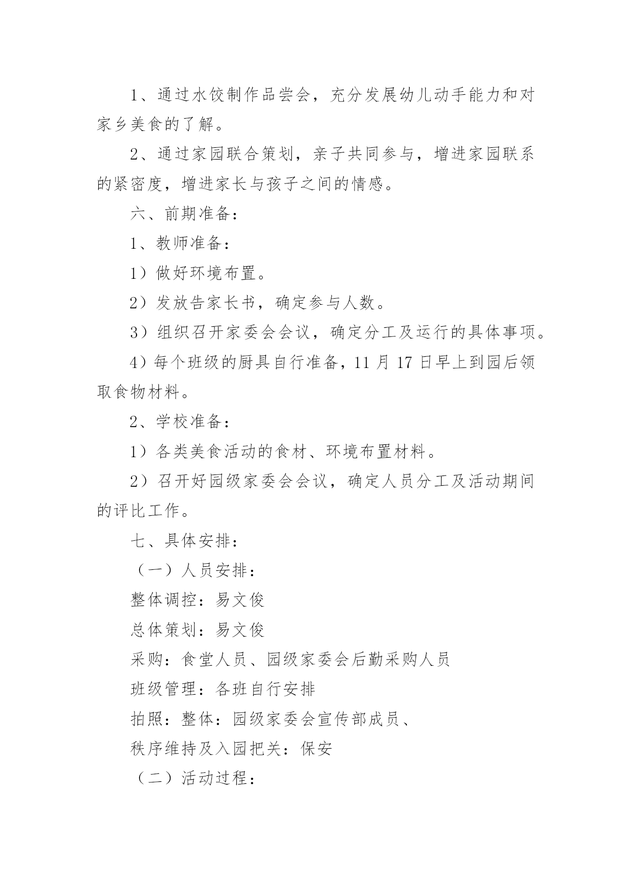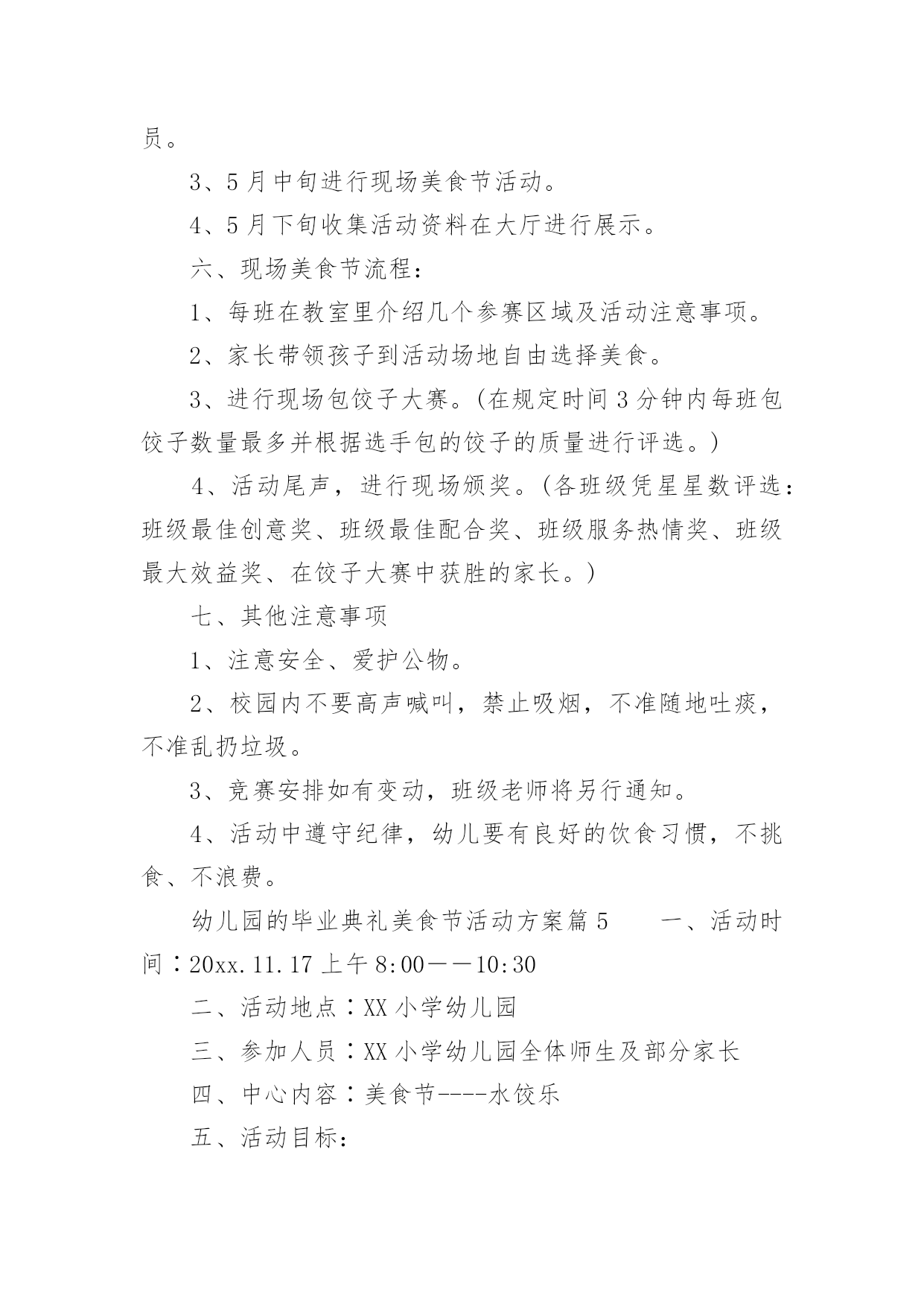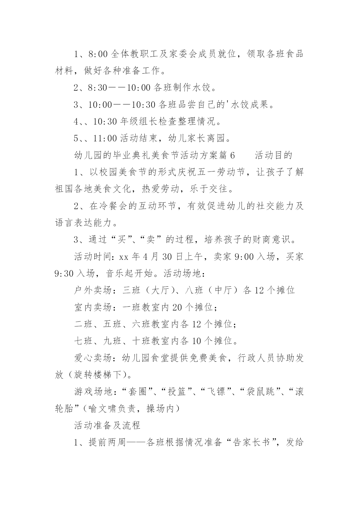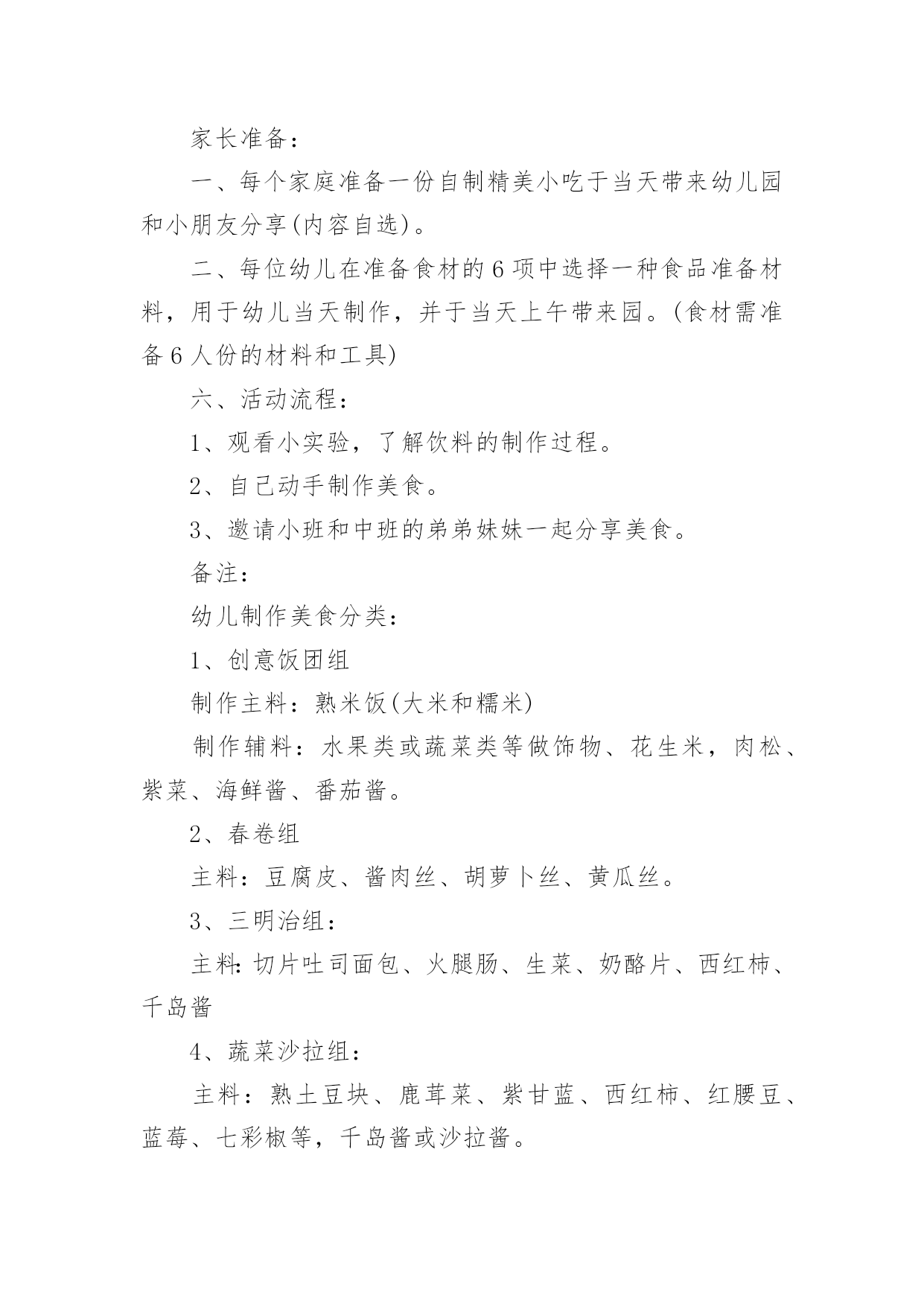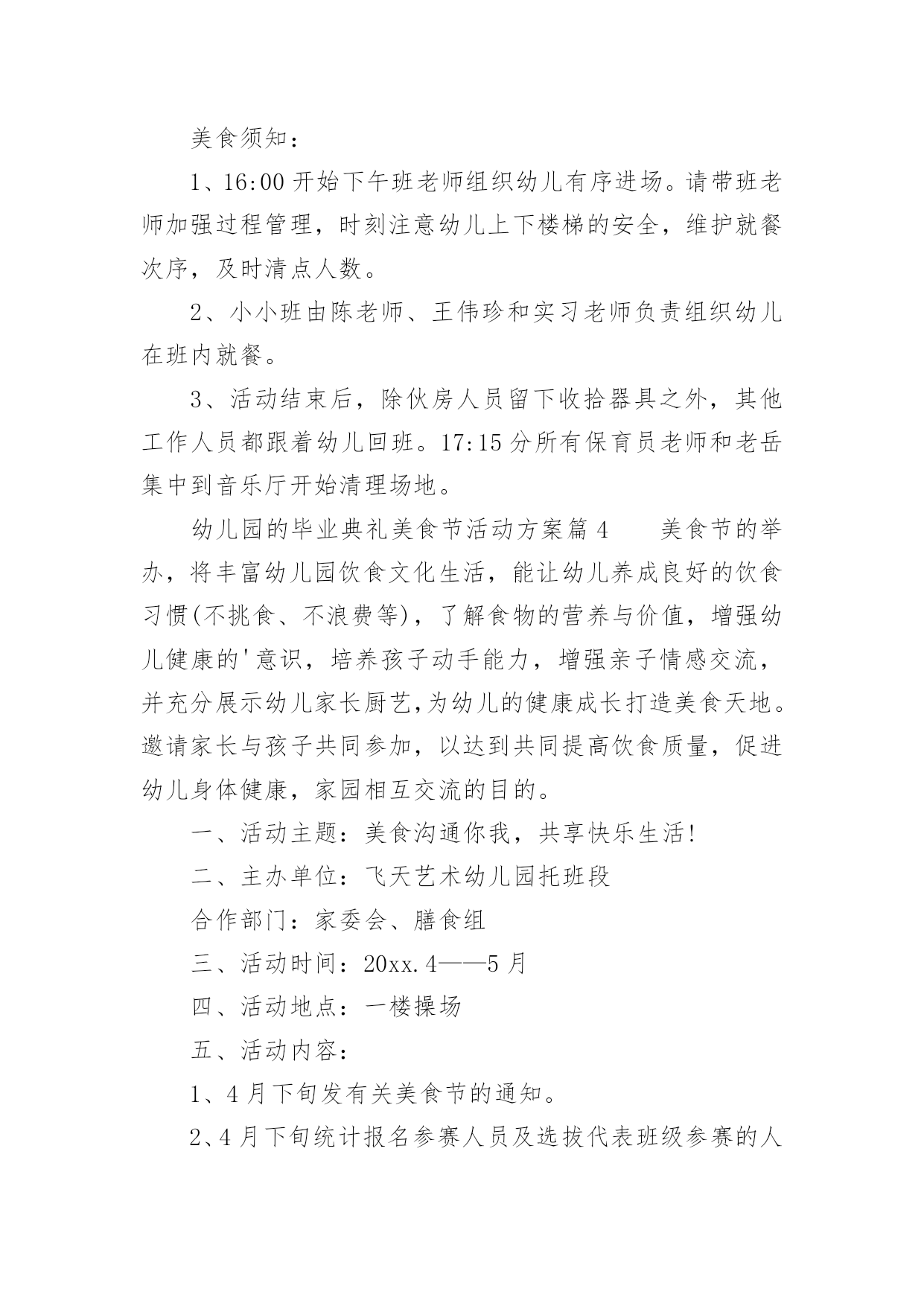 幼儿园的毕业典礼美食节活动方案幼儿园的毕业典礼美食节活动方案(精选12篇)为了确保活动有效开展,常常需要预先准备活动方案,一份好的活动方案一定会注重受众的参与性及互动性。那么什么样的活动方案才是好的呢?下面是小编为大家整理的幼儿园的毕业典礼美食节活动方案(精选12篇),欢迎阅读与收藏。幼儿园的毕业典礼美食节活动方案篇1为了丰富幼儿园饮食文化生活,培养孩子动手能力,增强亲子情感交流,并充分展示幼儿家长厨艺,为幼儿的健康成长打造美食天地。我园特此举办“美食一条街”活动,邀请家长与孩子共同参加,以达到提高幼儿饮食质量,促进幼儿身体健康,家园相互交流的目的。一、具体负责人:园长,各级领导,各班班长全体教师以及各班家长委员会二、各项准备:1.物品准备:班级特色食物、各种水果、蔬菜、菜板、刀子、围裙、沙拉酱等等。2.人员准备:家委会成员3.场地准备:厨房用具的.摆放及场地环境布置三、活动流程:1、8:30之前欢迎家长、孩子来园参加活动。2、8:30入园在园门口凭邀请函进园拍照留念,作为节日礼物3、请带孩子参与自制三种食品,分别是自制水果沙拉、自制寿司、自制三明治,请按票上指示的班级进区活动,活动后在老师处得到钱币奖励后离开。4、得到钱币12元后,请带孩子去“美食一条街”(大操场),自主选择6样食品品尝。5、9:00美食节活动开始6、9:30音体室开始美食大比拼活动开始,请家长带领孩子去观看。7、请陪同欣赏幼儿美术作品展览。四:活动注意事项:1.敬请在活动过程中确保孩子、老人及自身安全。2.敬请在活动过程中给孩子做好表率作用。3.敬请遵守活动规则,确保活动顺利进行。4.活动过程中敬请团结友爱,文明礼让。5.活动结束,全体教职工整理场地。幼儿园的毕业典礼美食节活动方案篇2一、主题名称:快乐五一,美食分享二、设计意图为了让孩子们在幼儿园度过最后一个难忘、愉快、有意义的“五一”劳动节,给孩子的节日抹上更美的色彩,增添更甜美滋味,享受快乐童年,并让孩子们了解到健康饮食。我们大班组精心设计了“制作美食、品尝美食,享受快乐童年”的“五一”主题美食节活动。三、主题目标:家长展现厨艺、幼儿参与操作、现场品尝、共同分享四、活动形式:本次活动家长不来园参加活动,只需准备食材。活动时间为4月31日下午3:00~5:00,地点在幼儿园大礼堂。1、倡议每个家长带一份自制精美的特色美食来园分享。2、在活动启动后,以班级为单位每班家长分六组进行制作材料准备,倡仪家长报名自已擅长的'美食区域类别,先报先定。(食材需准备6人份的制作材料和工具)五、活动准备:1、各班提前发通知给家长,做好沟通;对幼儿进行美食制作讲解。年级组准备环境创设和第一个环节的小实验材料,与小班中班做好沟通。2、各班根据活动通知家长准备食材,每班选出5名家长当天2:00—3:00来园做配合工作。3、制作食品分类牌(年级组负责)。4、活动前一天进行环境布置。5、幼儿用围裙。需园里提供的材料:一次性桌布50个、盘子500个、叉子500个、一次性透明杯子500个、长竹签200根、沙拉酱和番茄酱各5瓶。家长准备:一、每个家庭准备一份自制精美小吃于当天带来幼儿园和小朋友分享(内容自选)。二、每位幼儿在准备食材的6项中选择一种食品准备材料,用于幼儿当天制作,并于当天上午带来园。(食材需准备6人份的材料和工具)六、活动流程:1、观看小实验,了解饮料的制作过程。2、自己动手制作美食。3、邀请小班和中班的弟弟妹妹一起分享美食。备注:幼儿制作美食分类:1、创意饭团组制作主料:熟米饭(大米和糯米)制作辅料:水果类或蔬菜类等做饰物、花生米,肉松、紫菜、海鲜酱、番茄酱。2、春卷组主料:豆腐皮、酱肉丝、胡萝卜丝、黄瓜丝。3、三明治组:主料:切片吐司面包、火腿肠、生菜、奶酪片、西红杮、千岛酱4、蔬菜沙拉组:主料:熟土豆块、鹿茸菜、紫甘蓝、西红柿、红腰豆、蓝莓、七彩椒等,千岛酱或沙拉酱。5、清补凉:主料:棷奶、绿豆、红豆、糯米团、花生、薏米、葡萄干等。6、寿司组:主料:熟米饭、紫菜、黄瓜条、胡萝卜条、火腿条、肉松或其它。工具:竹帘幼儿园的毕业典礼美食节活动方案篇3美食地点:117幼儿园音乐厅美食时间:xx年5月29日小班:16:00中班:16:20大班:16:40美食序曲:13:30——14:30布置场地负责人:丁小梅、魏红14:30——15:30食品上架准备就绪负责人:金晓兰、徐雅芳15:45——16:00伙房送餐至小小班负责人:叶宝法美食流程:音乐厅北门入口→→→按地面箭头指示方向选取食品→→→找到年级区就餐→→→就餐完毕碗筷分类放入框中→→→音乐厅南大门出口。美食分配:小吃区每人自选3种食品;糕点区每人自选1—2种食品;水果区每人自选1—2种食品;糖水流动区由专人负责送货上桌。美食天使:小吃区:金晓兰、叶小英糕点区:魏红、段