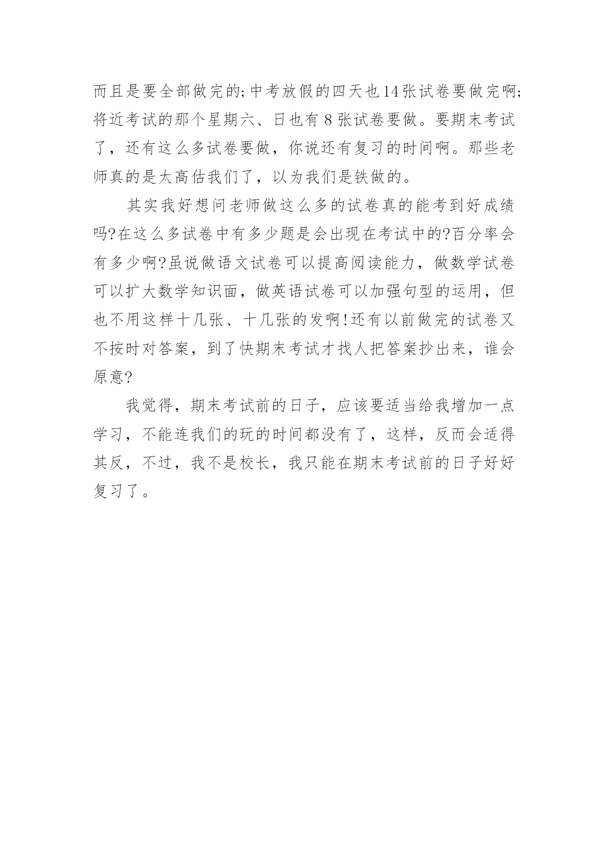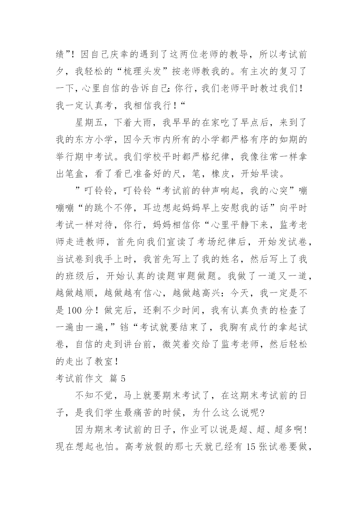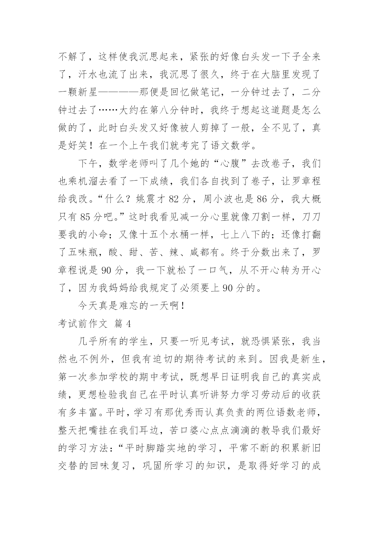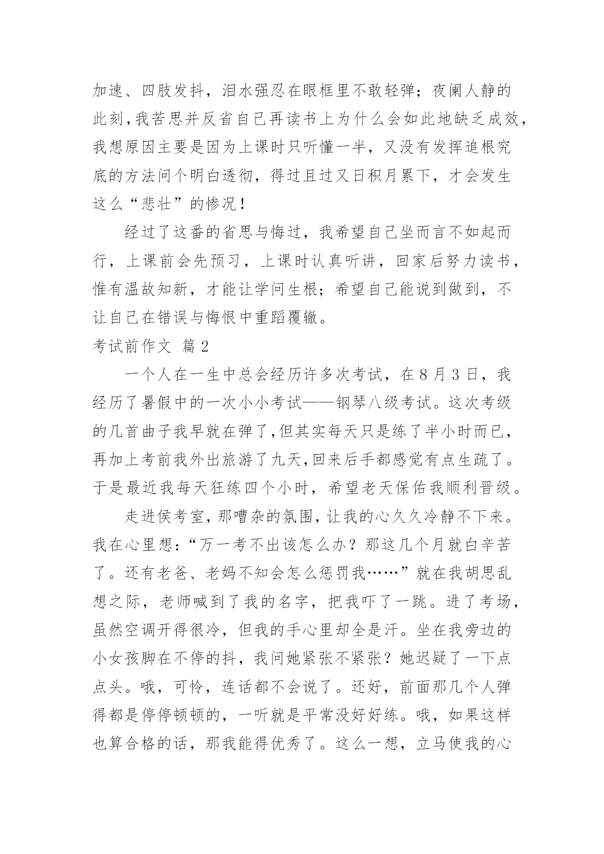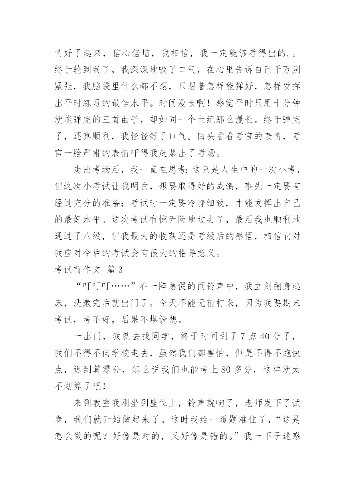 考试前作文考试前作文5篇在平平淡淡的日常中,大家都跟作文打过交道吧,作文可分为小学作文、中学作文、大学作文(论文)。你知道作文怎样写才规范吗?下面是小编整理的考试前作文7篇,欢迎阅读,希望大家能够喜欢。考试前作文篇1“人有失神,马有乱蹄;吃烧饼,哪有不掉芝麻子;吃米饭,哪有不掉饭米粒。”相声表演中这一段句子,最让我喜欢!俗话说得好:“人非圣贤、熟能无过”,但做了错事,除了要想想自己为什么做错事?更要懂得自我反省,这才是改正错误、避免遗憾治标和治本的方法。最近正好遇到了“烤季”,小学的各科大小考试、英语班的各项测验都如火如荼地展开,口说、问答、笔试,一项项的考验如潮水般向我袭来,其中最令我担心的是社会科、语文科以及英语语法的考试;我永远搞不懂社会科里“地名的由来”为何?地名与先民的关系演变?地图的方位与相对位置怎么判断?也搞不清楚语文科的修辞法和造句?更弄不清千变万化的英语语法,它们简直就是外星文法?所以,当我在试场上“烤”试时,彷佛就成了一只“在烤箱里的无辜小鱼”一样,被活跳跳的烤成鱼干般地苦不堪言。今晚,妈妈又因为帮我复习社会科,而被我的驽钝气得像火山爆发似的发出母狮的怒吼,我吓得我魂飞魄散、心跳加速、四肢发抖,泪水强忍在眼框里不敢轻弹;夜阑人静的此刻,我苦思并反省自己再读书上为什么会如此地缺乏成效,我想原因主要是因为上课时只听懂一半,又没有发挥追根究底的方法问个明白透彻,得过且过又日积月累下,才会发生这么“悲壮”的惨况!经过了这番的省思与悔过,我希望自己坐而言不如起而行,上课前会先预习,上课时认真听讲,回家后努力读书,惟有温故知新,才能让学问生根;希望自己能说到做到,不让自己在错误与悔恨中重蹈覆辙。考试前作文篇2一个人在一生中总会经历许多次考试,在8月3日,我经历了暑假中的一次小小考试——钢琴八级考试。这次考级的几首曲子我早就在弹了,但其实每天只是练了半小时而已,再加上考前我外出旅游了九天,回来后手都感觉有点生疏了。于是最近我每天狂练四个小时,希望老天保佑我顺利晋级。走进侯考室,那嘈杂的氛围,让我的心久久冷静不下来。我在心里想:“万一考不出该怎么办?那这几个月就白辛苦了。还有老爸、老妈不知会怎么惩罚我……”就在我胡思乱想之际,老师喊到了我的名字,把我吓了一跳。进了考场,虽然空调开得很冷,但我的手心里却全是汗。坐在我旁边的小女孩脚在不停的抖,我问她紧张不紧张?她迟疑了一下点点头。哦,可怜,连话都不会说了。还好,前面那几个人弹得都是停停顿顿的,一听就是平常没好好练。哦,如果这样也算合格的话,那我能得优秀了。这么一想,立马使我的心情好了起来,信心倍增,我相信,我一定能够考得出的.。终于轮到我了,我深深地吸了口气,在心里告诉自己千万别紧张,我脑袋里什么都不想,只想着怎样能弹好,怎样发挥出平时练习的最佳水平。时间漫长啊!感觉平时只用十分钟就能弹完的三首曲子,却如同一个世纪那么漫长。终于弹完了,还算顺利,我轻轻舒了口气。回头看看考官的表情,考官一脸严肃的表情吓得我赶紧出了考场。走出考场后,我一直在思考:这只是人生中的一次小考,但这次小考试让我明白,想要取得好的成绩,事先一定要有经过充分的准备;考试时一定要冷静细致,才能发挥出自己的最好水平。这次考试有惊无险地过去了,最后我也顺利地通过了八级,但我最大的收获还是考级后的感悟,相信它对我应对今后的考试会有很大的指导意义。考试前作文篇3“叮叮叮……”在一阵急促的闹铃声中,我立刻翻身起床,洗漱完后就出门了。今天不能无精打采,因为我要期末考试,考不好,后果不堪设想。一出门,我就去找同学,终于时间到了7点40分了,我们不得不向学校走去,虽然我们都害怕,但是不得不跑快点,迟到算零分,怎么说我们也能考上80多分,这样就太不划算了吧!来到教室我刚坐到座位上,铃声就响了,老师发下了试卷,我们就开始做起来了。这时我给一道题难住了,“这是怎么做的呢?好像是对的,又好像是错的。”我一下子迷惑不解了,这样使我沉思起来,紧张的好像白头发一下子全来了,汗水也流了出来,我沉思了很久,终于在大脑里发现了一颗新星————那便是回忆做笔记,一分钟过去了,二分钟过去了……大约在第八分钟时,我终于想起这道题是怎么做的了,此时白头发又好像被人剪掉了一般,全不见了,真是好笑!在一个上午我们就考完了语文数学。下午,数学老师叫了几个她的“心腹”去改卷子,我们也乘机溜去看了一下成绩,我们各自找到了卷子,让罗章程给我改。“什么?姚震才82分,周小波也是86分,我大概只有85分吧。”这时我看见减一分心里就像刀割一样,刀刀要我的小命;又像十五个水桶一样,七上八下的;还像打翻了五味瓶,酸、甜、苦、辣、咸都有。终于分数出来了,罗章程说是90分,我一下就松了一口气,从不开心转为开心了,因为我妈妈给我规定了必须要上90分的。今天真是难忘的一天啊!考