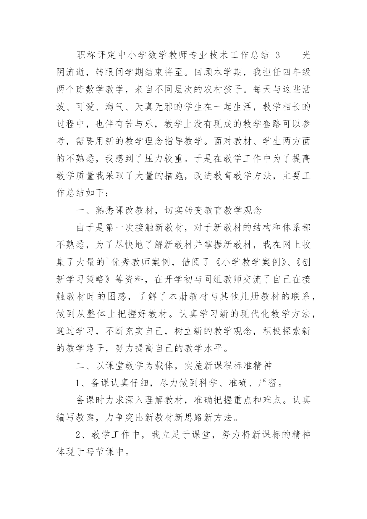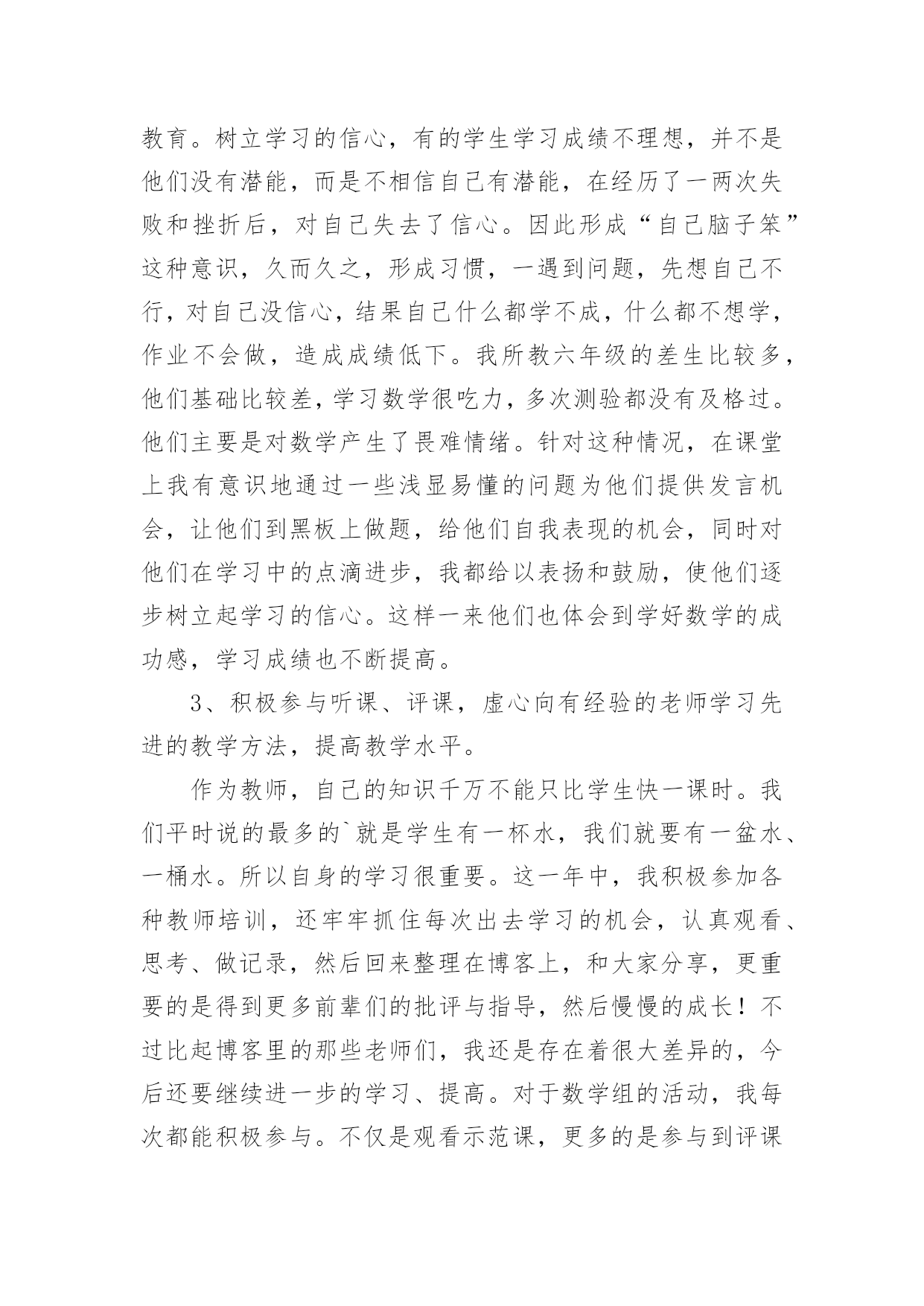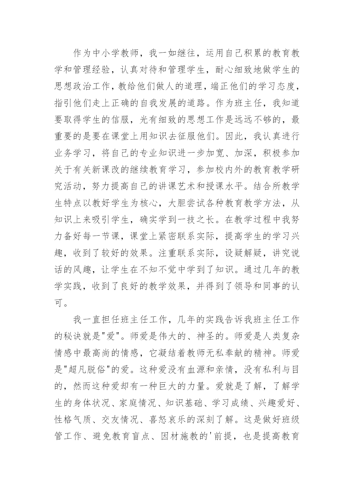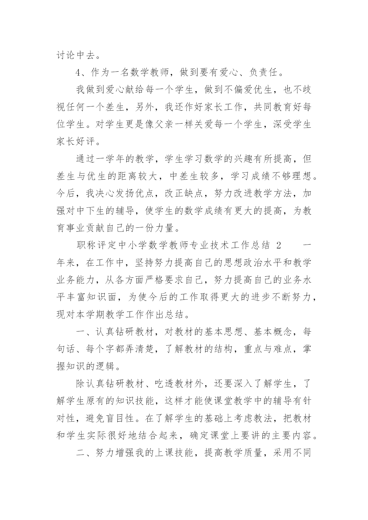 职称评定中小学数学教师专业技术工作总结职称评定中小学数学教师专业技术工作总结(通用11篇)时光如流水般匆匆流动,一段时间的工作已经结束了,回顾坚强走过的这段时间,取得的成绩实则来之不易,这时候,最关键的工作总结怎么能落下!我们该怎么去写工作总结呢?以下是小编为大家整理的职称评定中小学数学教师专业技术工作总结,欢迎阅读与收藏。职称评定中小学数学教师专业技术工作总结1一学年来,我在教育教学工作中,始终坚持党的教育方针,面向全体学生,教书育人,为人师表,确立“以学生为主体”,“以培养学生主动发展”为中心的教学思想,重视学生的个性发展,重视激发学生的创造能力,培养学生德、智、体、美、劳全面发展,做到了工作责任心强,服从领导的分工积极做好本职工作,认真备课、上课、听课、评课,及时批改作业、讲评作业,做好课后辅导工作,广泛获取各种知识,形成比较完整的知识结构,严格要求学生,尊重学生,发扬教学民主,使学生学有所得,不断提高,从而不断提高自己的教学水平,并顺利完成教育教学任务。为了更好地发扬成绩,纠正不足,现将一年来的工作做一总结:1、要提高教学质量,关键是上好课。为了上好课,我做了下面的工作:在教学工作方面,优化教学方法,按常规做好课前、课中、课后的各项工作,认真钻研教材,课堂教学真正体现“教师为主导,学生为主体”的教学思想,并结合学校德育科的对小学生心理健康教育,发展学生心理;创设情境,诱发学生的认知需求和创新欲望,使学生从情感、思维和行为上主动参与学习;在培养学生形象和抽象、分析和综合思维能力的同时,有意识地培养学生求新、求异、聚合、发散等创新学习活动所要求的思维方式和方法;以学生创新学习为主线组织课堂教学活动,鼓励学生主动参与、主动探索、主动思考、主动操作、主动评价,运用启发学习、尝试学习、发现学习、合作学习等方法,在教学中求创新,在活动中促发展,课堂教学重视学生的训练,精心设计练习作业,练习作业有层次有坡度,对学生的作业严格要求,培养良好的作业习惯。在进行计算能力训练时,我要求学生先要认真审题,边审题边思考:“题抄对了没有?先算什么?再算什么?能否简算?”计算过程中要求学生做到一步一回头,进行自觉检验。如果发现个别学生做错了题,及时要求学生纠正,自觉分析造成错误的原因,防止再错,养成认真计算的习惯。平时要求学生对题目中的数字、小数点、运算符号必须写得清楚工整、规范,作业做完后,要养成自觉检验的习惯,端正认真学习、刻苦钻研的学习态度,培养独立思考和克服困难的精神。2、要提高教学质量,还要做好课后辅导工作。部分学生缺乏自觉性,经常不能按时完成作业,甚至有的学生欠交作业,针对这种问题,我就进行对学生进行思想教育。树立学习的信心,有的学生学习成绩不理想,并不是他们没有潜能,而是不相信自己有潜能,在经历了一两次失败和挫折后,对自己失去了信心。因此形成“自己脑子笨”这种意识,久而久之,形成习惯,一遇到问题,先想自己不行,对自己没信心,结果自己什么都学不成,什么都不想学,作业不会做,造成成绩低下。我所教六年级的差生比较多,他们基础比较差,学习数学很吃力,多次测验都没有及格过。他们主要是对数学产生了畏难情绪。针对这种情况,在课堂上我有意识地通过一些浅显易懂的问题为他们提供发言机会,让他们到黑板上做题,给他们自我表现的机会,同时对他们在学习中的点滴进步,我都给以表扬和鼓励,使他们逐步树立起学习的信心。这样一来他们也体会到学好数学的成功感,学习成绩也不断提高。3、积极参与听课、评课,虚心向有经验的老师学习先进的教学方法,提高教学水平。作为教师,自己的知识千万不能只比学生快一课时。我们平时说的最多的`就是学生有一杯水,我们就要有一盆水、一桶水。所以自身的学习很重要。这一年中,我积极参加各种教师培训,还牢牢抓住每次出去学习的机会,认真观看、思考、做记录,然后回来整理在博客上,和大家分享,更重要的是得到更多前辈们的批评与指导,然后慢慢的成长!不过比起博客里的那些老师们,我还是存在着很大差异的,今后还要继续进一步的学习、提高。对于数学组的活动,我每次都能积极参与。不仅是观看示范课,更多的是参与到评课讨论中去。4、作为一名数学教师,做到要有爱心、负责任。我做到爱心献给每一个学生,做到不偏爱优生,也不歧视任何一个差生,另外,我还作好家长工作,共同教育好每位学生。对学生更是像父亲一样关爱每一个学生,深受学生家长好评。通过一学年的教学,学生学习数学的兴趣有所提高,但差生与优生的距离较大,中差生较多,学习成绩不够理想。今后,我决心发扬优点,改正缺点,努力改进教学方法,加强对中下生的辅导,使学生的数学成绩有更大的提高,为教育事业贡献自己的一份力量。职称评定中小学数学教师专业技术工作总结2一年来,在工作中,坚持努力提高自己的思想政治水平和教学业务能力,从各方面严格要求自